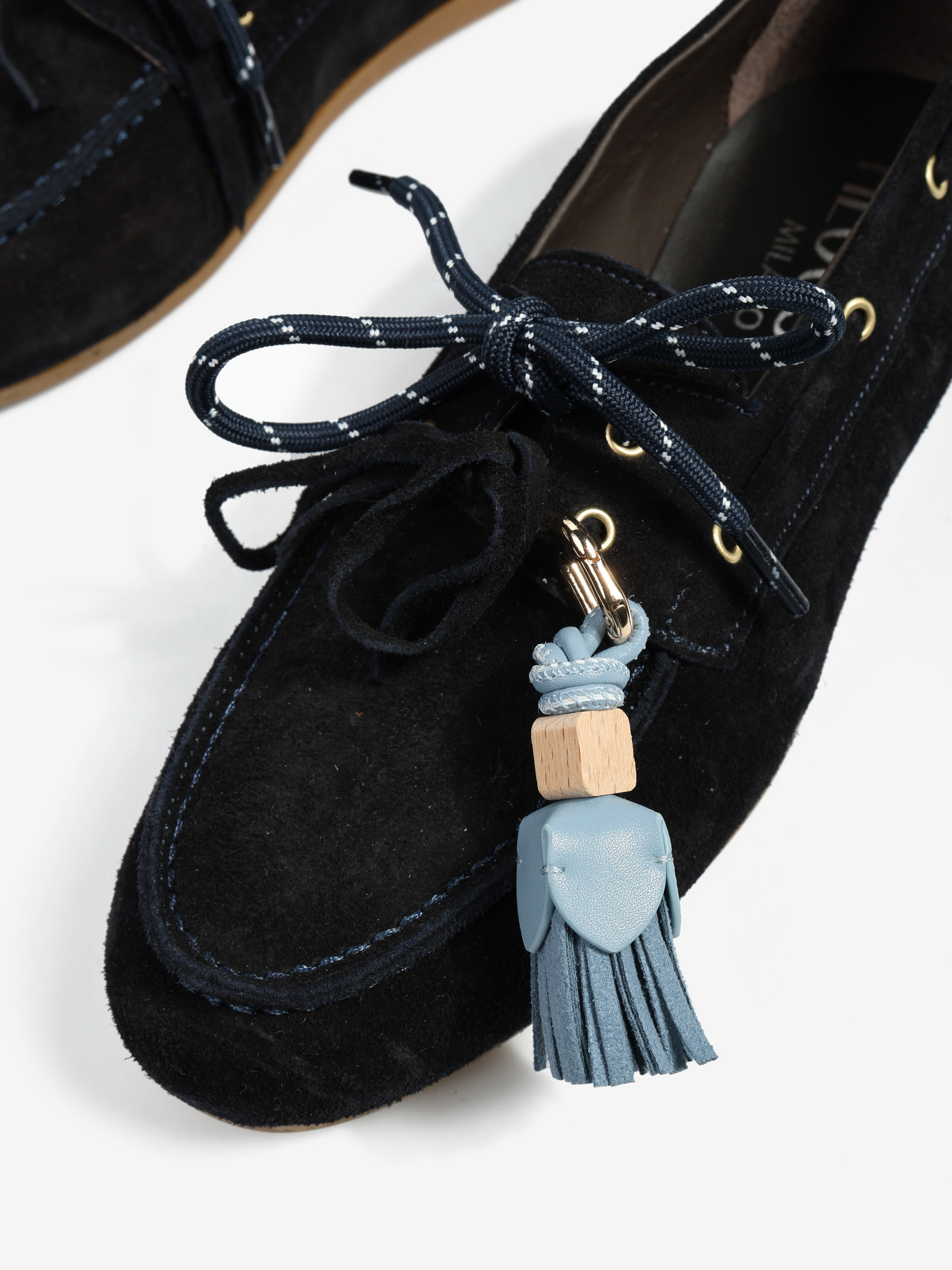 Zamszowe mokasyny z wiązaniem pozwalającym na idealne dopasowanie. W komplecie dodatkowe sznurówki. Przywieszka dostępna oddzielnie.