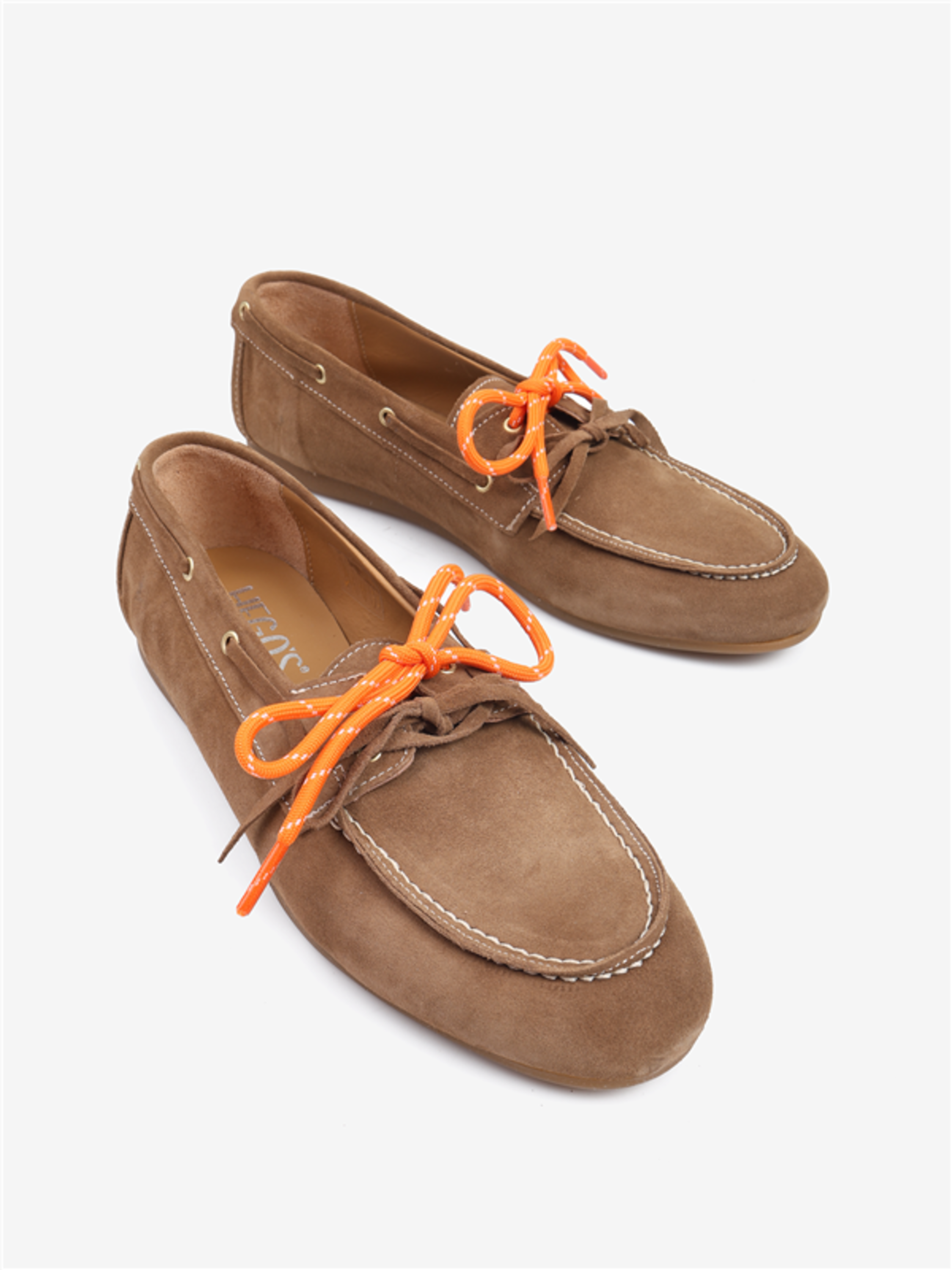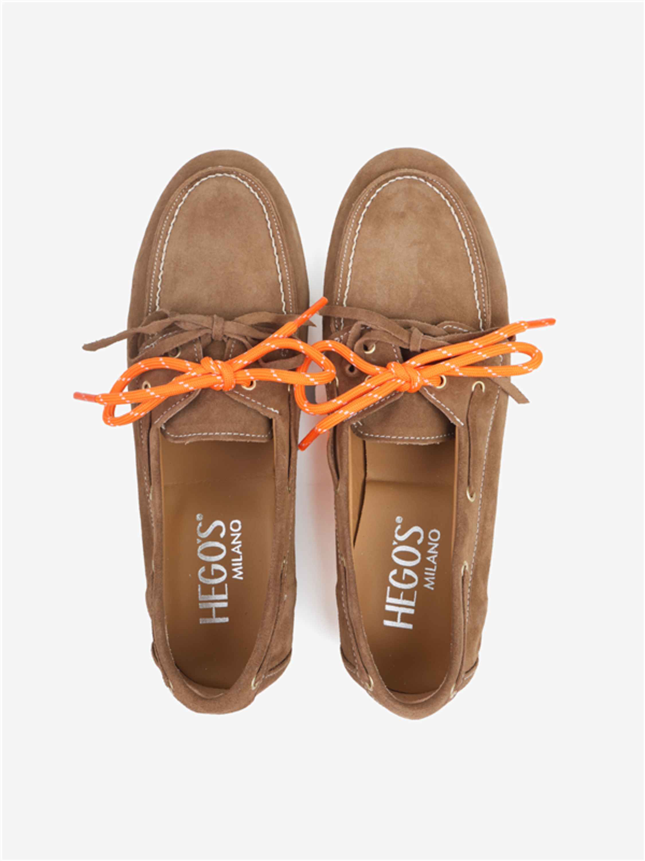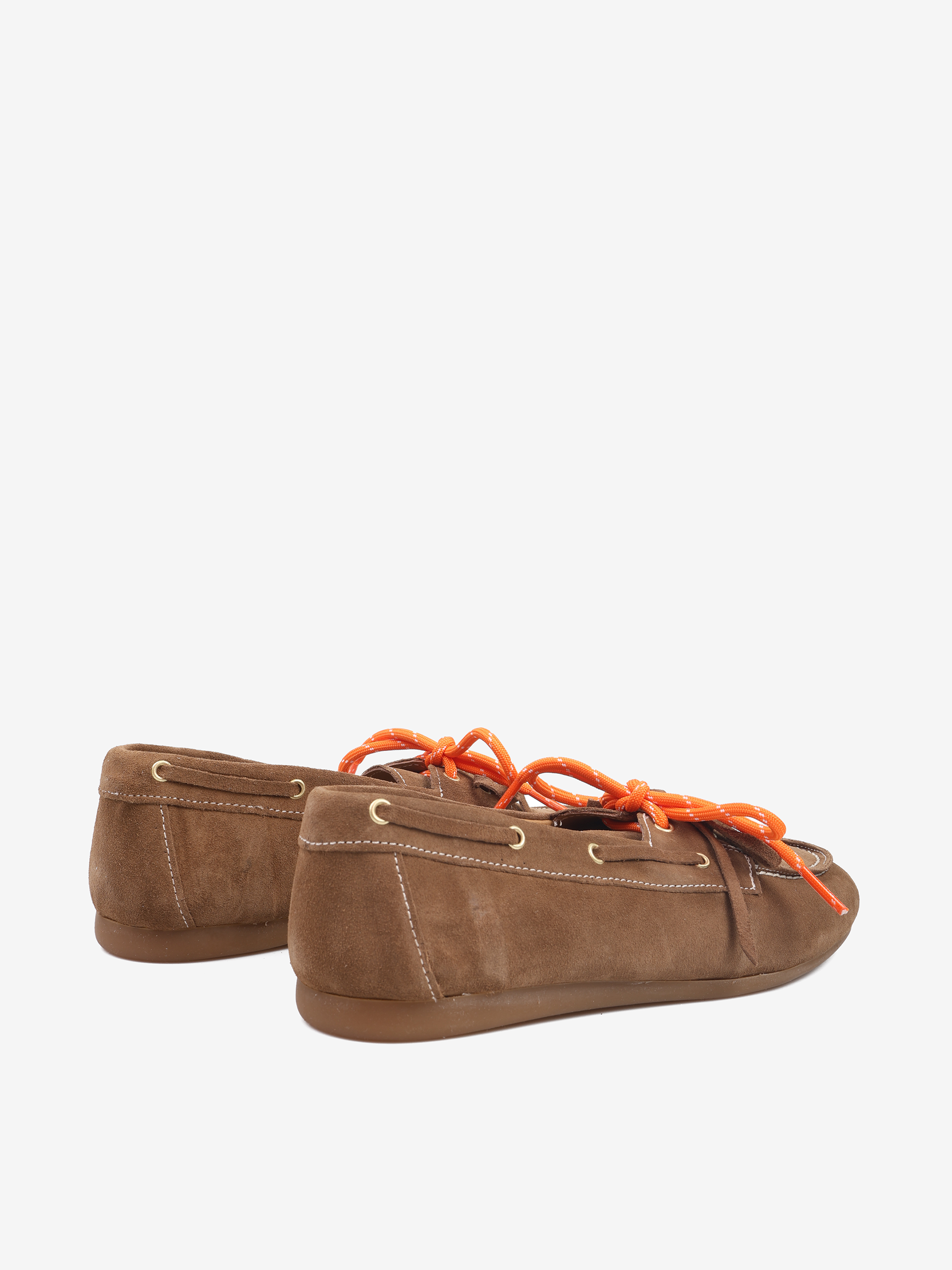 Mokasyny wykonane z brązowego zamszu z wiązaniem pozwalającym na idealne dopasowanie. Dodatkowe sznurowadła w rudym kolorze.