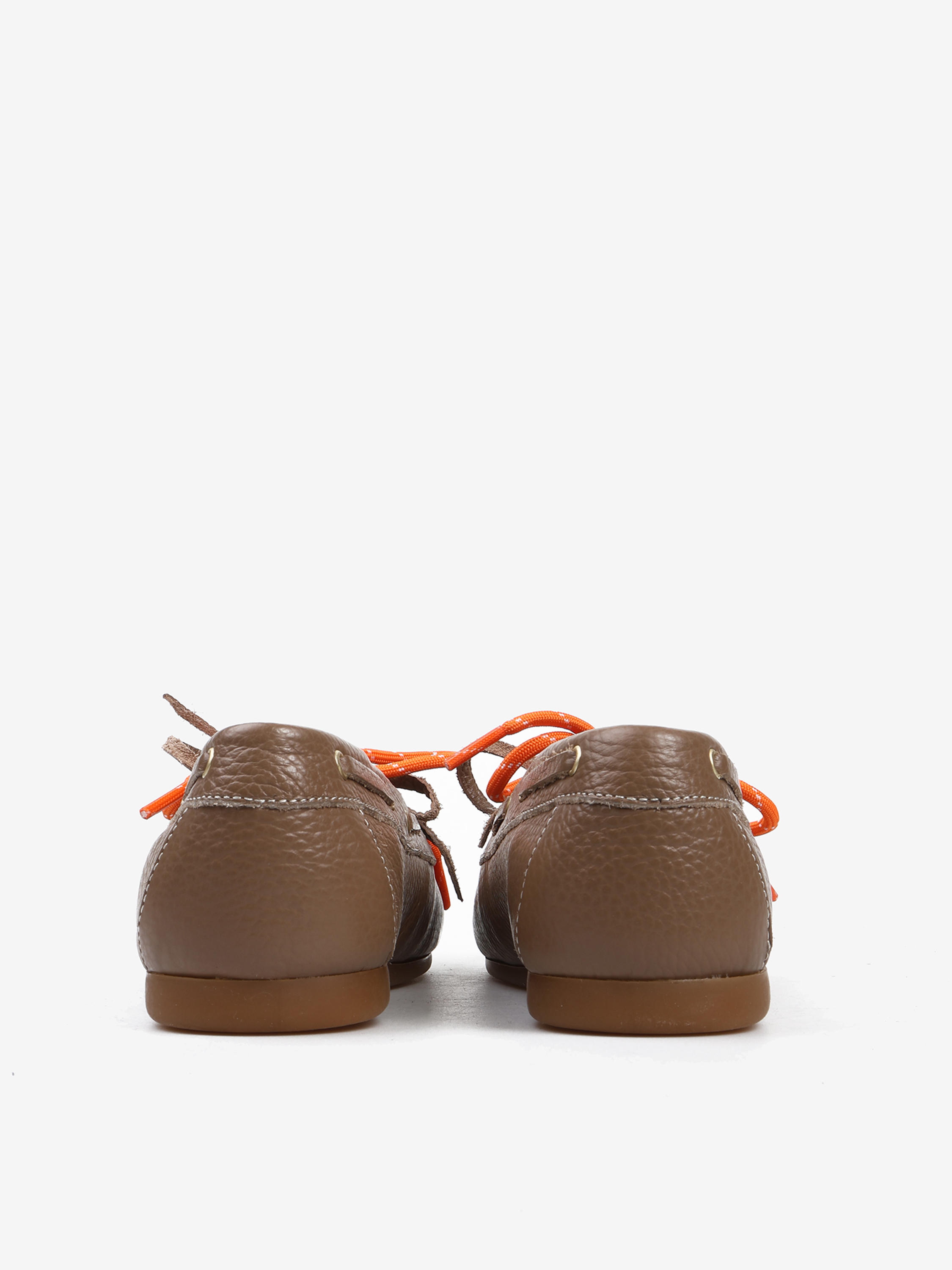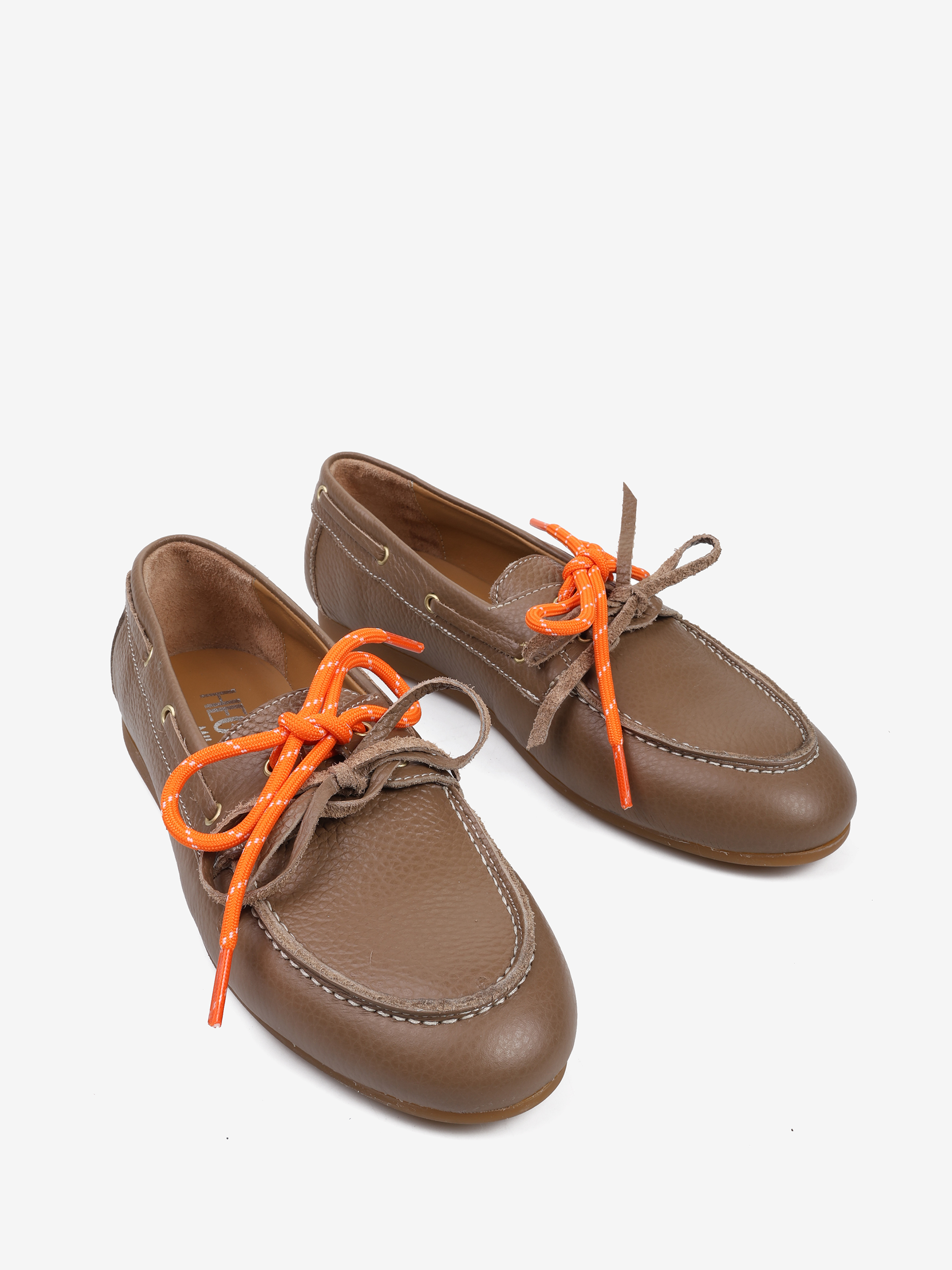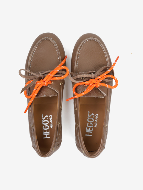 Mokasyny wykonane z beżowej skóry z wiązaniem pozwalającym na idealne dopasowanie. Dodatkowe sznurowadła w kontrastującym, pomarańczowym kolorze.