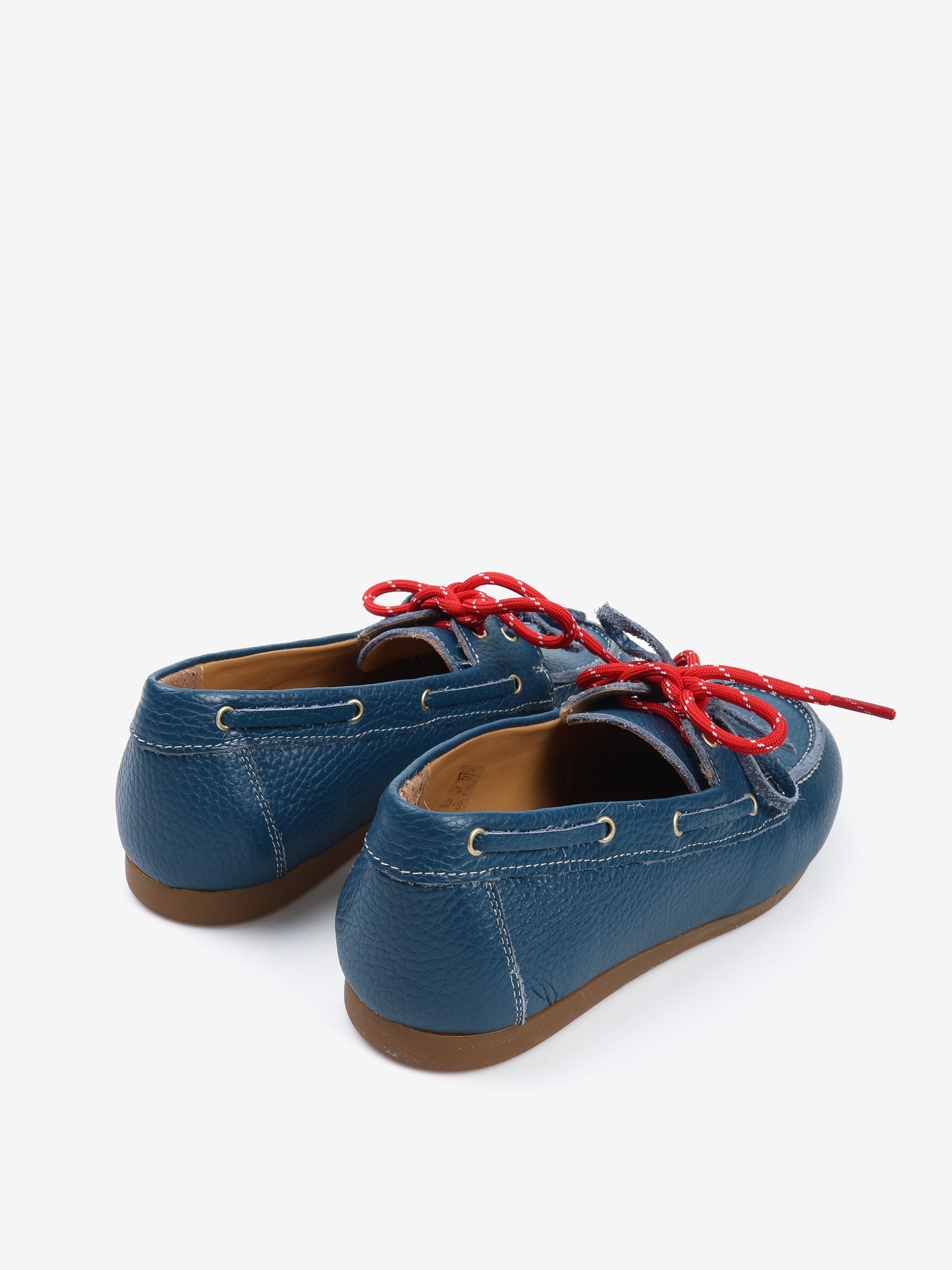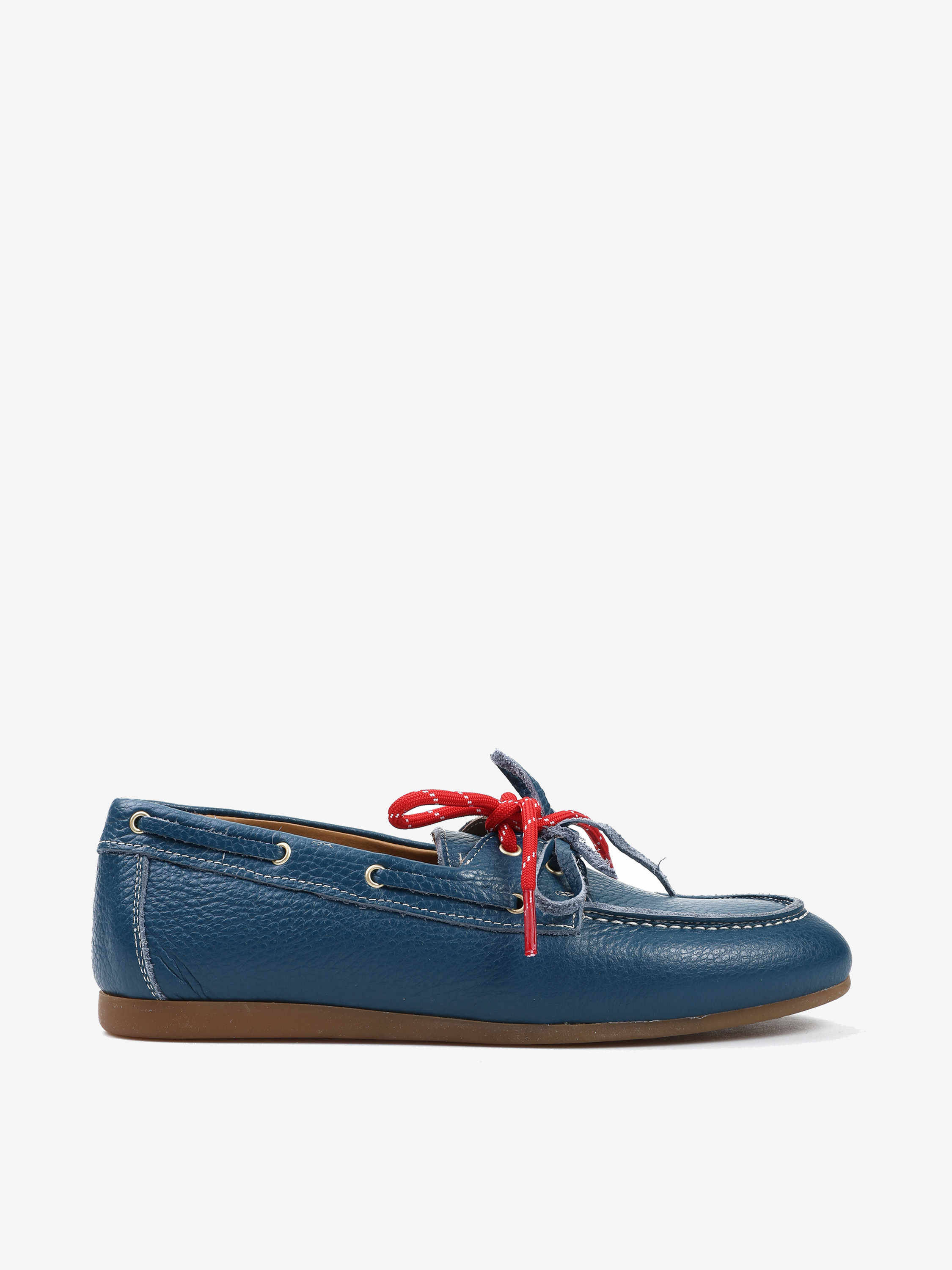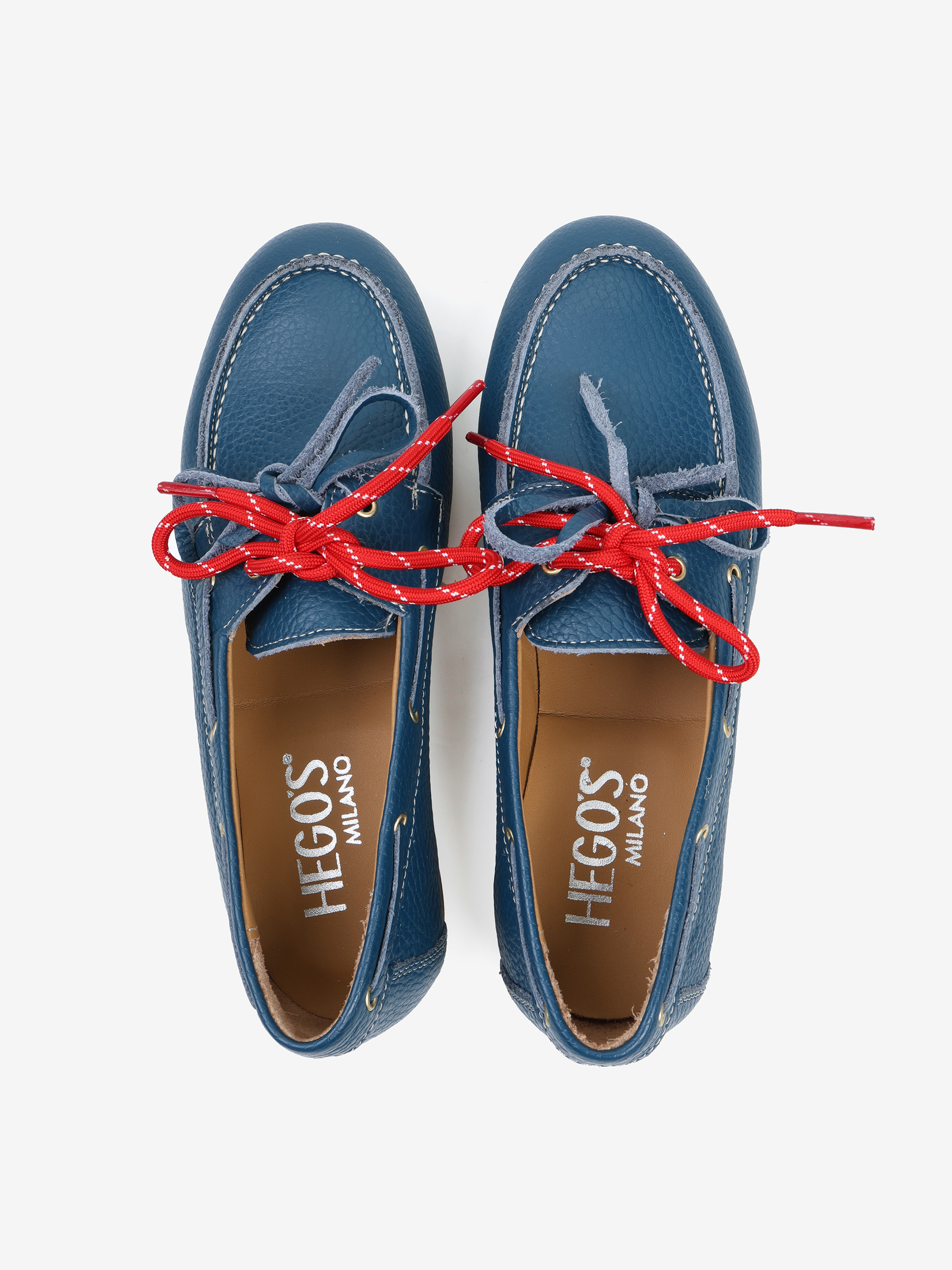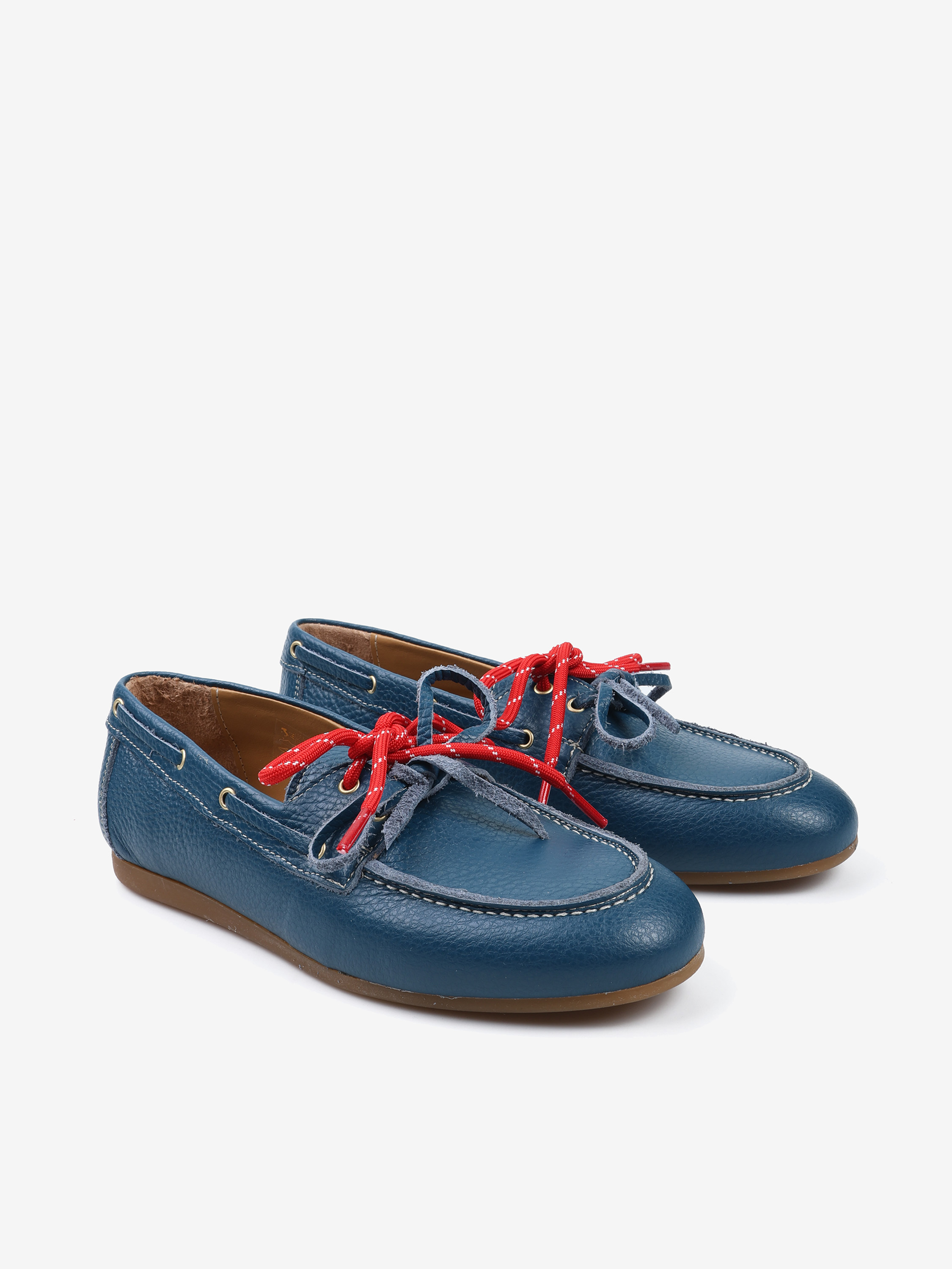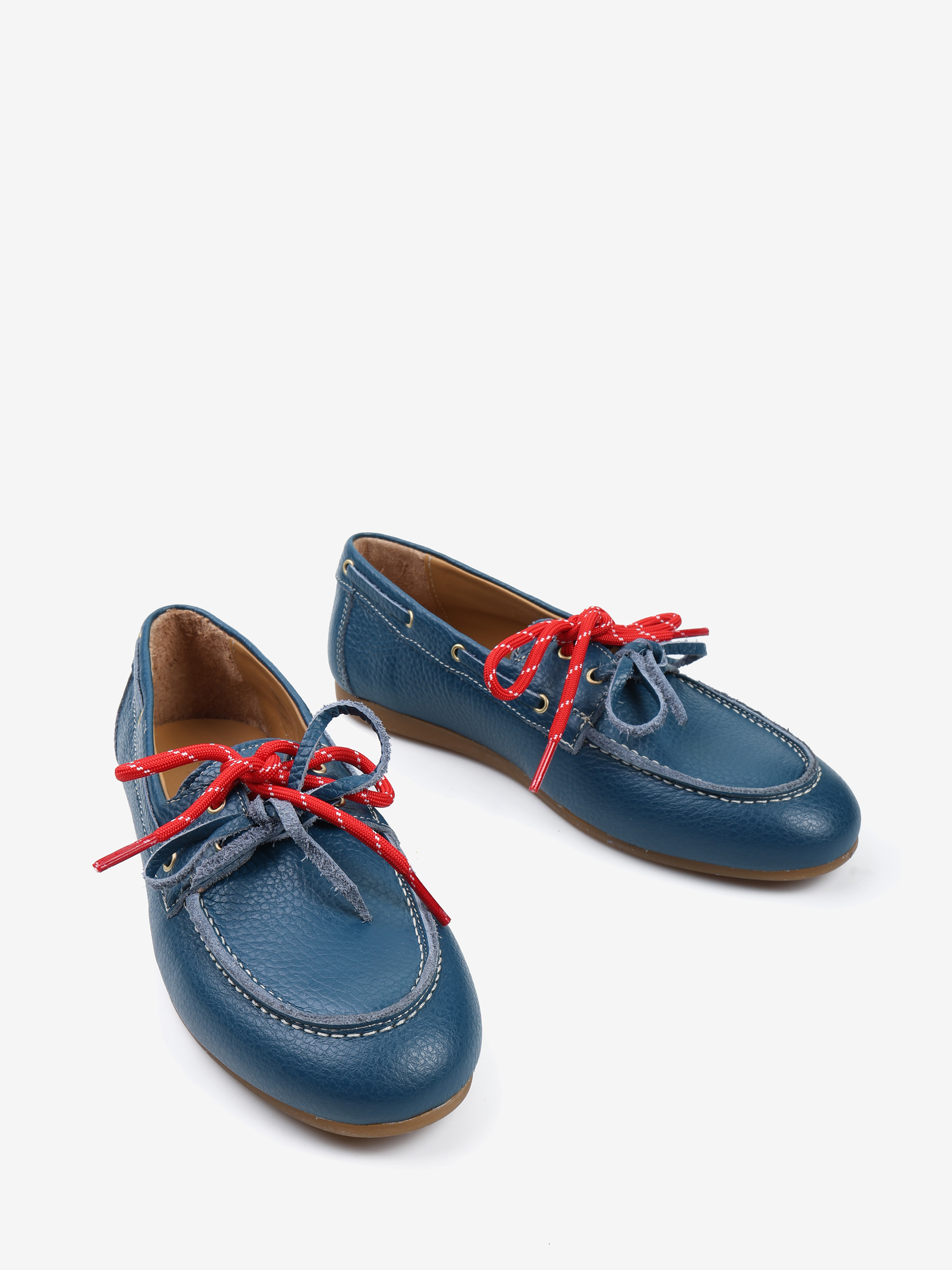 Mokasyny wykonane z granatowej skóry z wiązaniem pozwalającym na idealne dopasowanie. Dodatkowe sznurowadła w niebieskim kolorze.