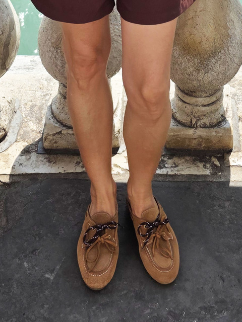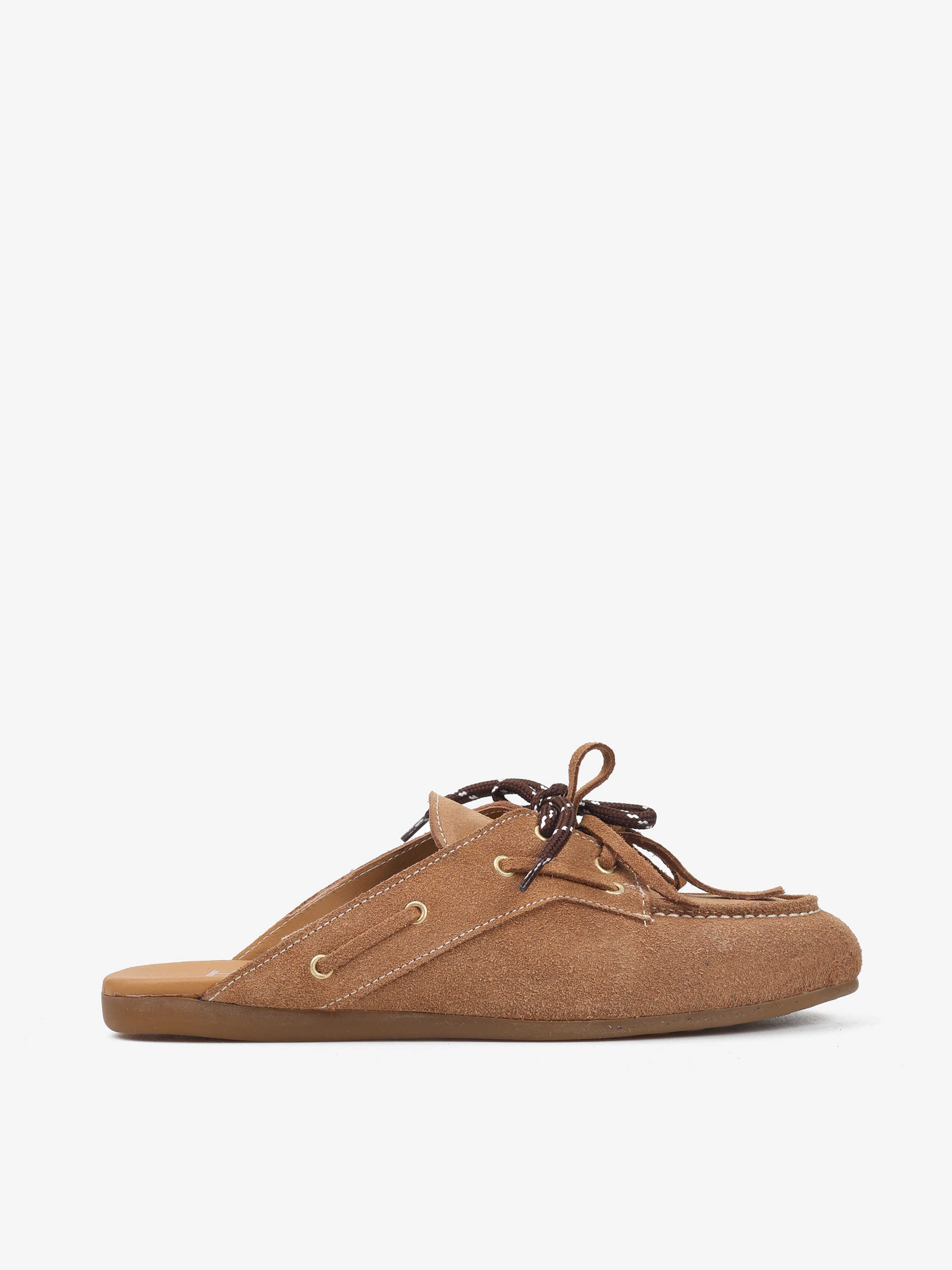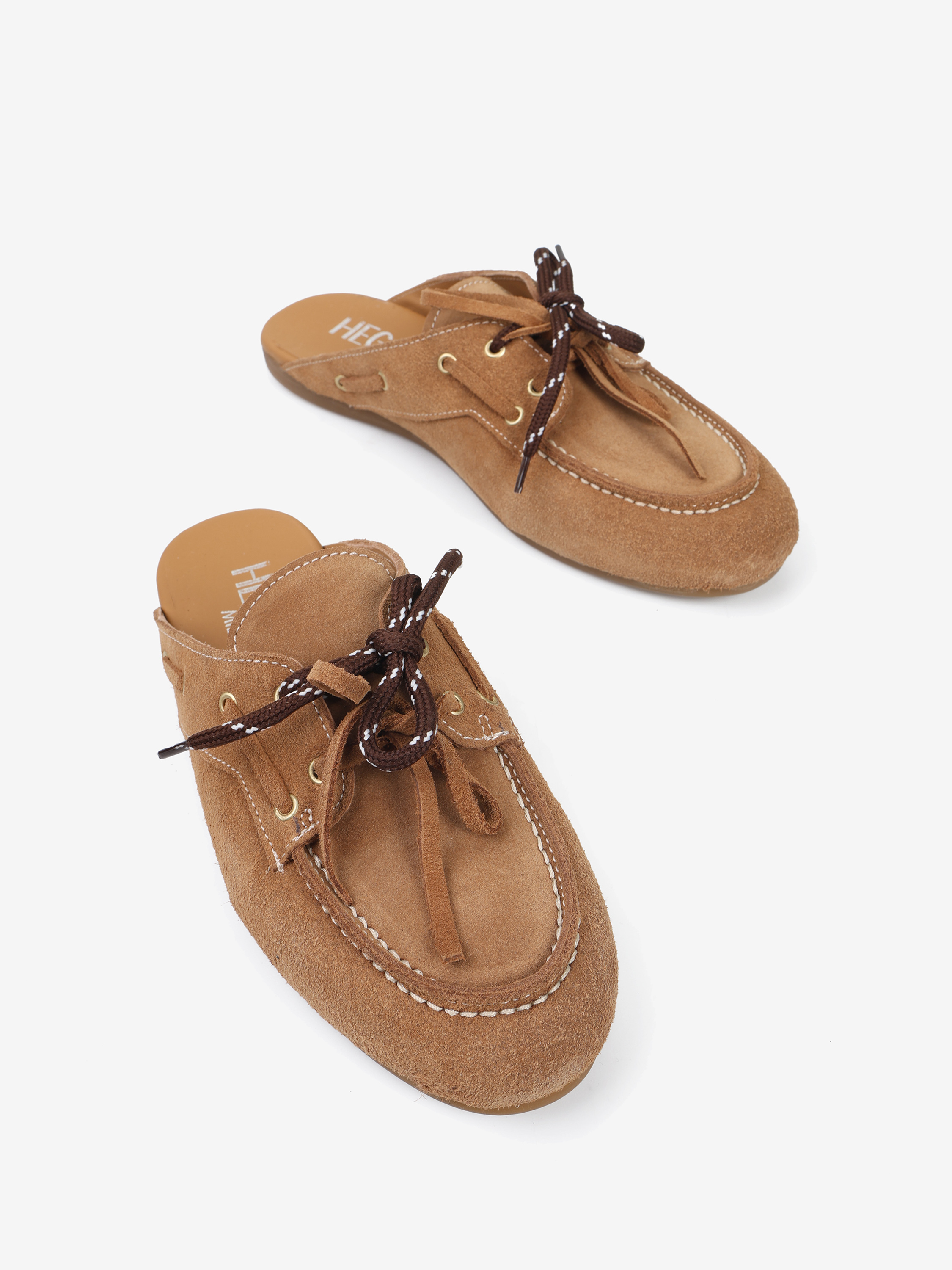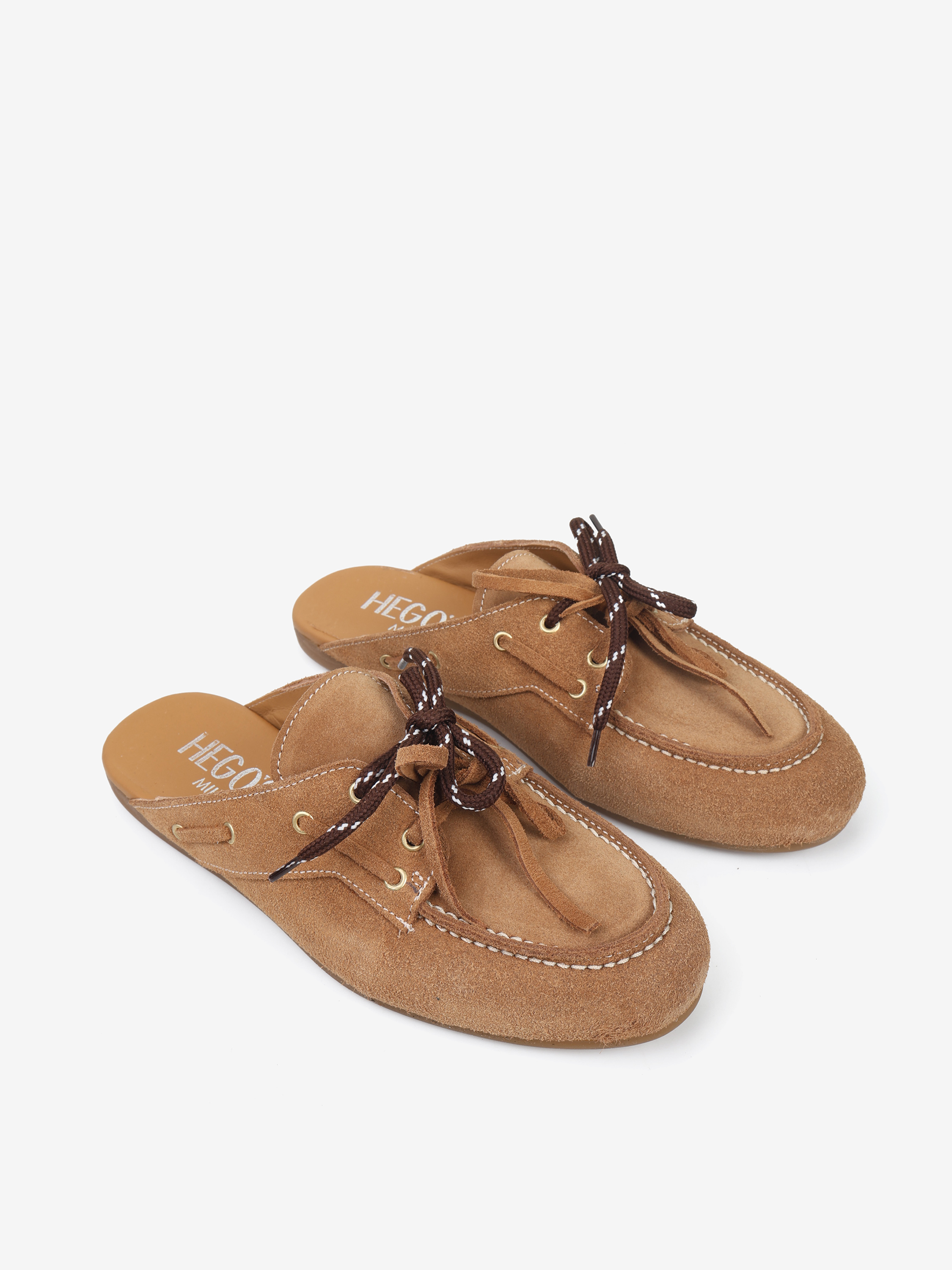Zamszowe mule z wiązaniem pozwalającym na idealne dopasowanie. Dodatkowe sznurowadła w brązowym kolorze.