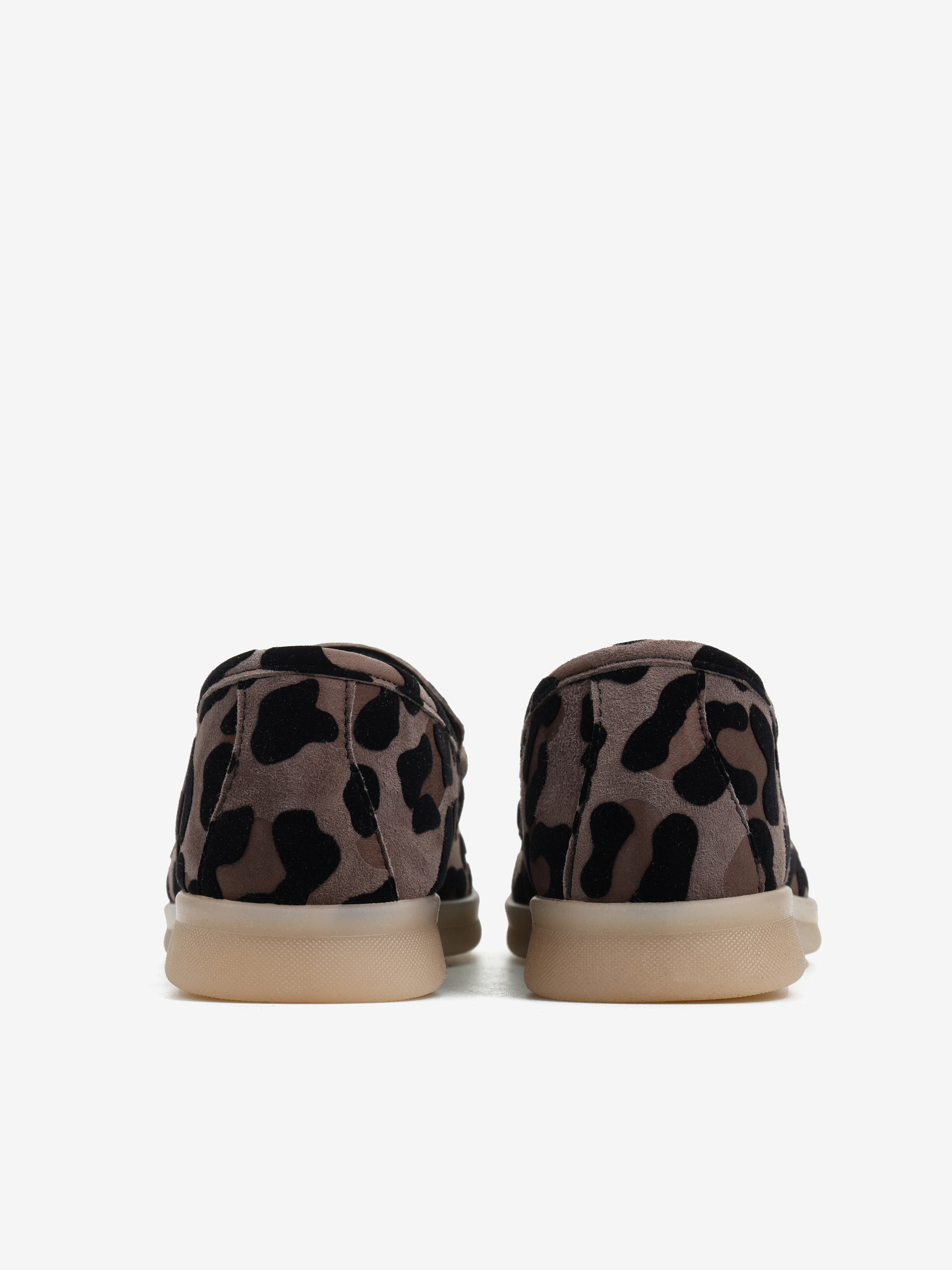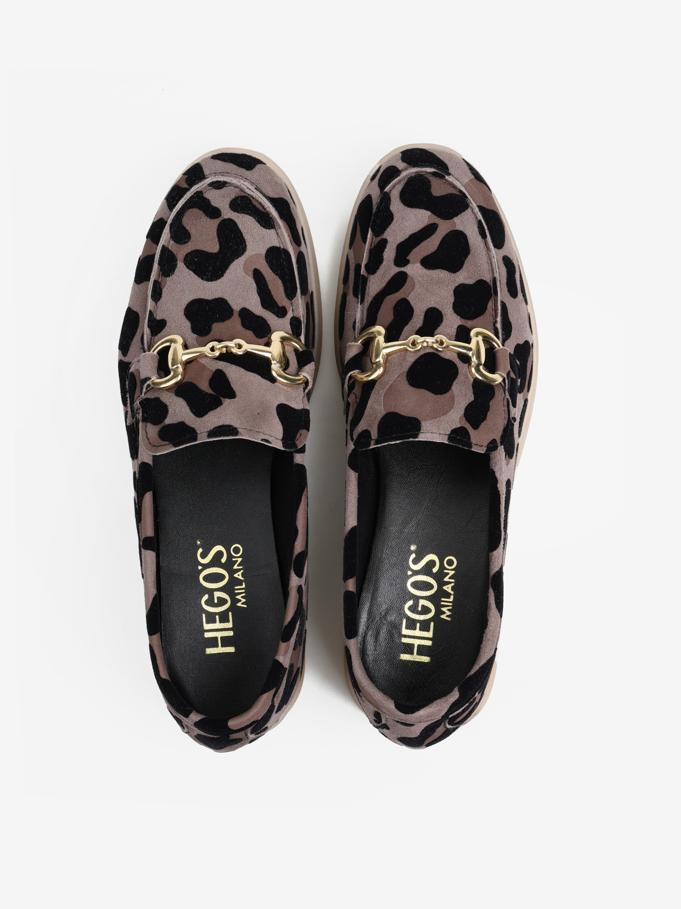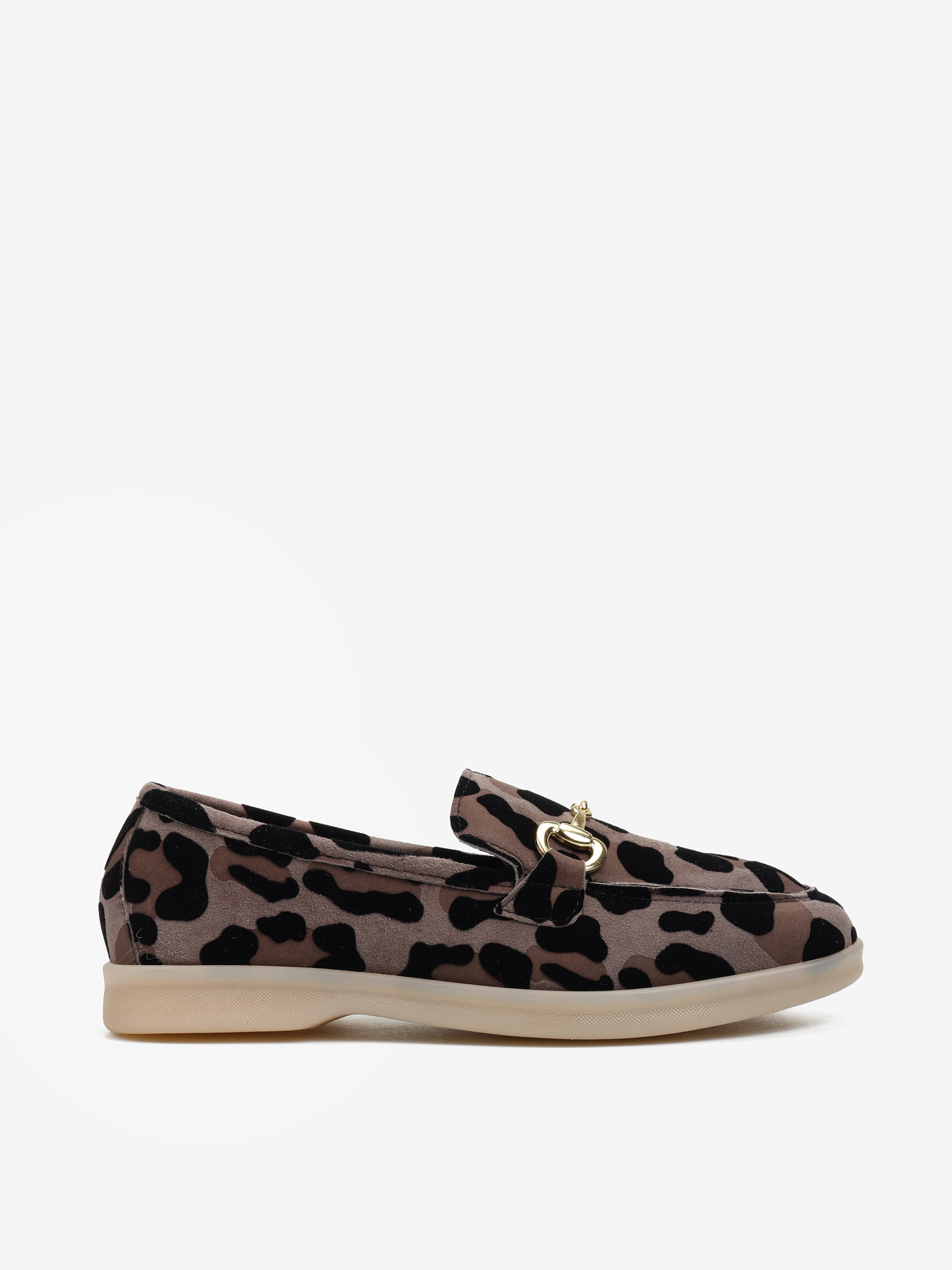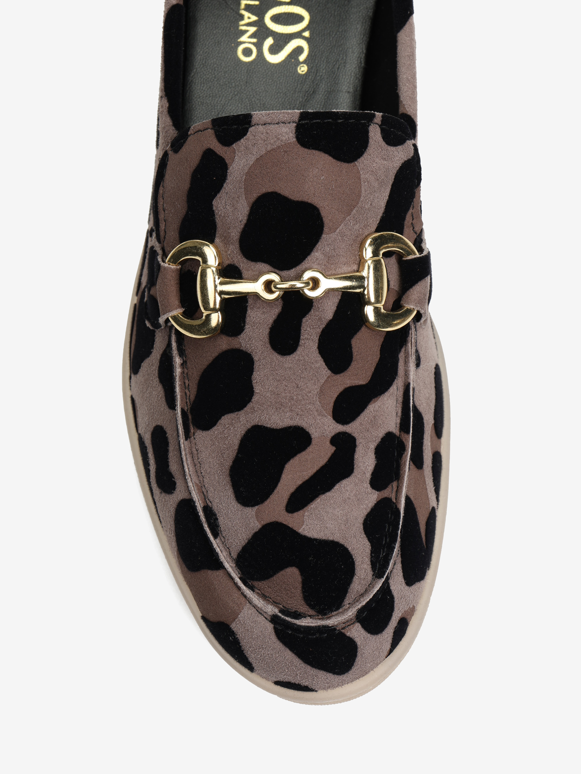 Mokasyny wykonane z zamszu ze wzorem w panterkę. Delikatnie przezroczysta podeszwa i metalowe wędzidło.