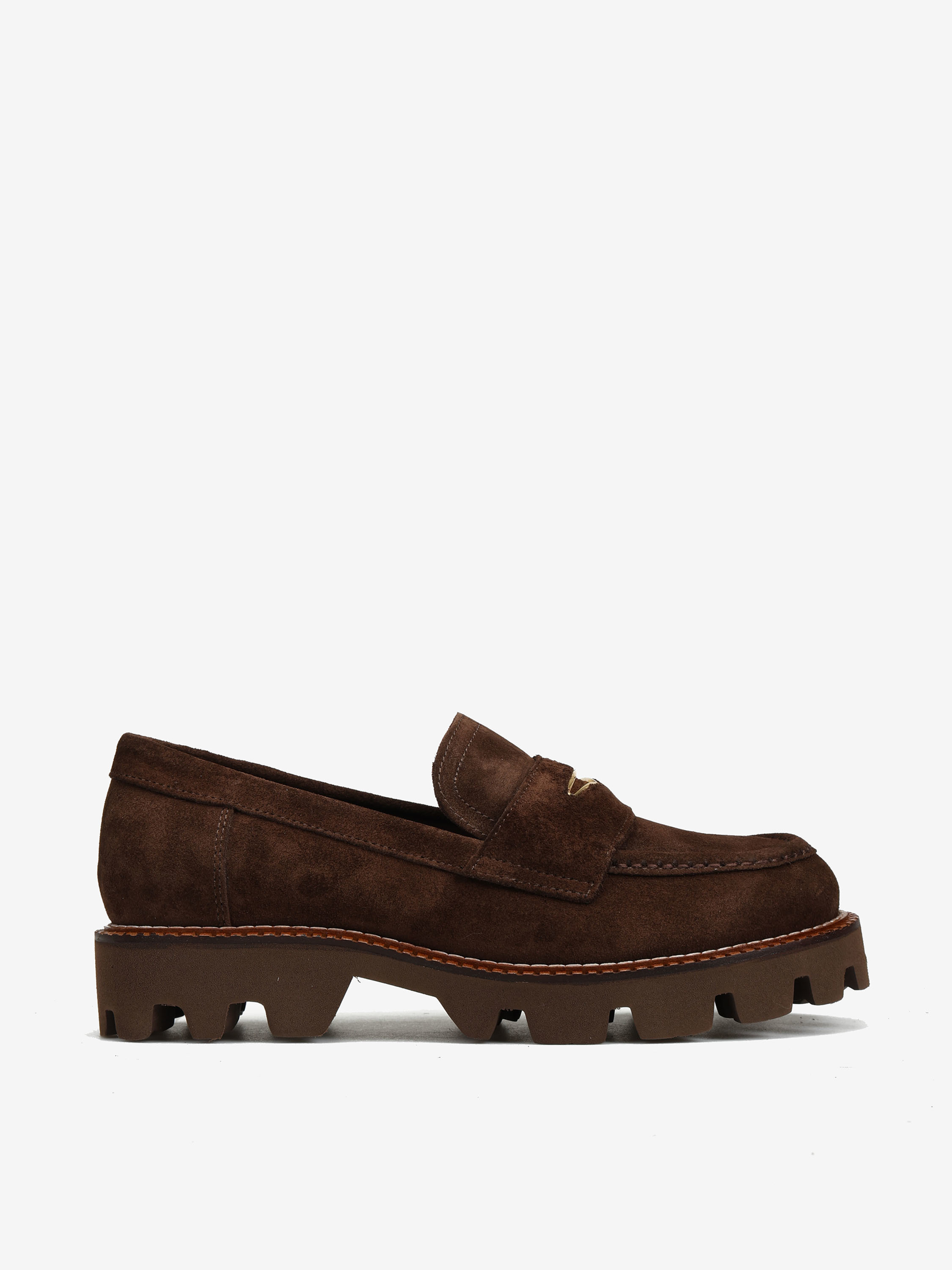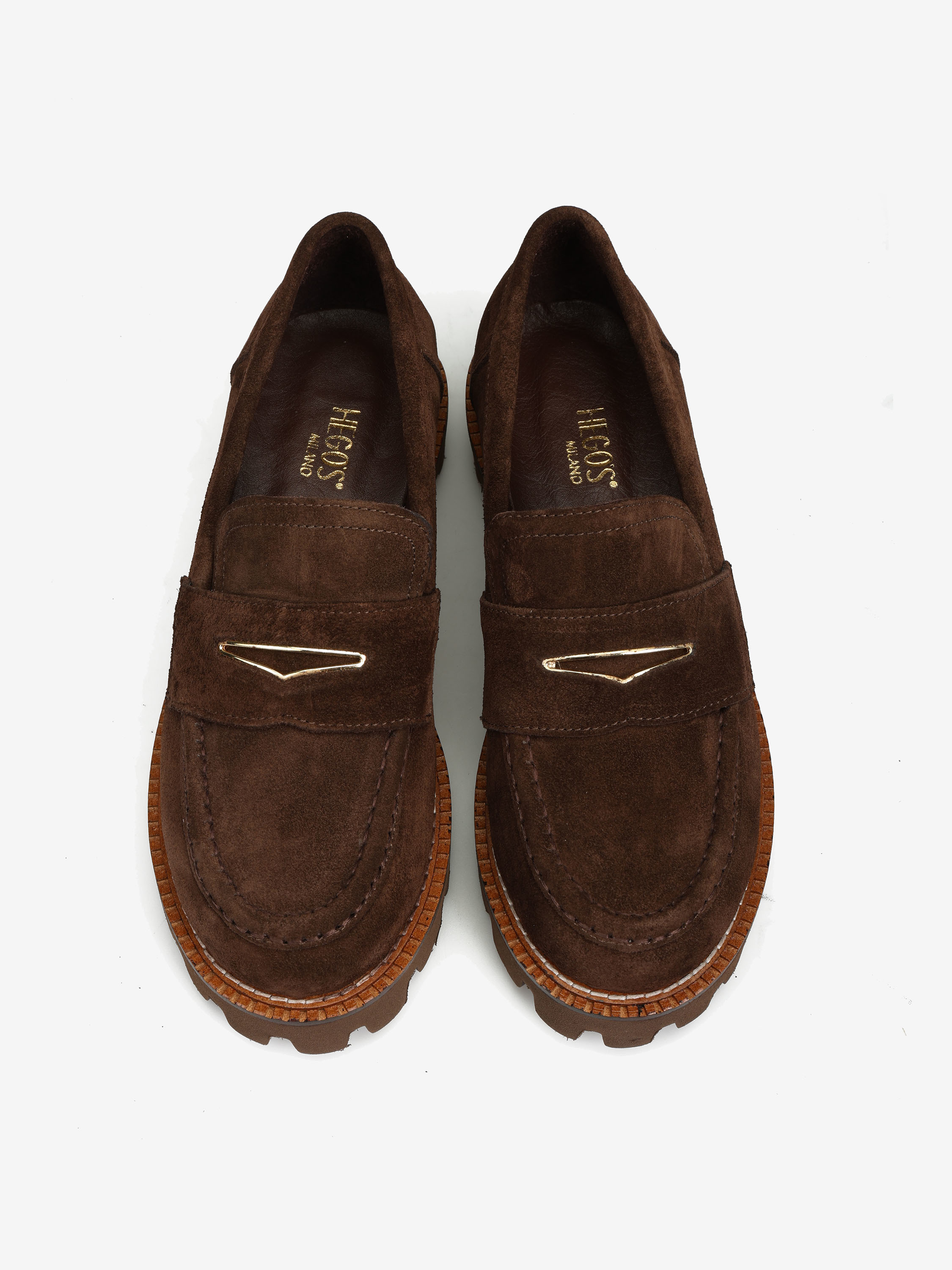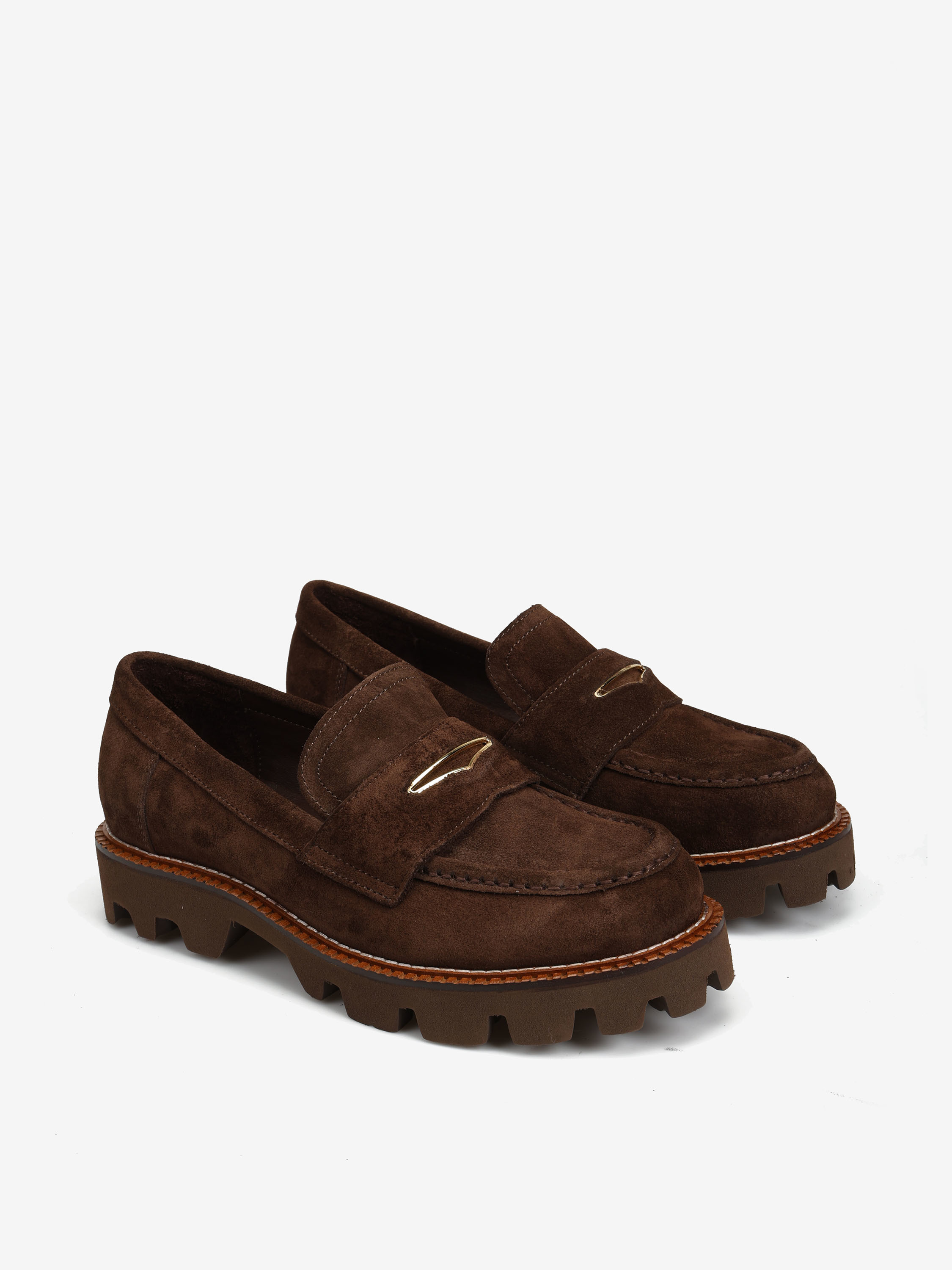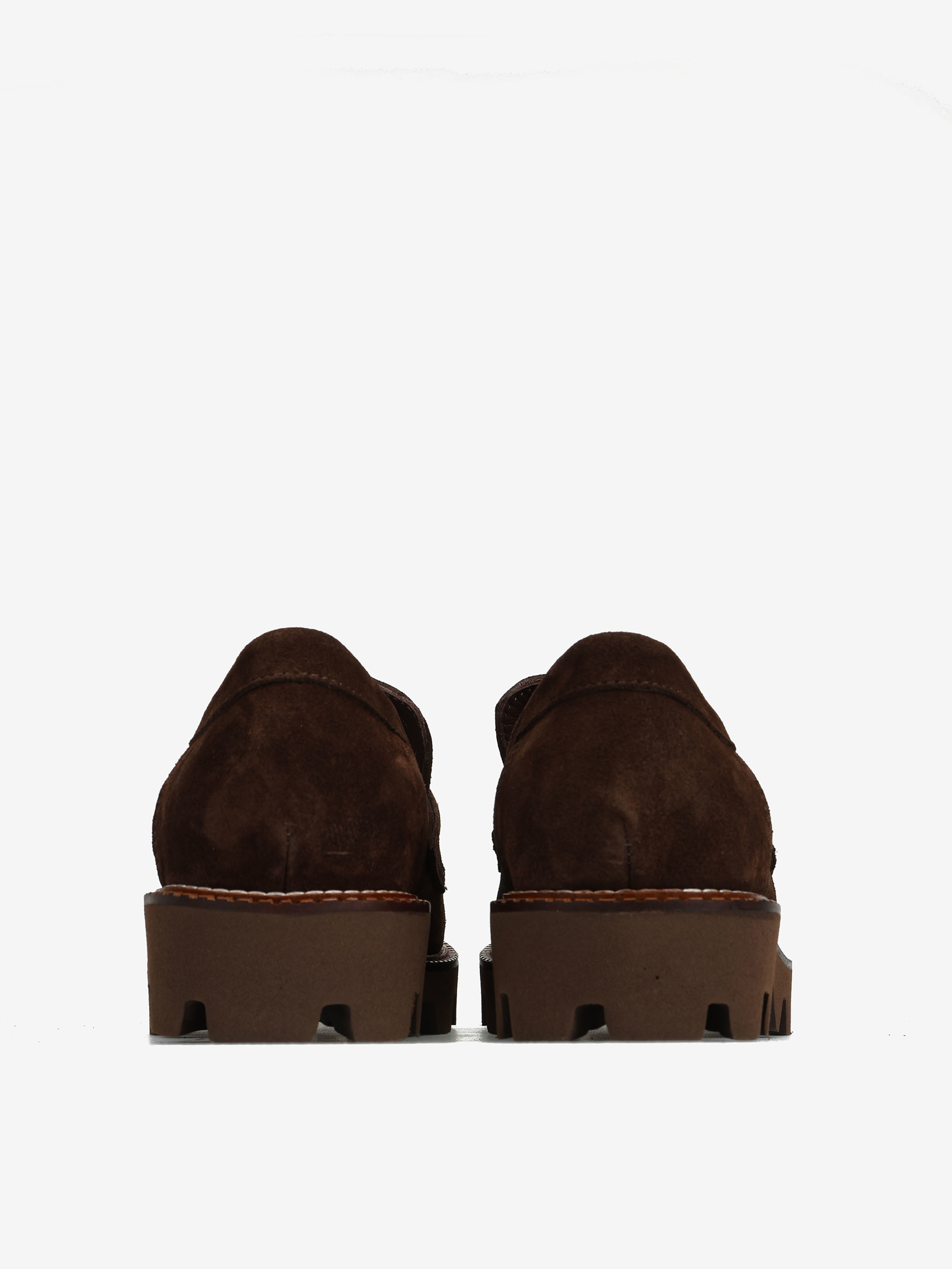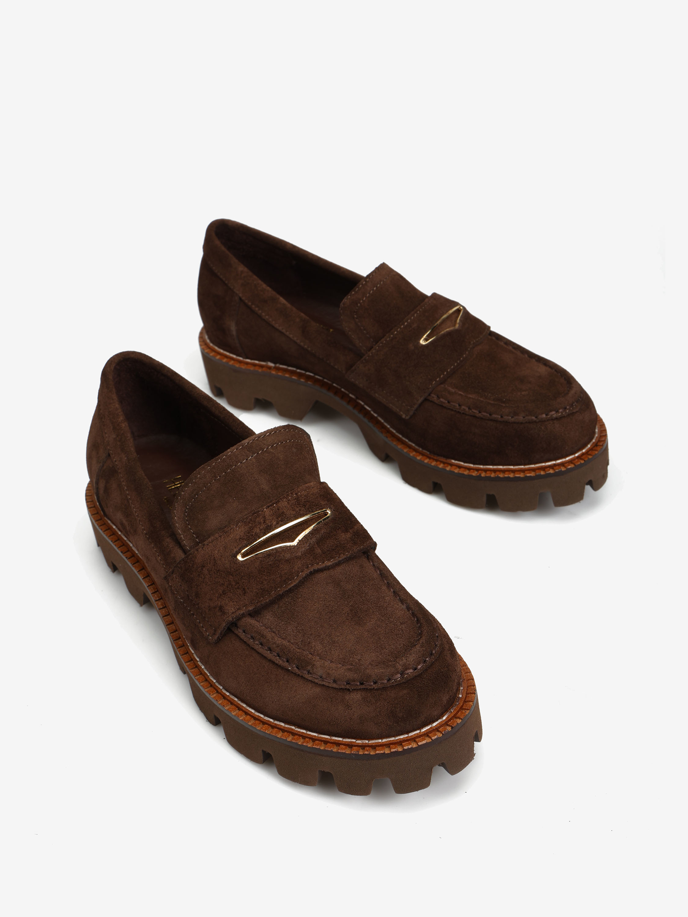 Zamszowe mokasyny na grubszej podeszwie. Ozdobna patka z metalicznym detalem.