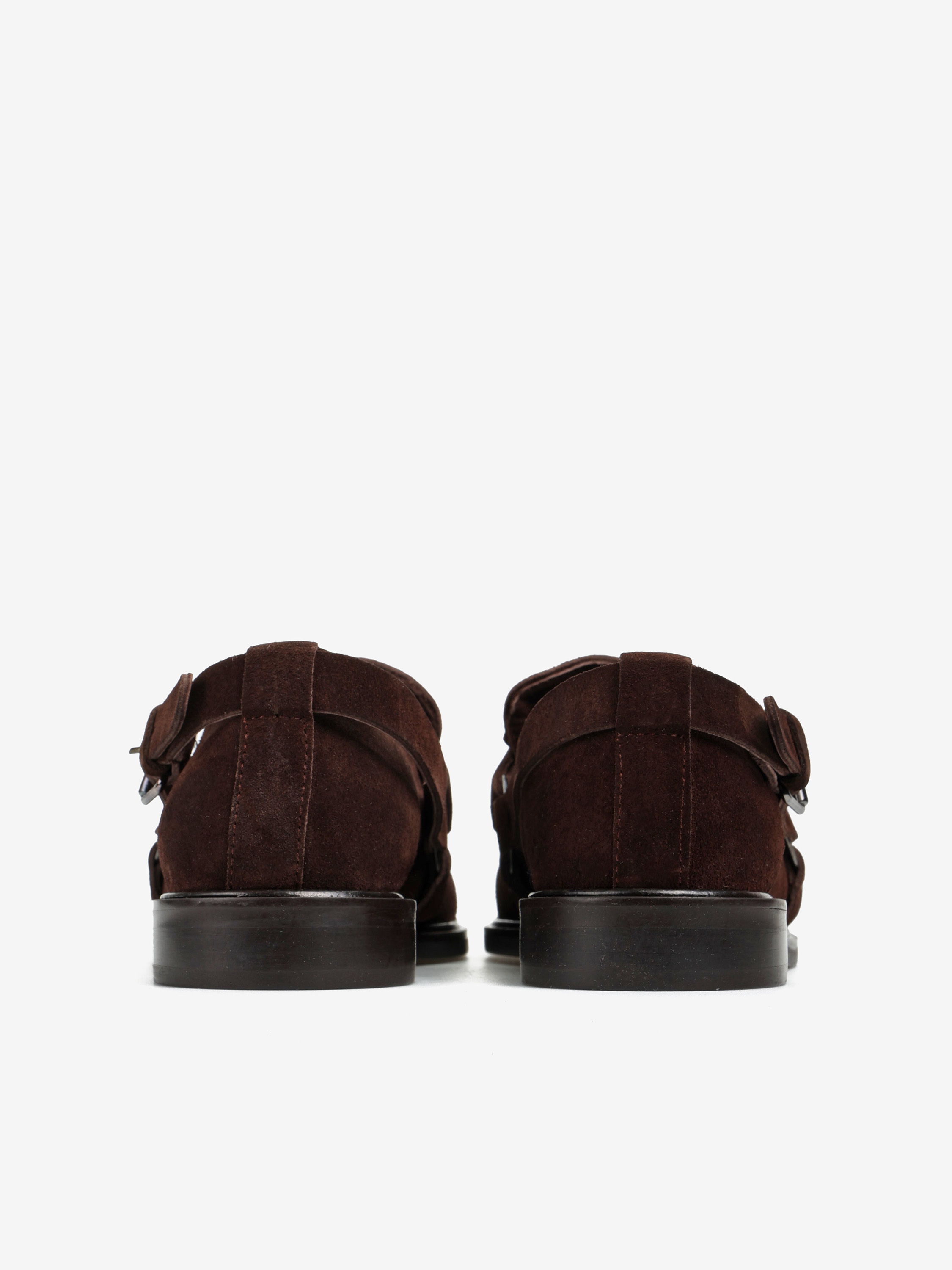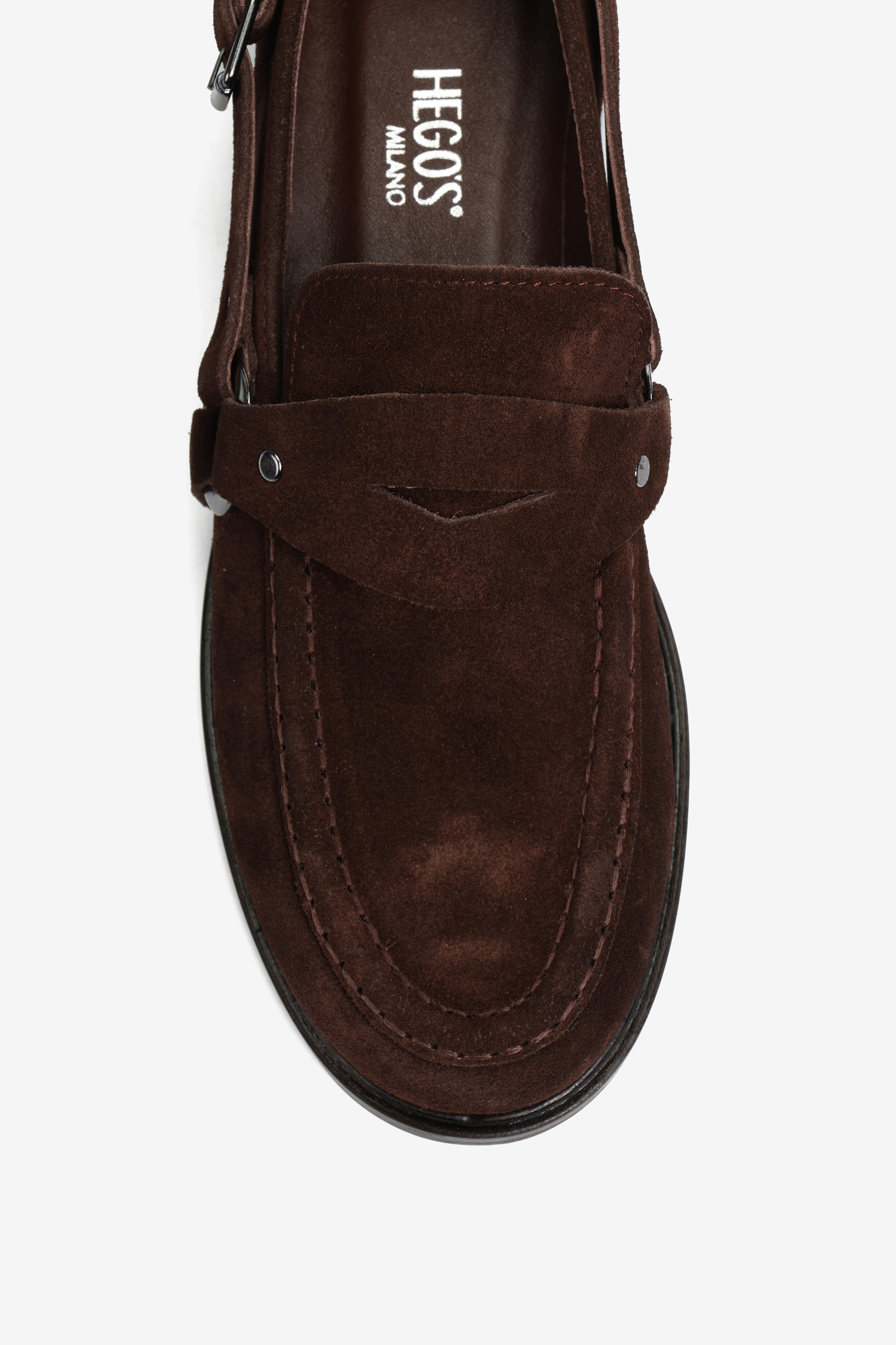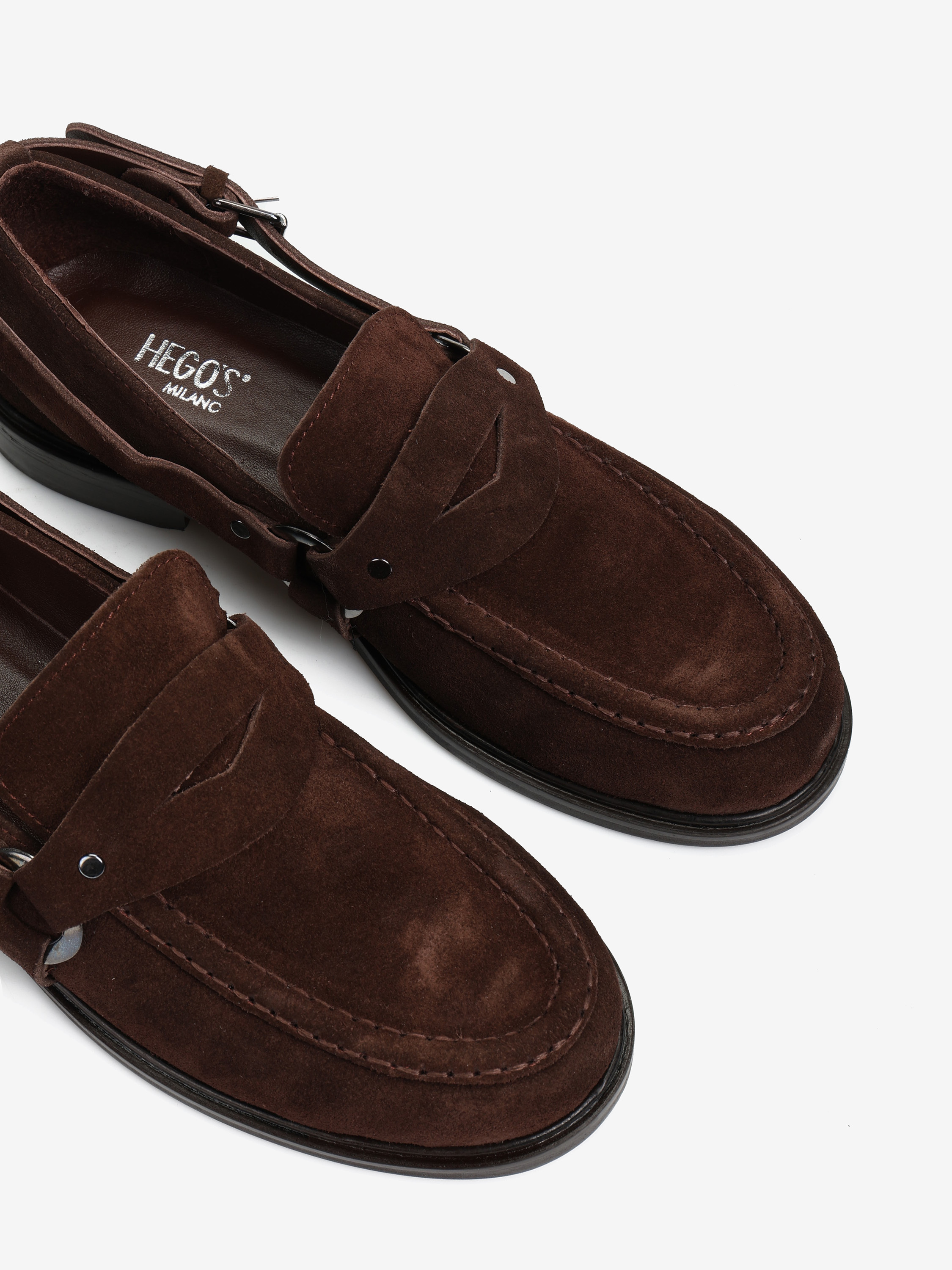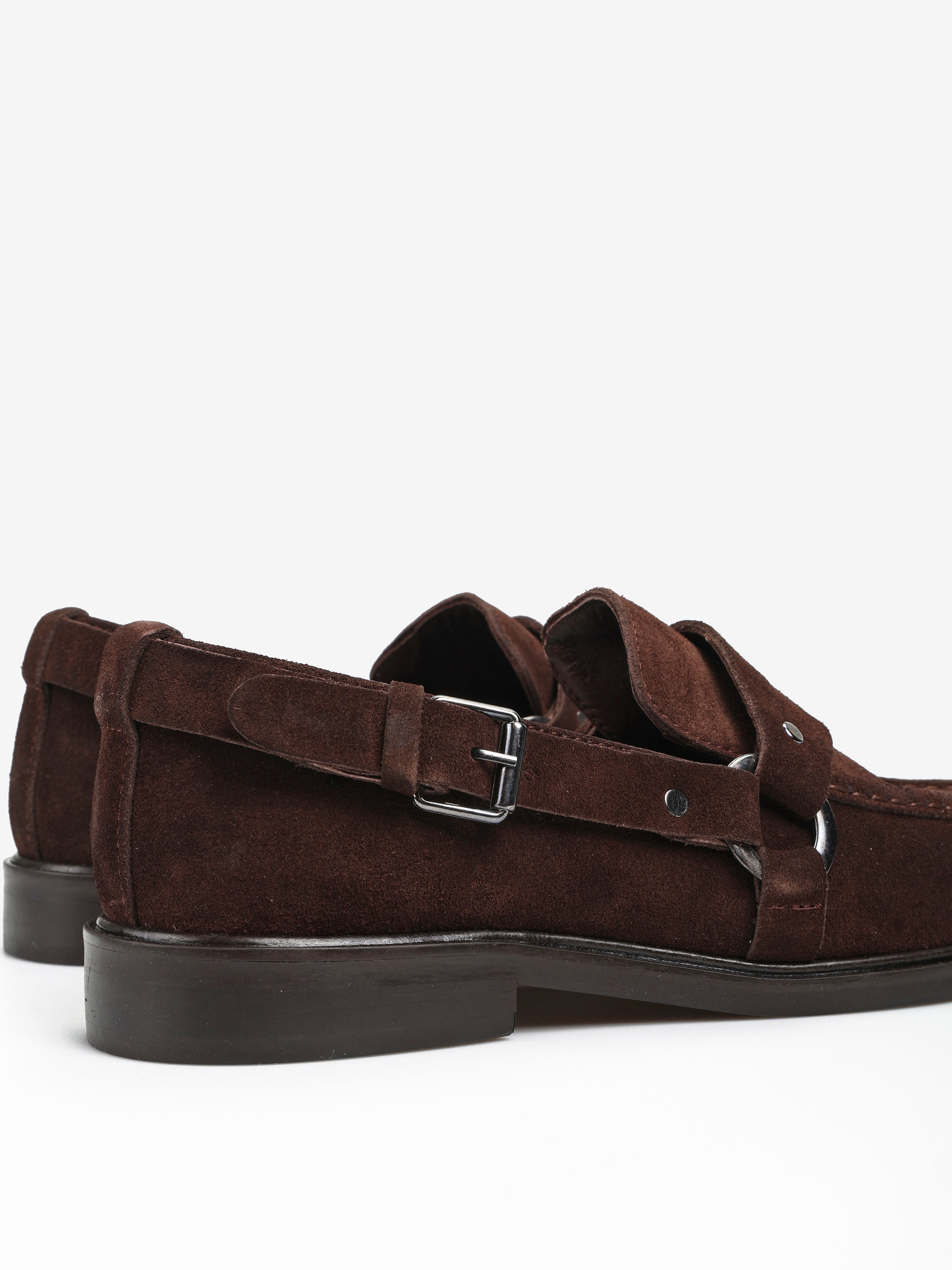 Mokasyny wykonane z czekoladowobrązowego zamszu. Ozdobna patka i pasek z wędzidłem z boku cholewki
