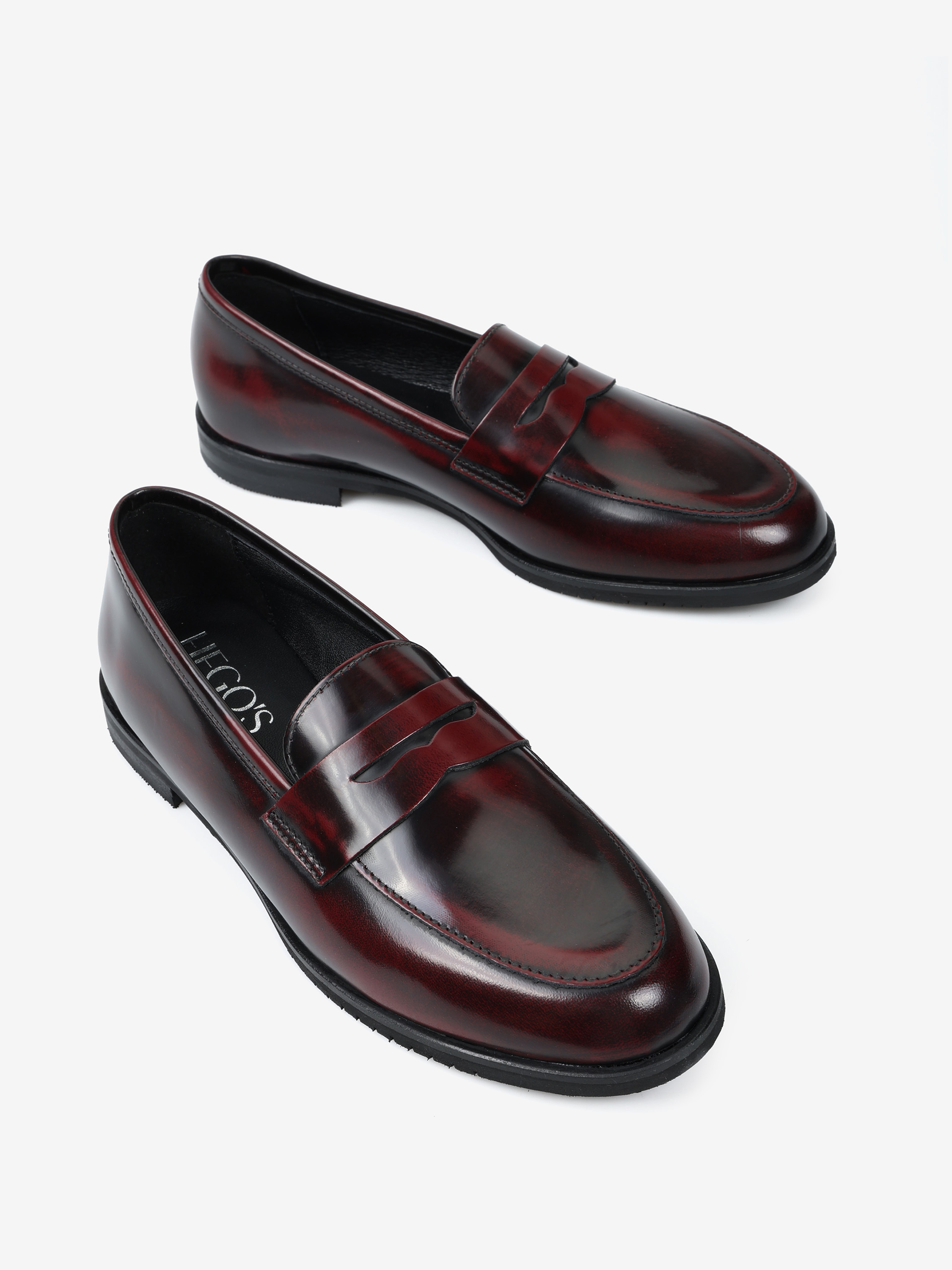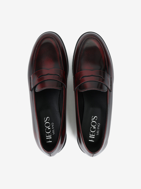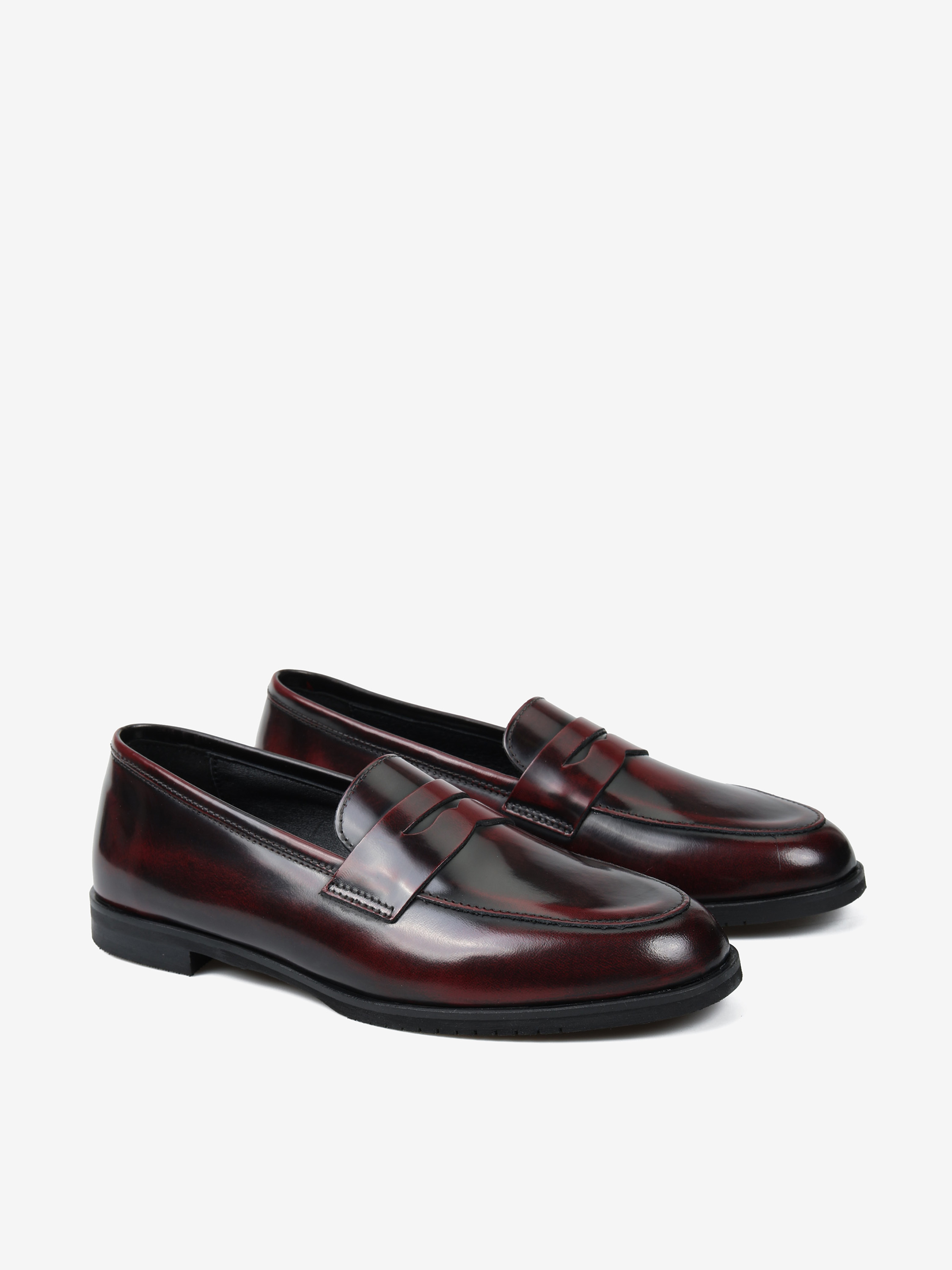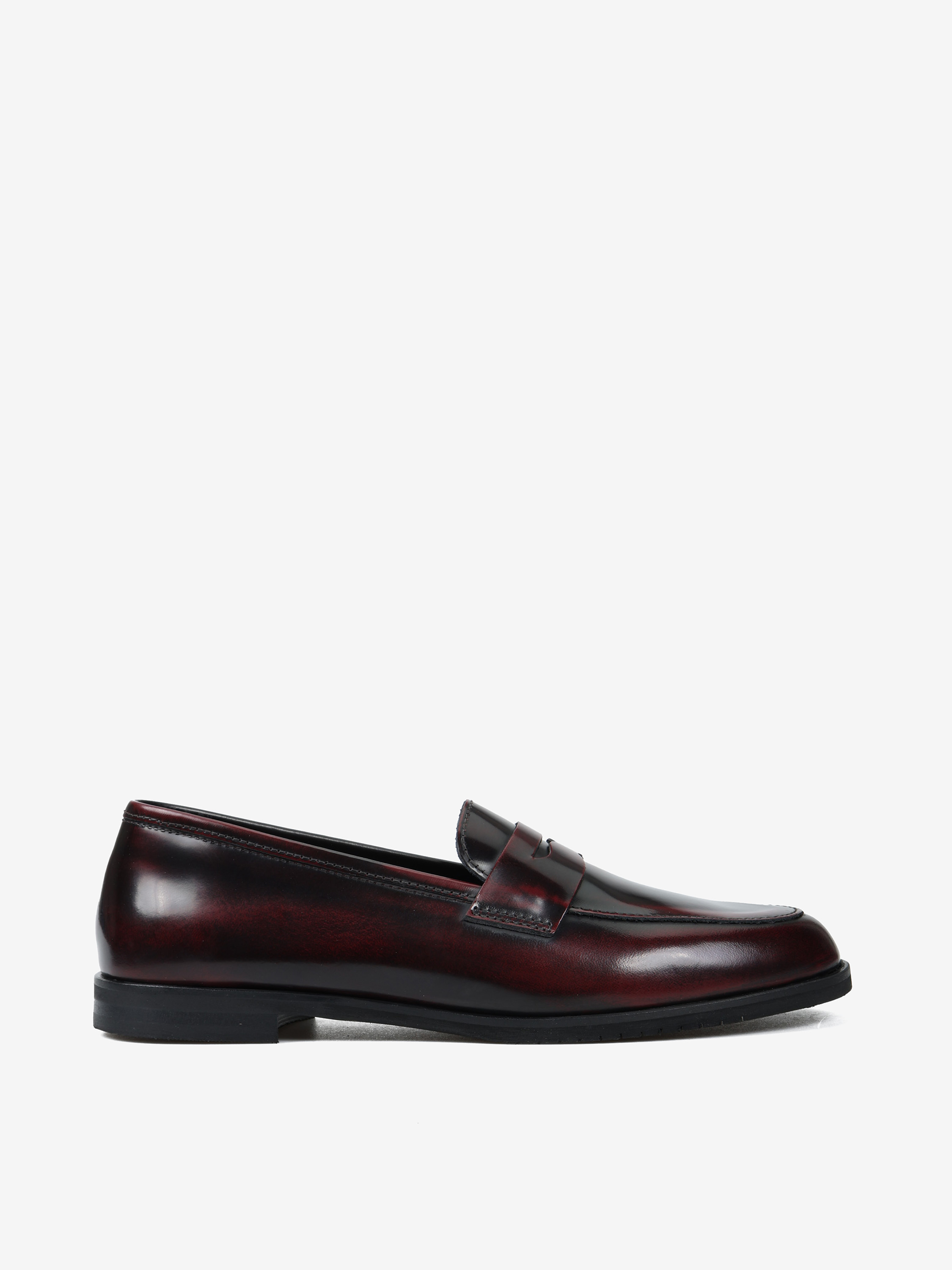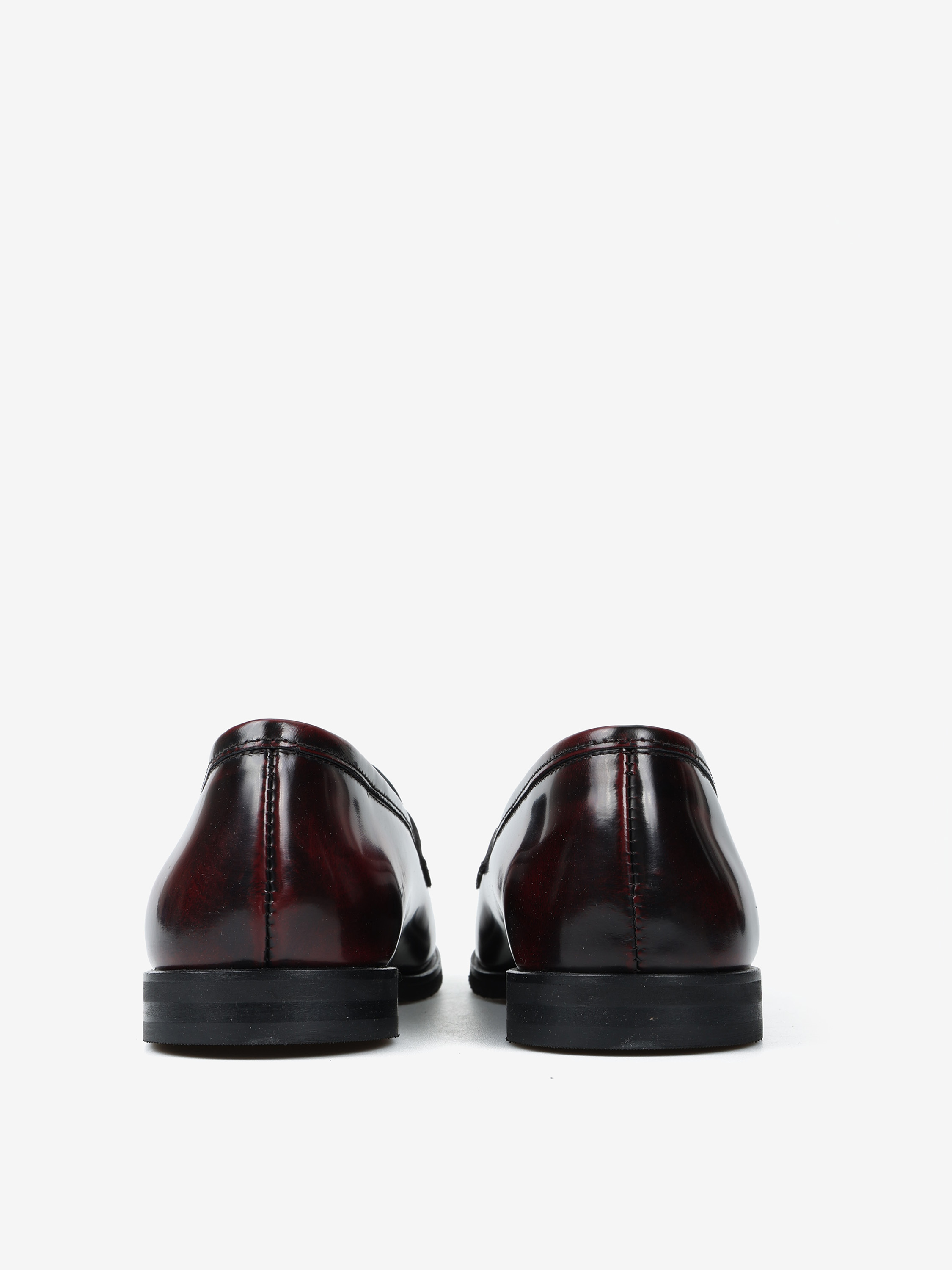 Klasyczne mokasyny z patką, wykonane z wysokopolerowanej skóry z efektem sprania.