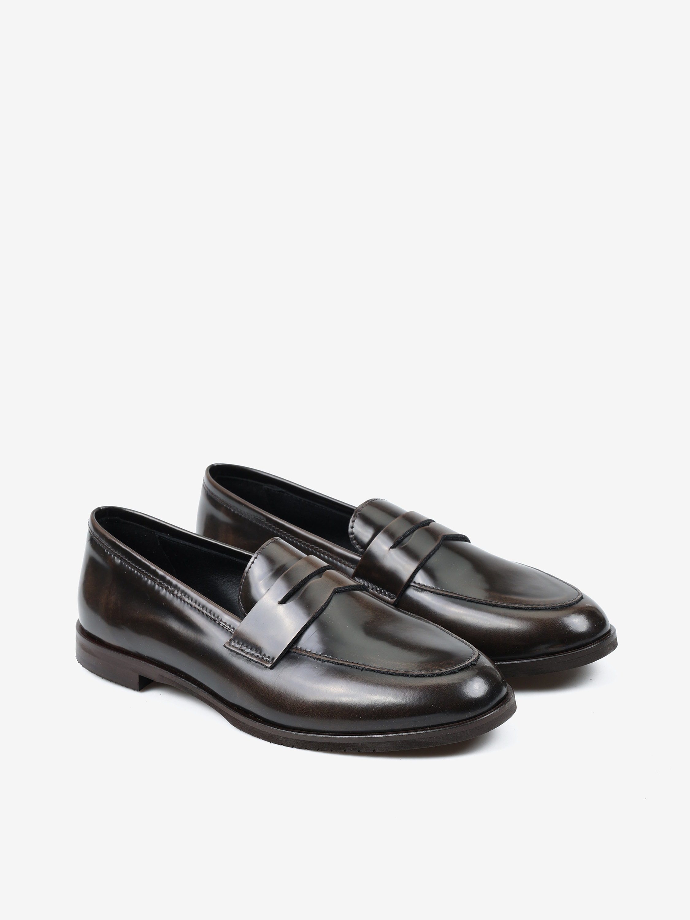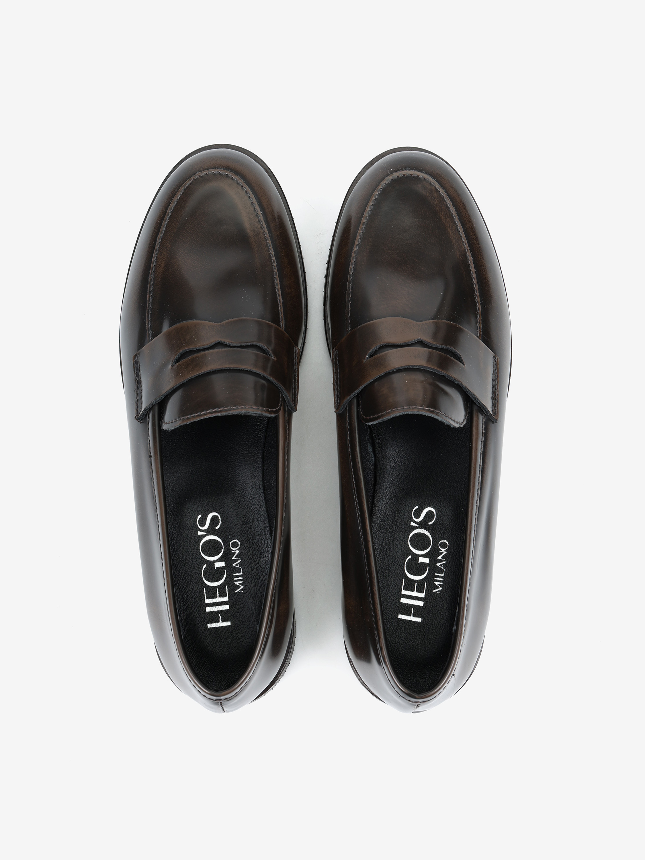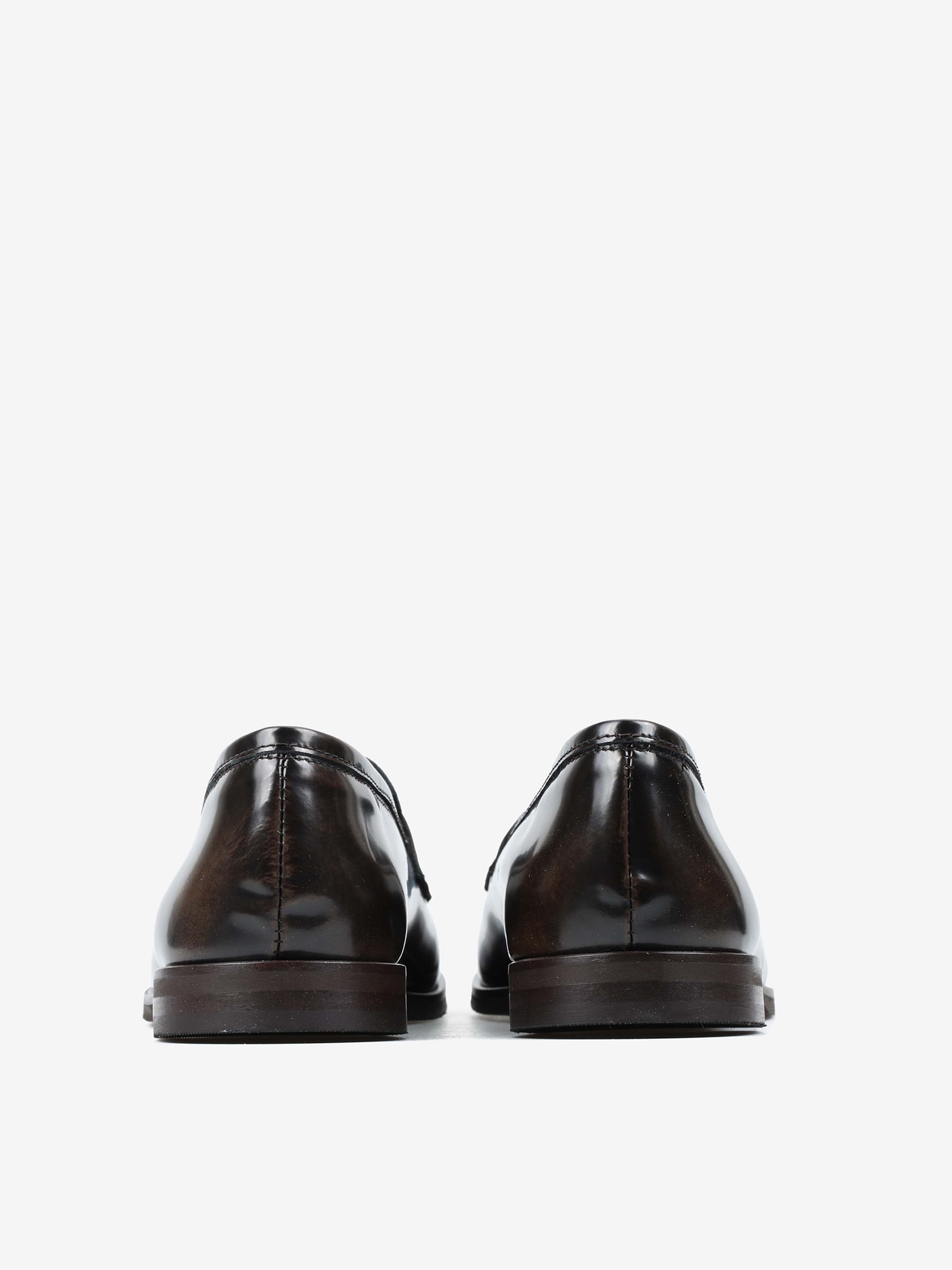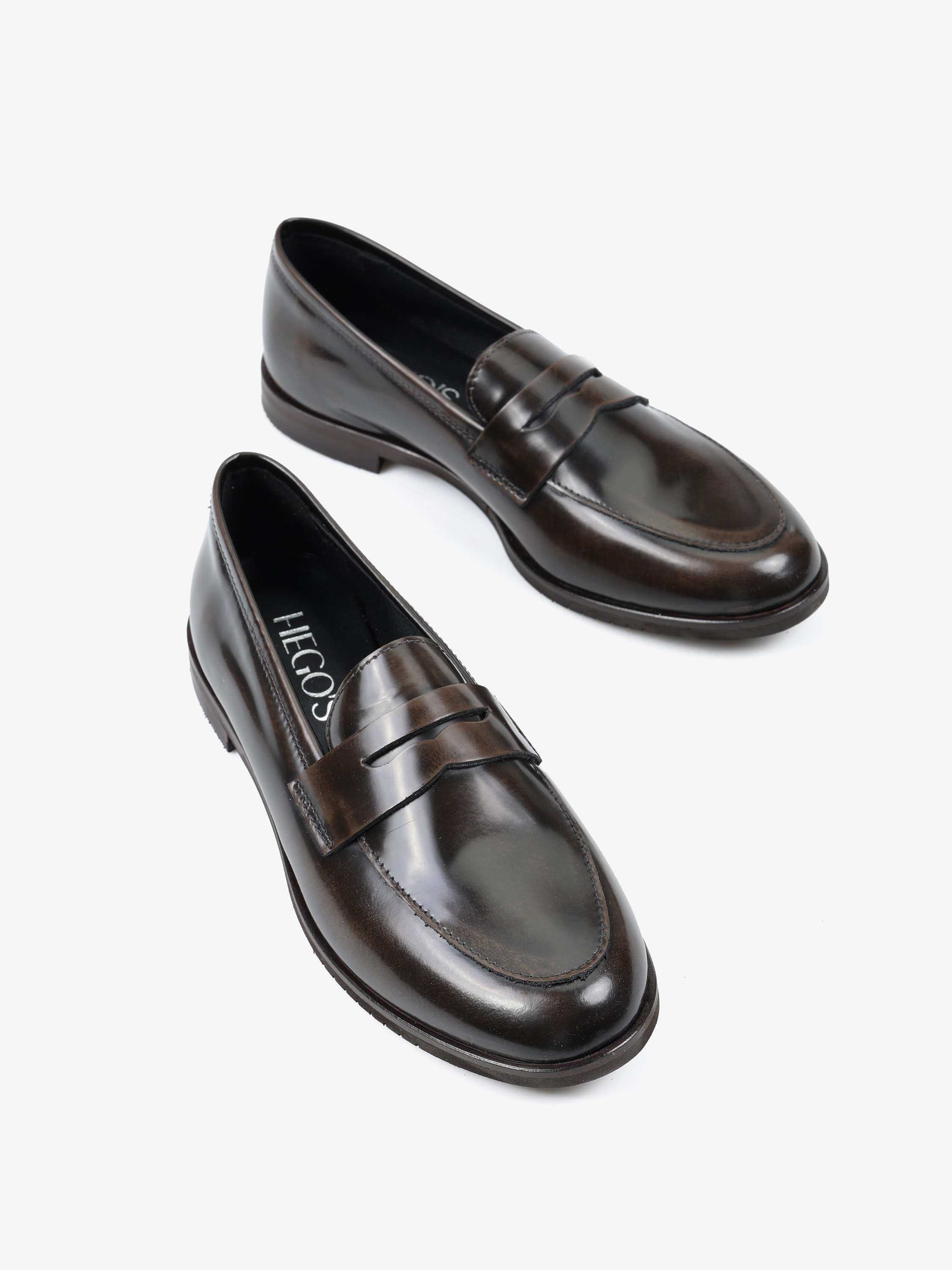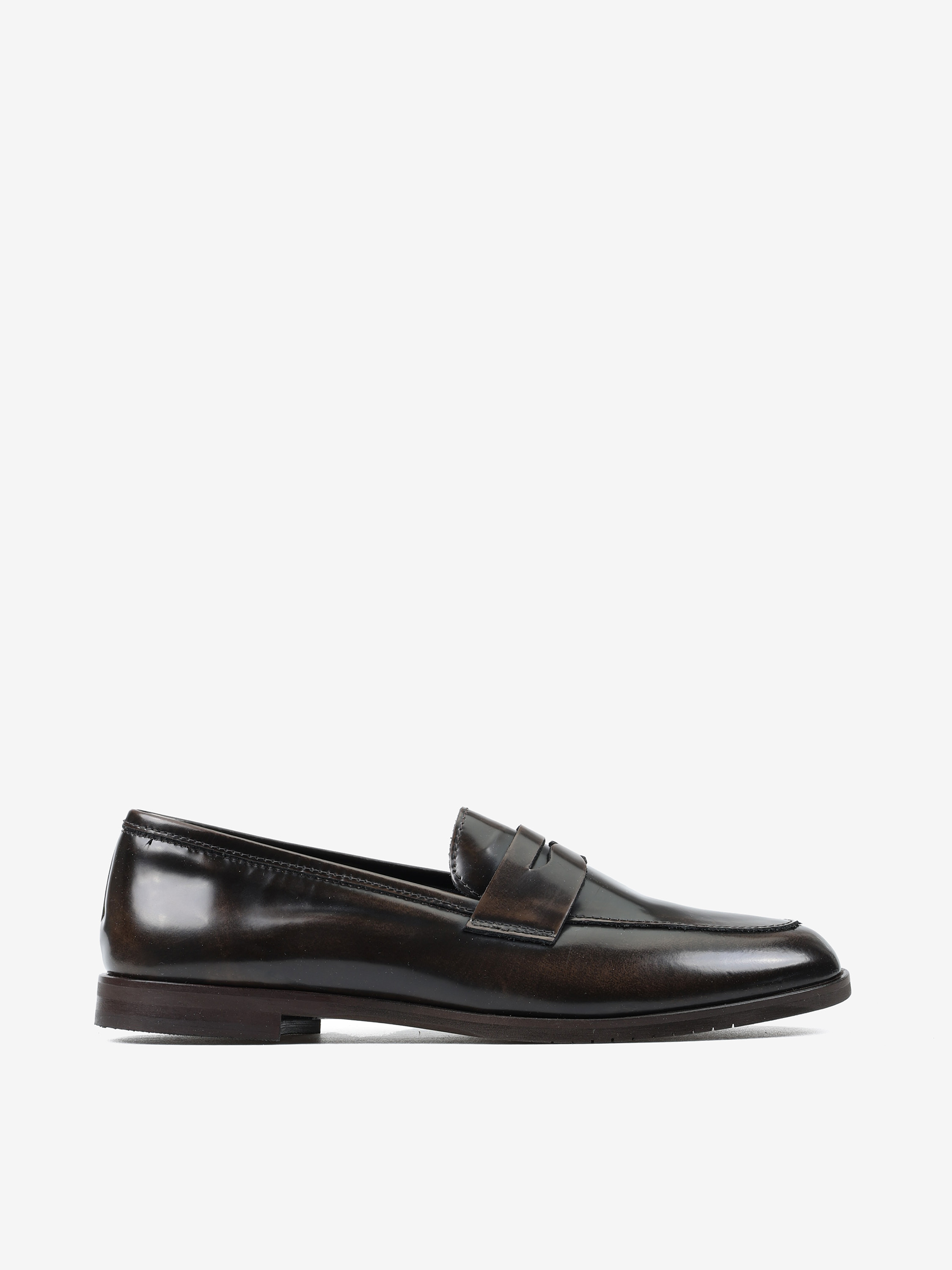 Klasyczne mokasyny z patką, wykonane z wysokopolerowanej skóry z delikatnym efektem sprania.
