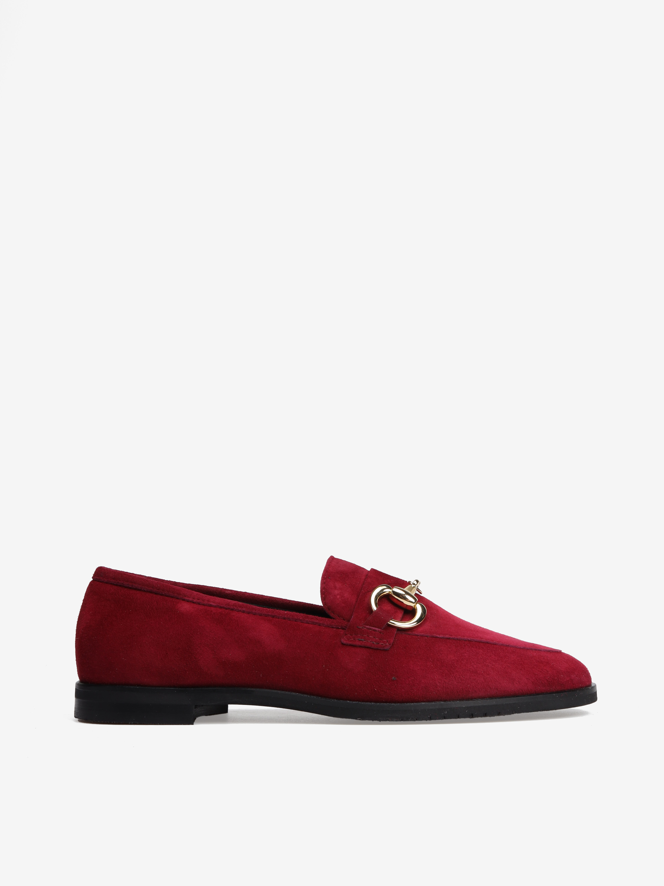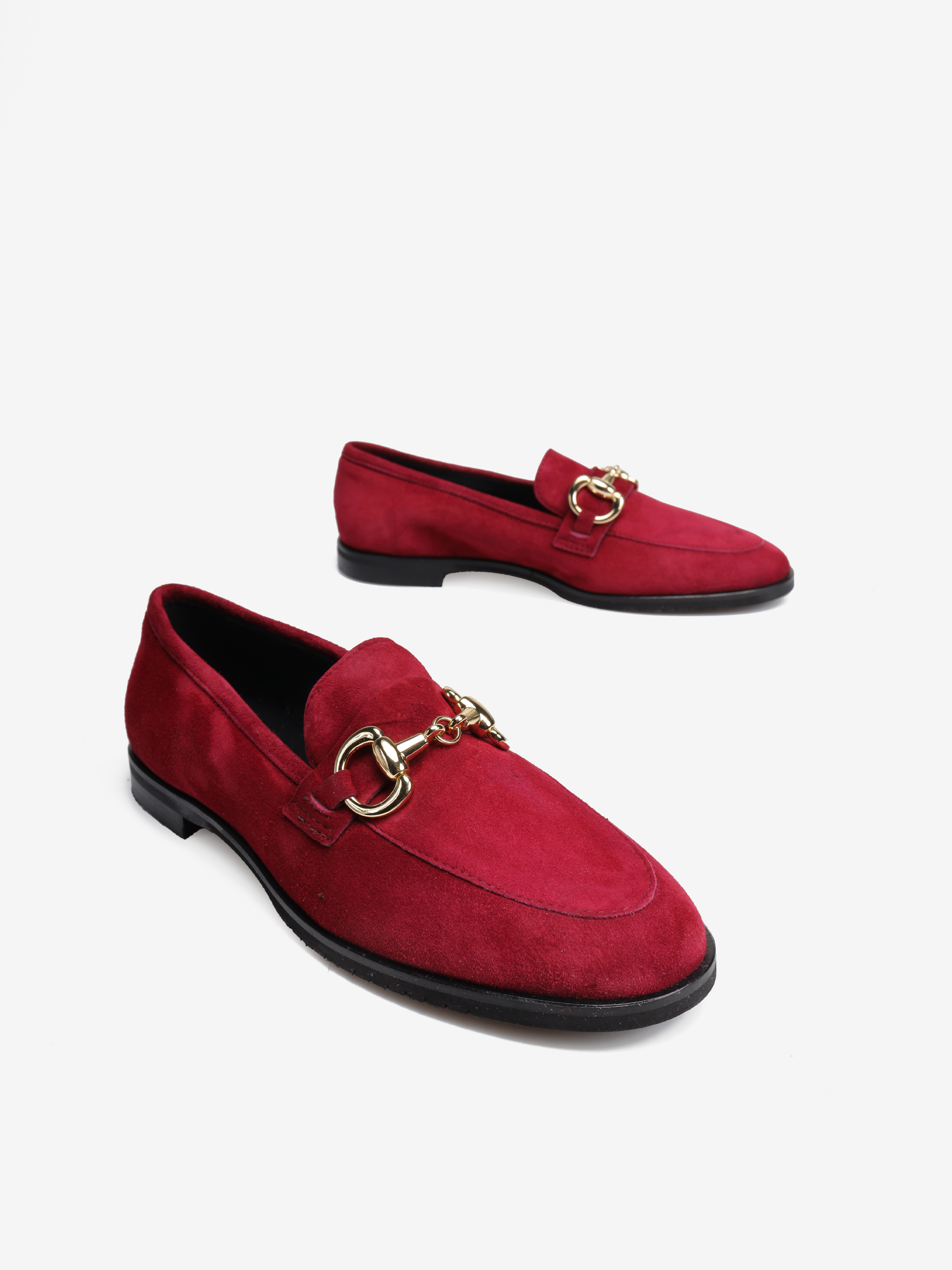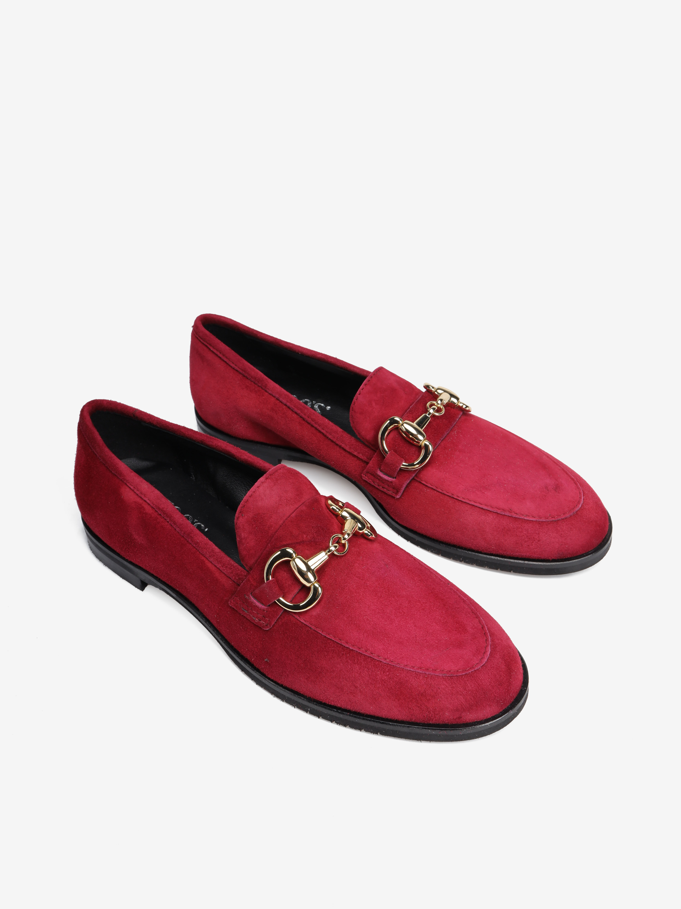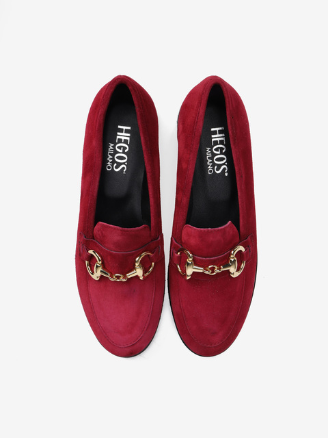 Mokasyny na płaskim obcasie wykonane są z włoskiej skóry zamszowej. Cholewka w ponadczasowym, czerwonym kolorze ozdobiona została złotym wędzidłem. Miękkie i wygodne.