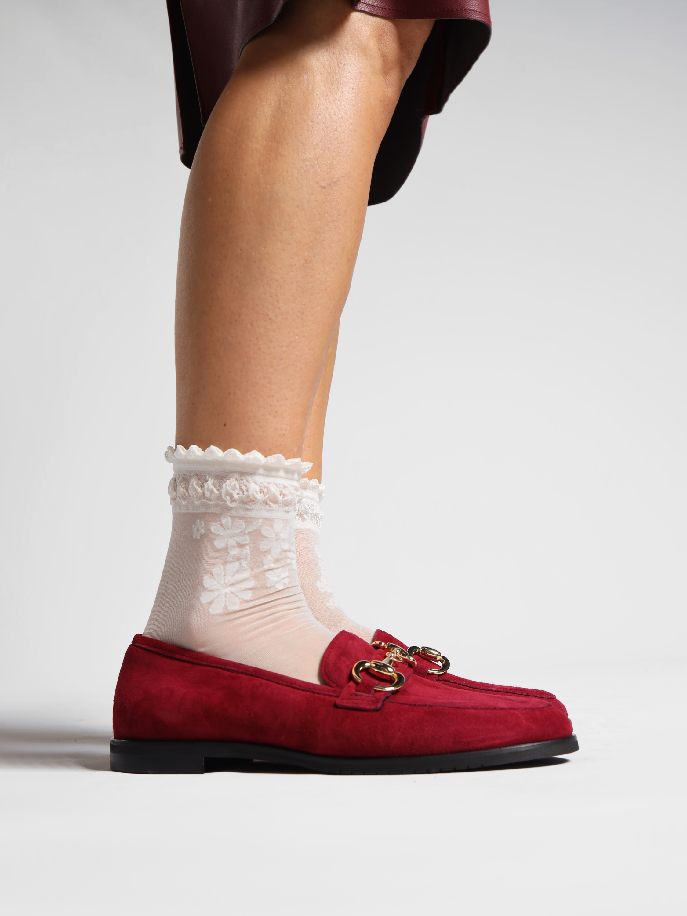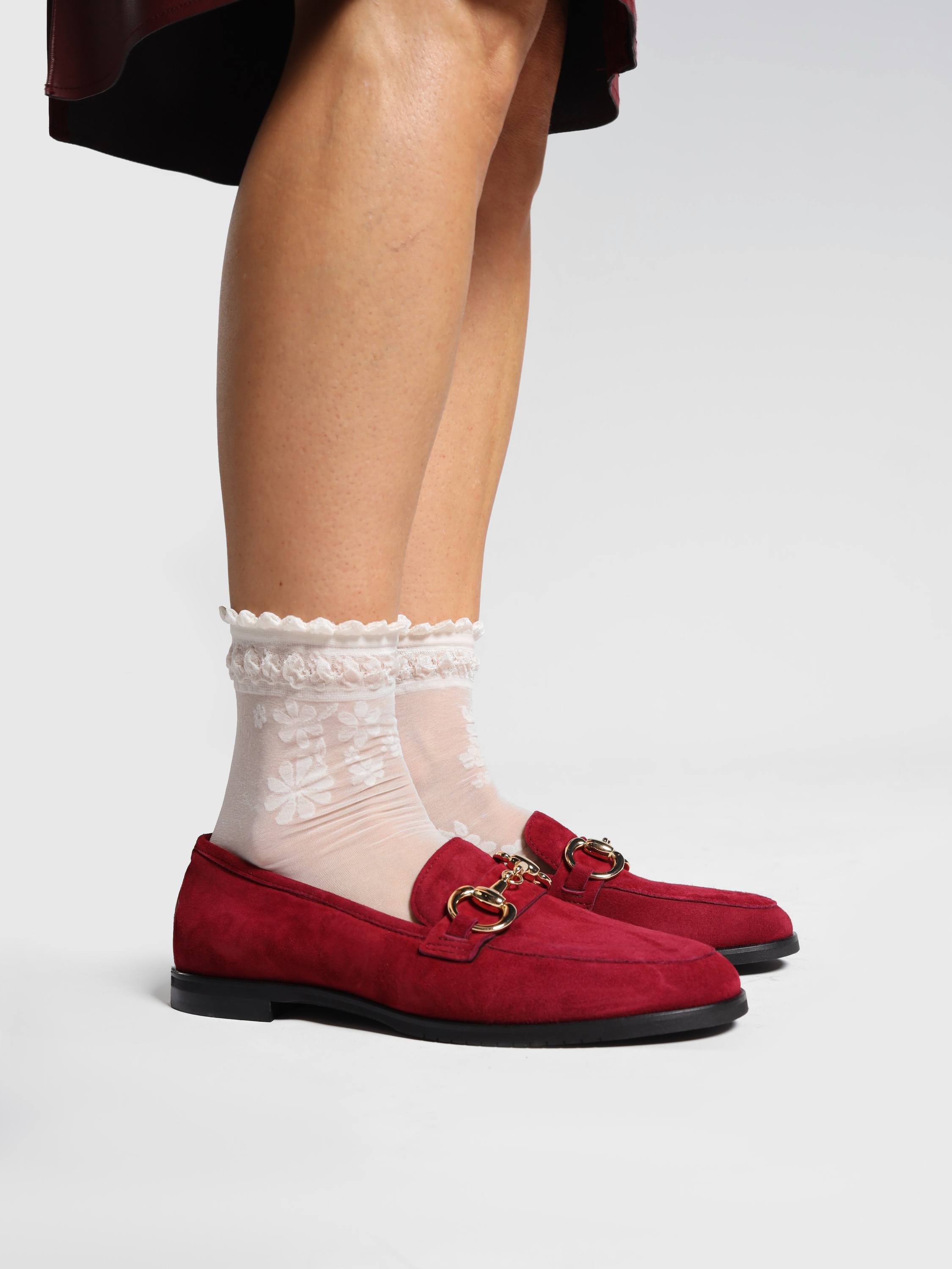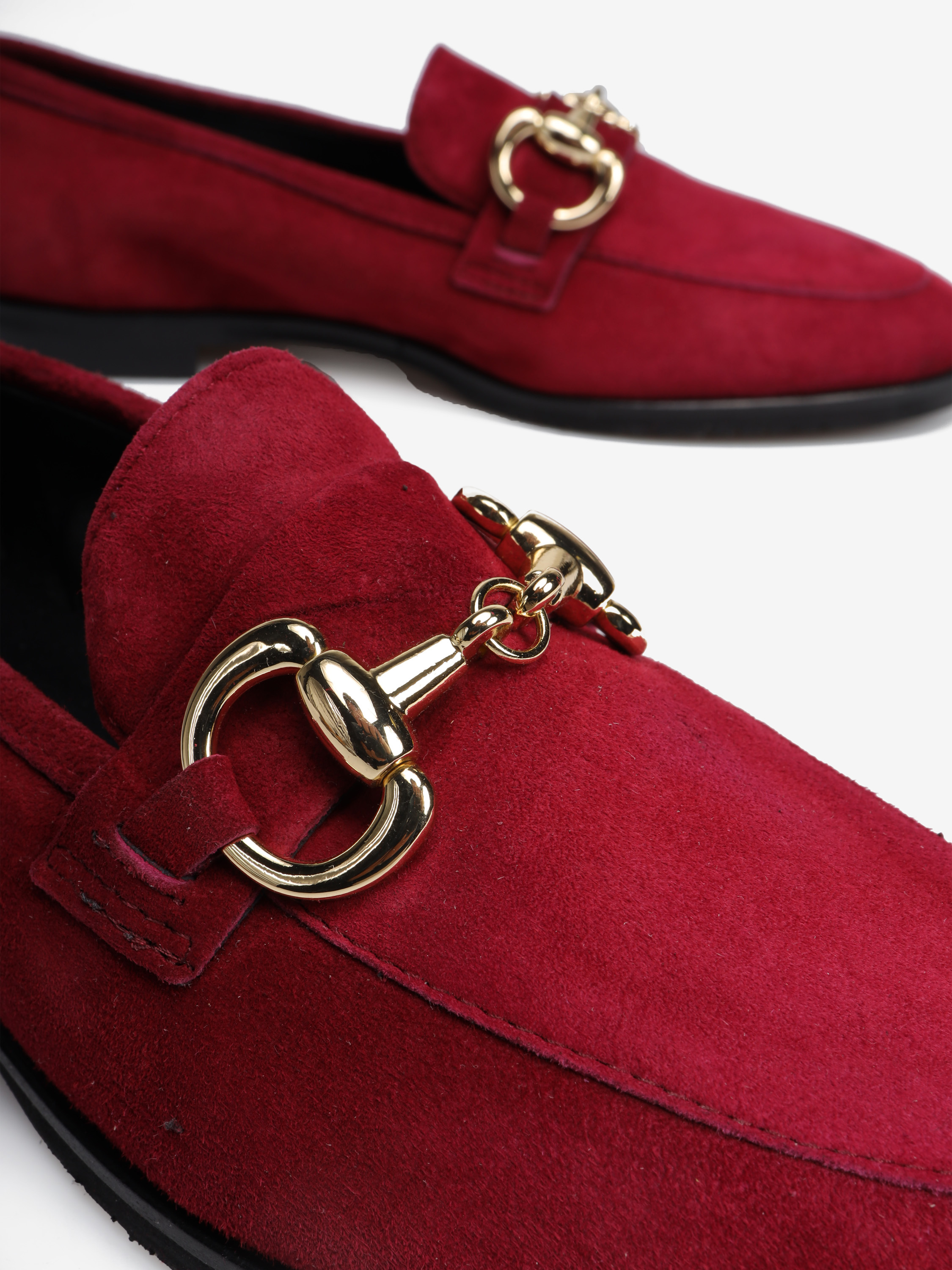 Mokasyny na płaskim obcasie wykonane są z włoskiej skóry zamszowej. Cholewka w ponadczasowym, czerwonym kolorze ozdobiona została złotym wędzidłem. Miękkie i wygodne.