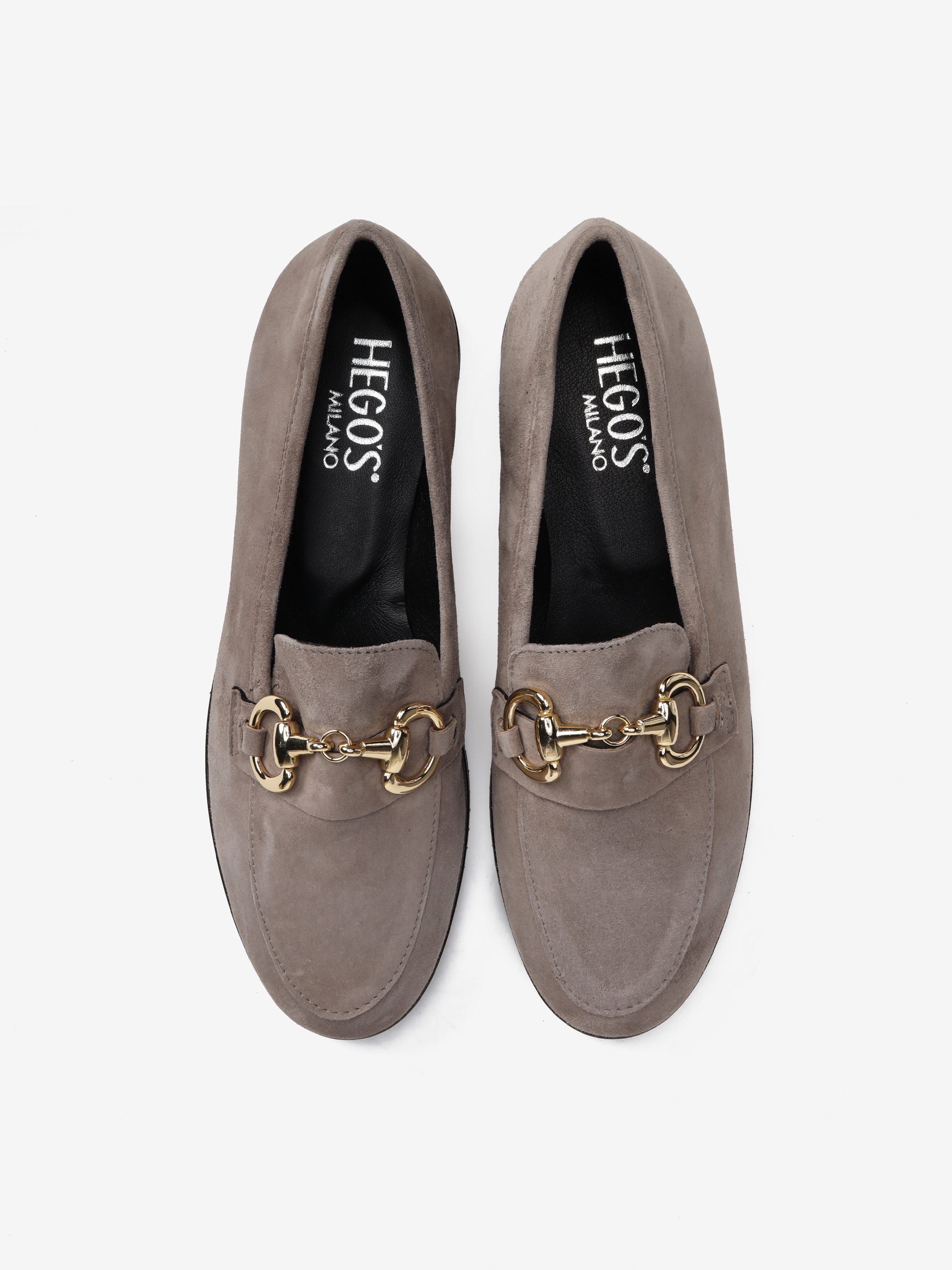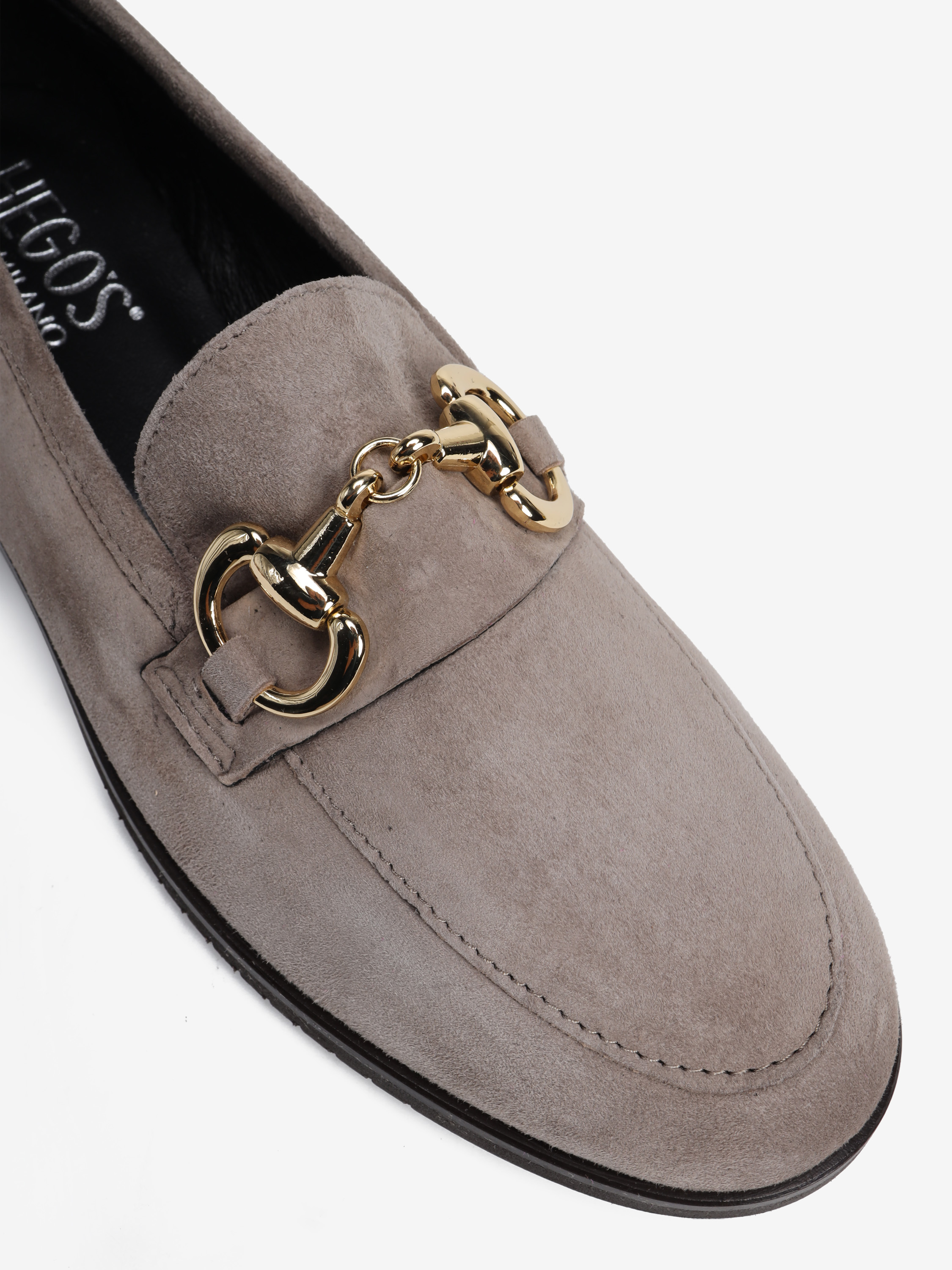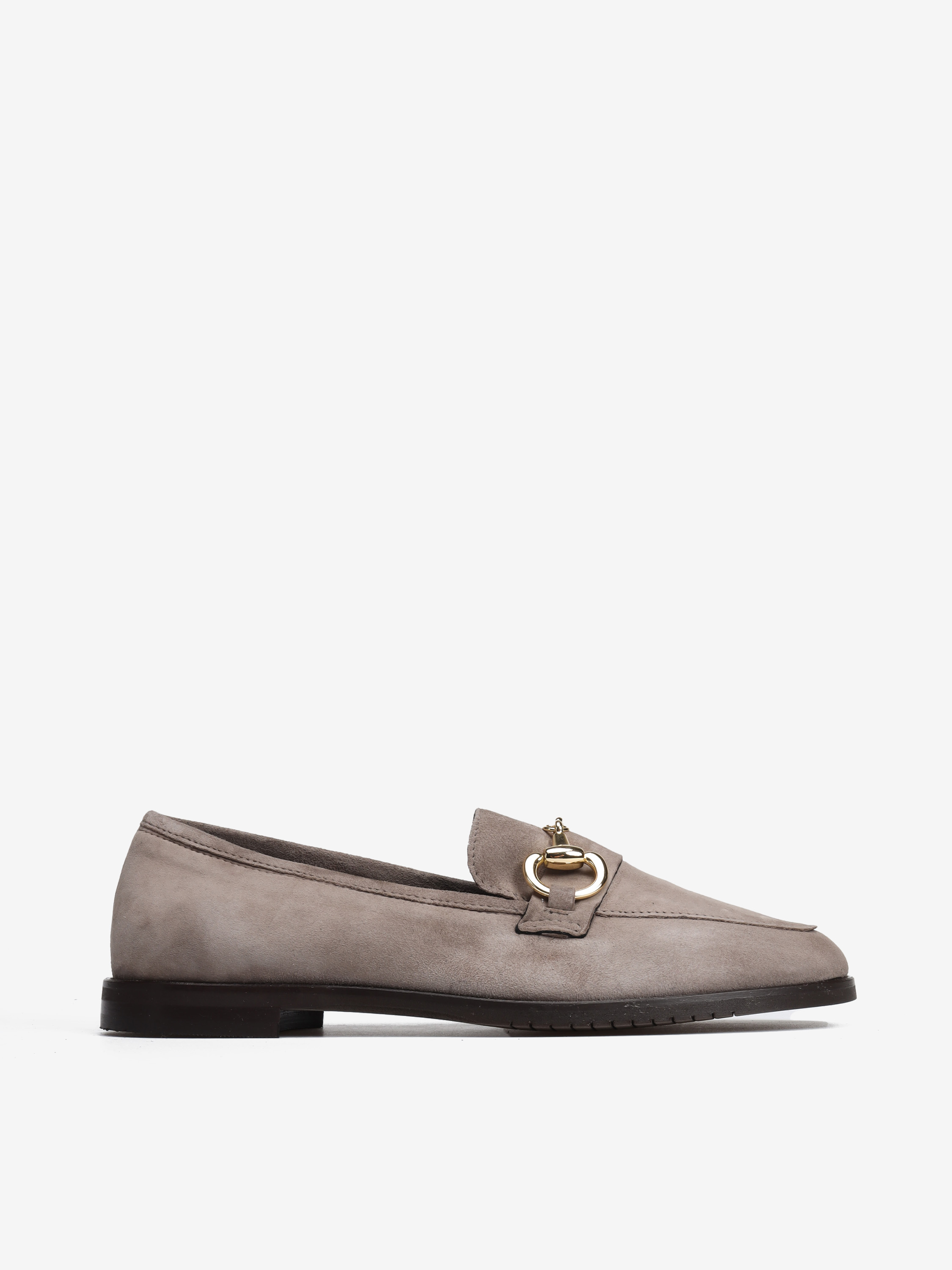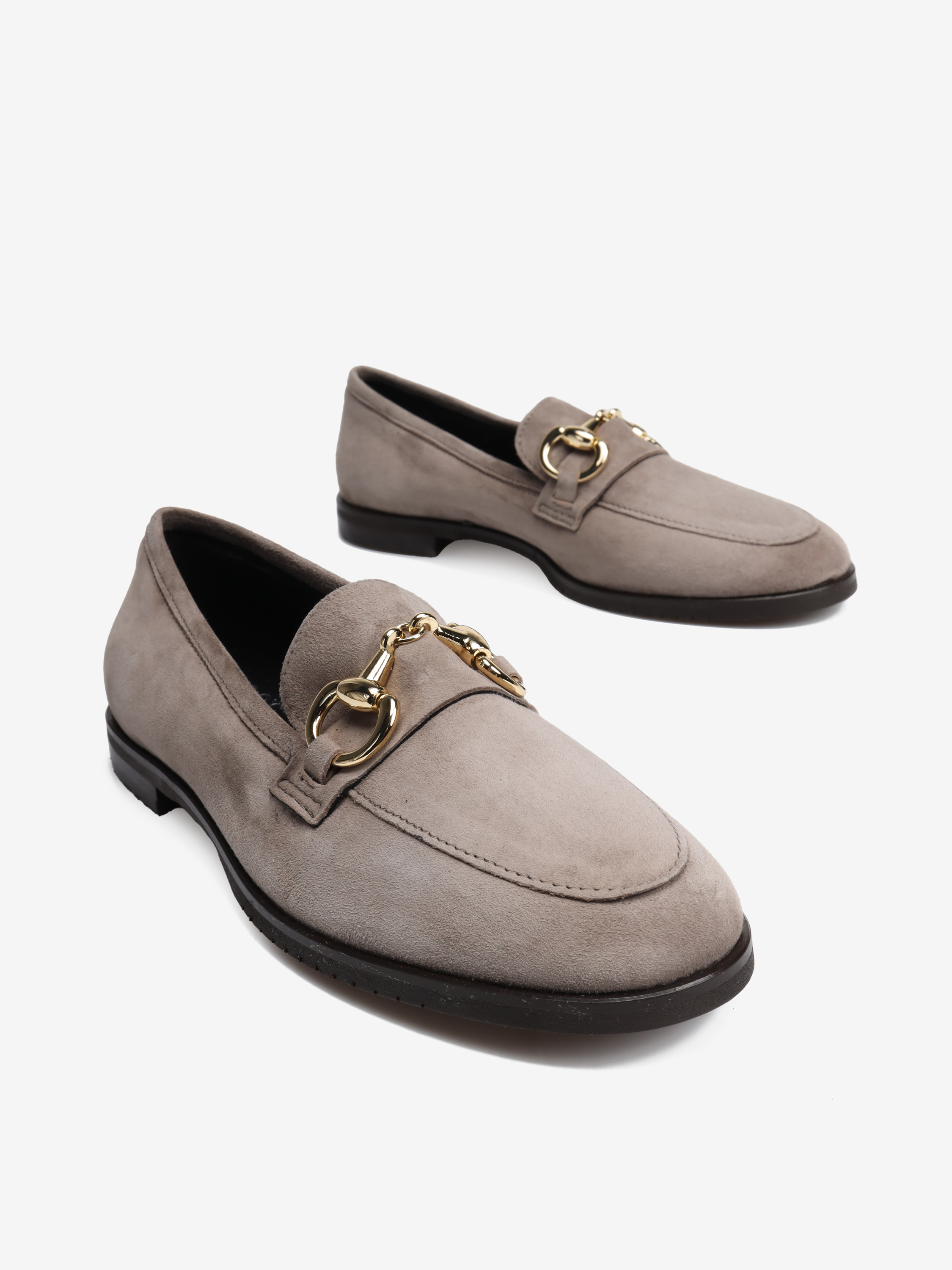 Mokasyny na płaskim obcasie wykonane są z włoskiej skóry zamszowej. Cholewka w ponadczasowym, szaro beżowym kolorze ozdobiona została złotym wędzidłem. Miękkie i wygodne.
