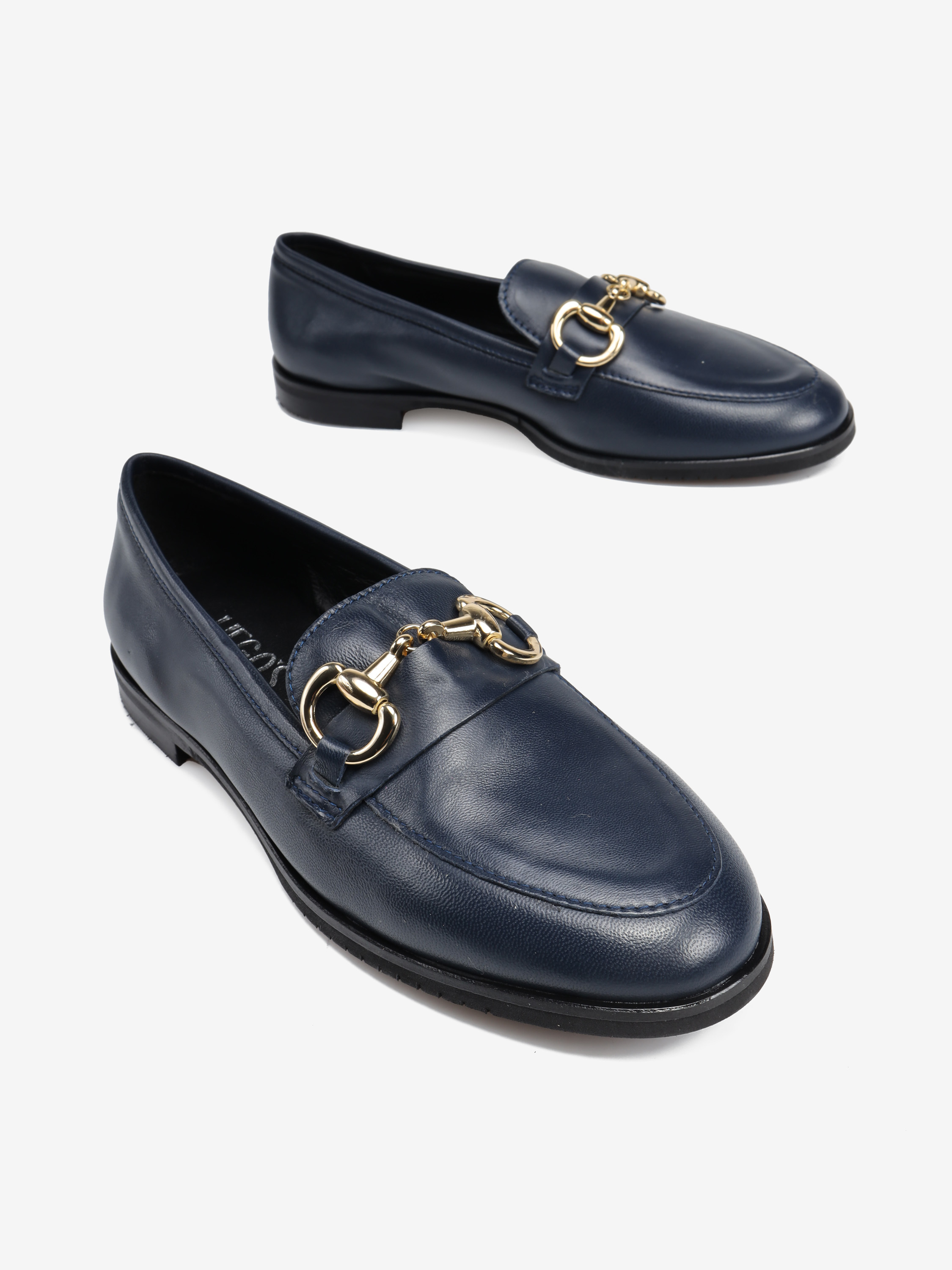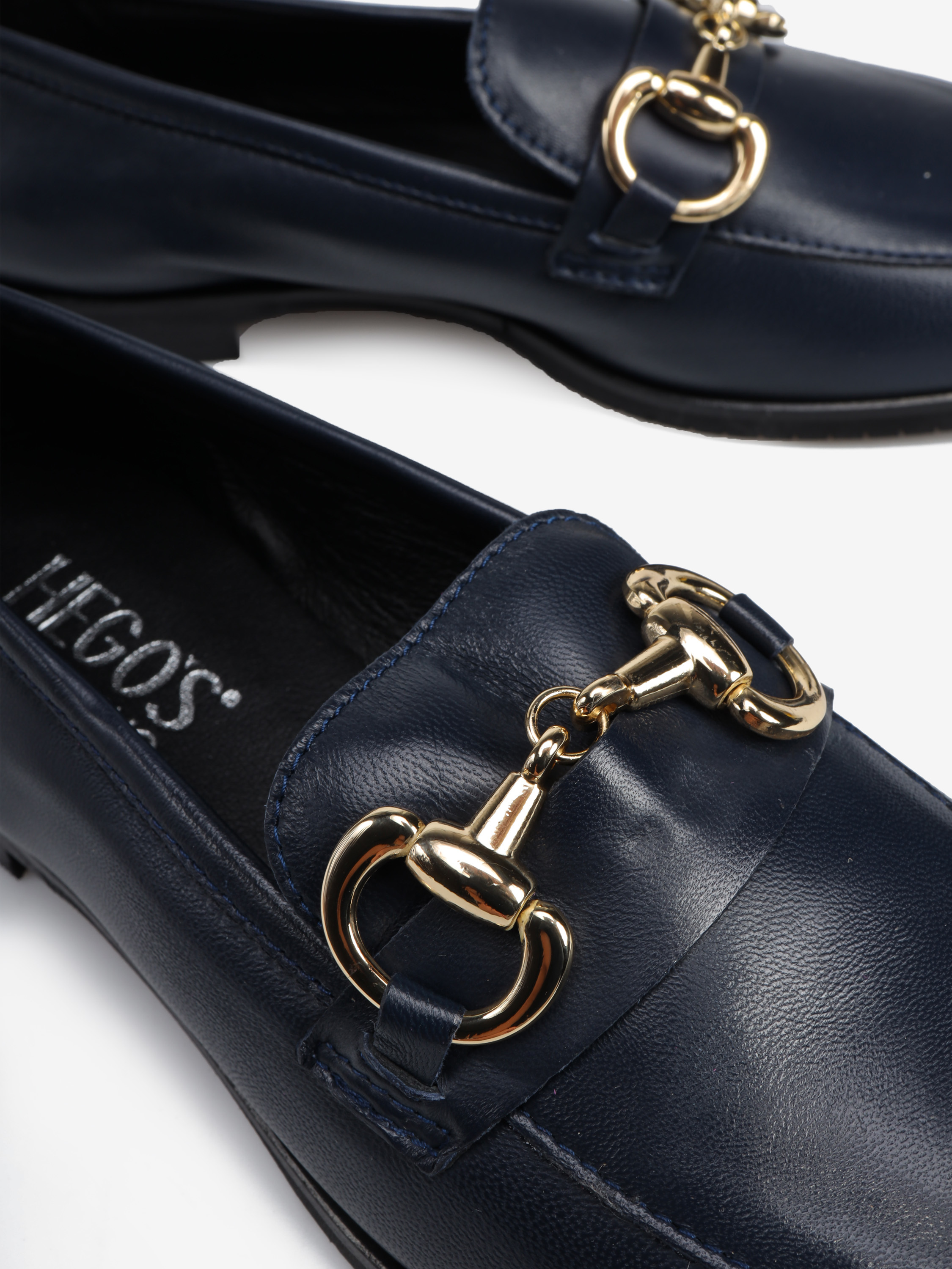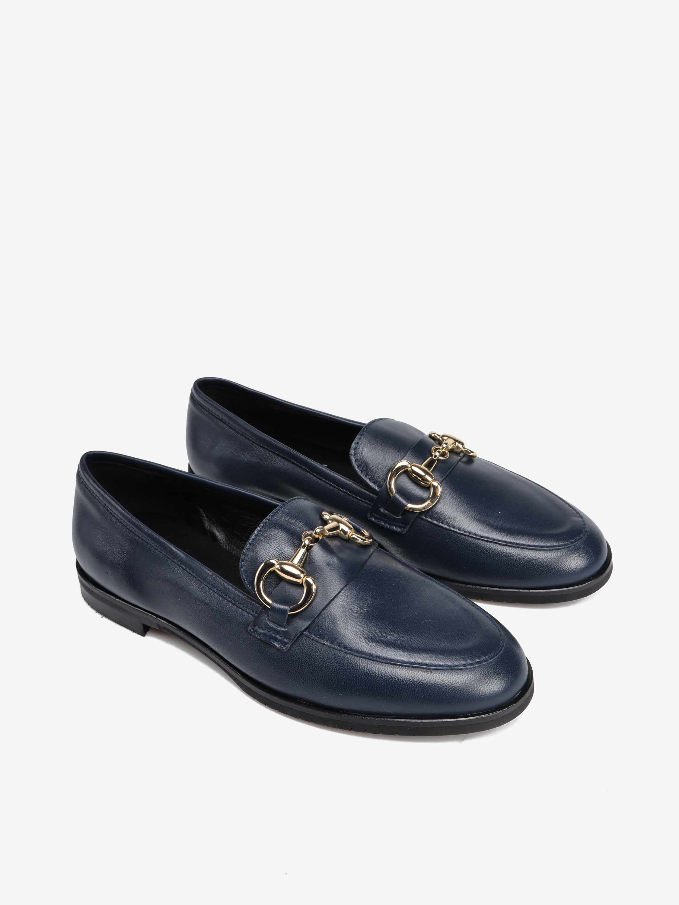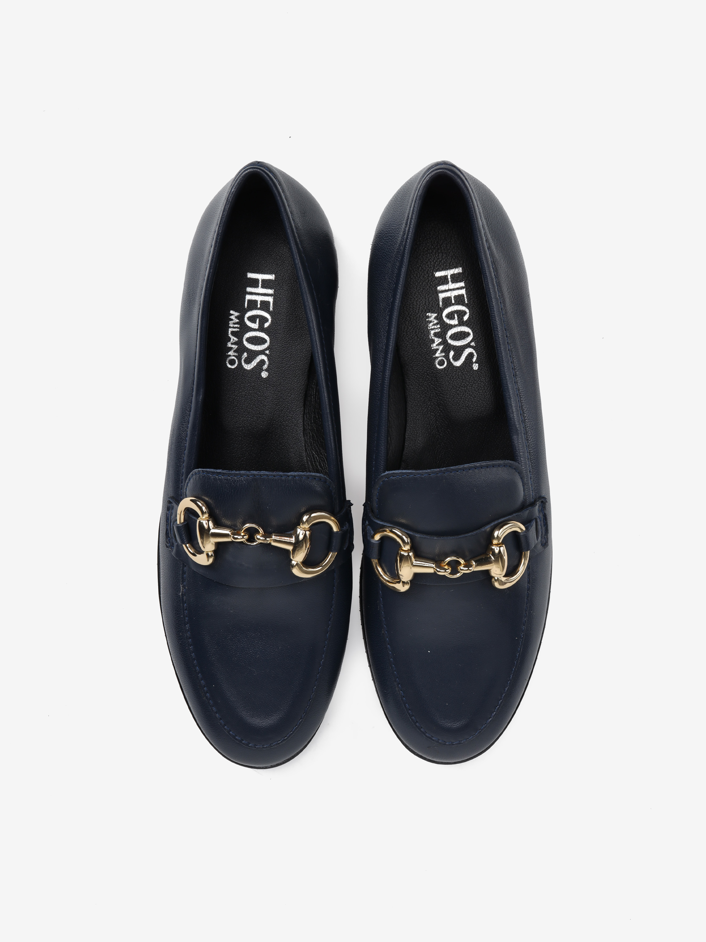 Mokasyny na płaskim obcasie wykonane są z włoskiej skóry naturalnej. Cholewka w ponadczasowym, granatowym kolorze ozdobiona została złotym wędzidłem. Miękkie i wygodne.