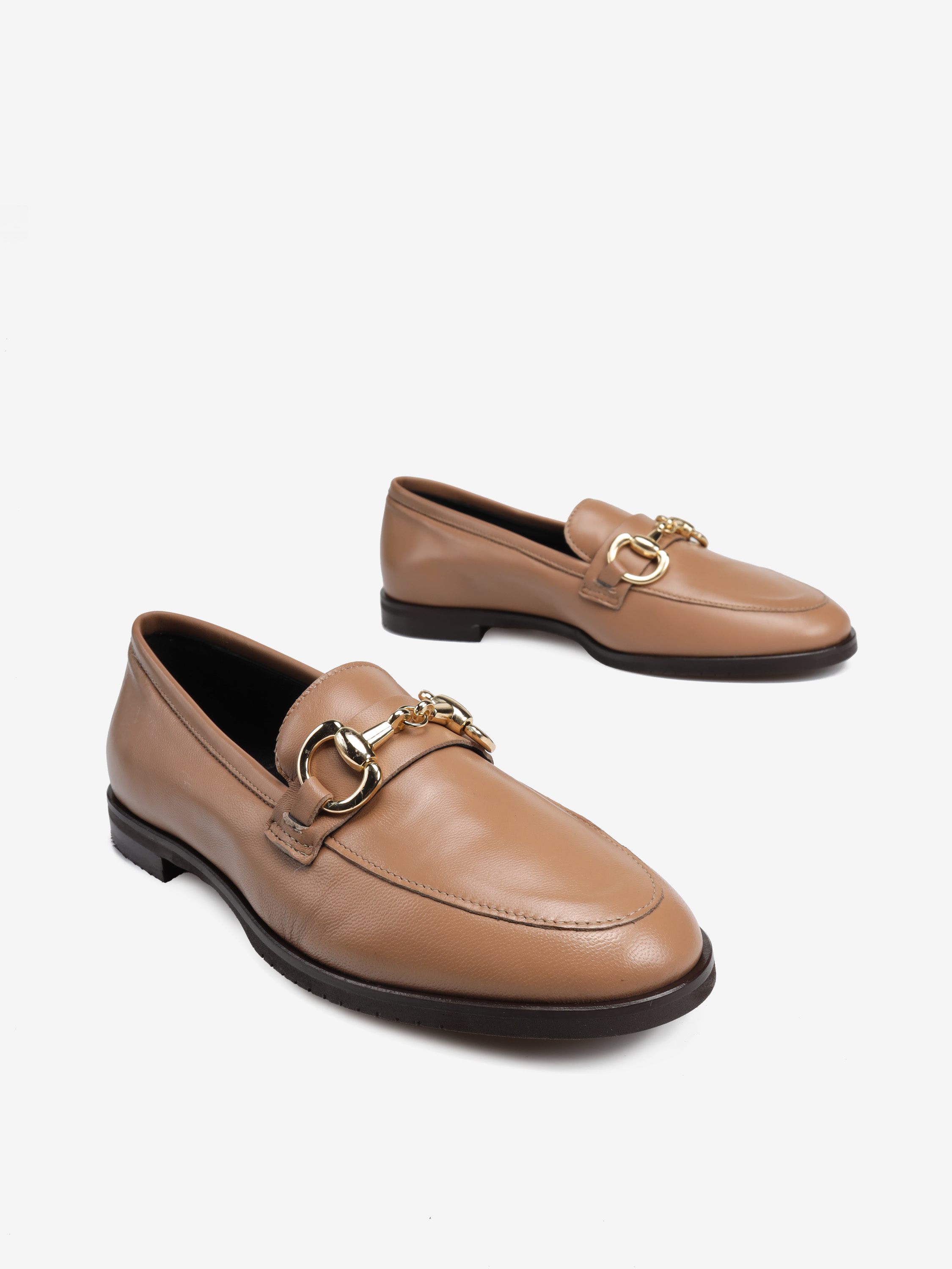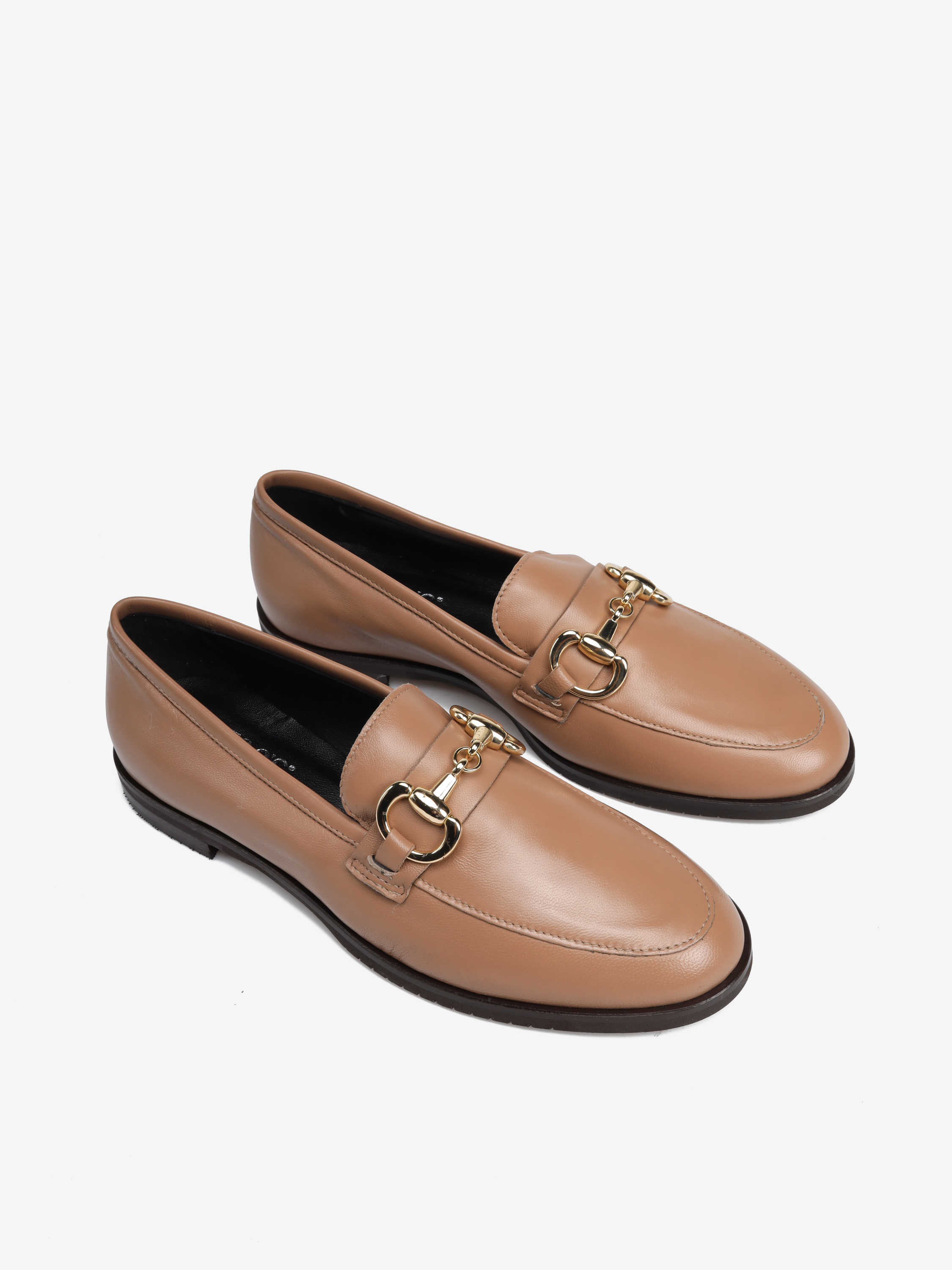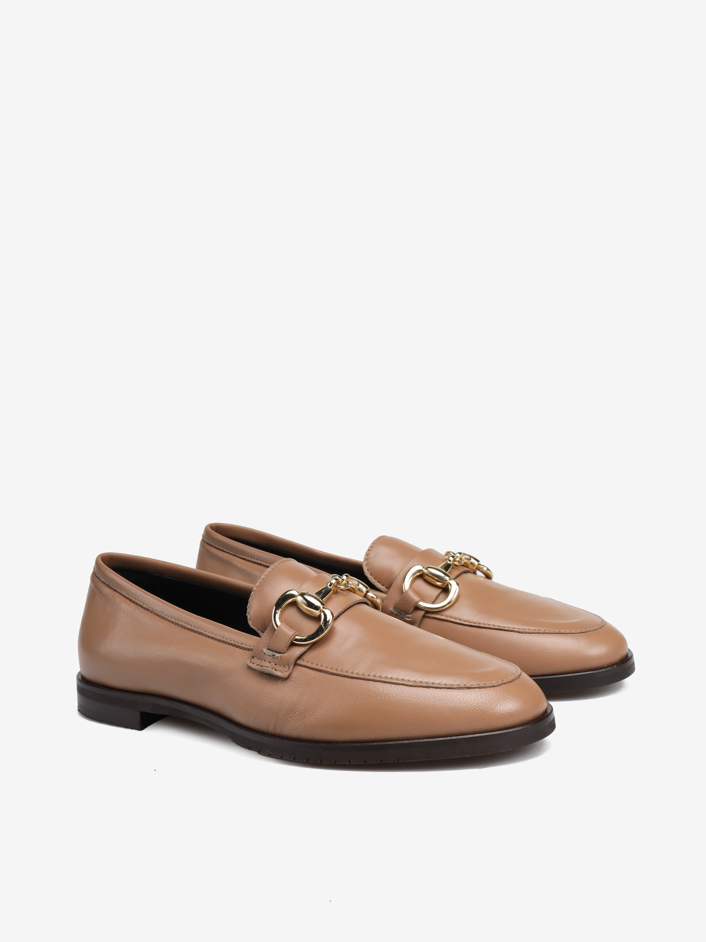 Mokasyny na płaskim obcasie wykonane są z włoskiej skóry naturalnej. Cholewka w ponadczasowym, beżowym kolorze ozdobiona została złotym wędzidłem. Miękkie i wygodne.