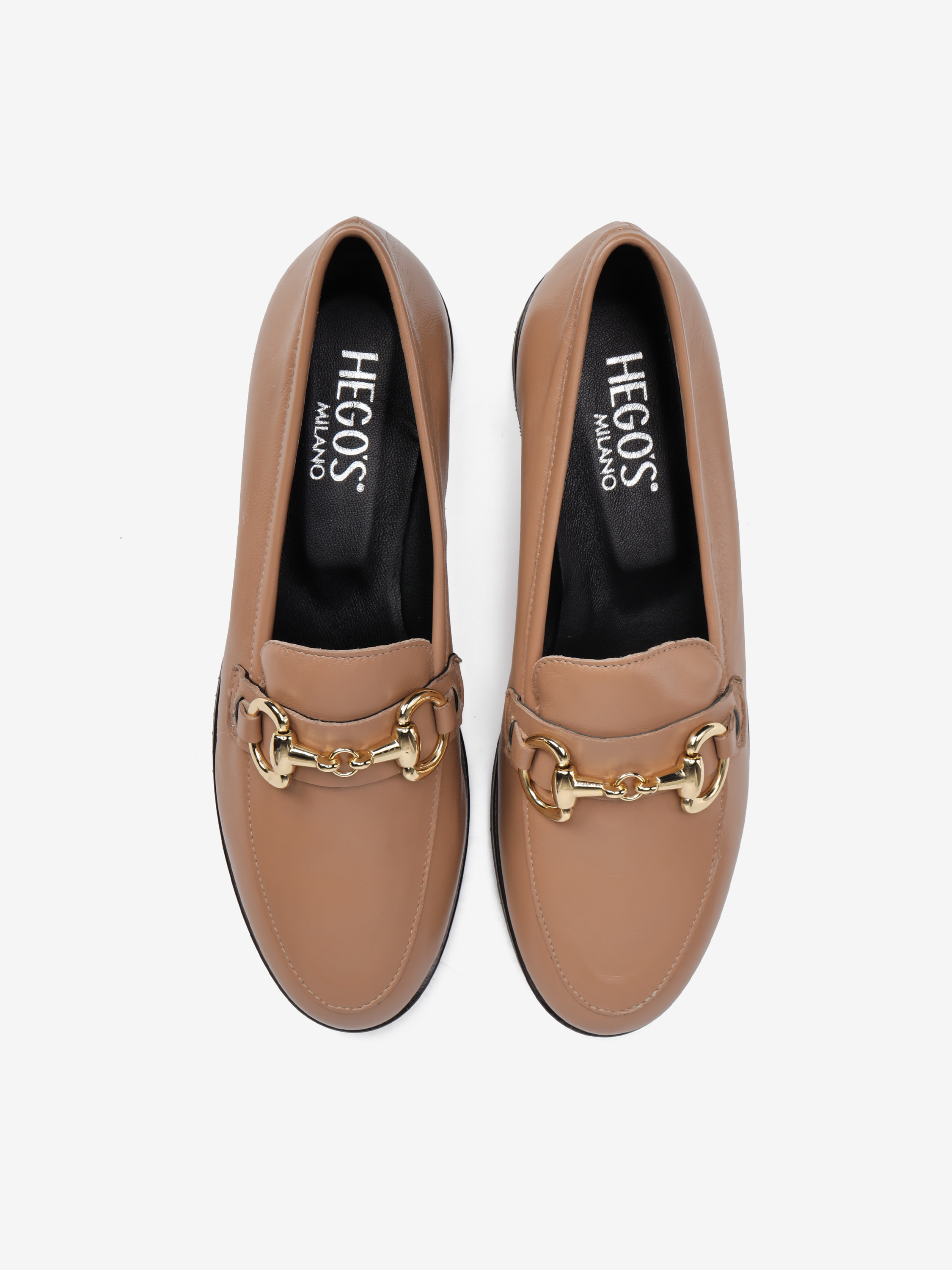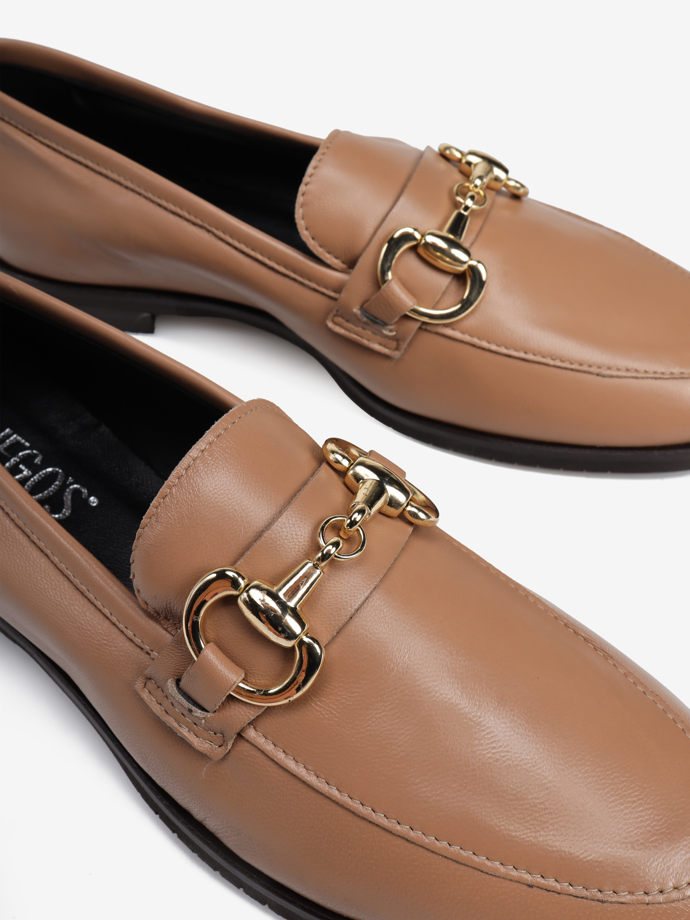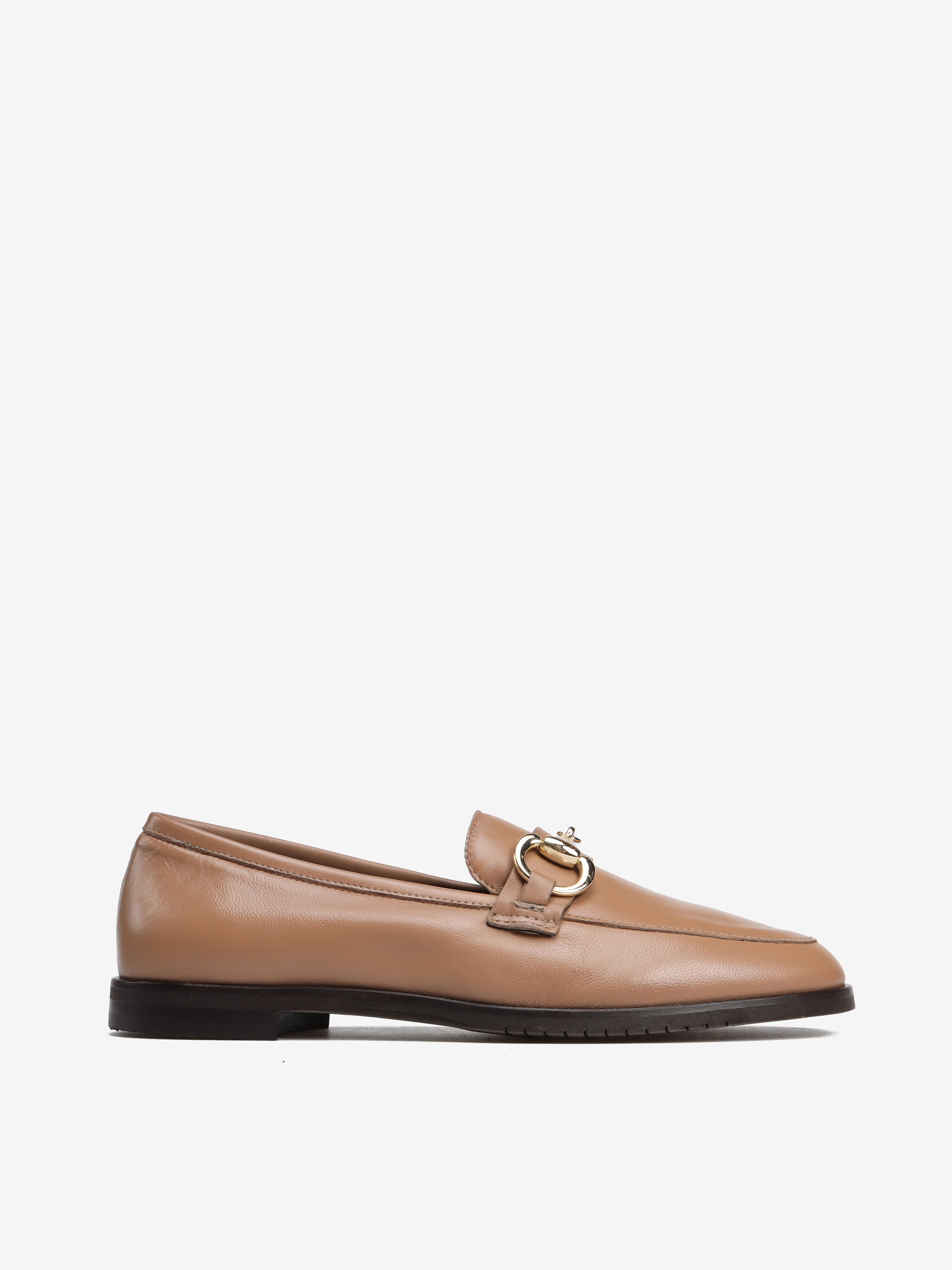 Mokasyny na płaskim obcasie wykonane są z włoskiej skóry naturalnej. Cholewka w ponadczasowym, beżowym kolorze ozdobiona została złotym wędzidłem. Miękkie i wygodne.