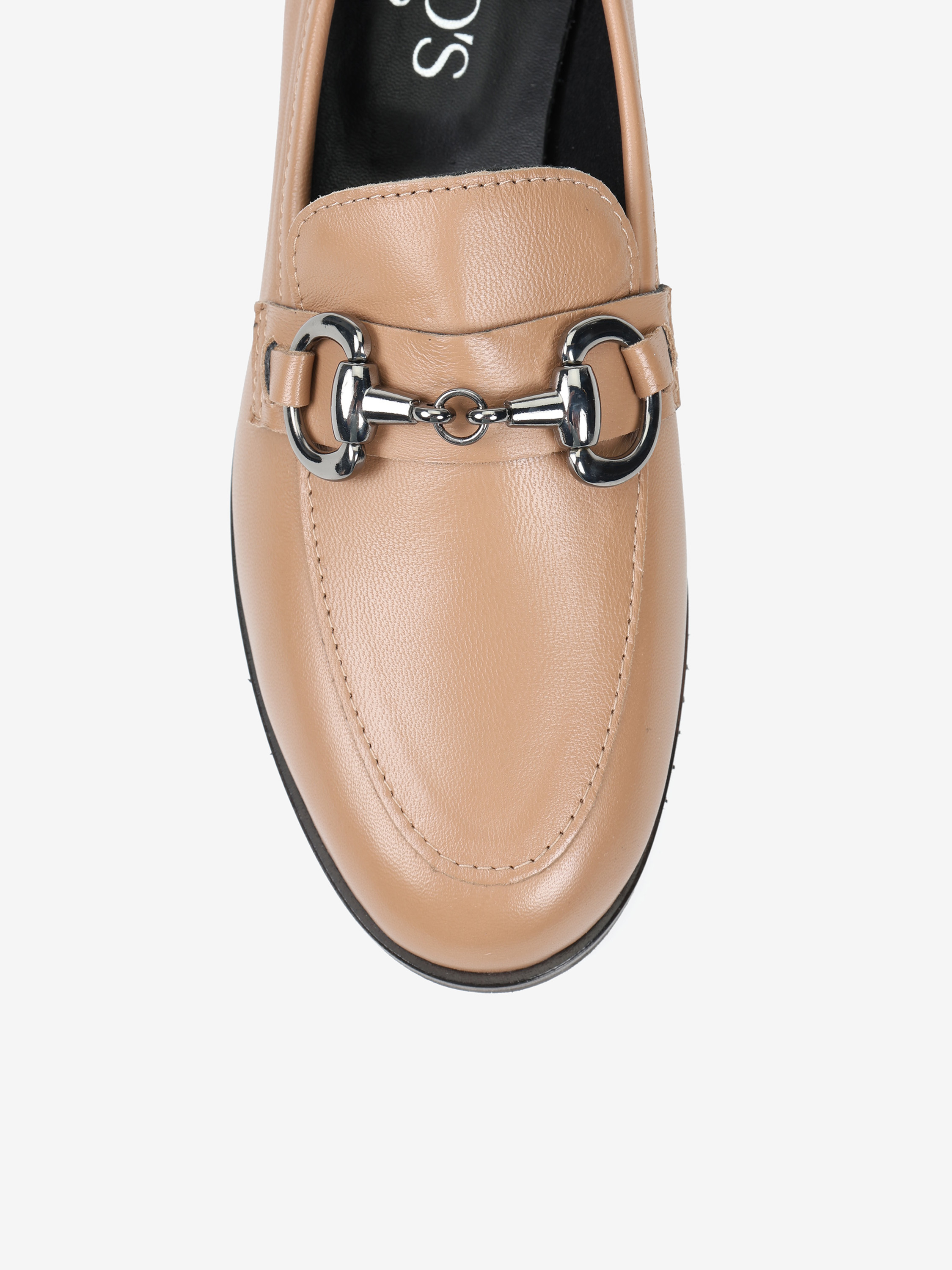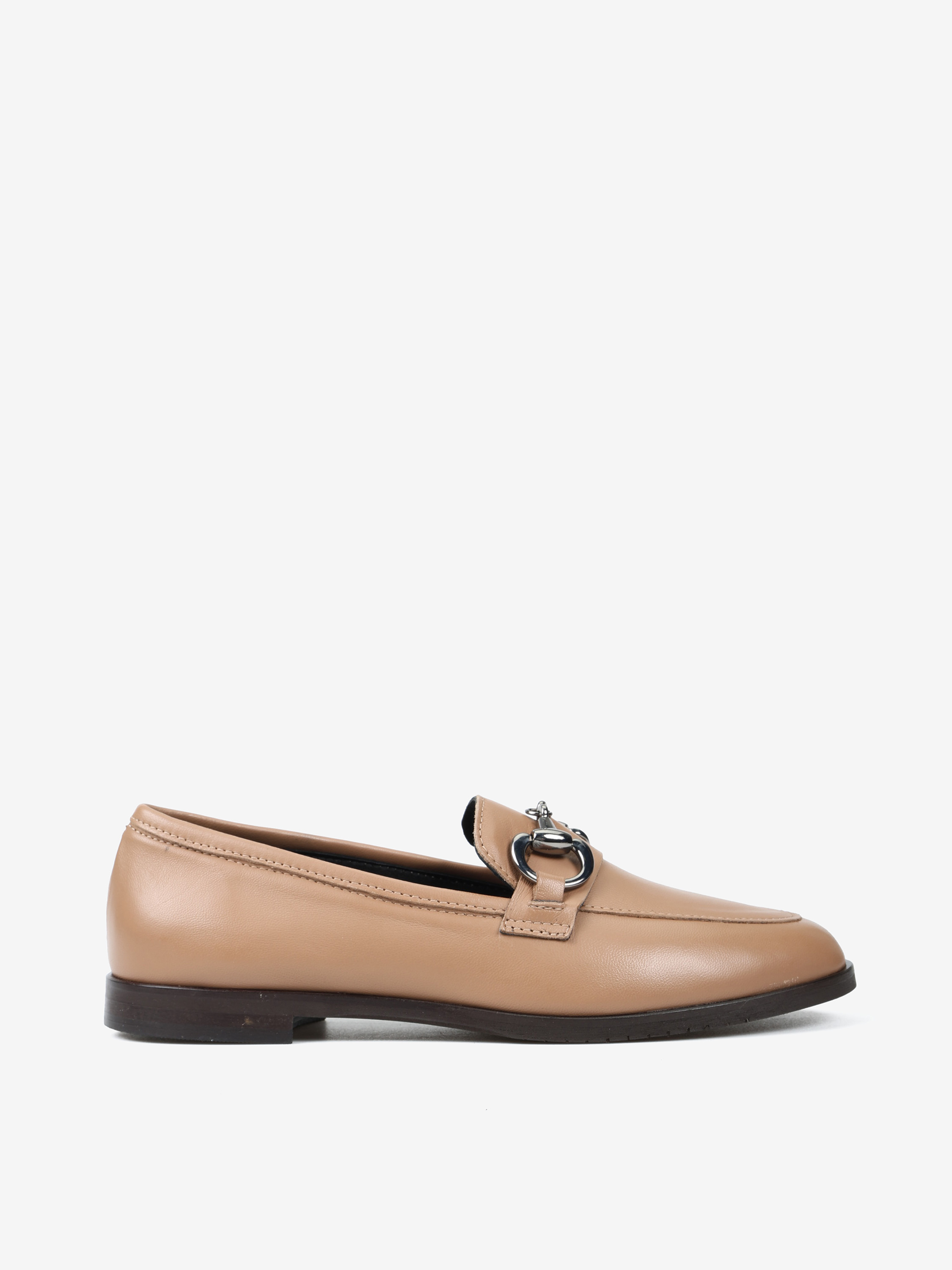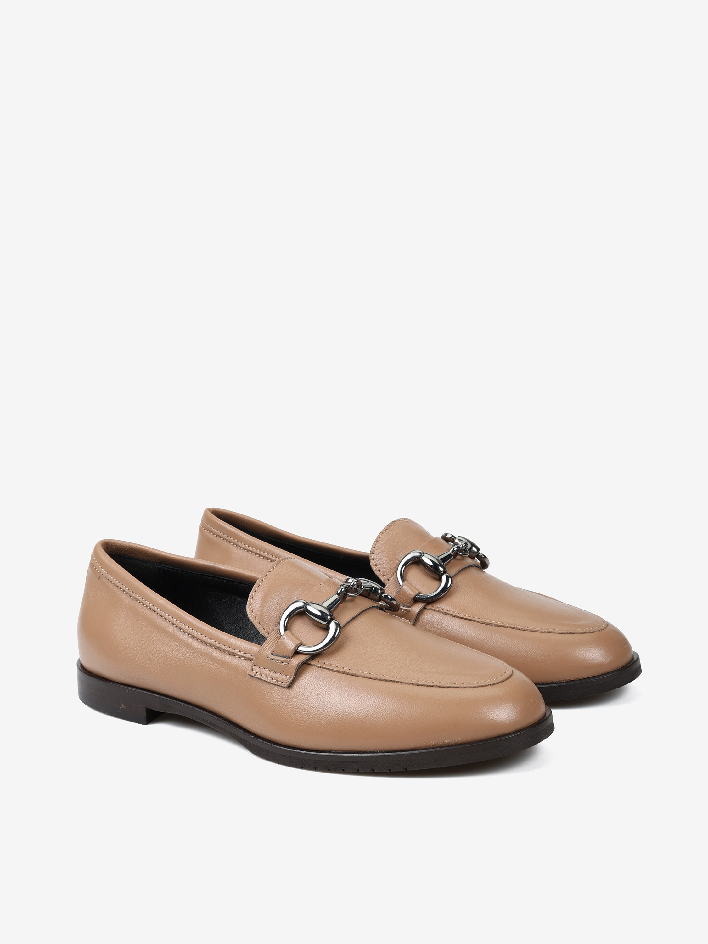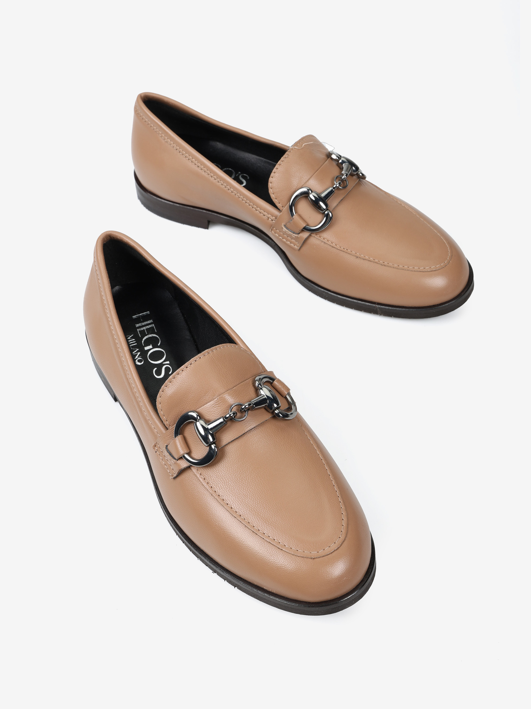 Mokasyny na płaskim obcasie wykonane są z włoskiej skóry naturalnej. Cholewka w kolorze taupe ozdobiona została wędzidłem. Wykonane z miękkiej i delikatnej skóry.