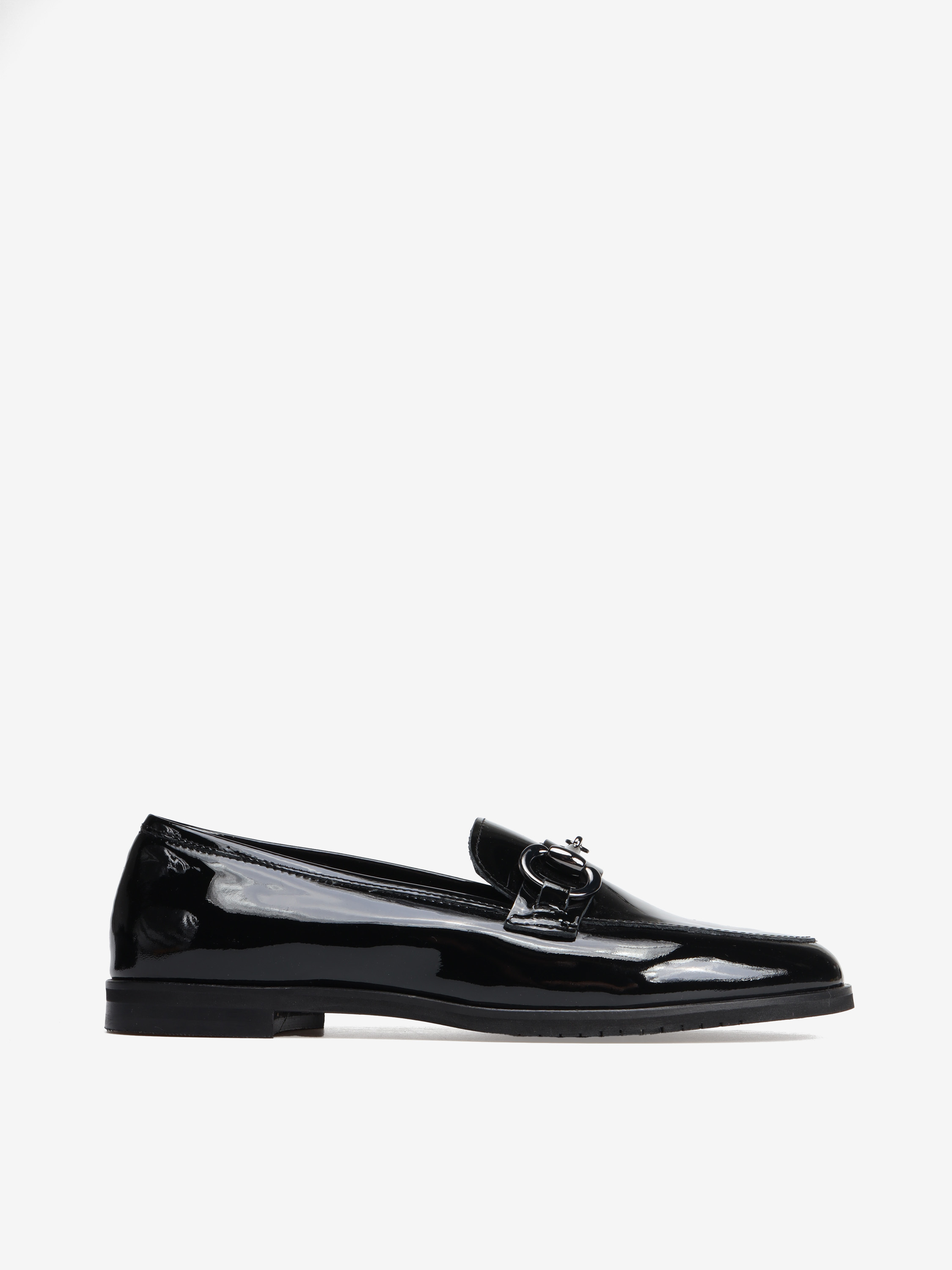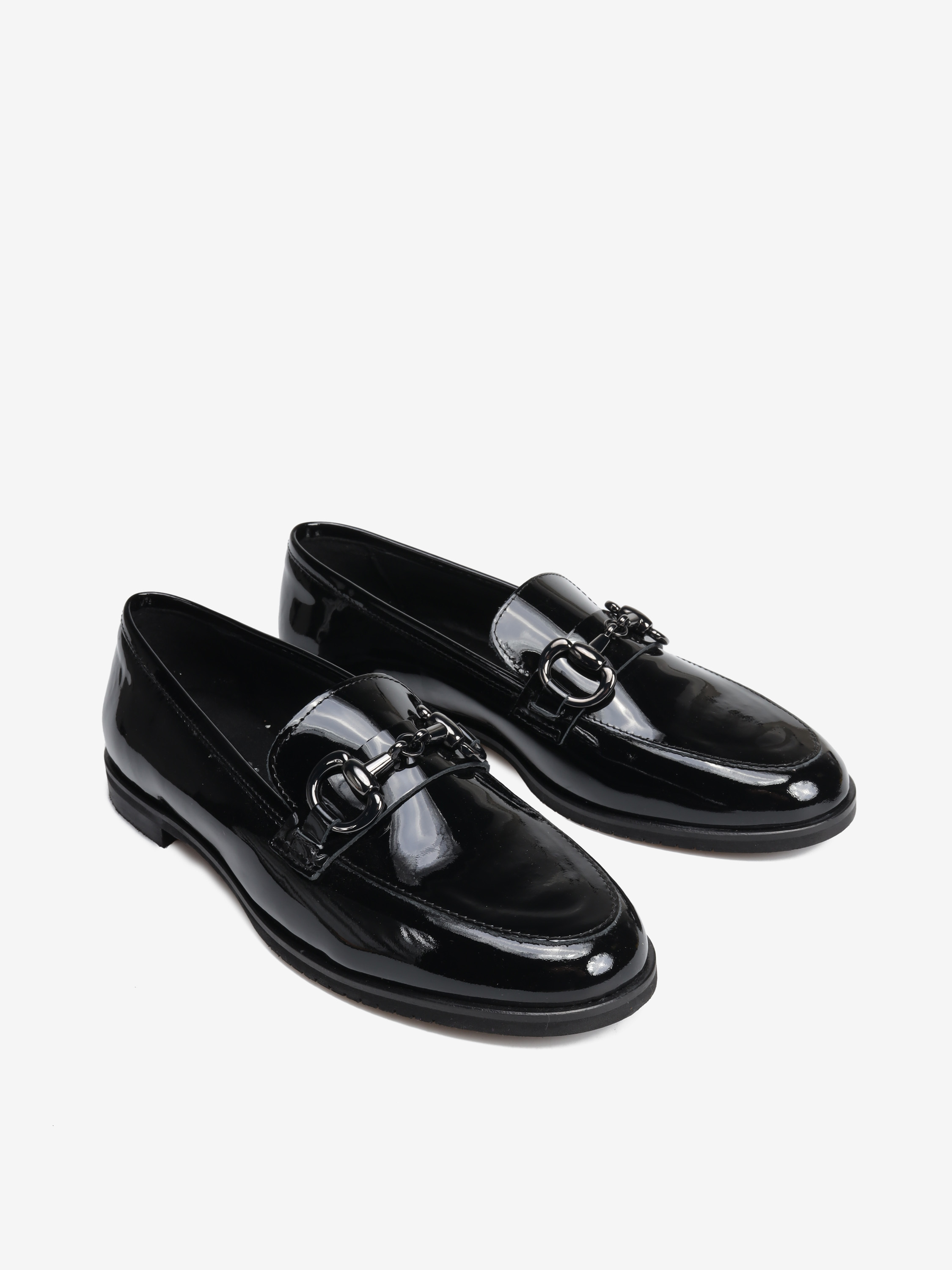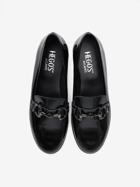 Mokasyny na płaskim obcasie wykonane są z włoskiej skóry lakierowanej. Cholewka w ponadczasowym, czarnym kolorze ozdobiona została złotym wędzidłem. Miękkie i wygodne.