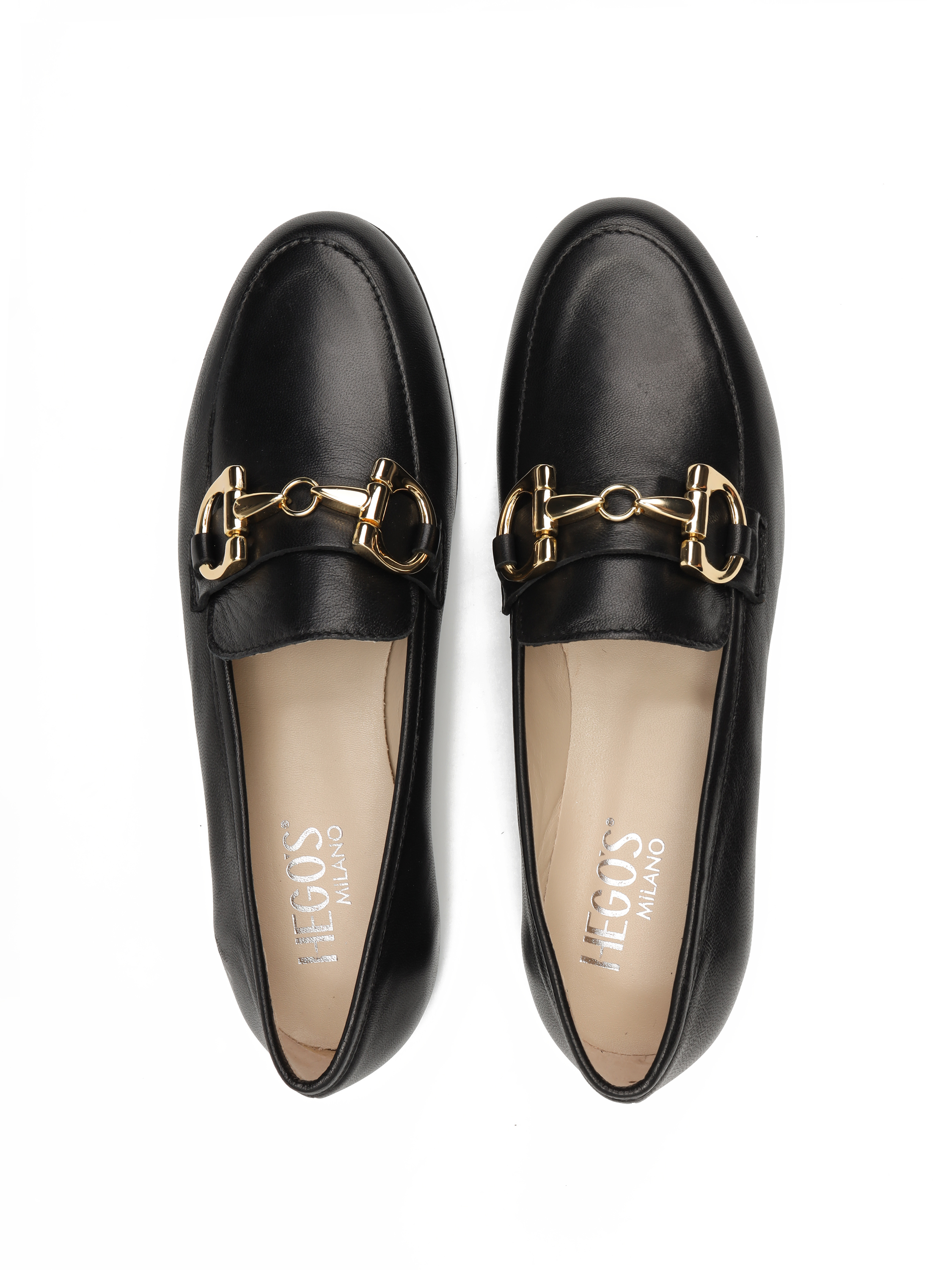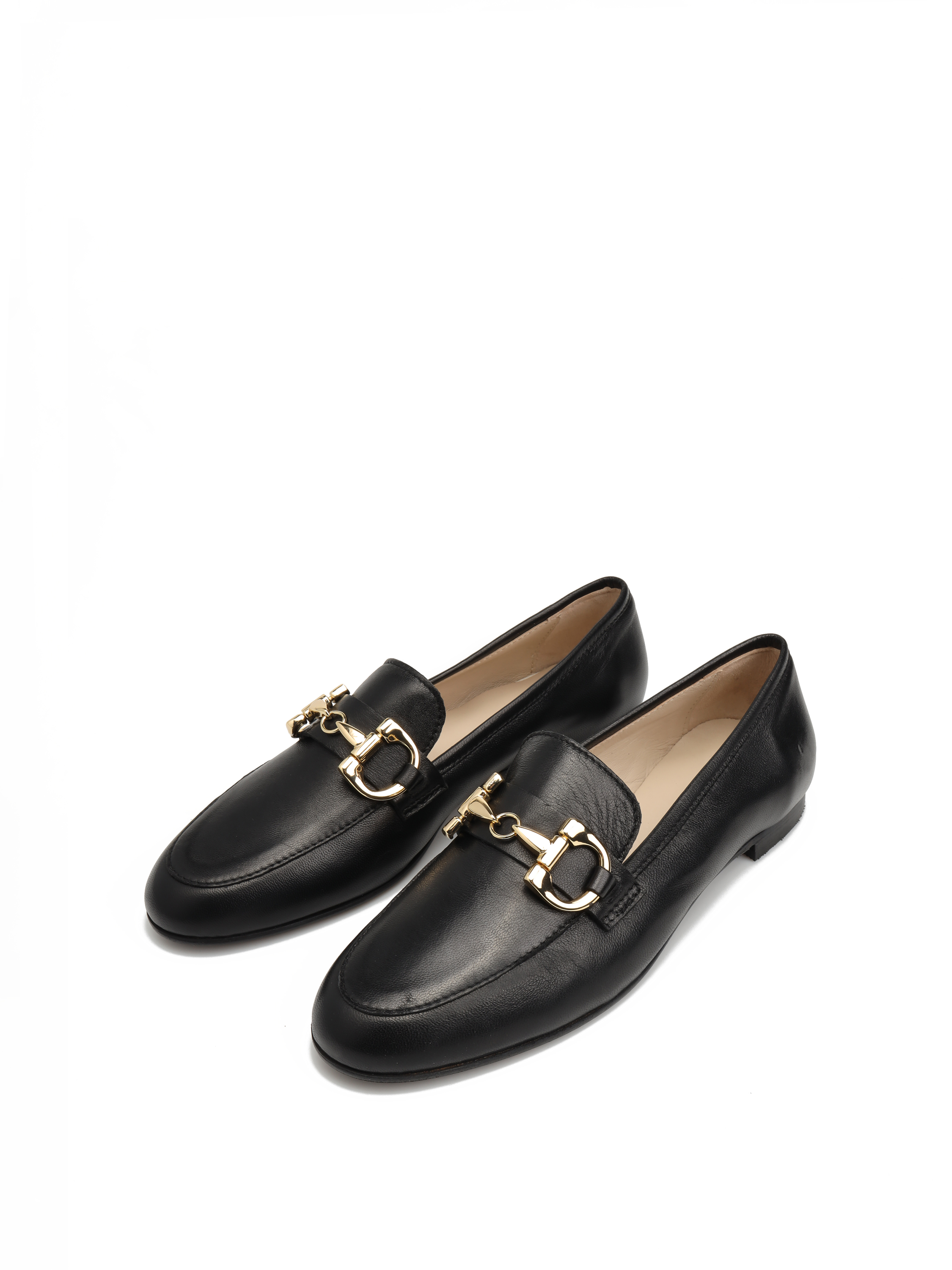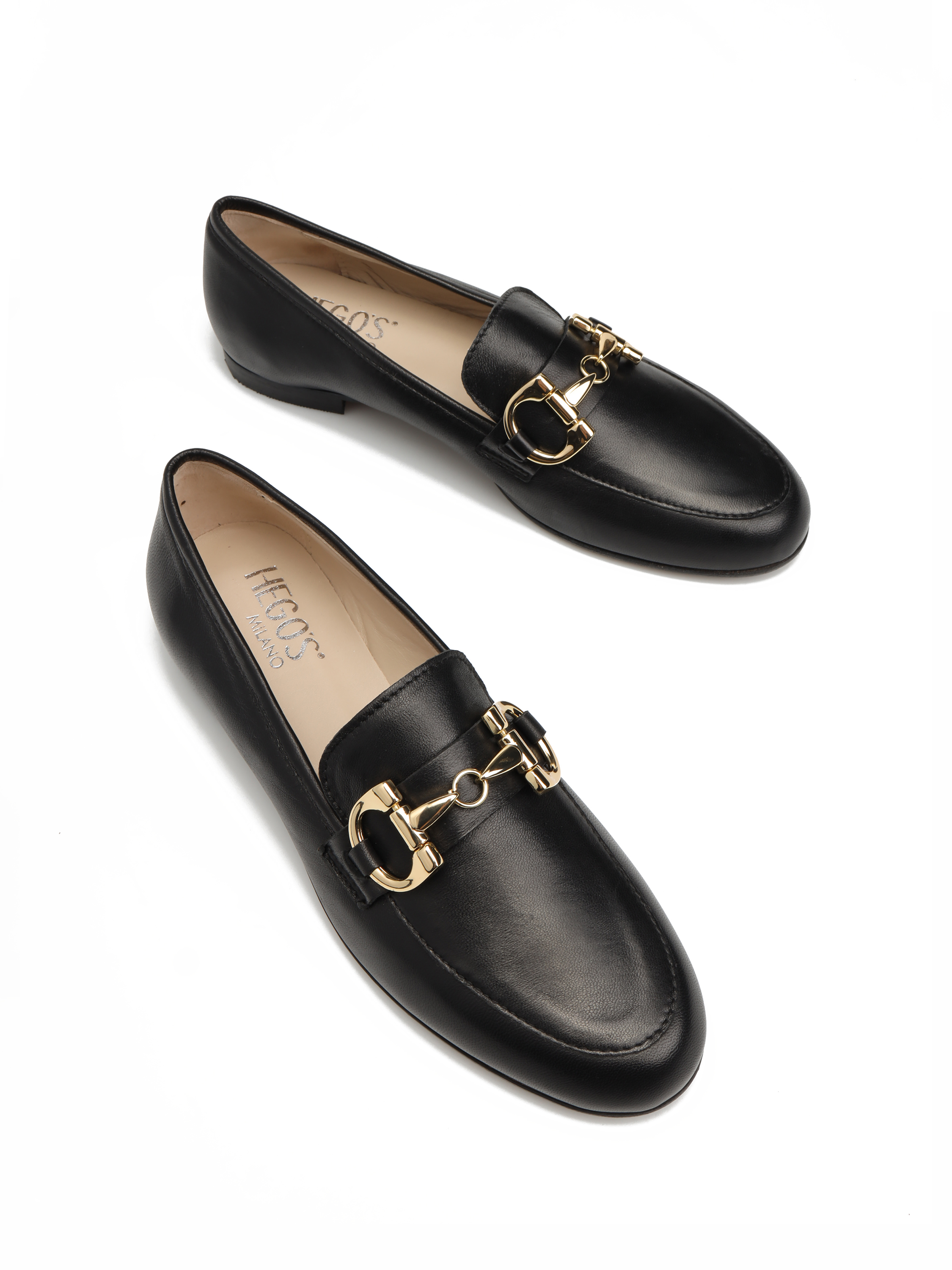Mokasyny na płaskim obcasie wykonane są z włoskiej skóry naturalnej. Cholewka w ponadczasowym, czarnym kolorze ozdobiona została złotym wędzidłem. Miękkie i wygodne.