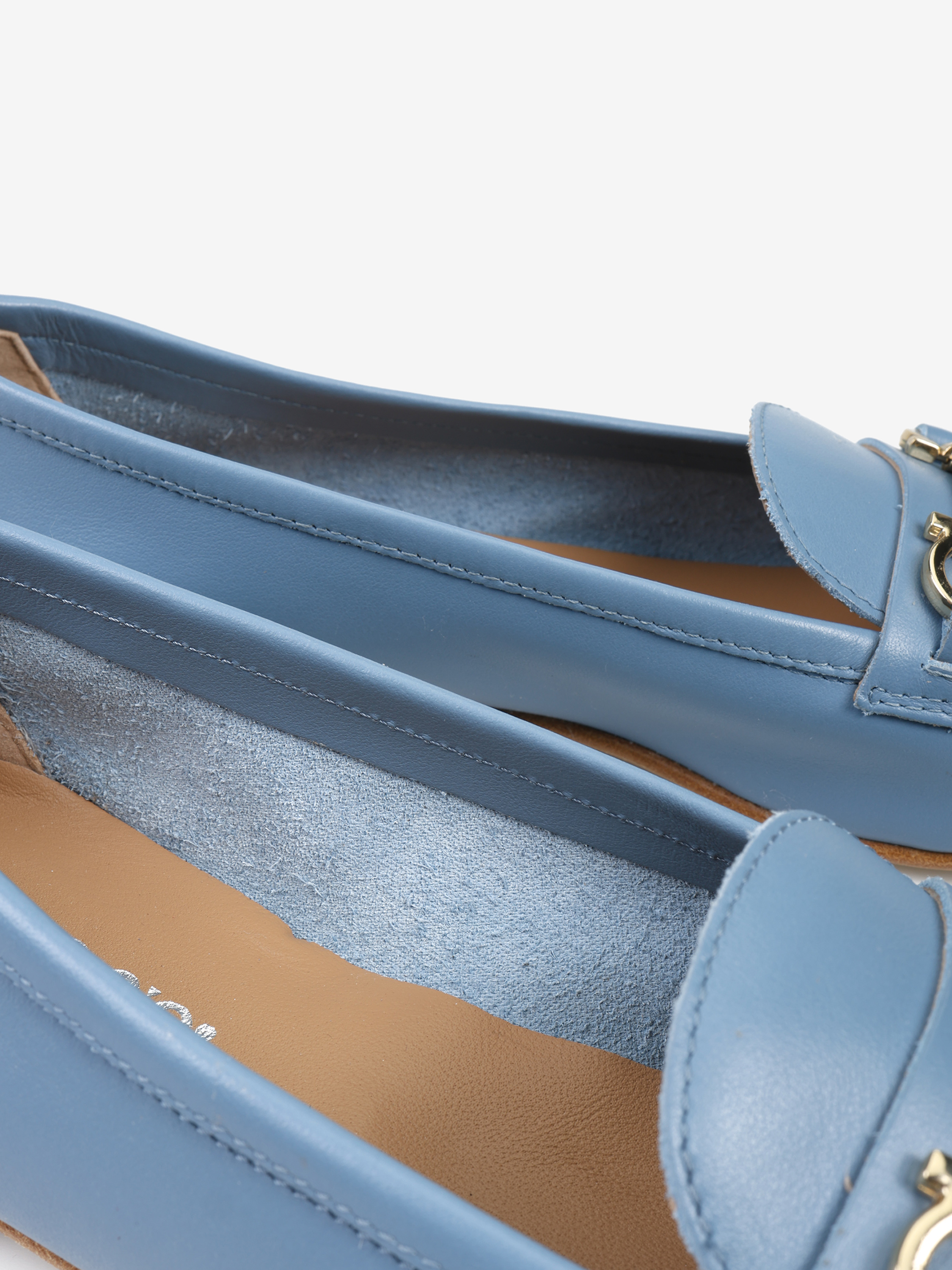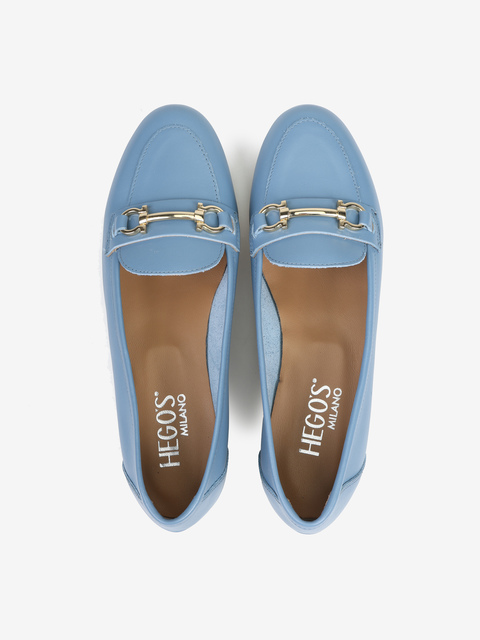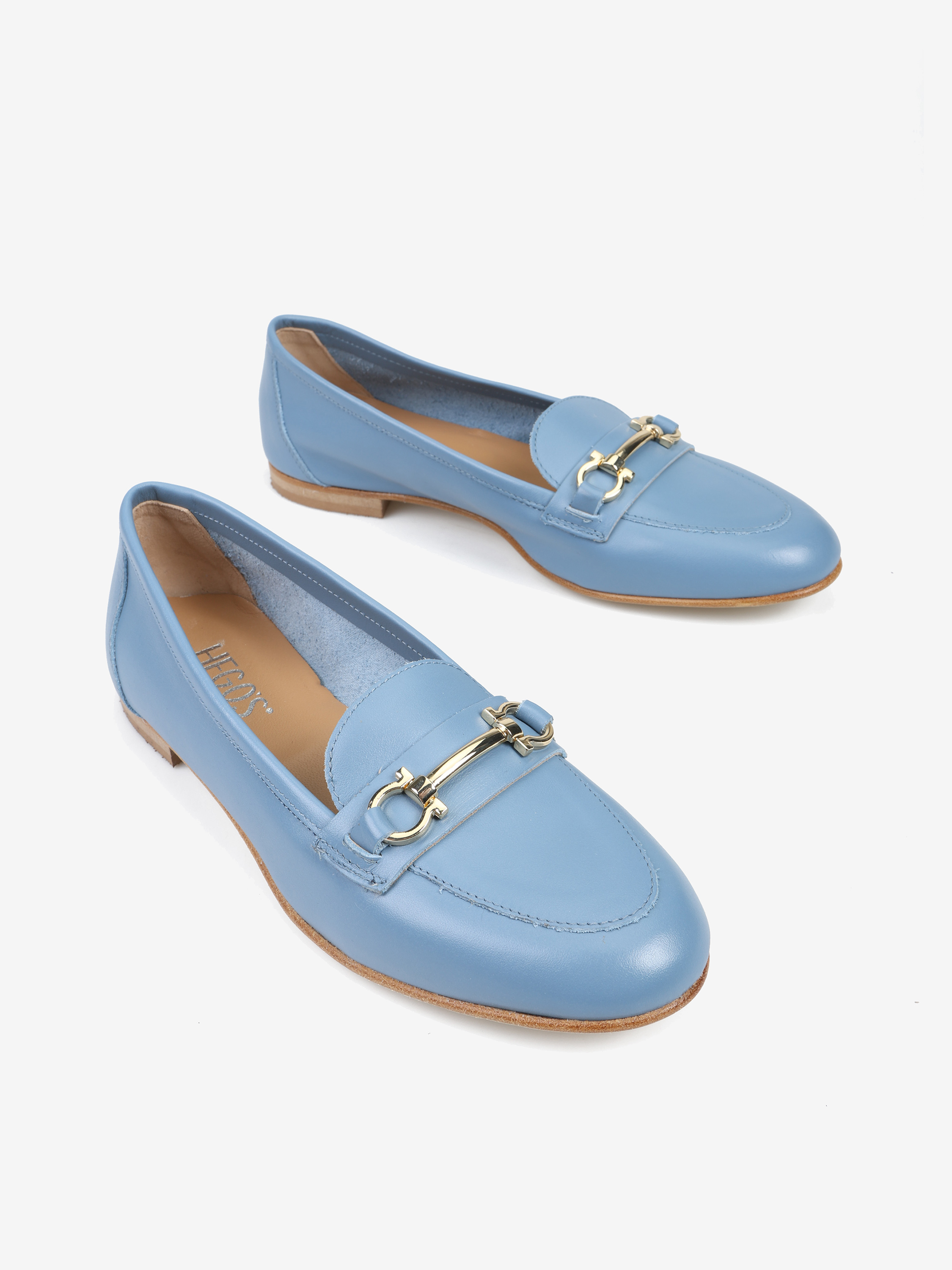 Skórzane mokasyny z ozdobnym, metalowym wędzidłem.