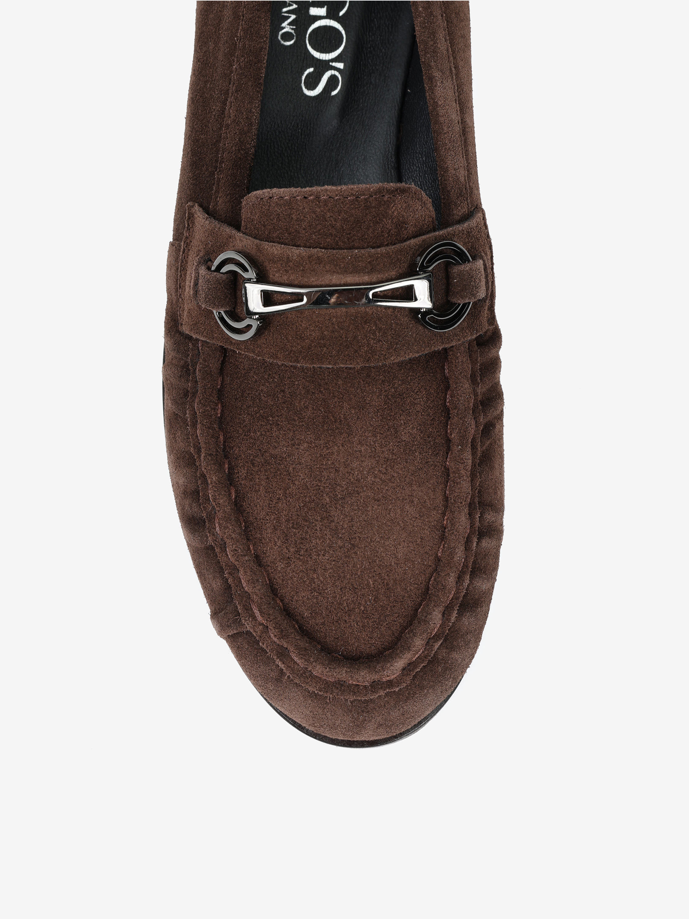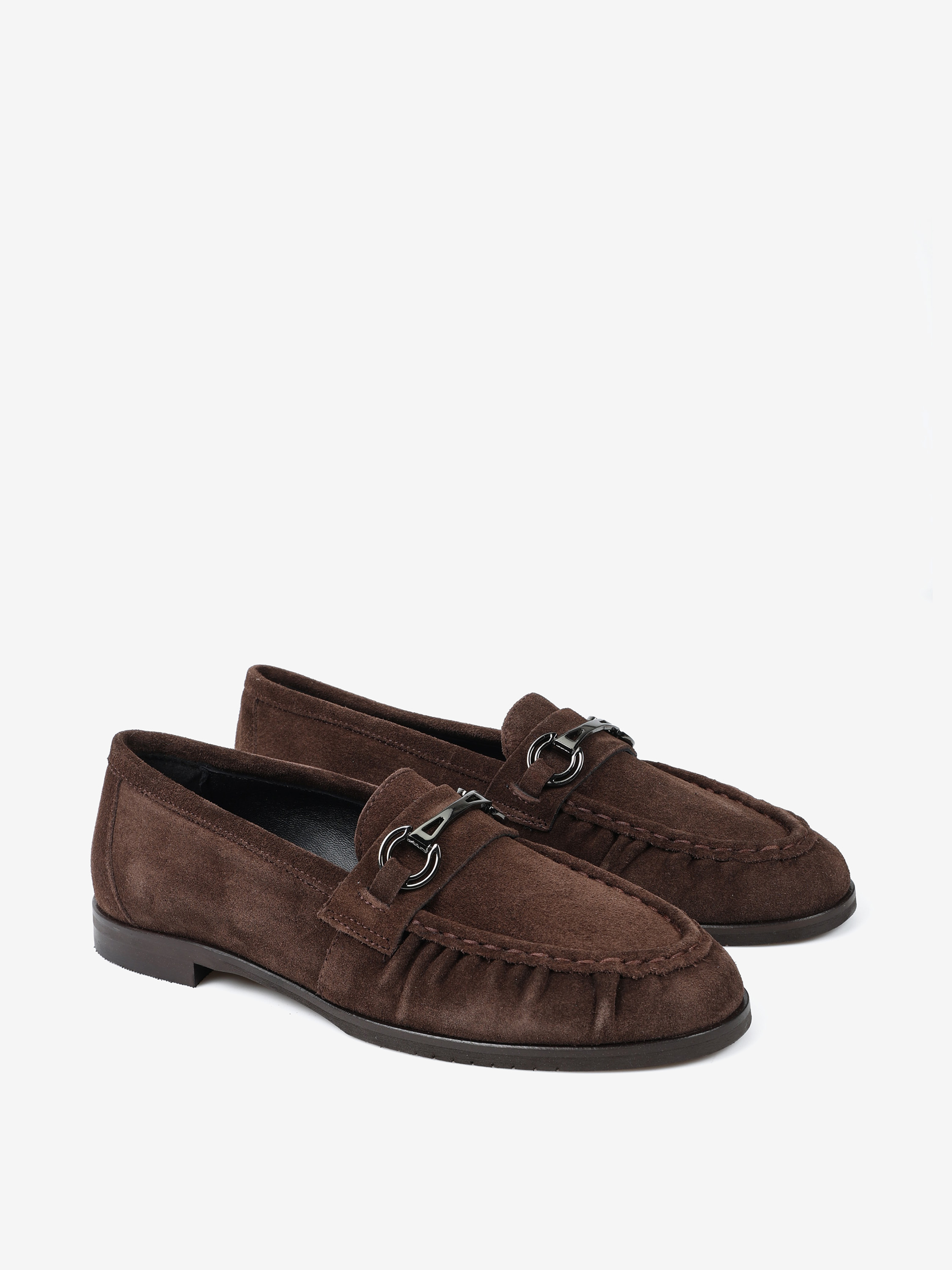 Zamszowe mokasyny z metalowym wędzidłem. Ozdobna lamówka z marszczeniem.