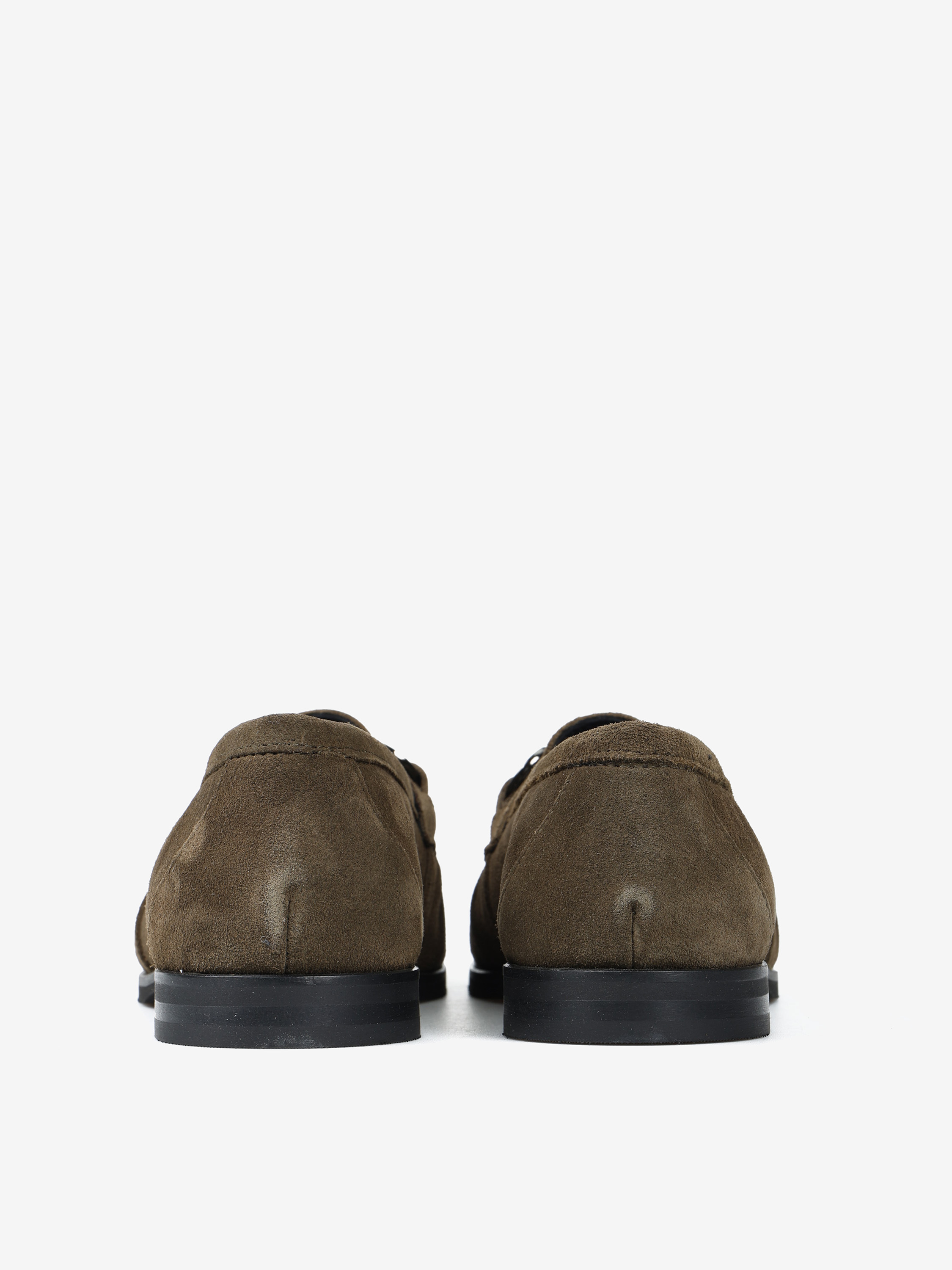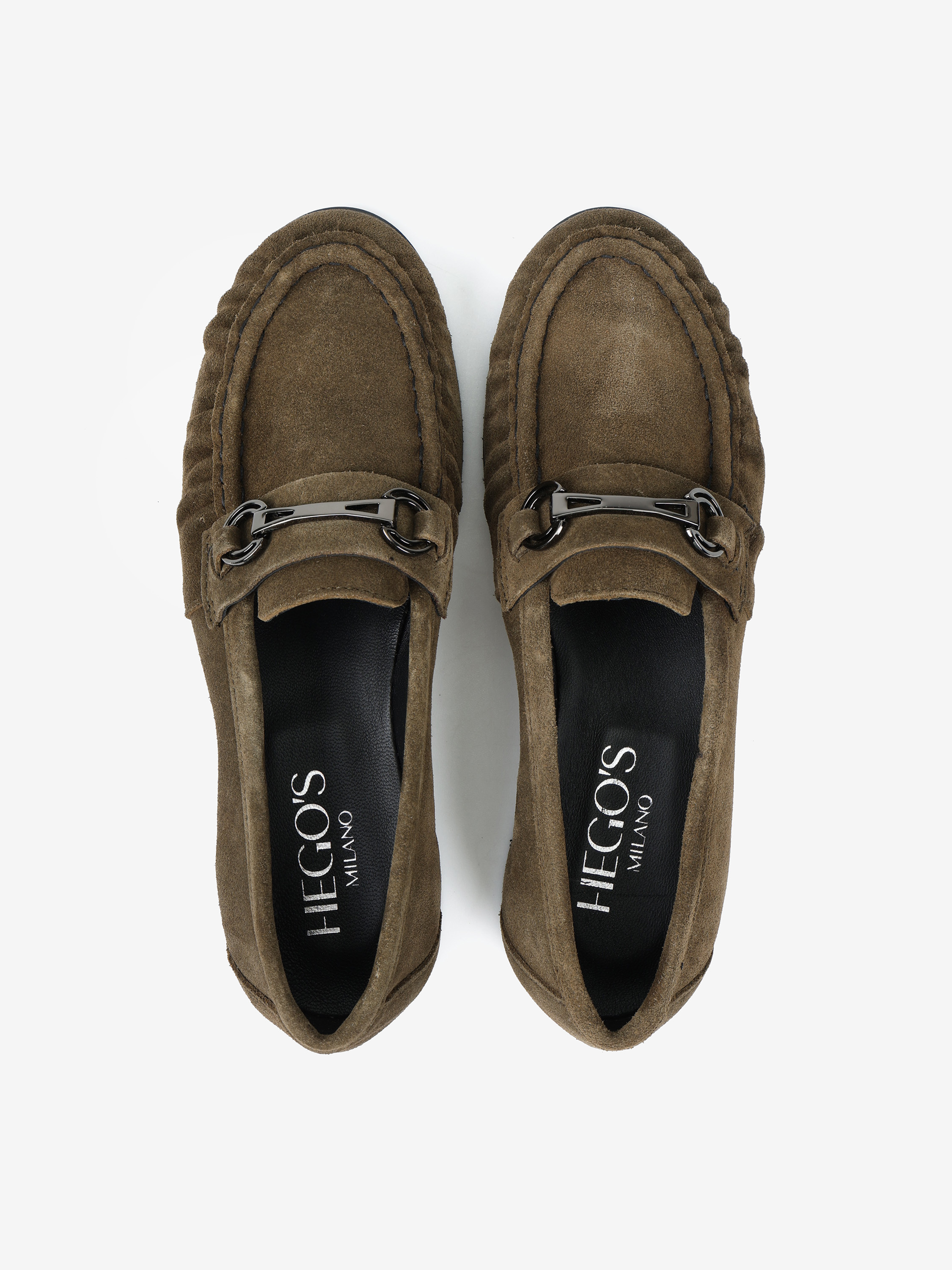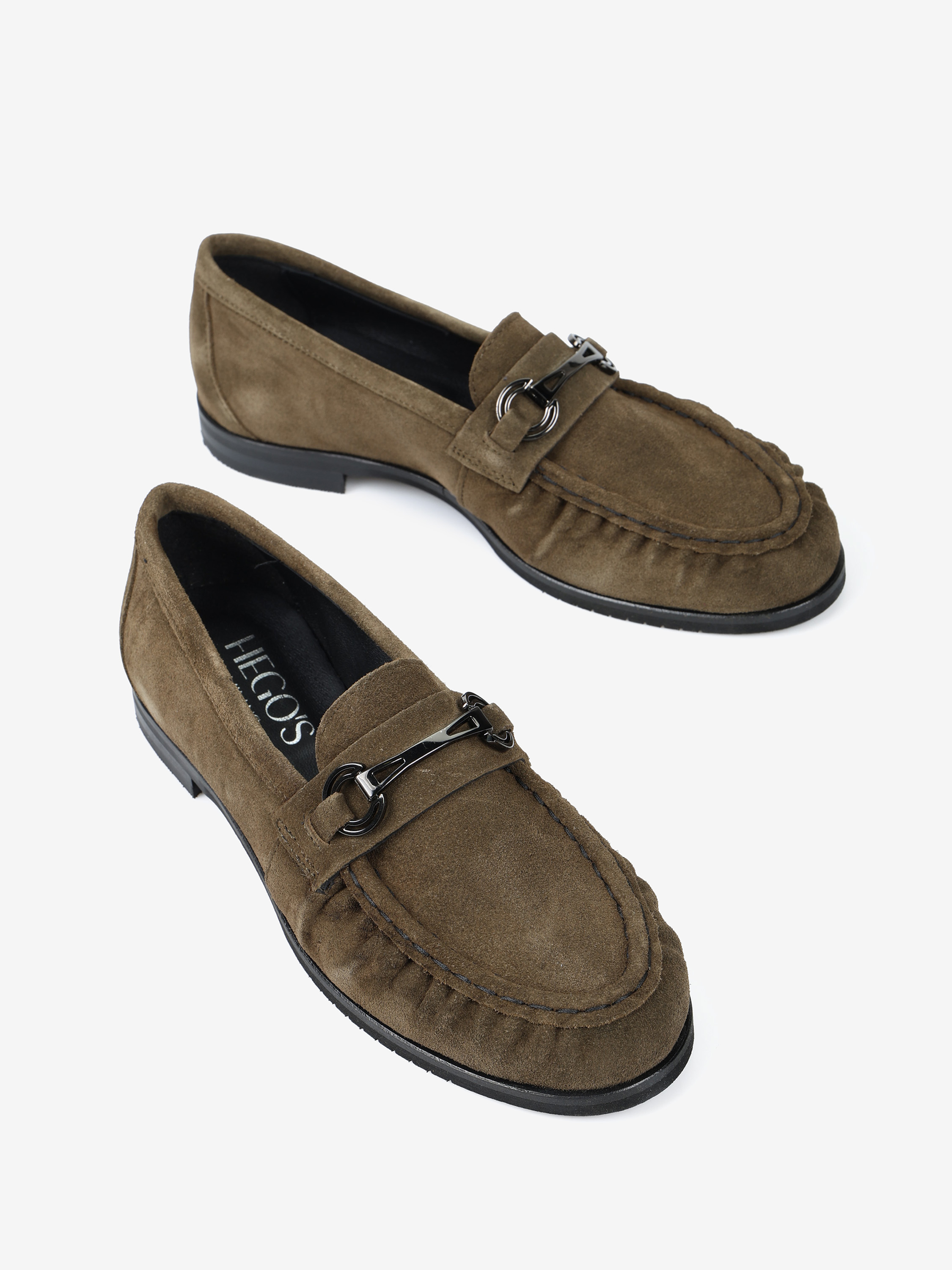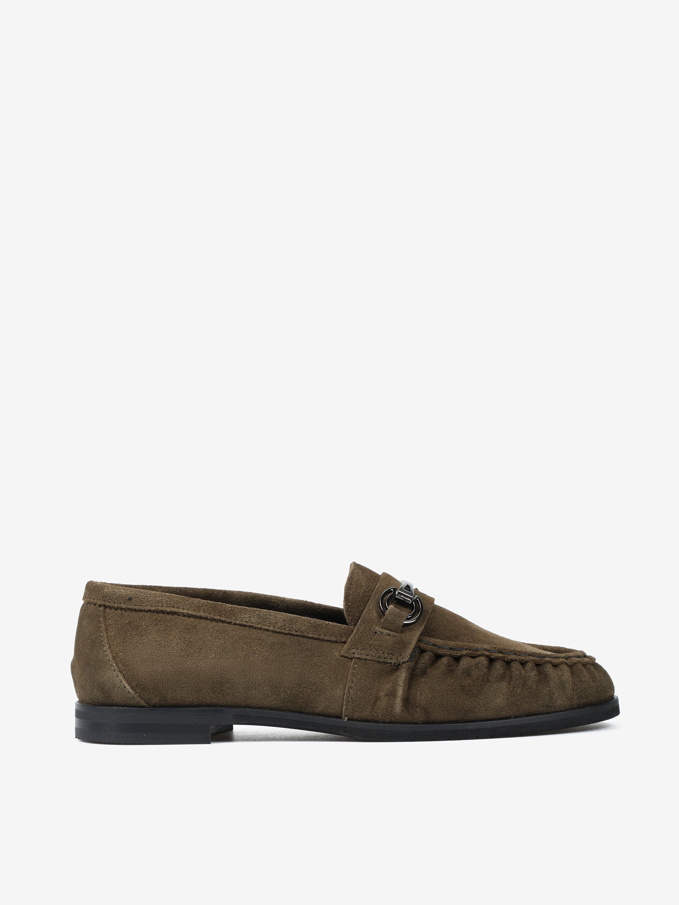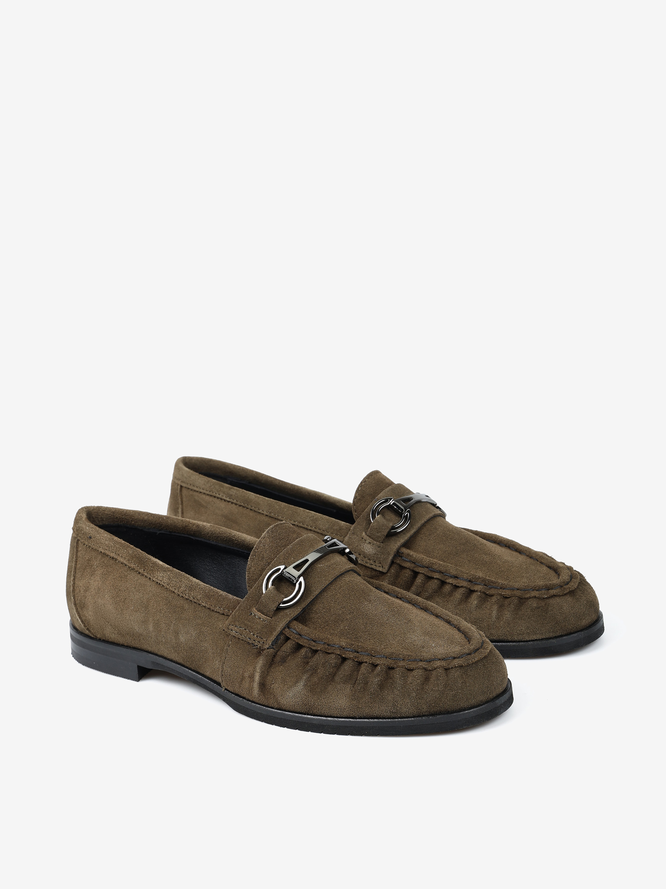 Zamszowe mokasyny z metalowym wędzidłem. Ozdobna lamówka z marszczeniem.