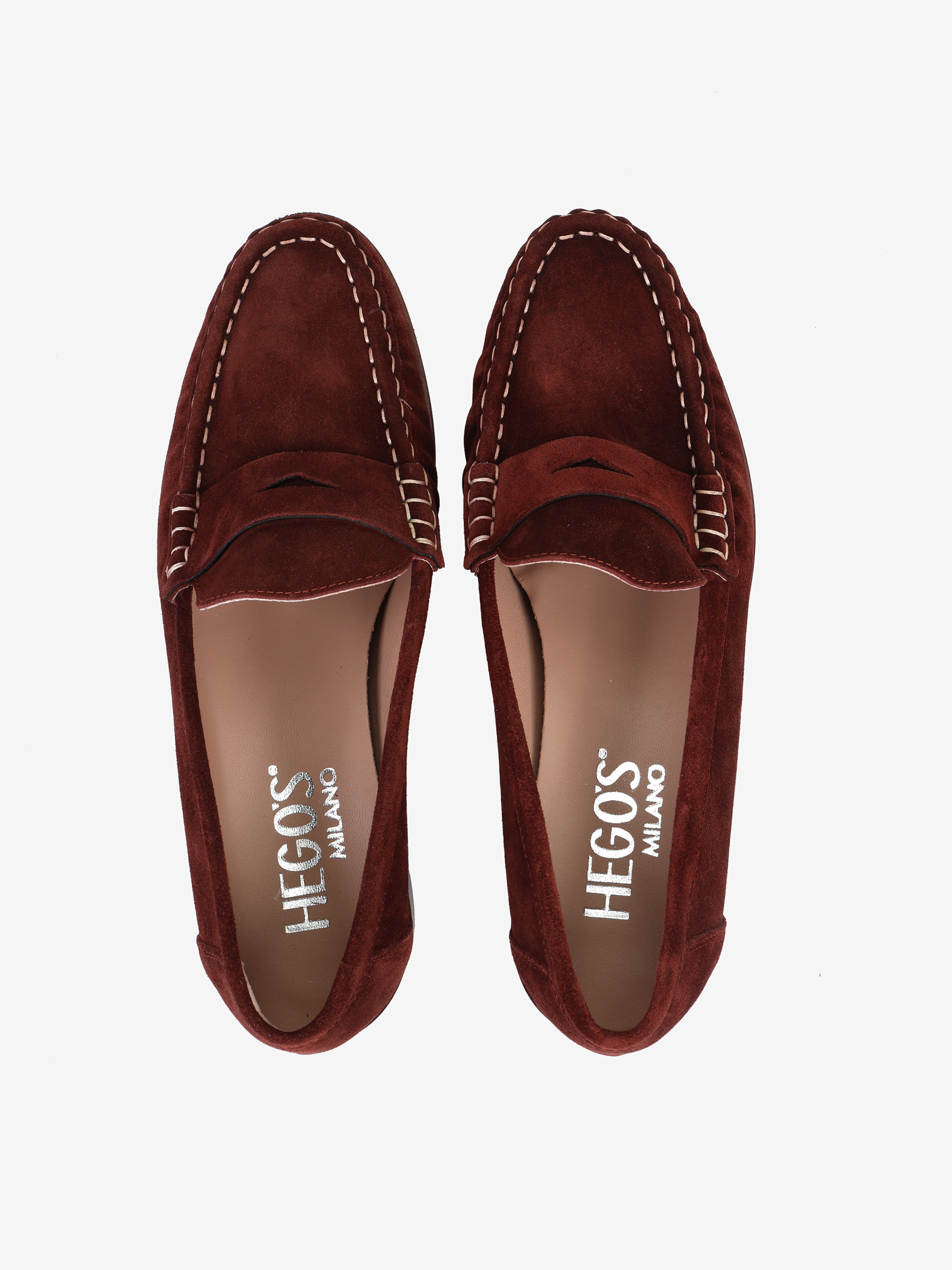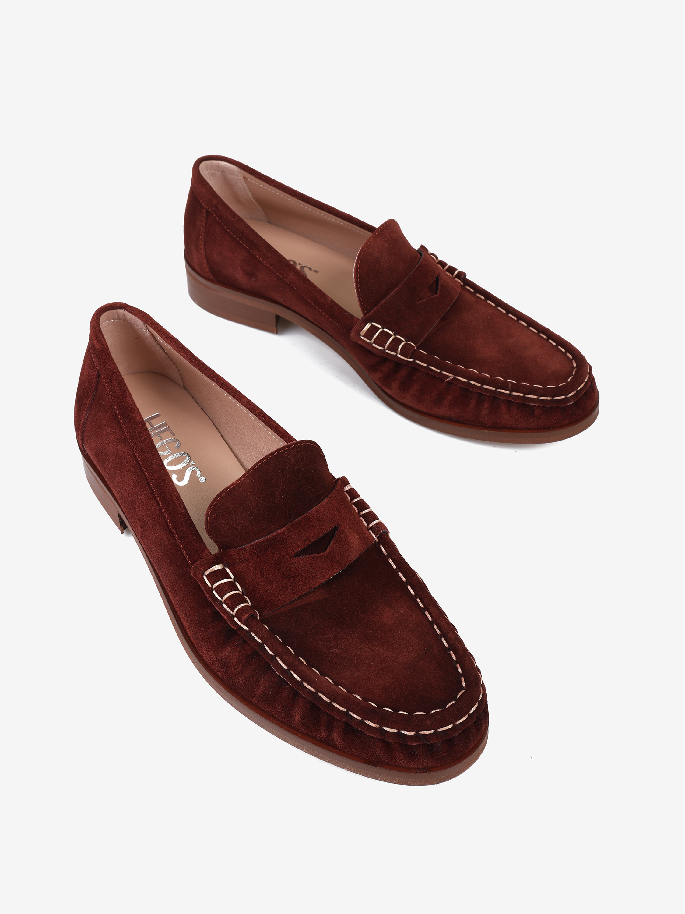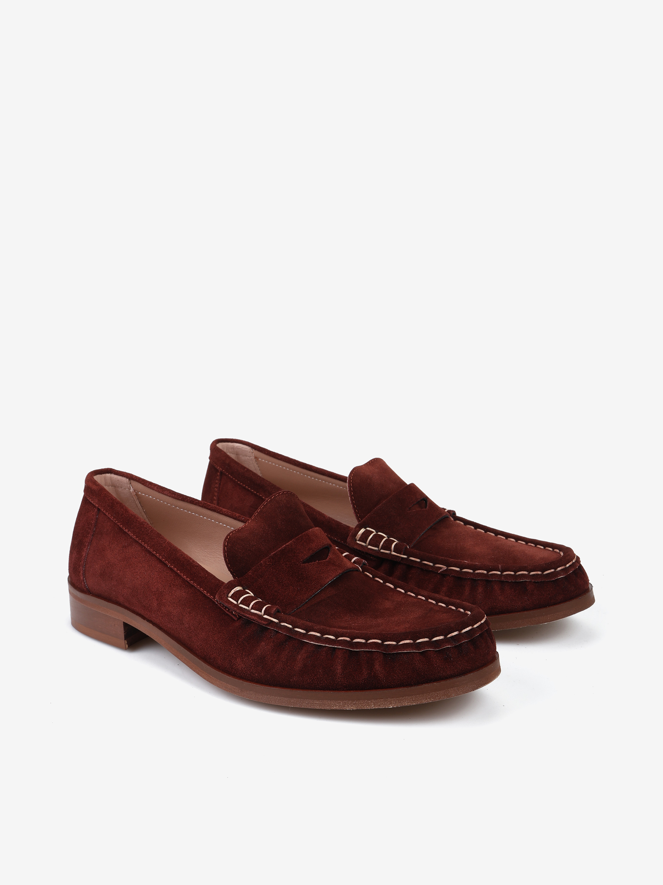 Zamszowe mokasyny z ozdobną patką i szwami w kontrastującym kolorze.