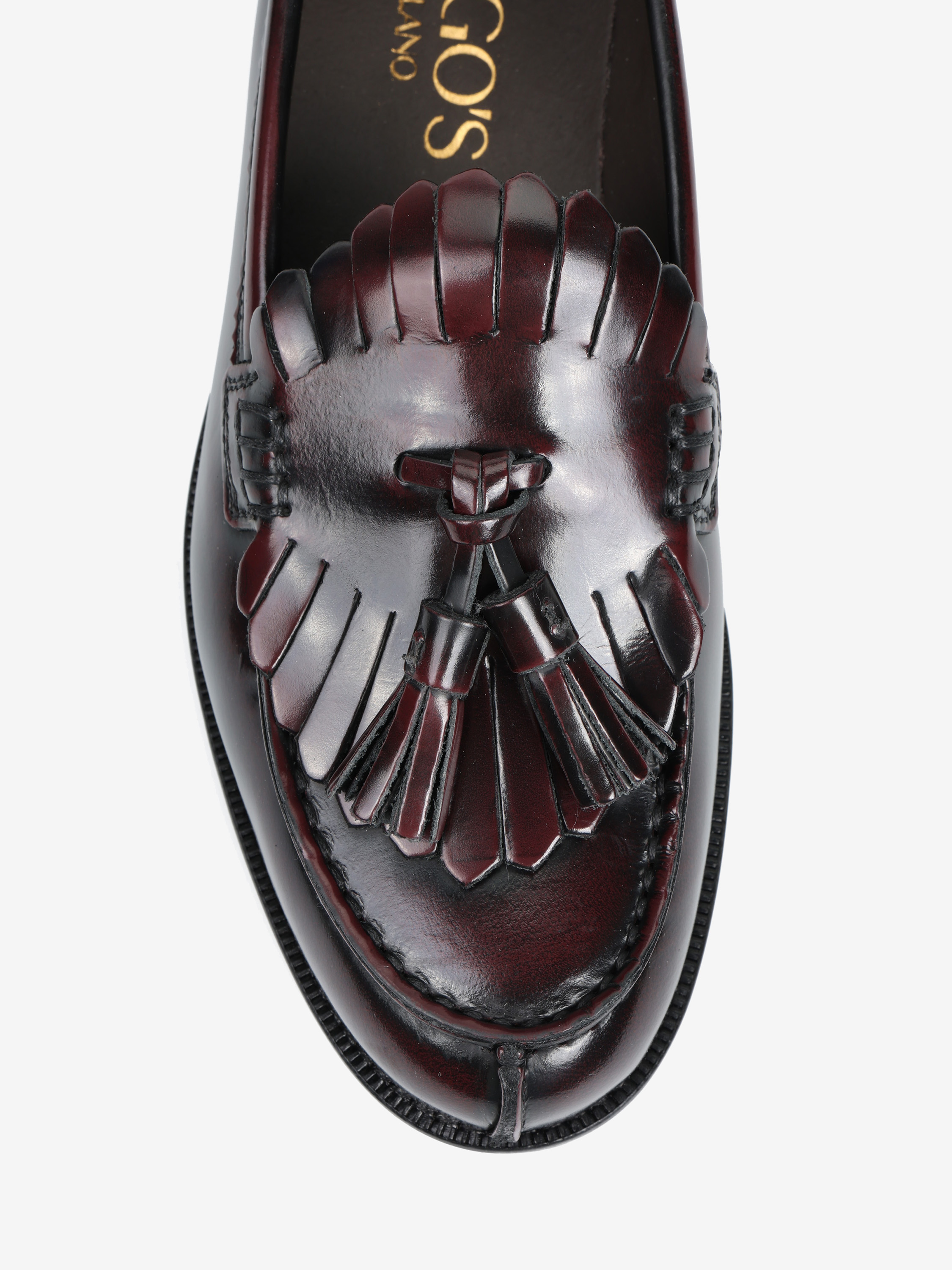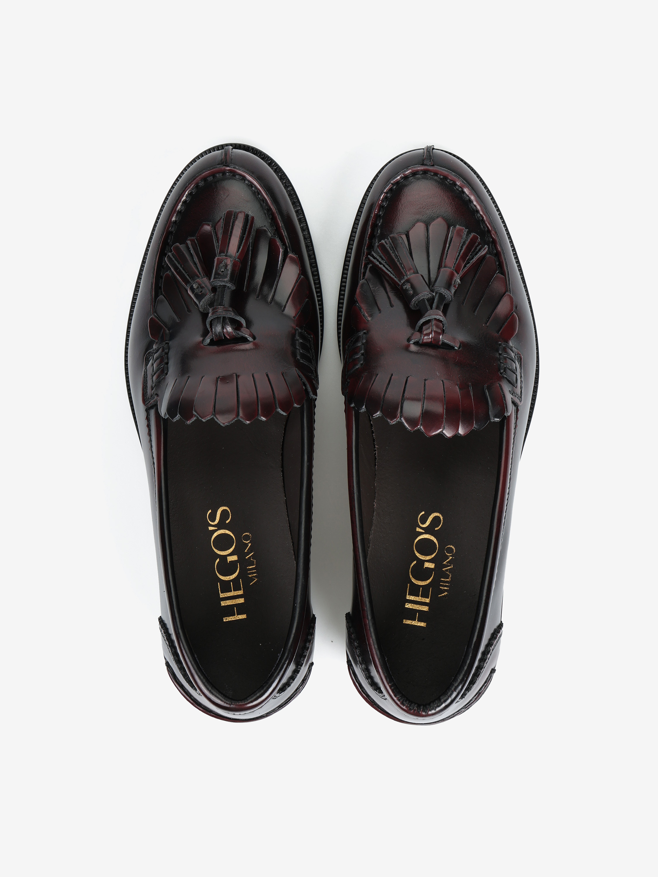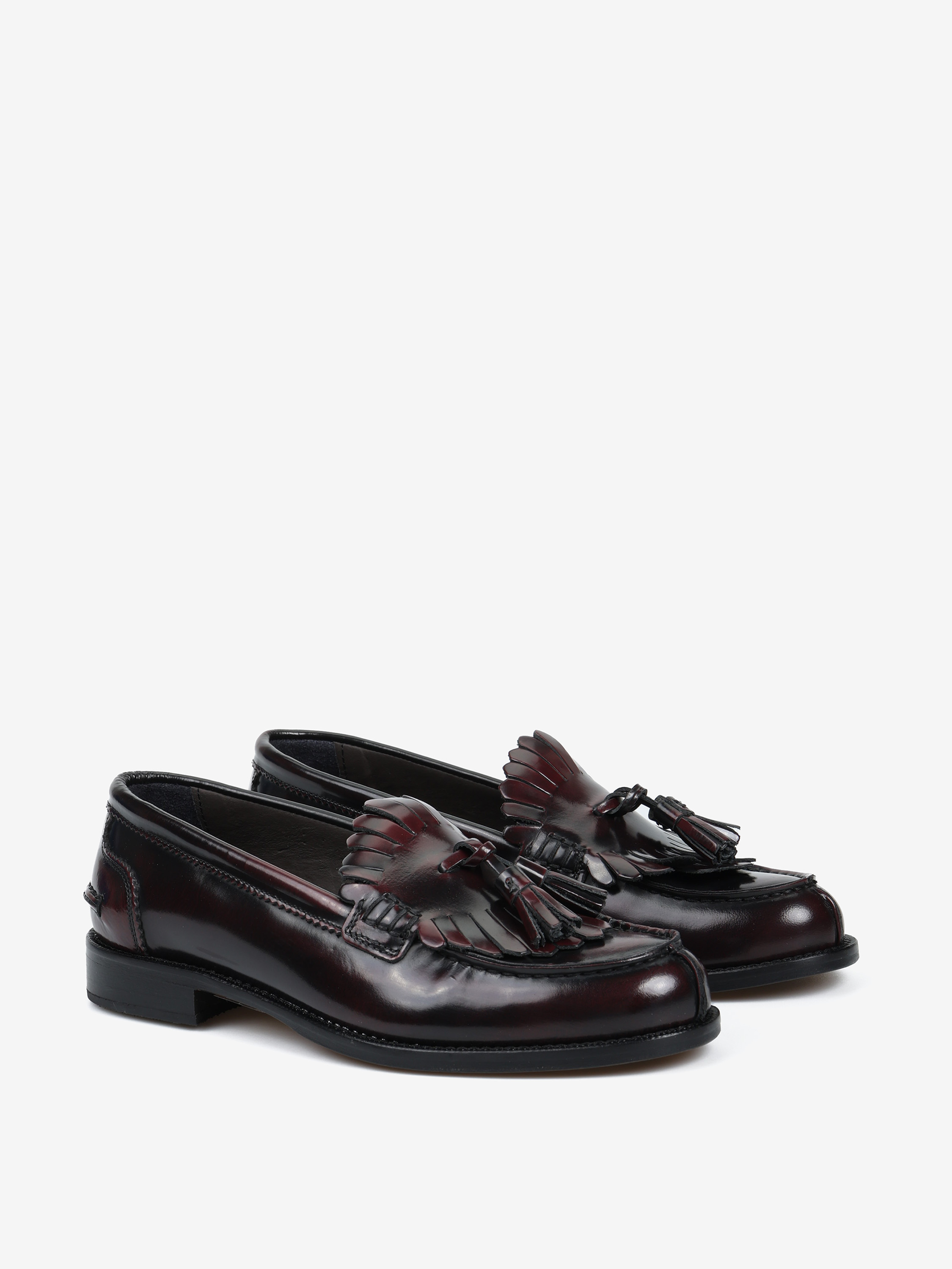 Bordowe mokasyny wykonane ze skóry wysoko polerowanej, z wycięciami na języku i ozdobnymi frędzlami.
