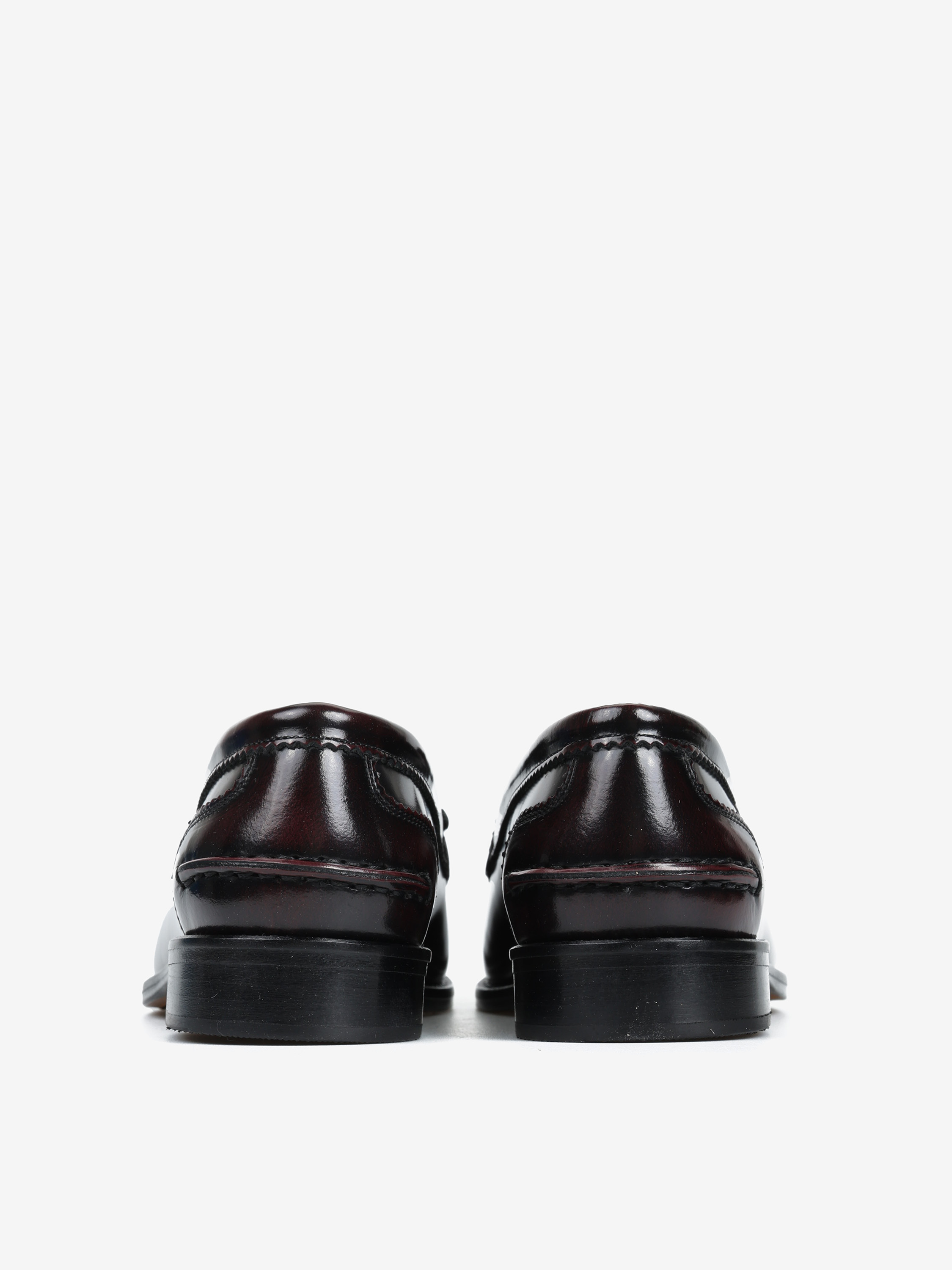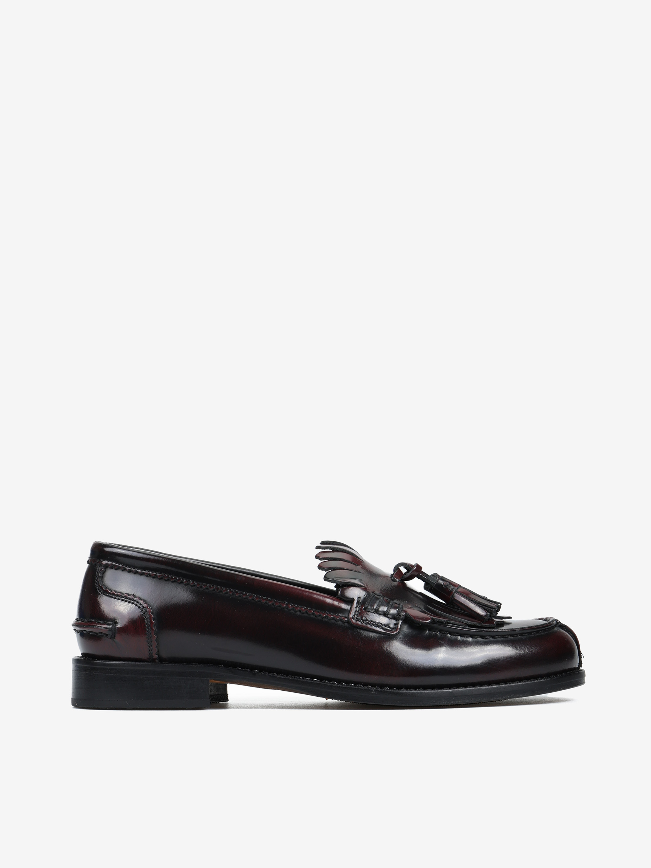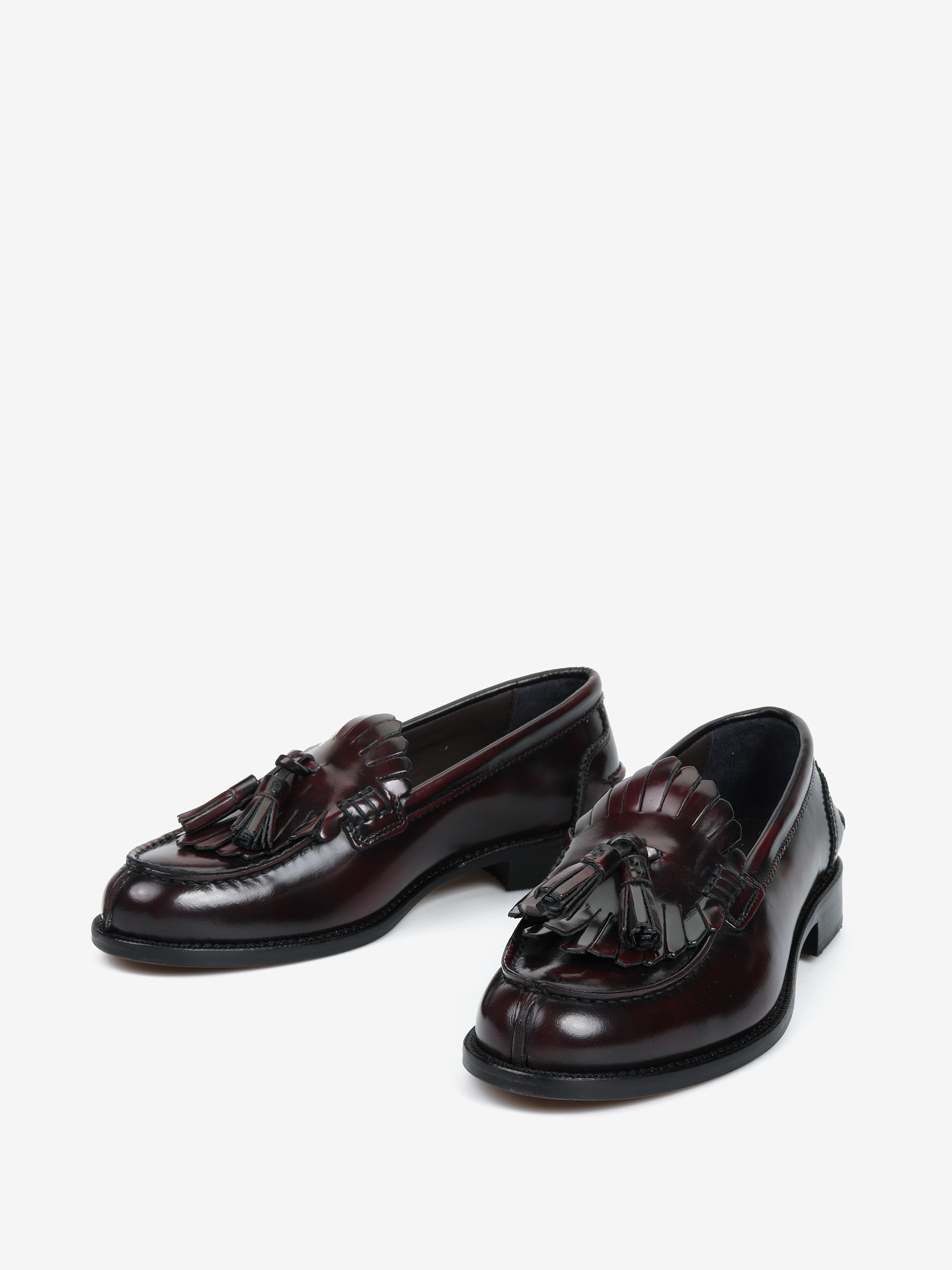 Bordowe mokasyny wykonane ze skóry wysoko polerowanej, z wycięciami na języku i ozdobnymi frędzlami.