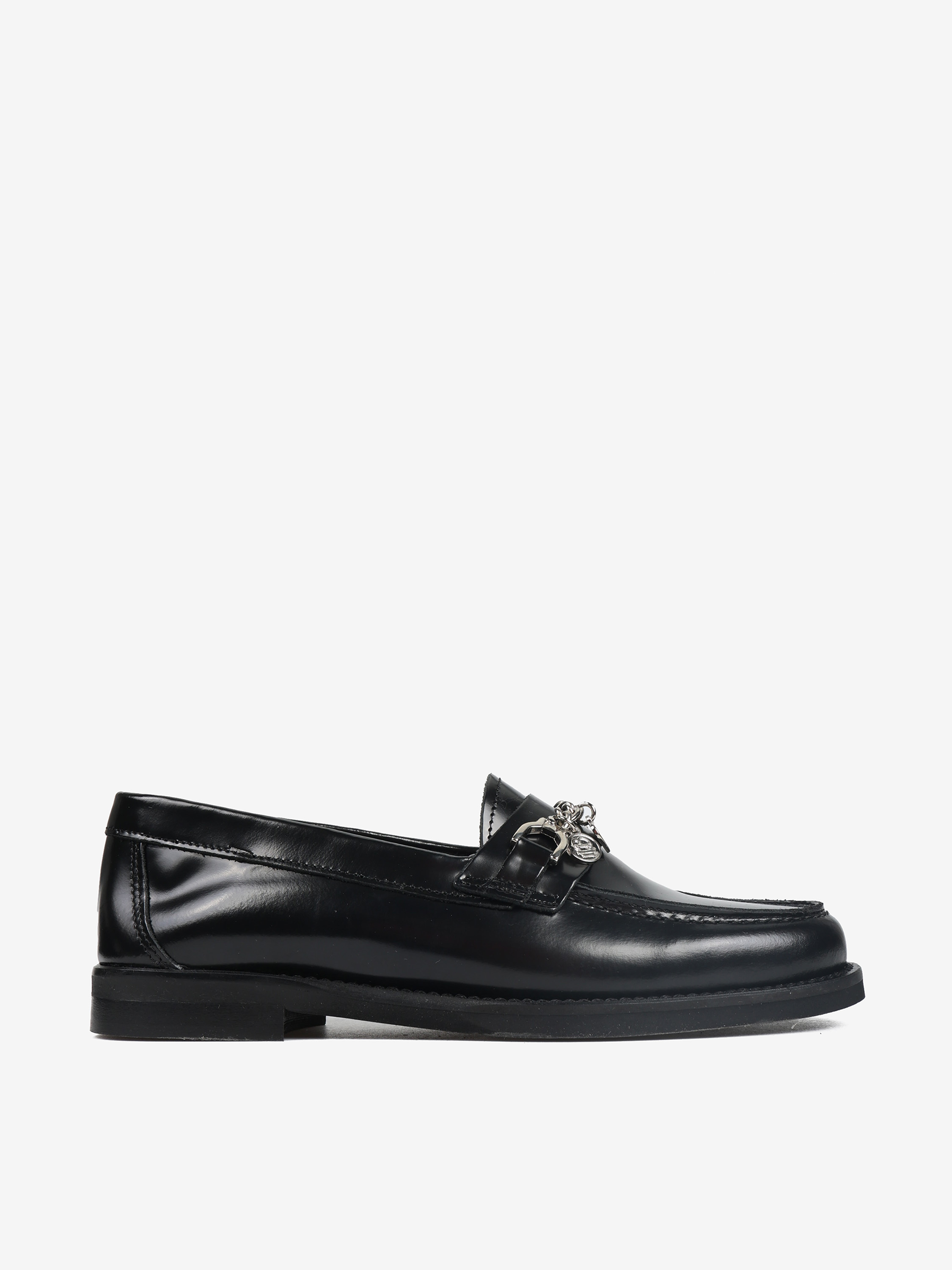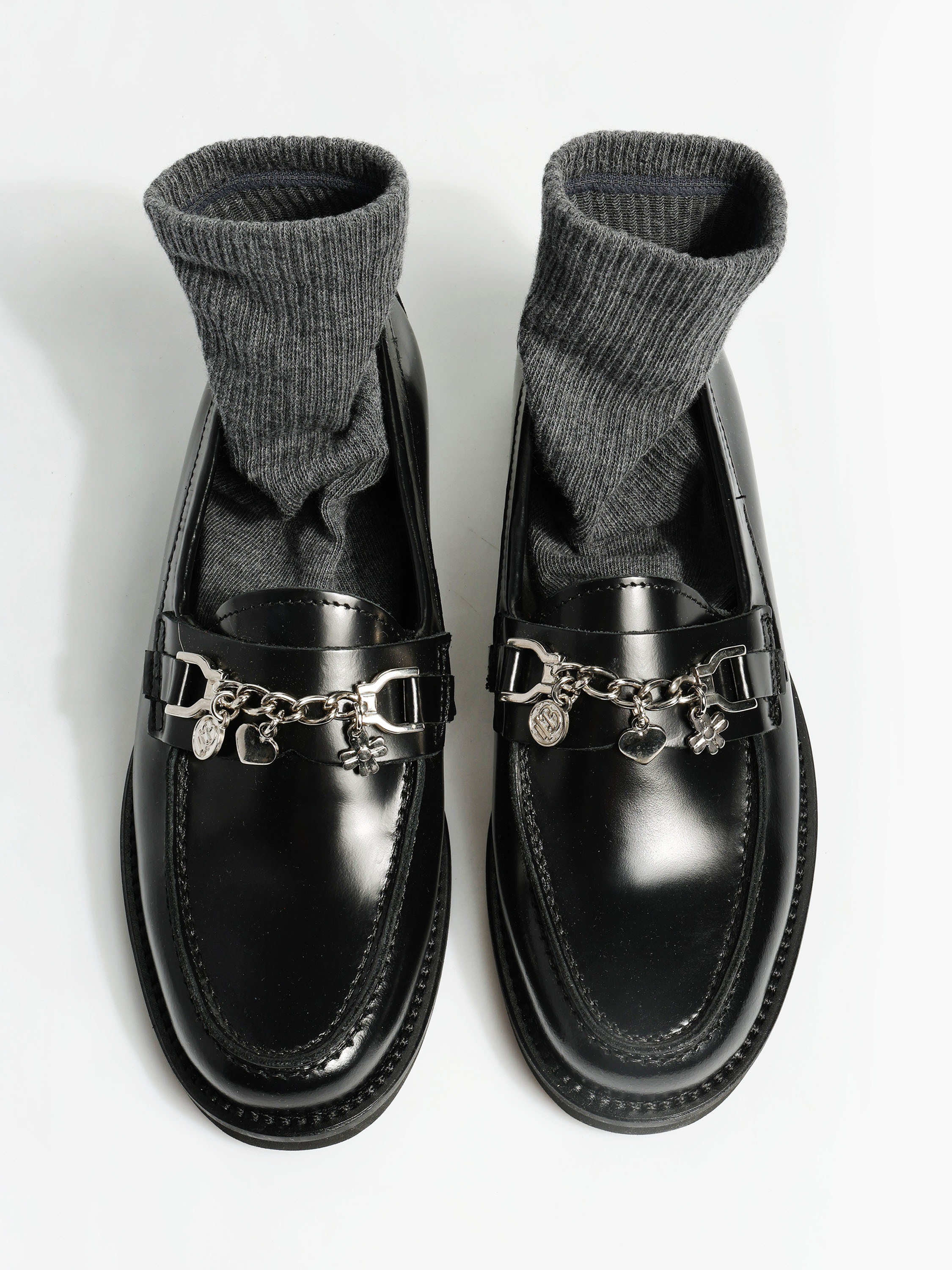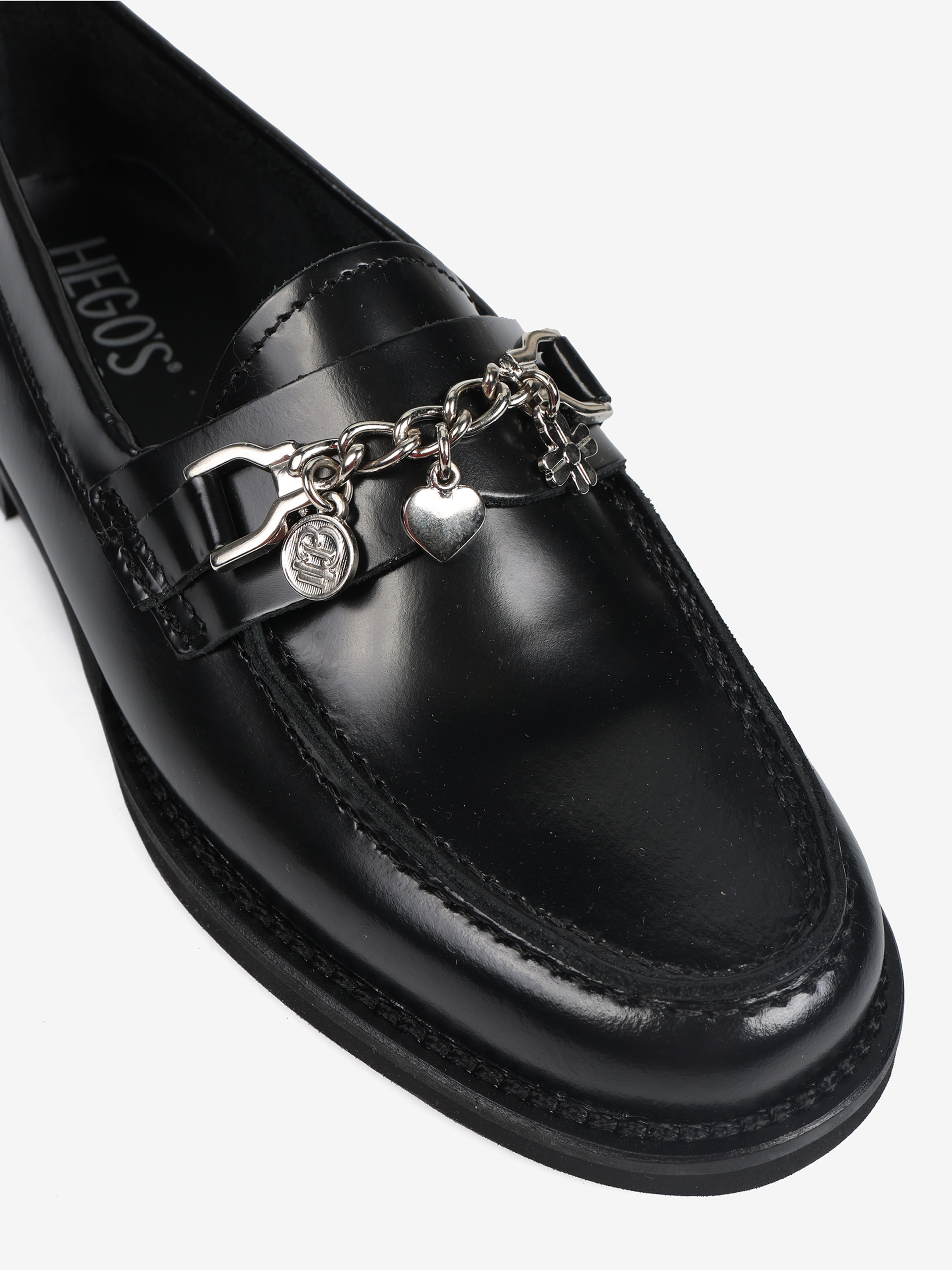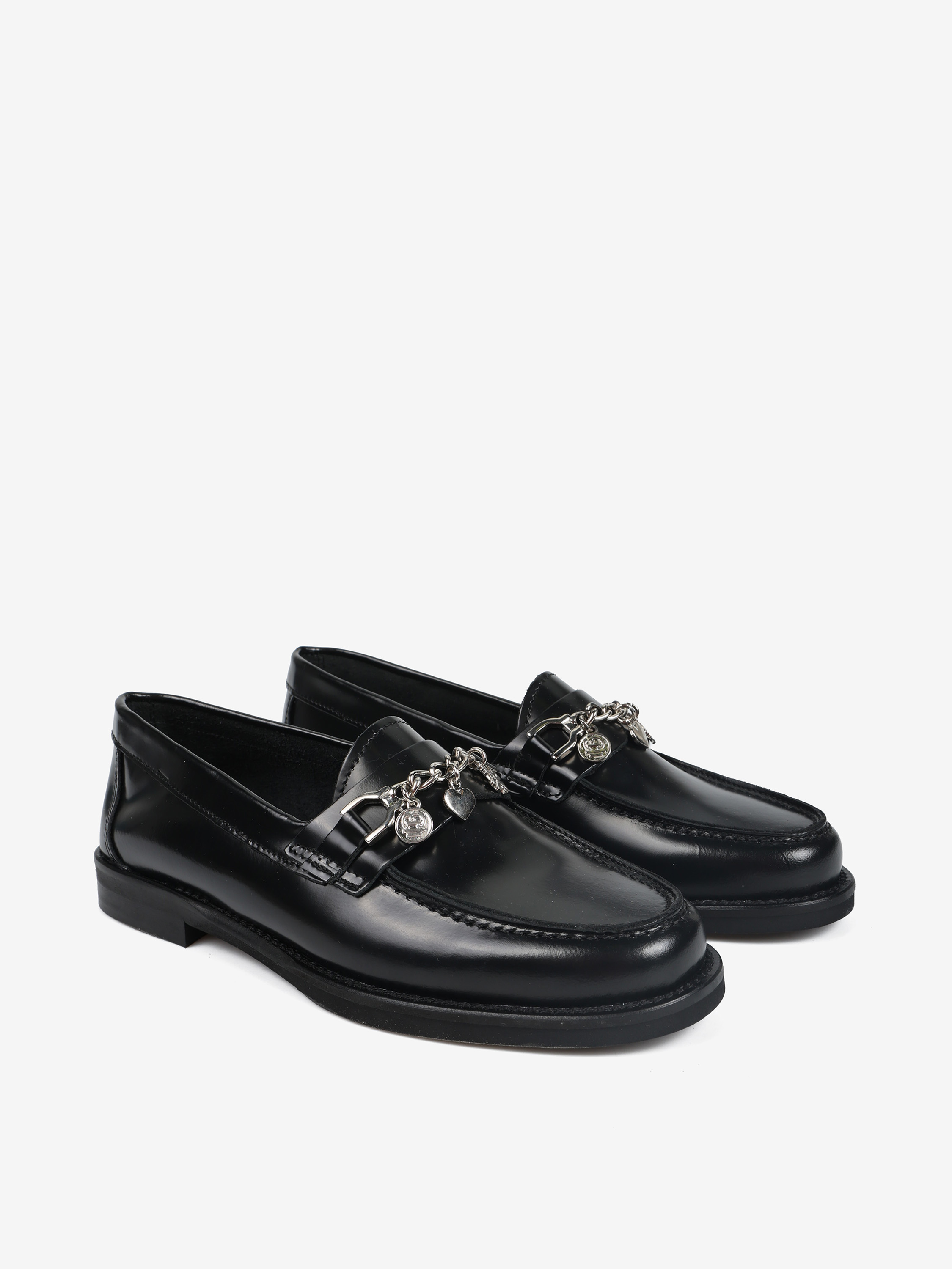 Klasyczne mokasyny wykonane z wysokopolerowanej skóry. Ozdobna patka z łańcuszkiem i zawieszkami.