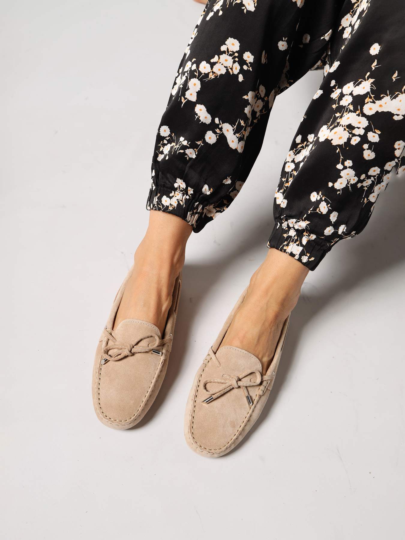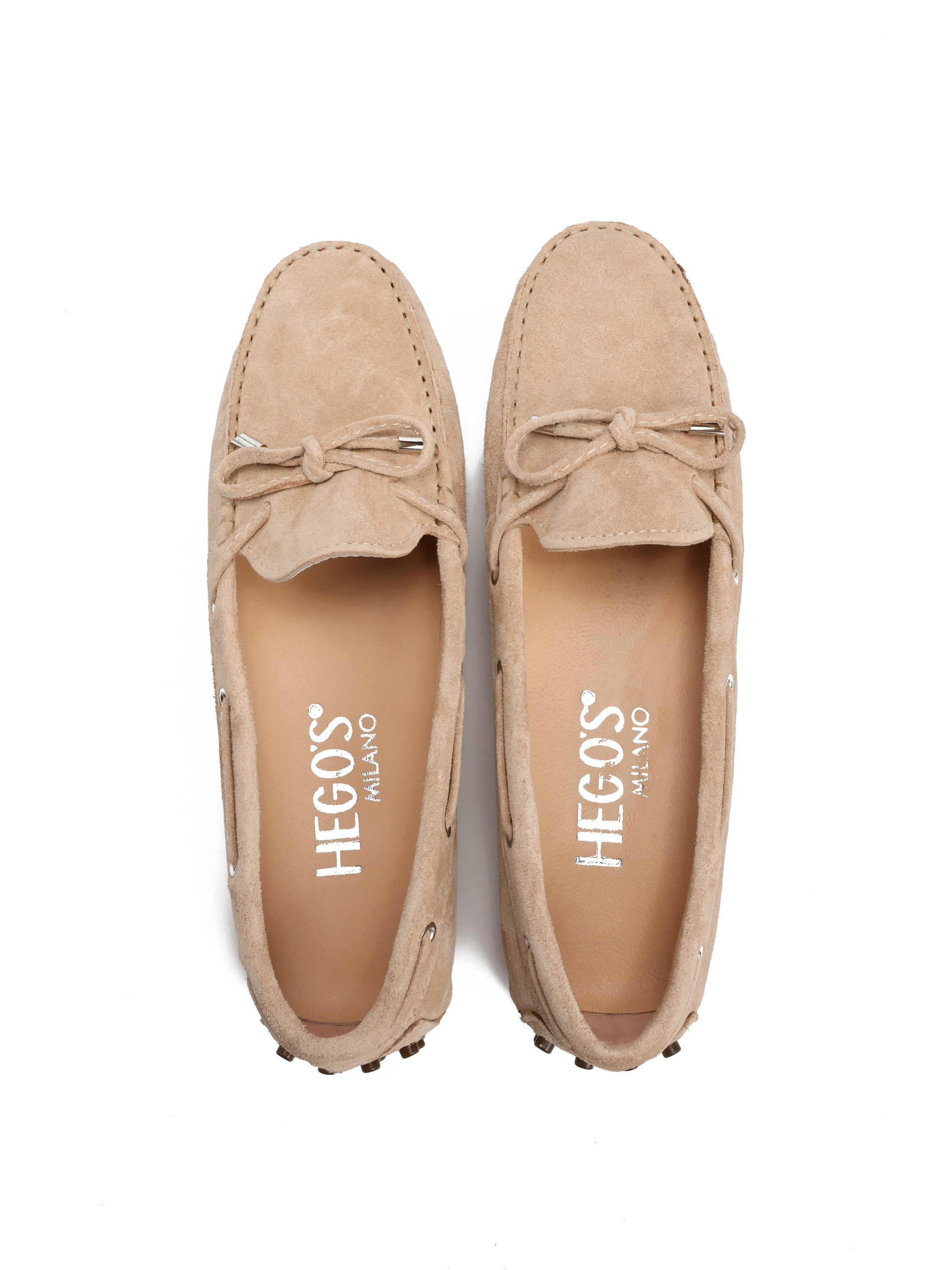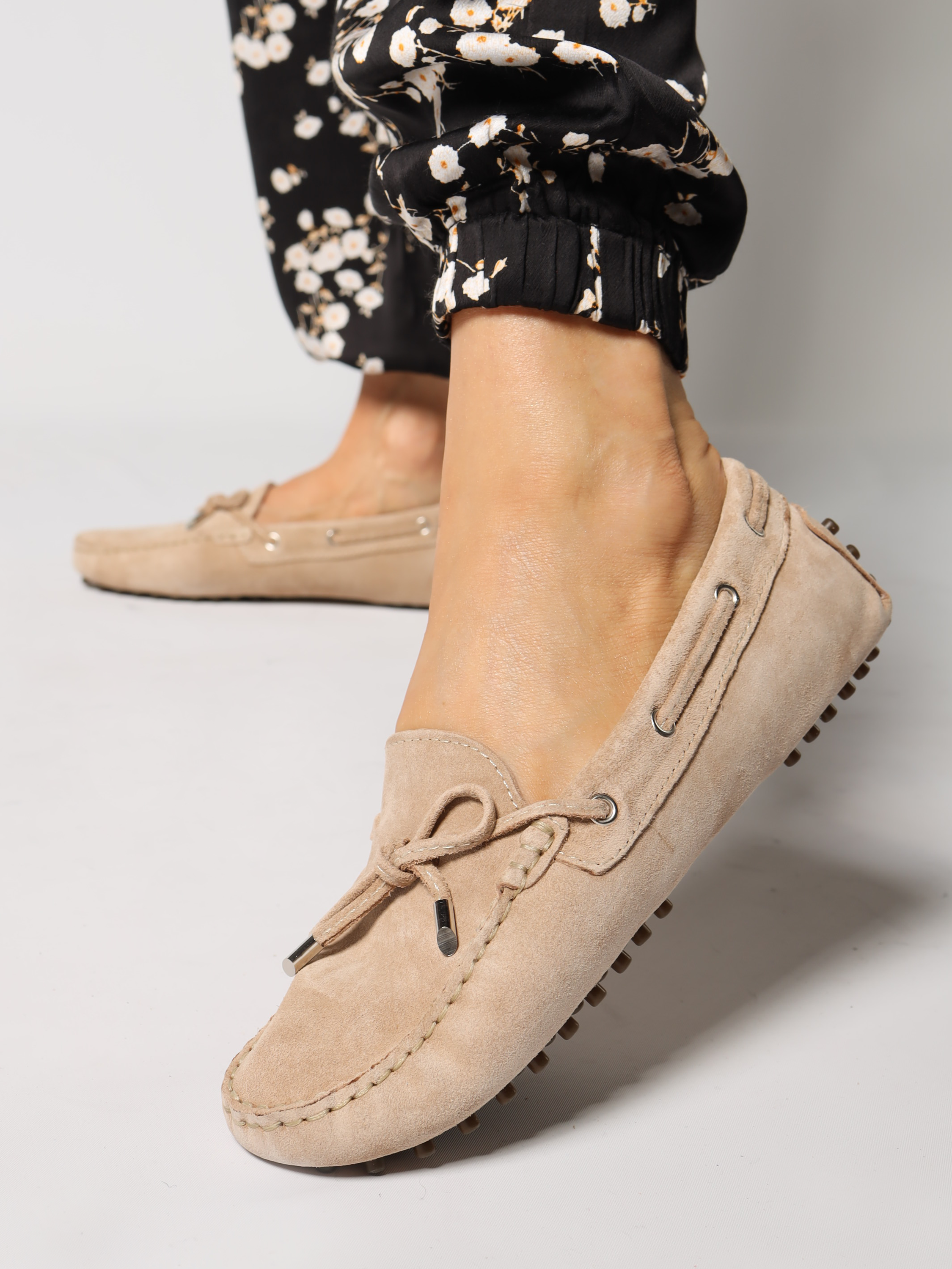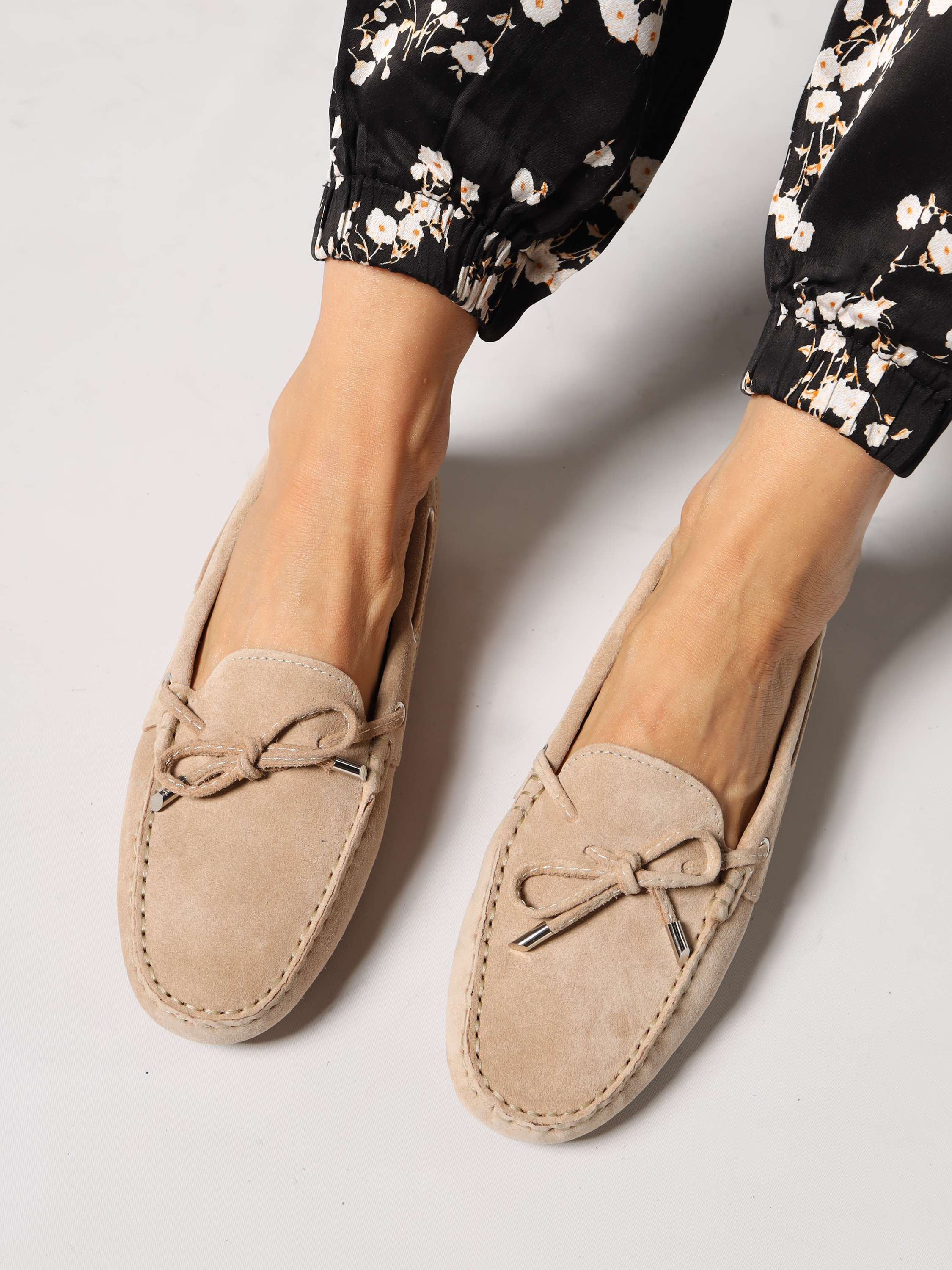Klasyczne mokasyny wykonane są z naturalnej skóry zamszowej. Lekkie i bardzo wygodne. Minimalistyczny model uzupełniony został kokardką na przodzie. Podeszwa podszyta gumą, odpowiada za komfort podczas chodzenia.