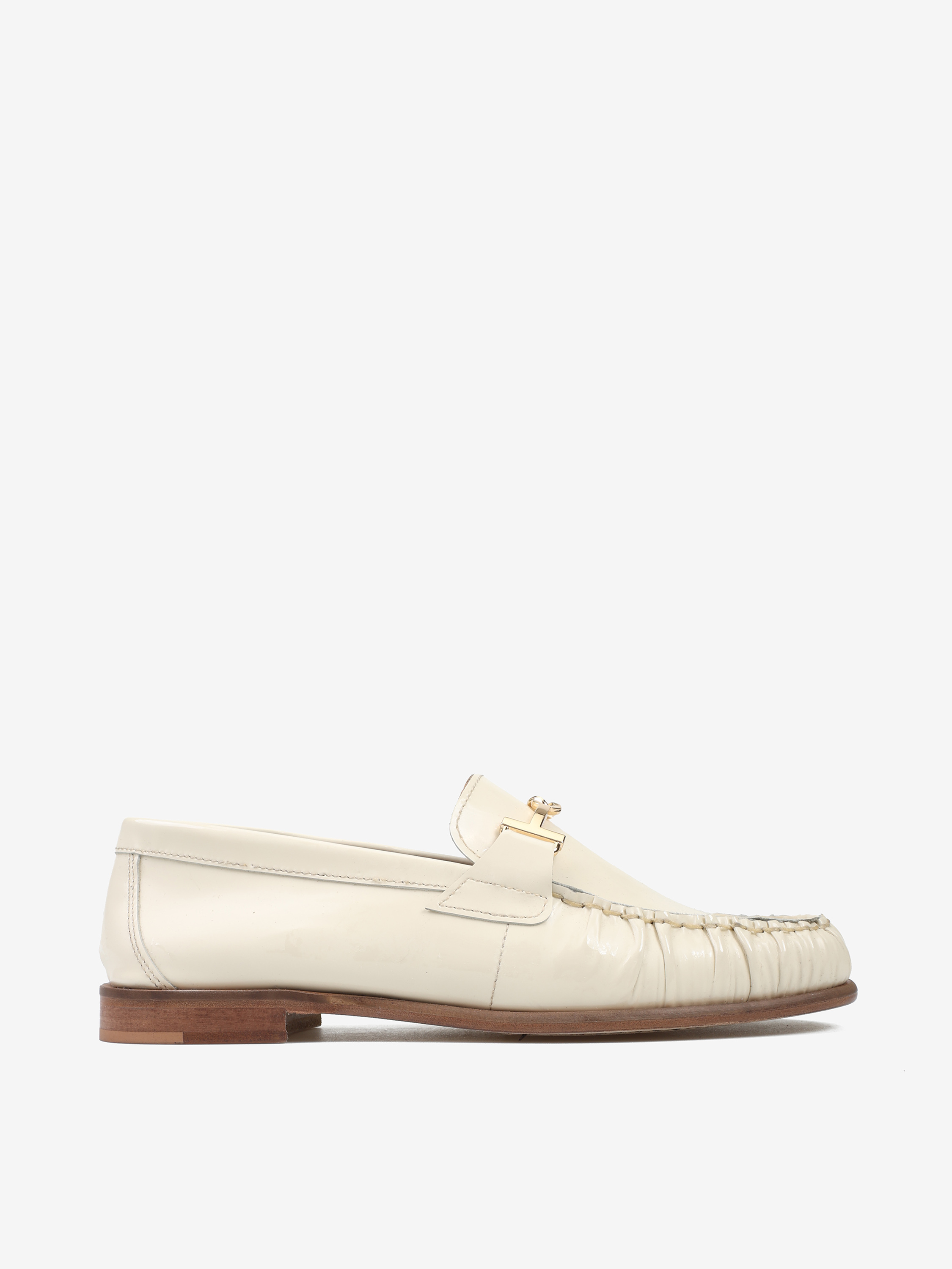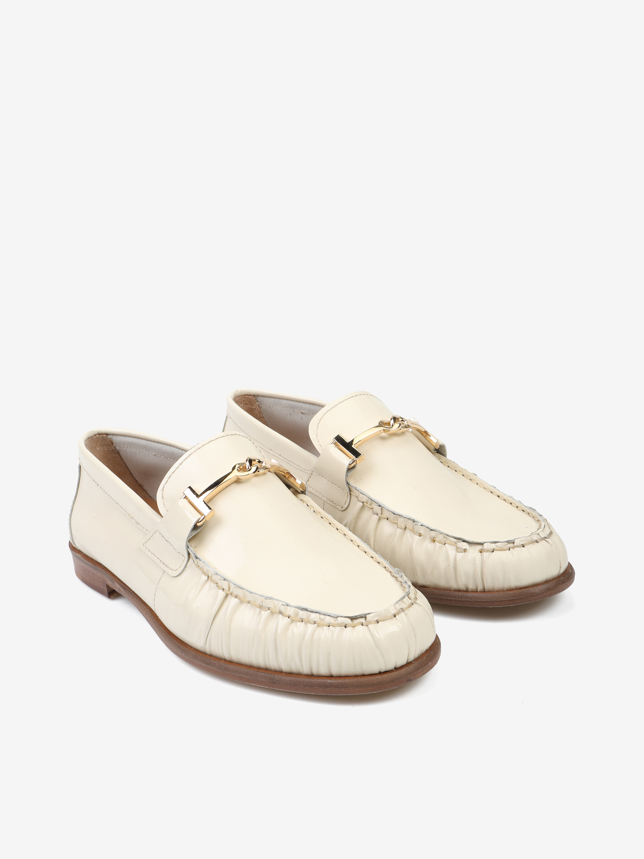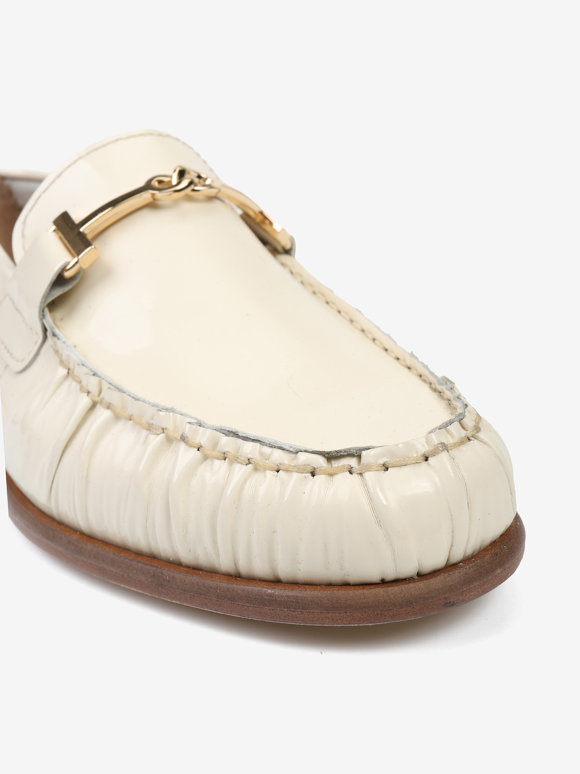 Mokasyny wykonane z wysokopolerowanej skóry. Ozdobne marszczenie i metalowe wędzidło.