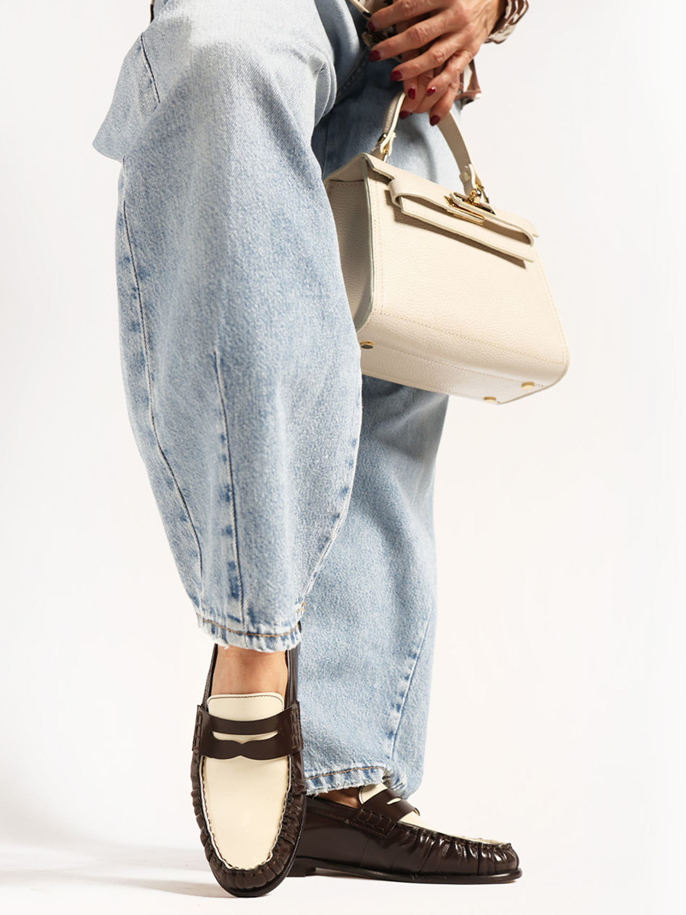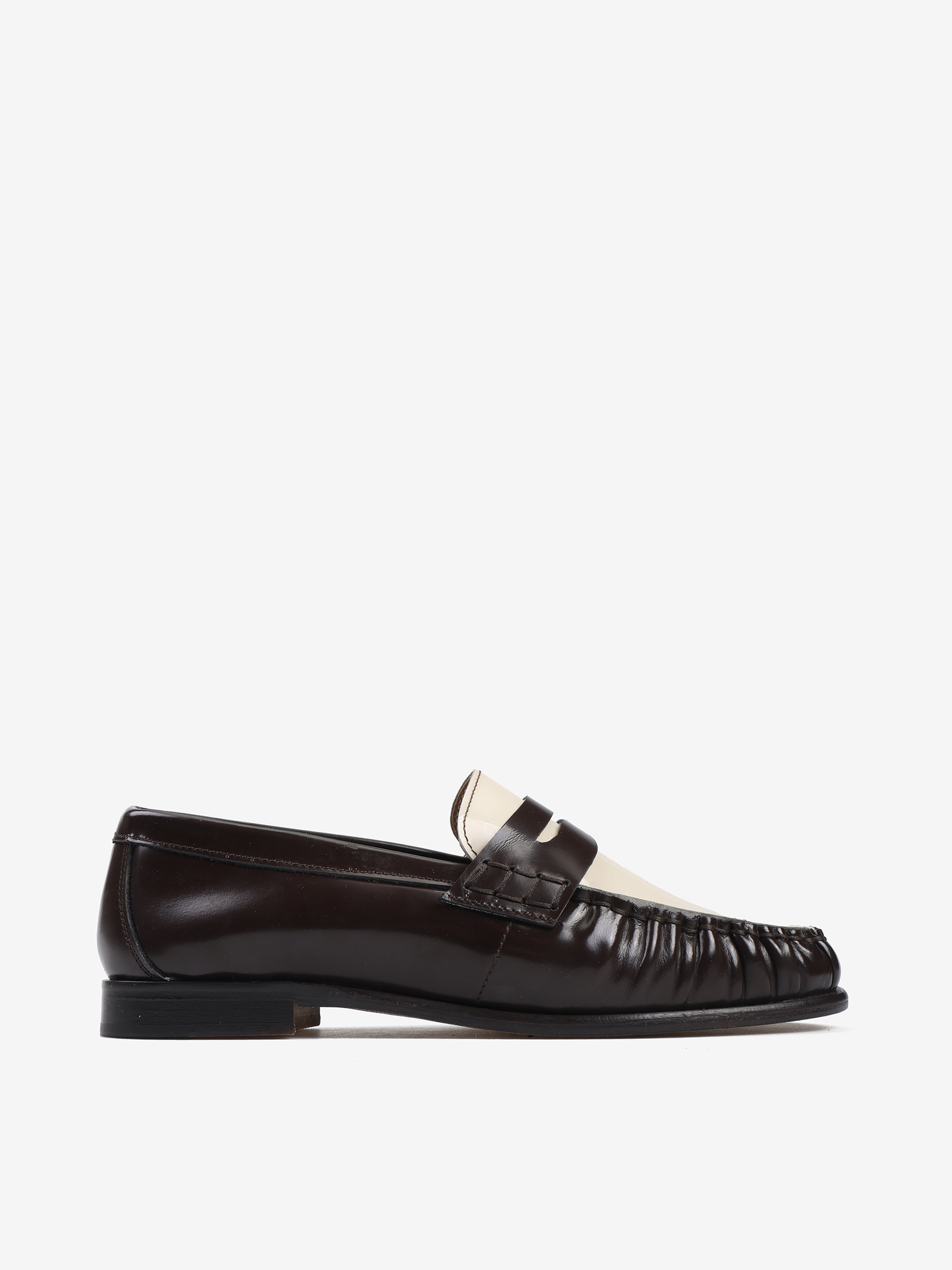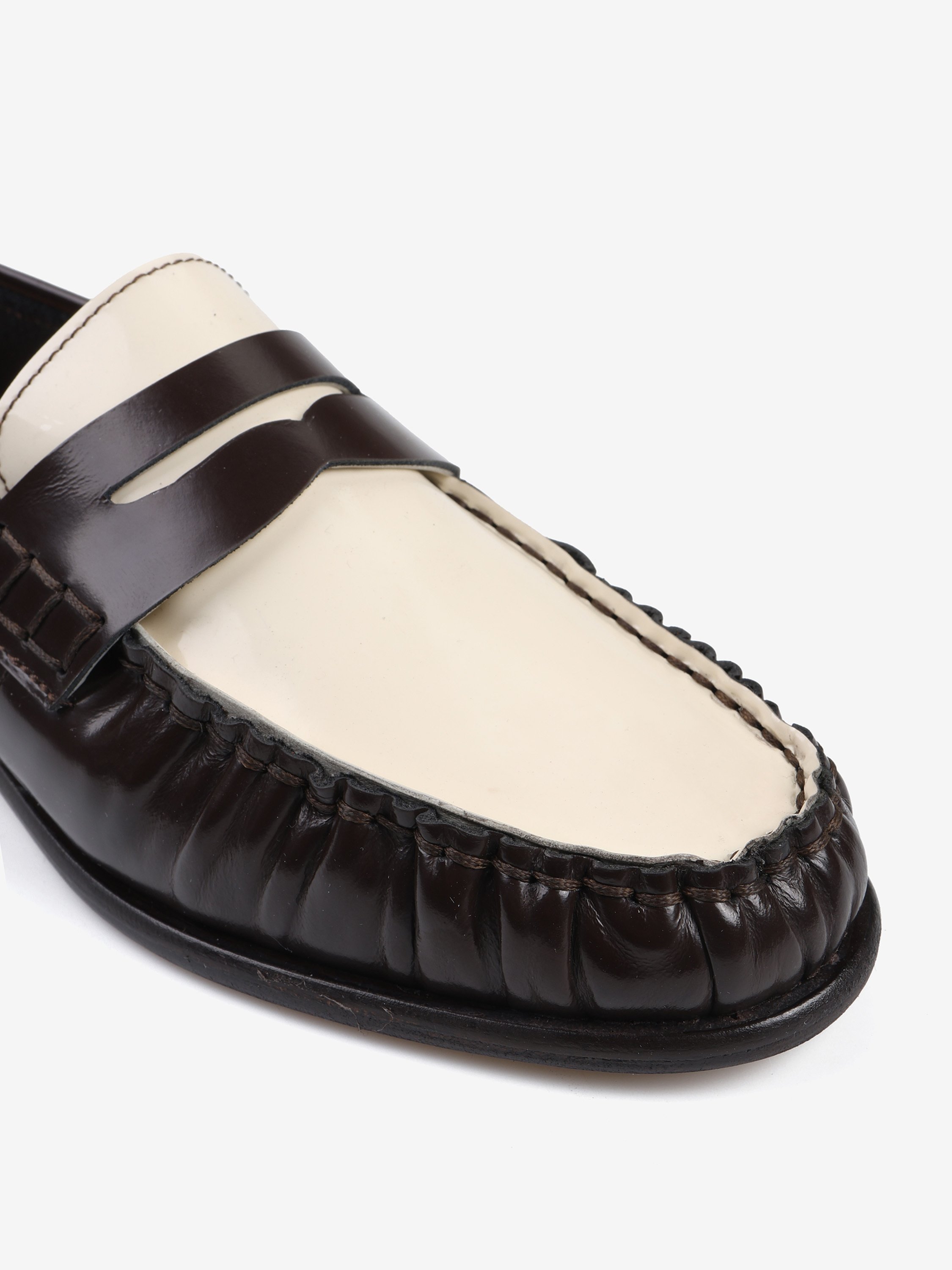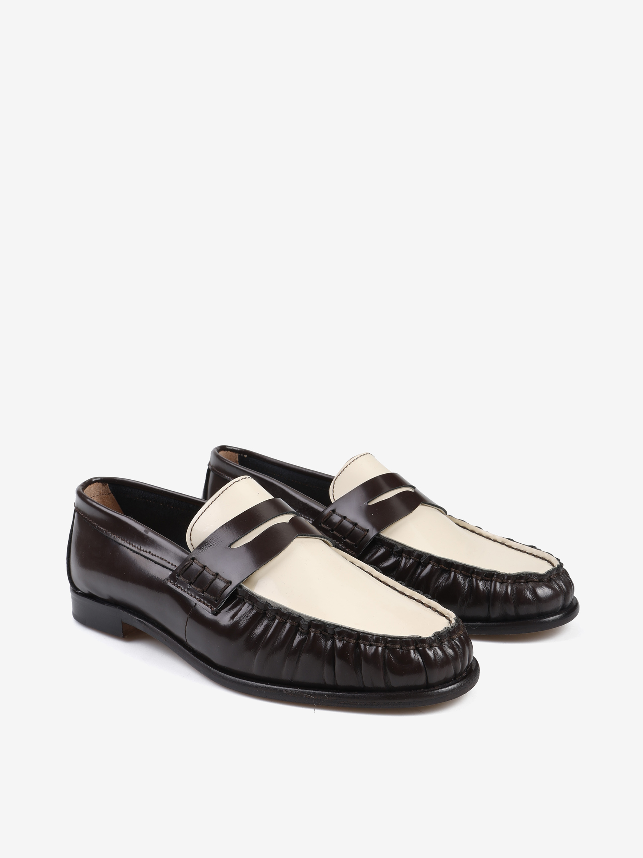Mokasyny wykonane z wysokopolerowanej, czekoladowej i kremowej skóry. Skórzana patka i ozdobne marszczenie.