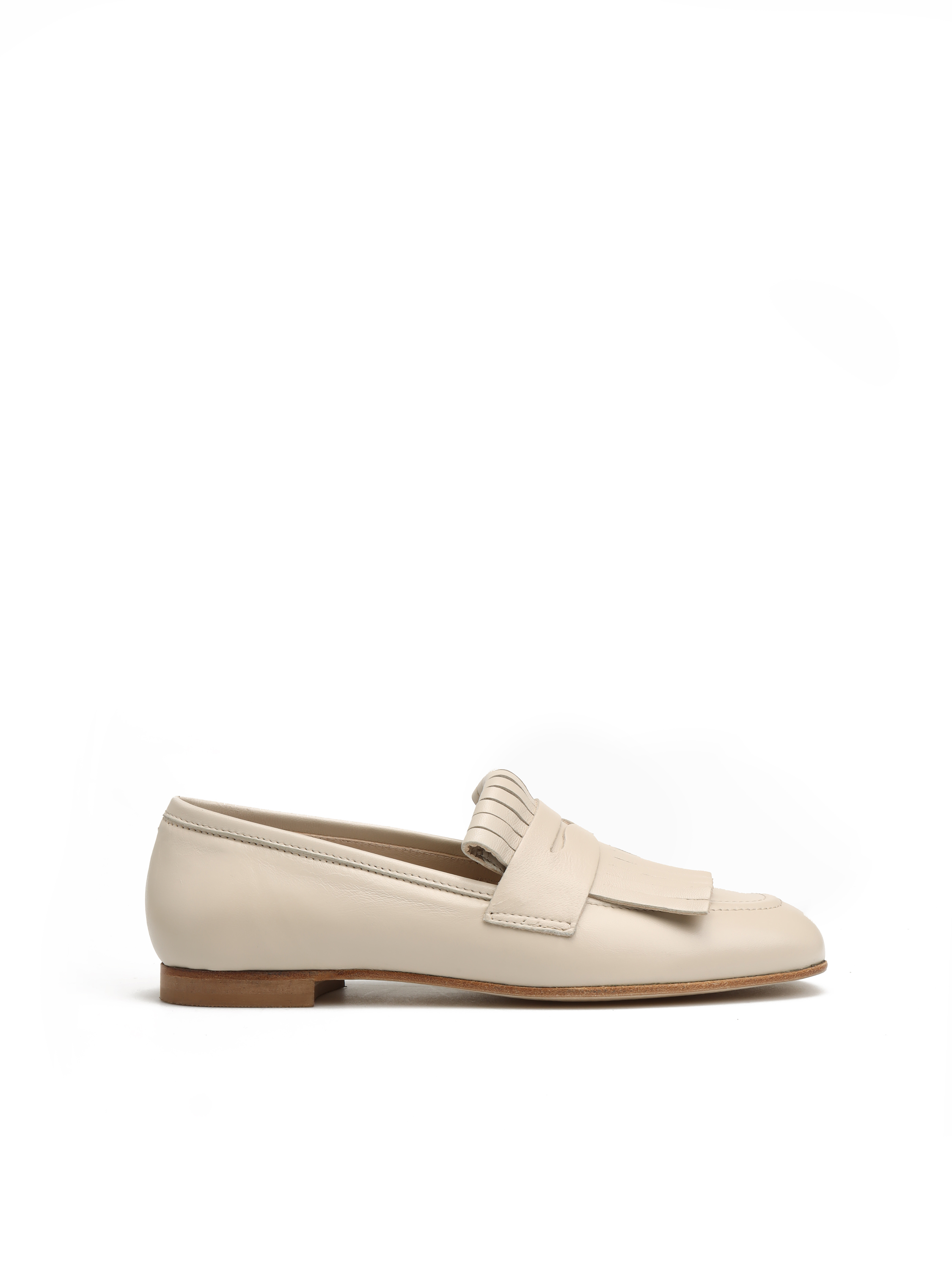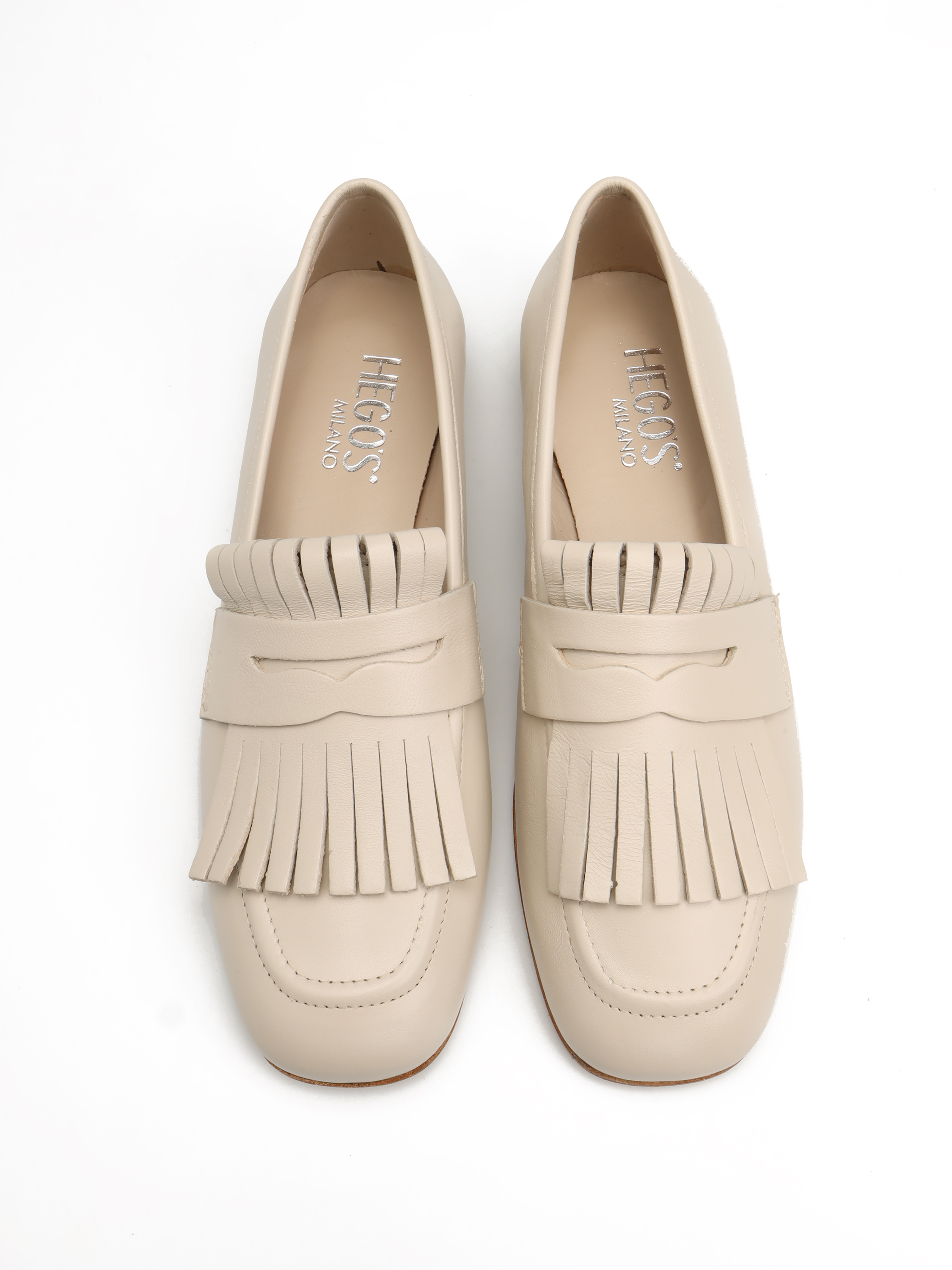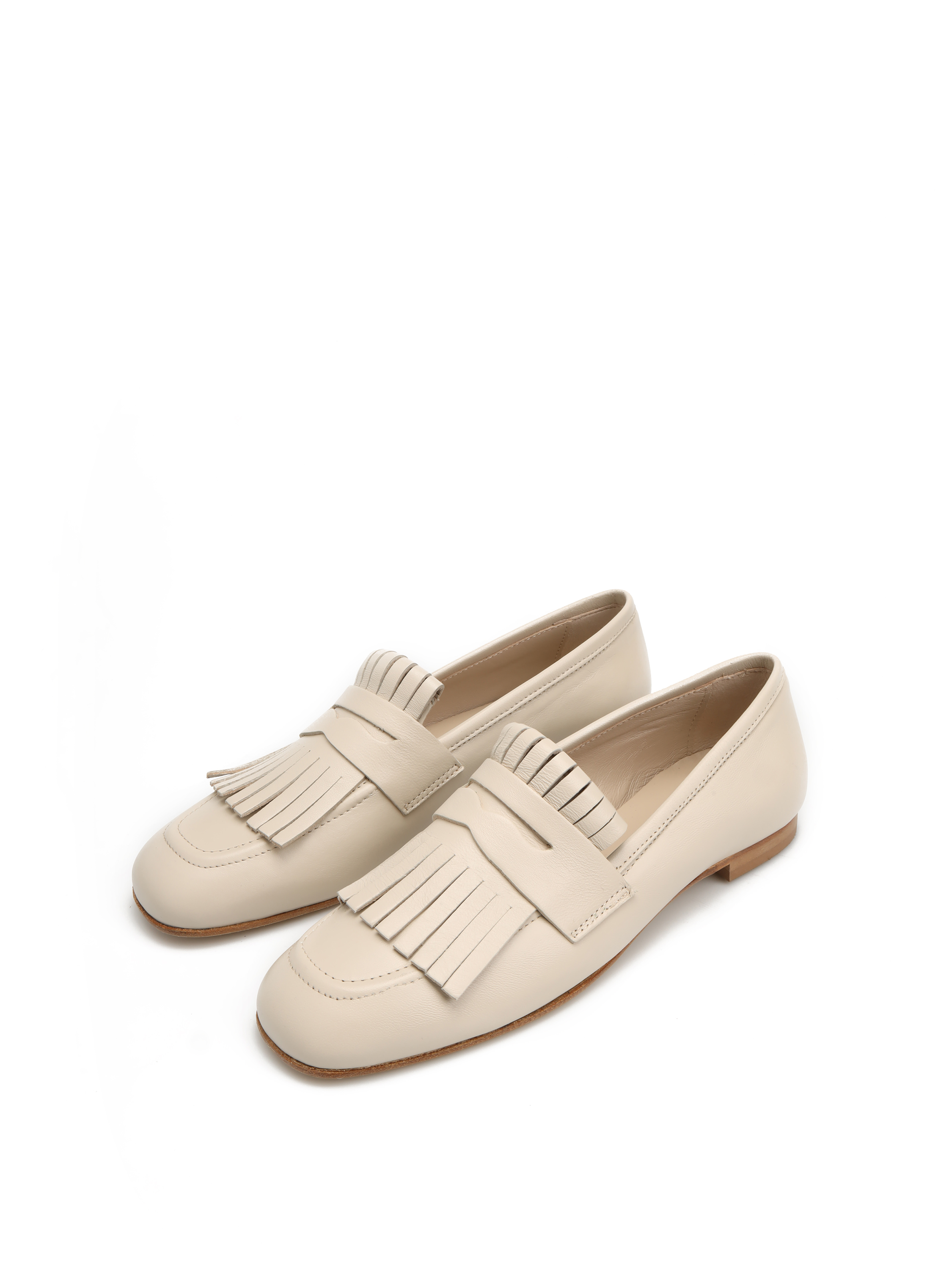 Mokasyny na płaskim obcasie wykonane są z naturalnej skóry. Cholewka w kremowym kolorze posiada wywijany język z frędzlami. Kwadratowe noski wpisują się w Trendy sezonu.