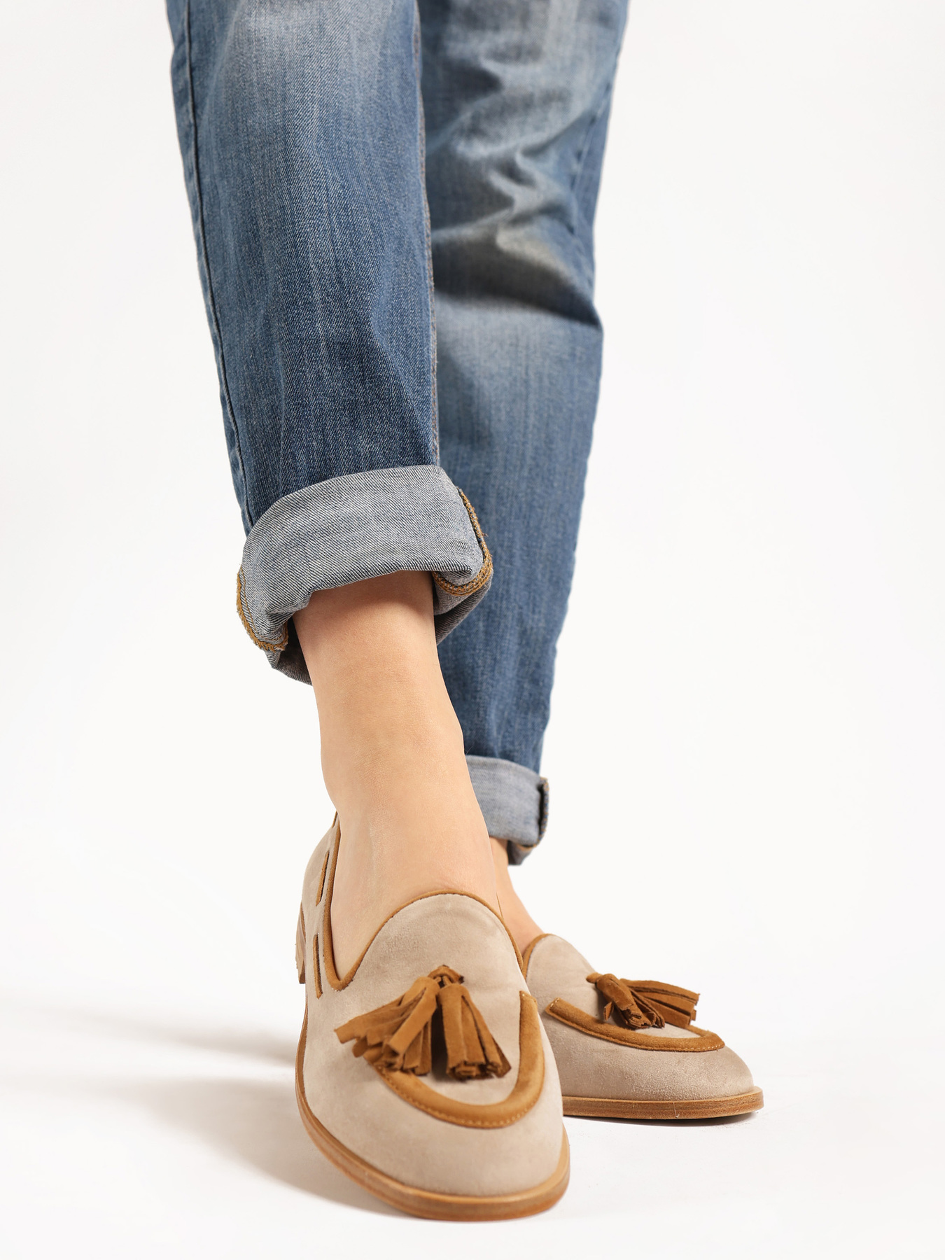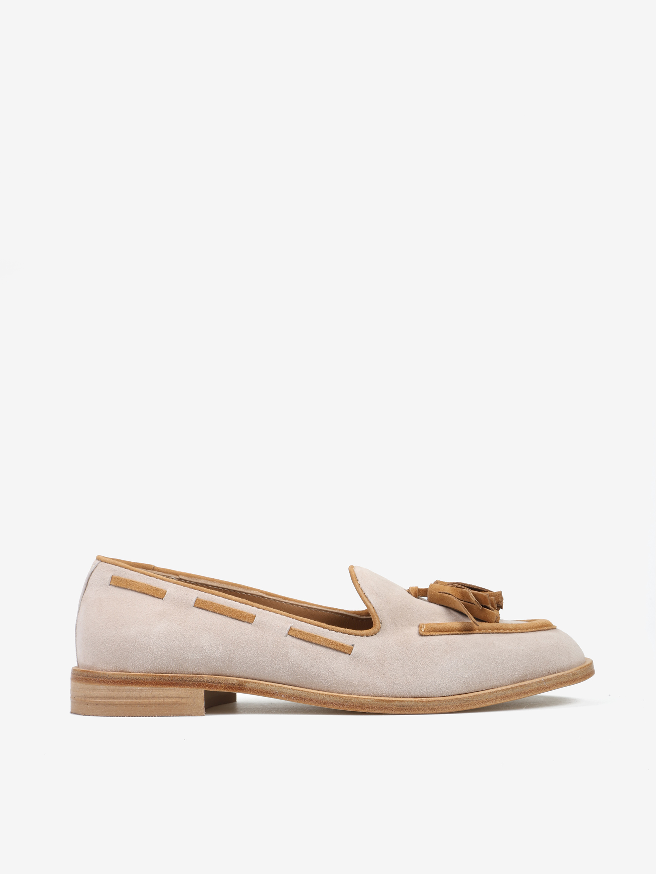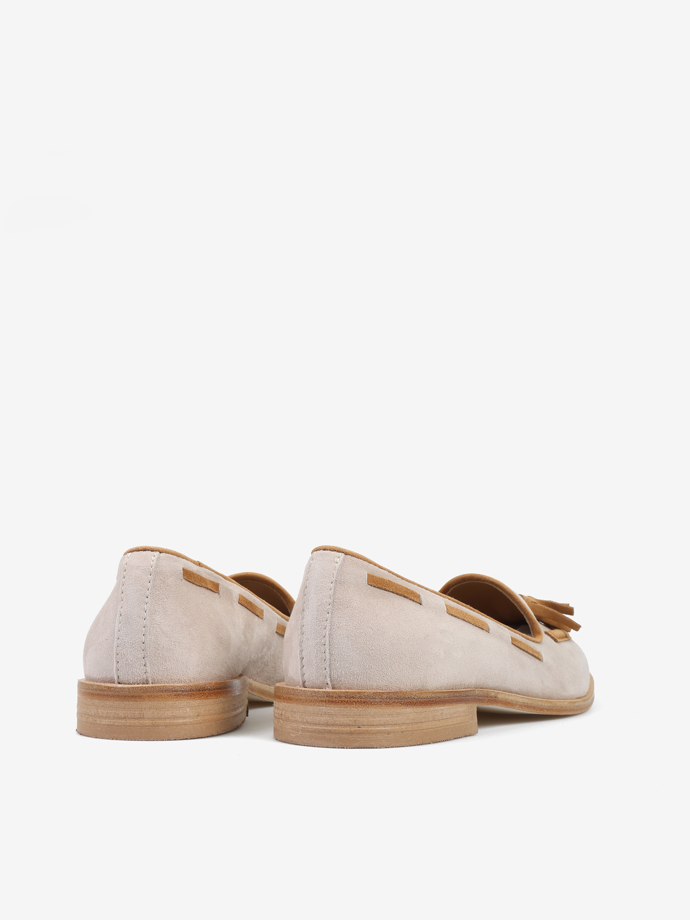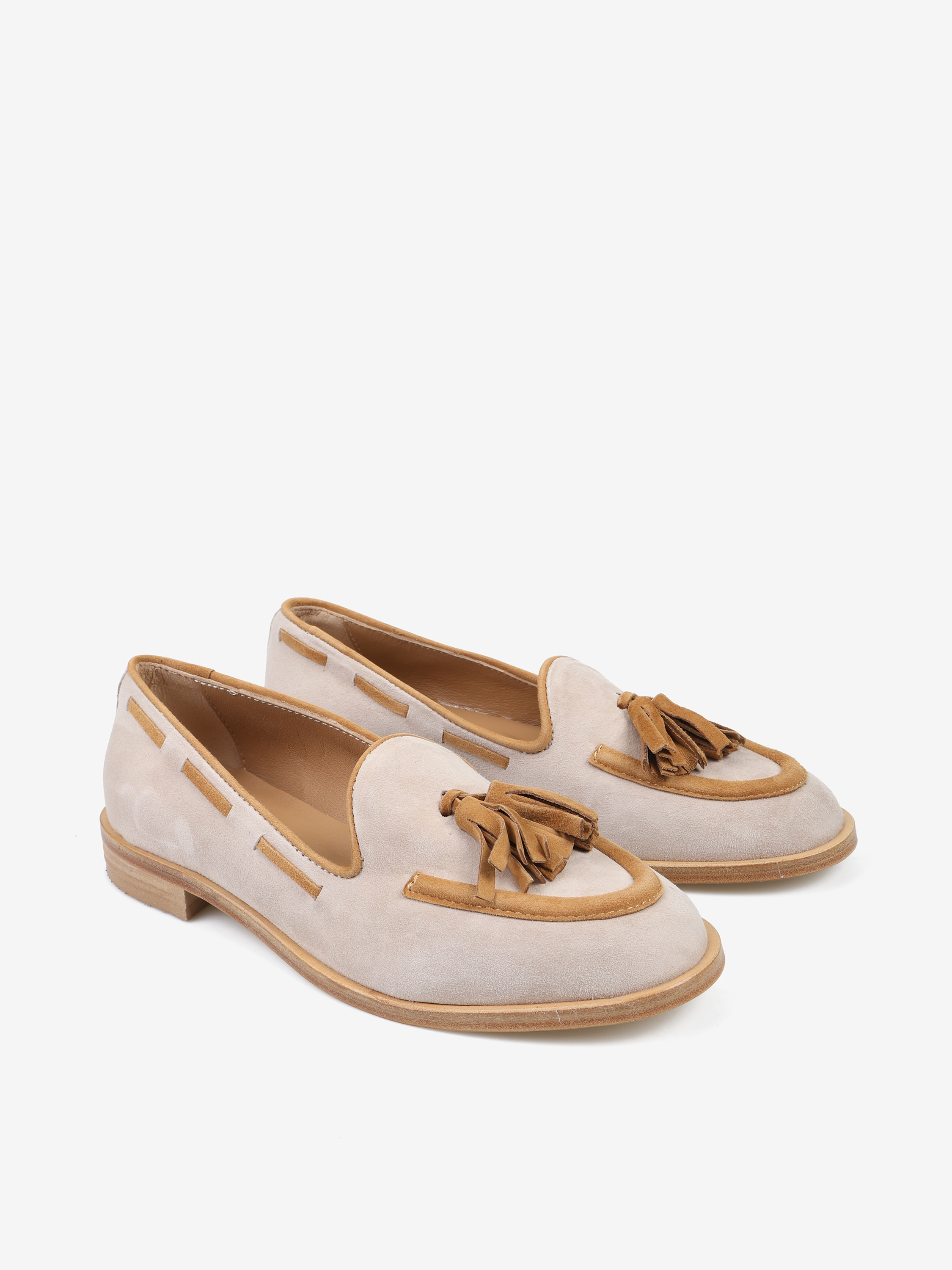 Zamszowe, beżowo-rude mokasyny z ozdobnym frędzlem.
