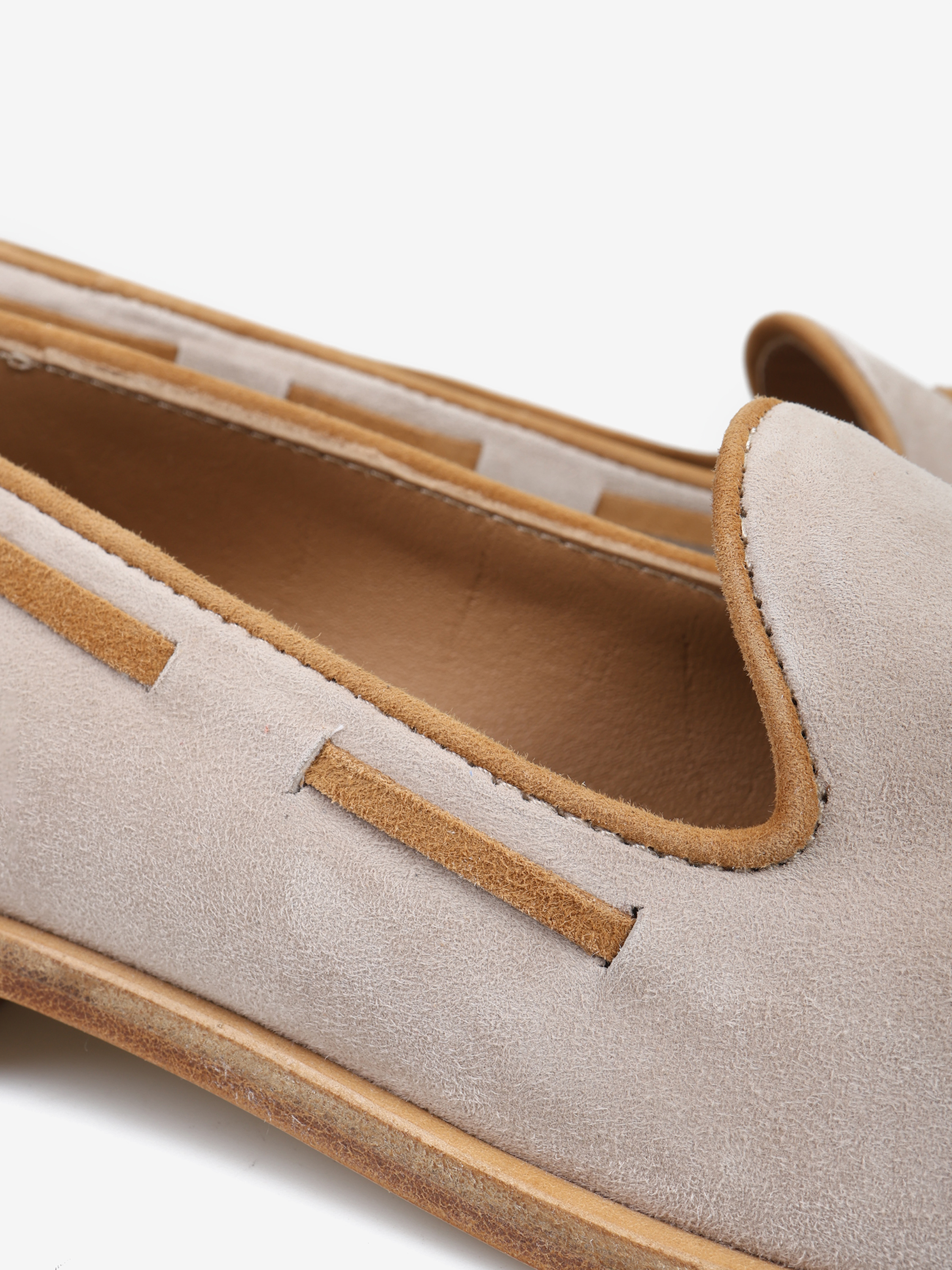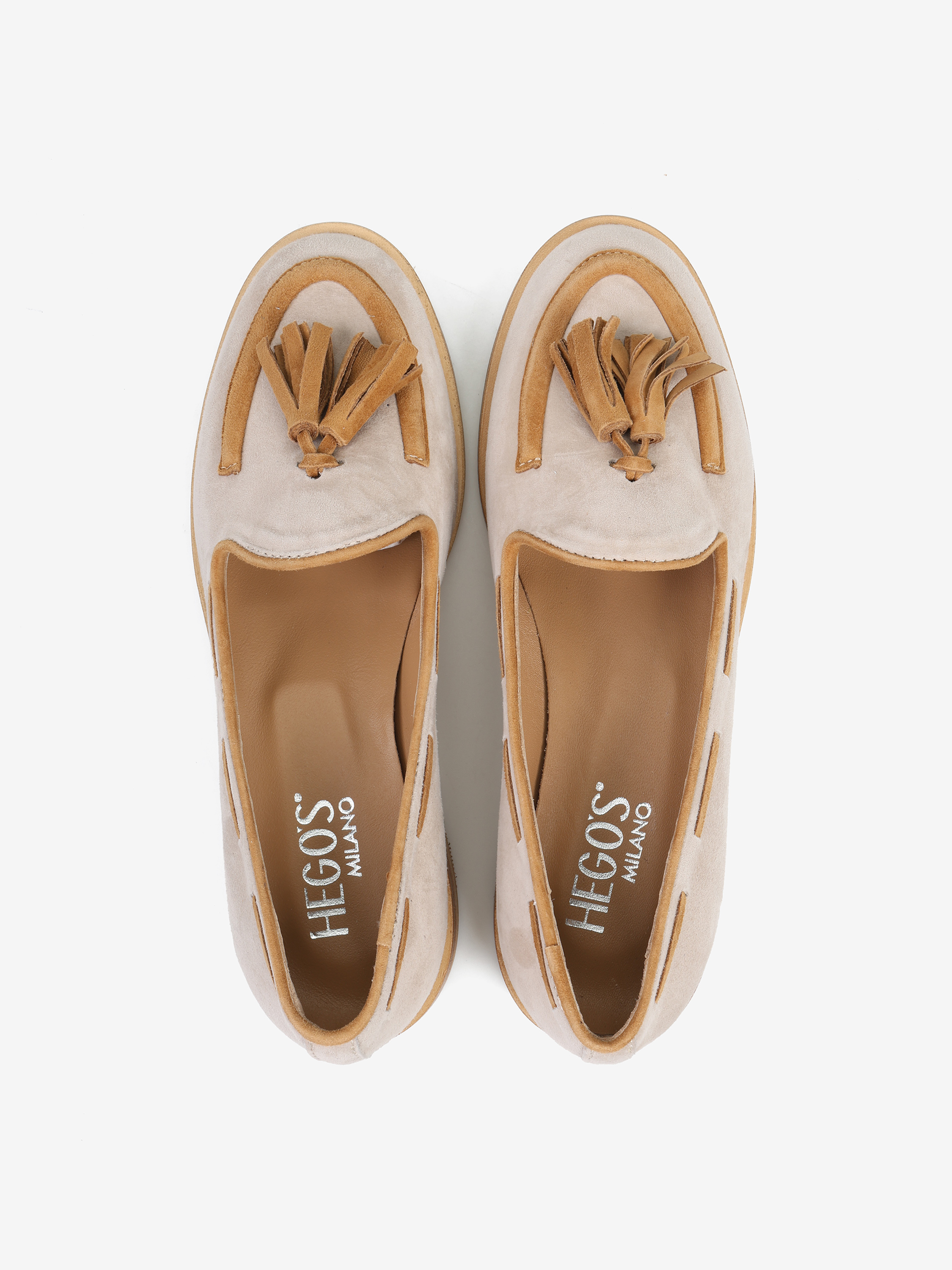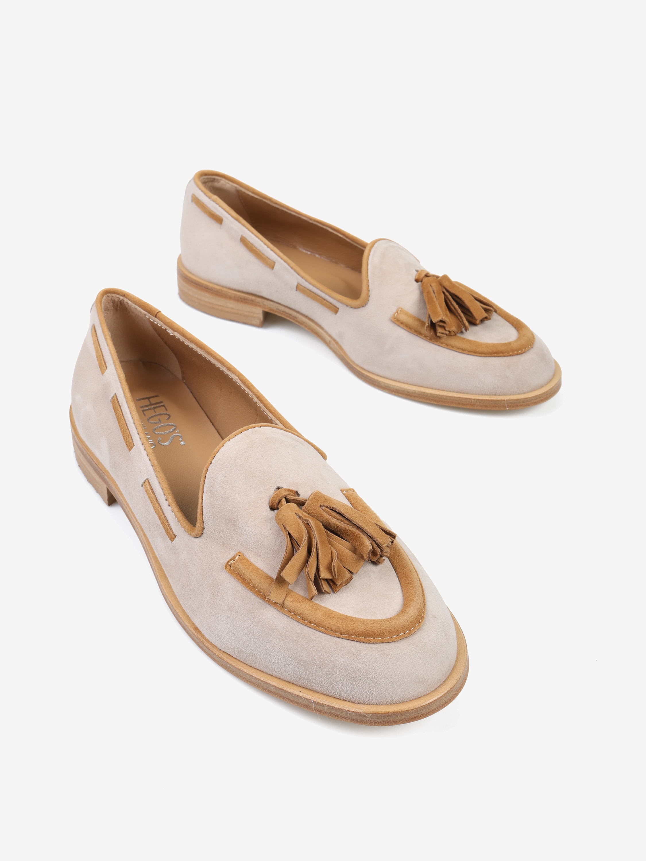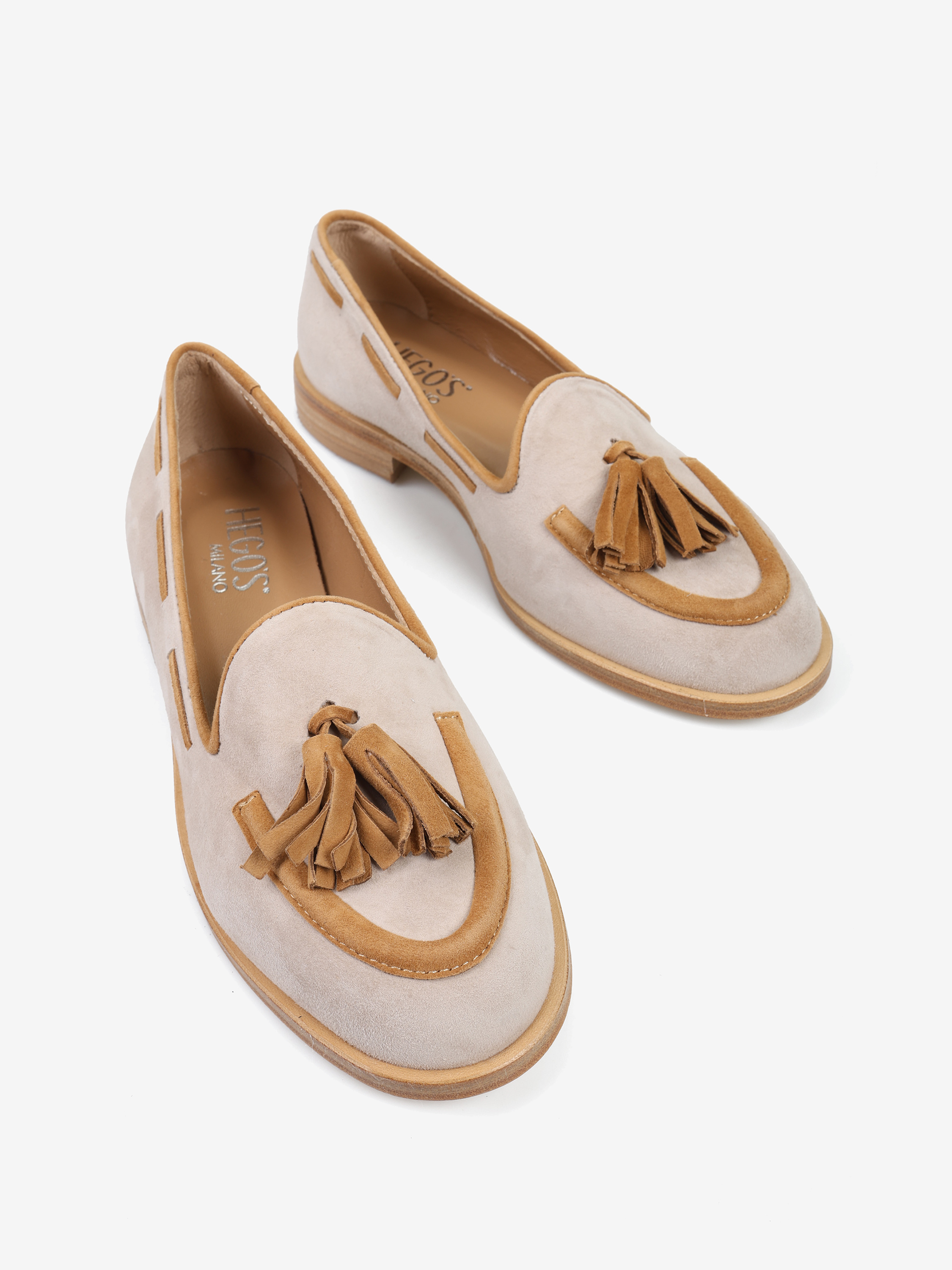 Zamszowe, beżowo-rude mokasyny z ozdobnym frędzlem.