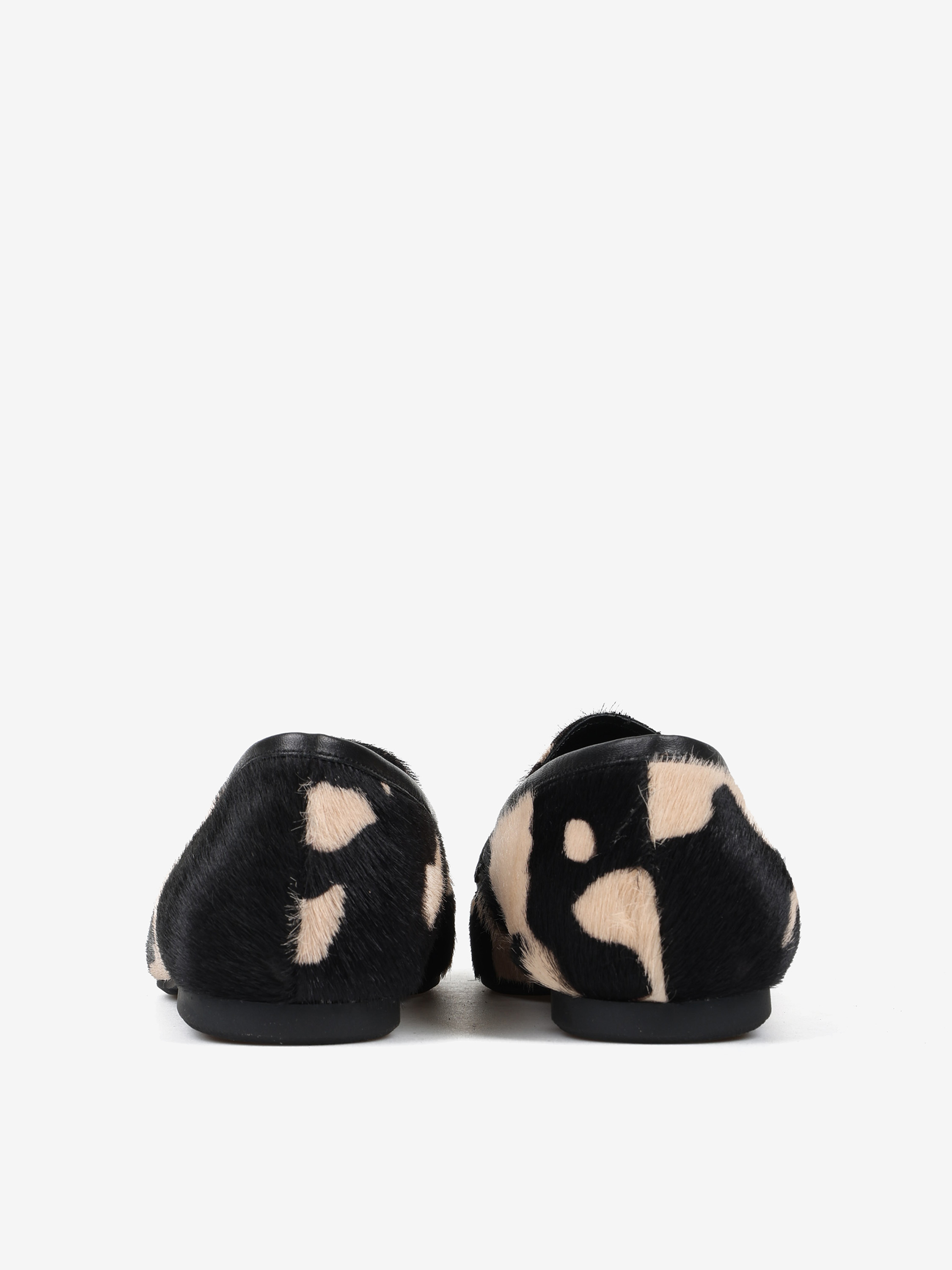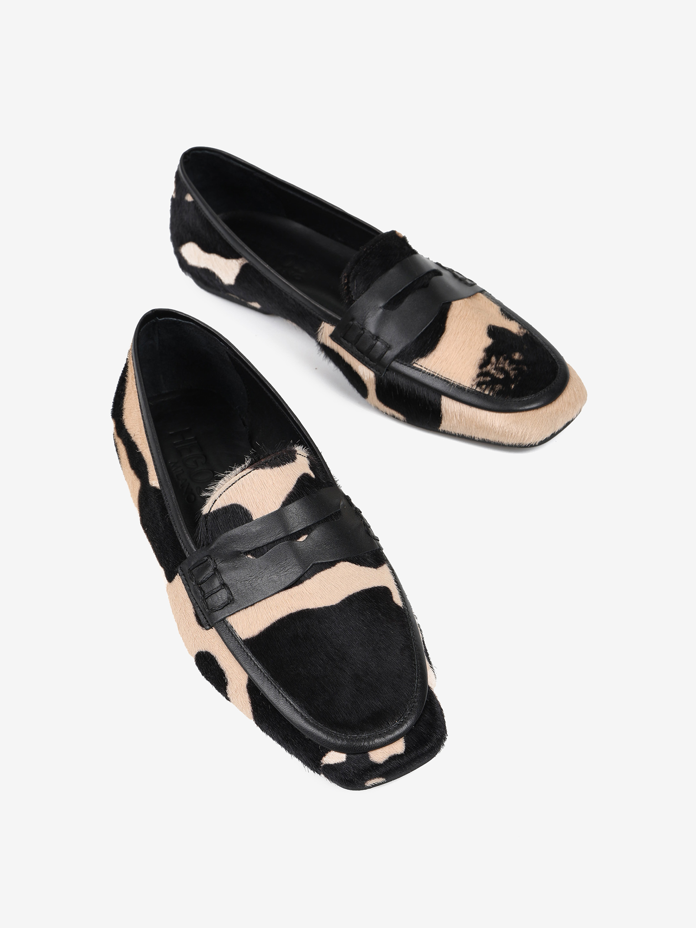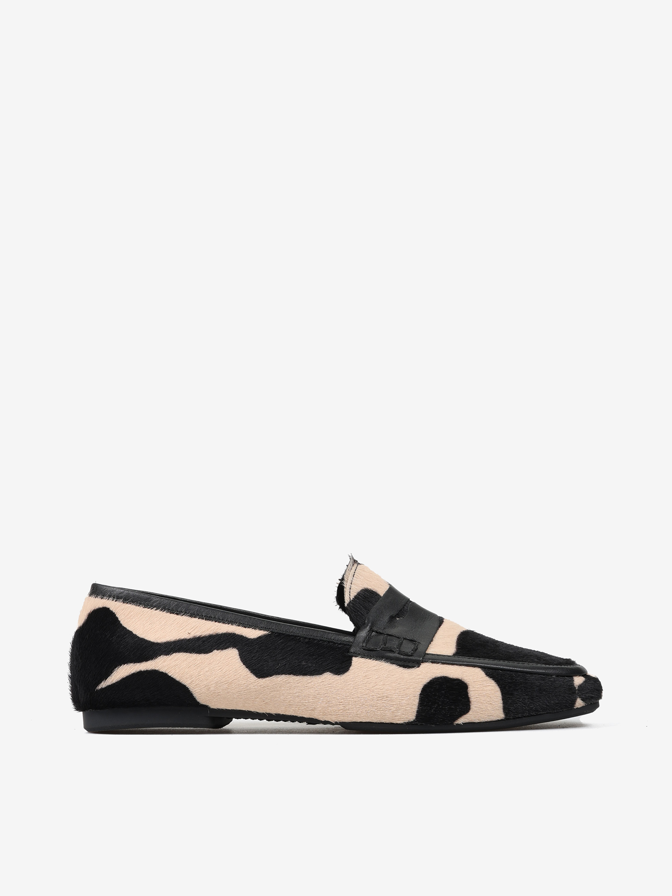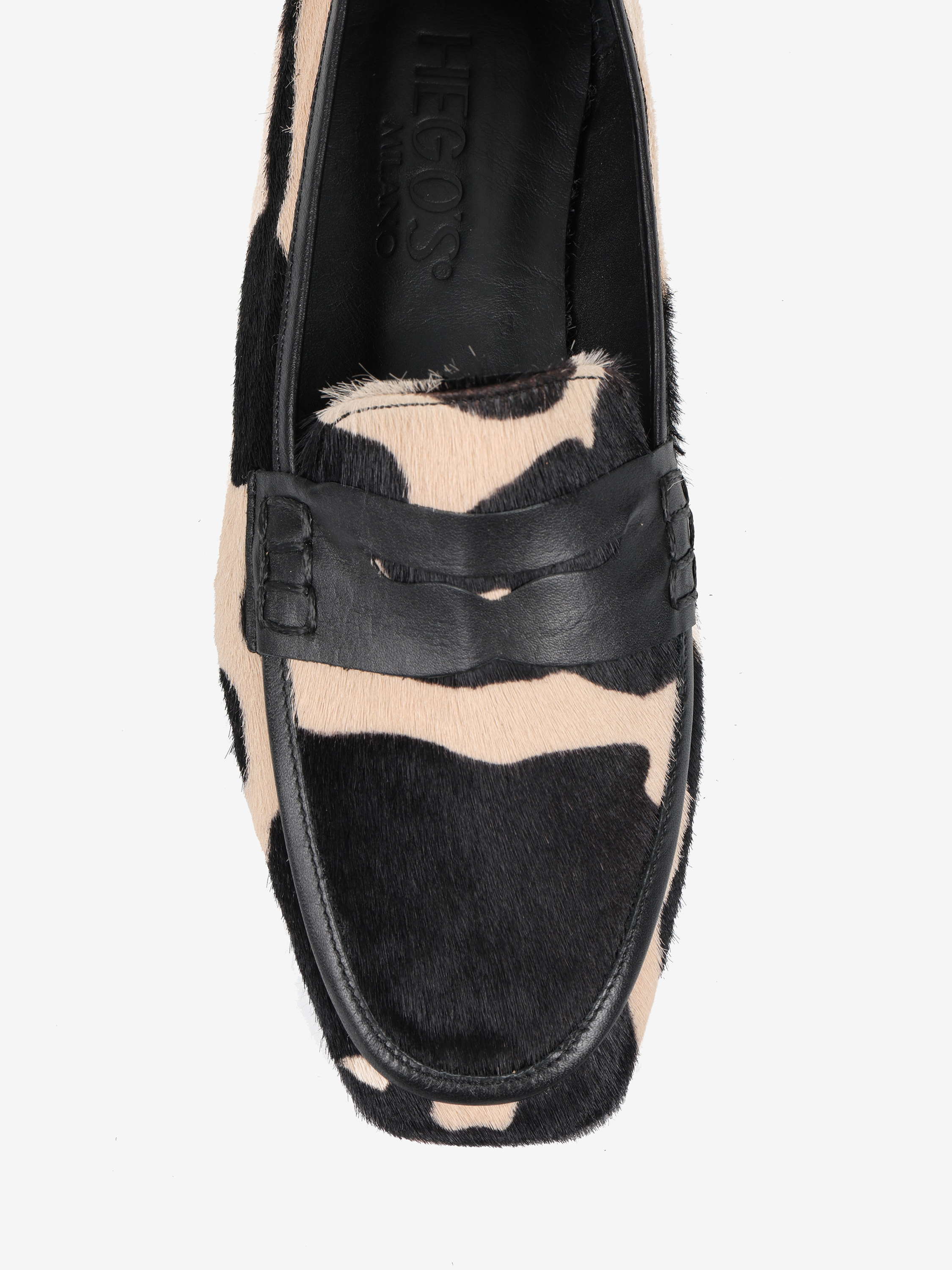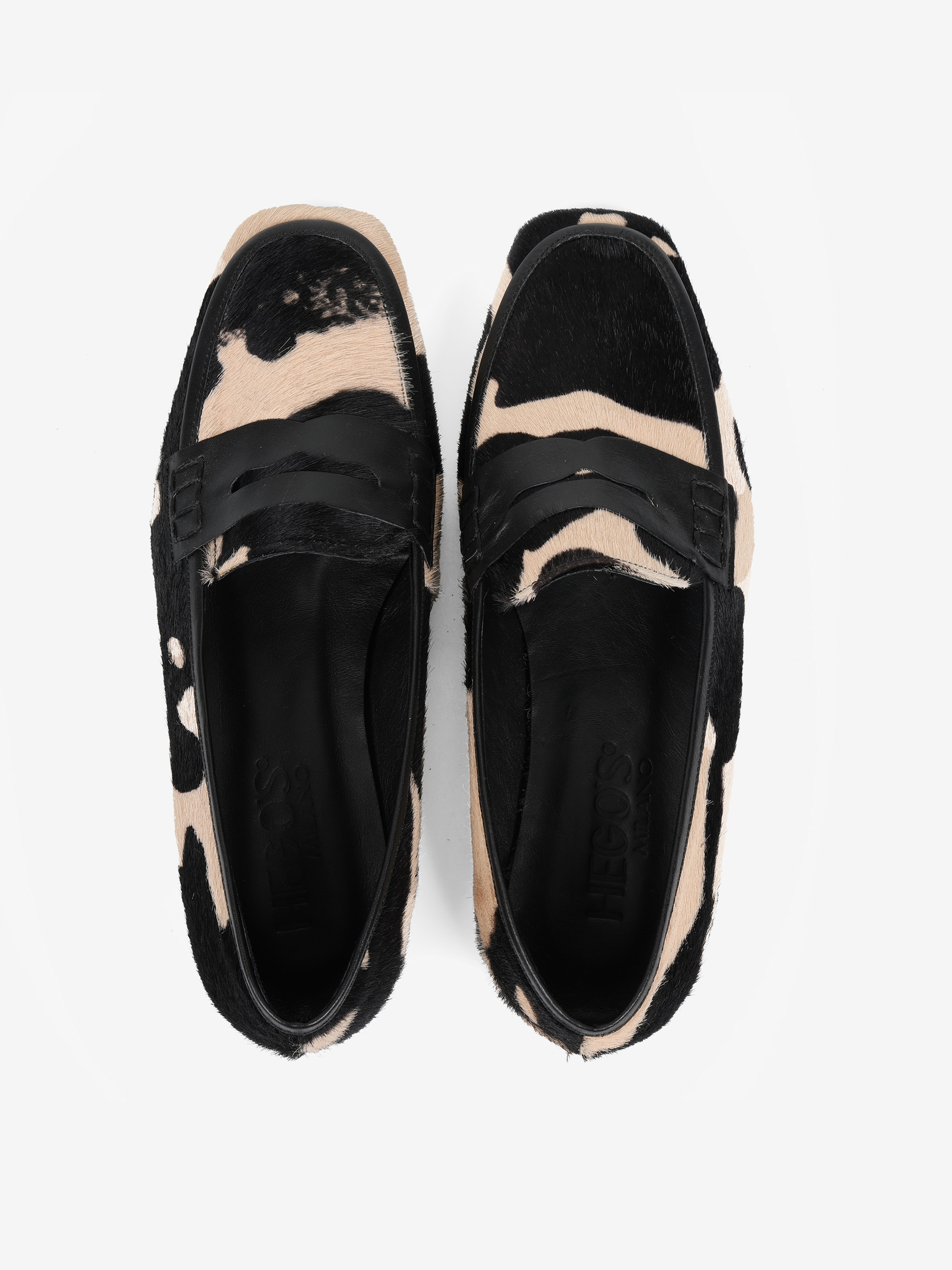 Mokasyny COW PRINT, wykonane ze skóry z włosiem w beżowo-czarne łaty. Klasyczna patka z czarnej skóry.