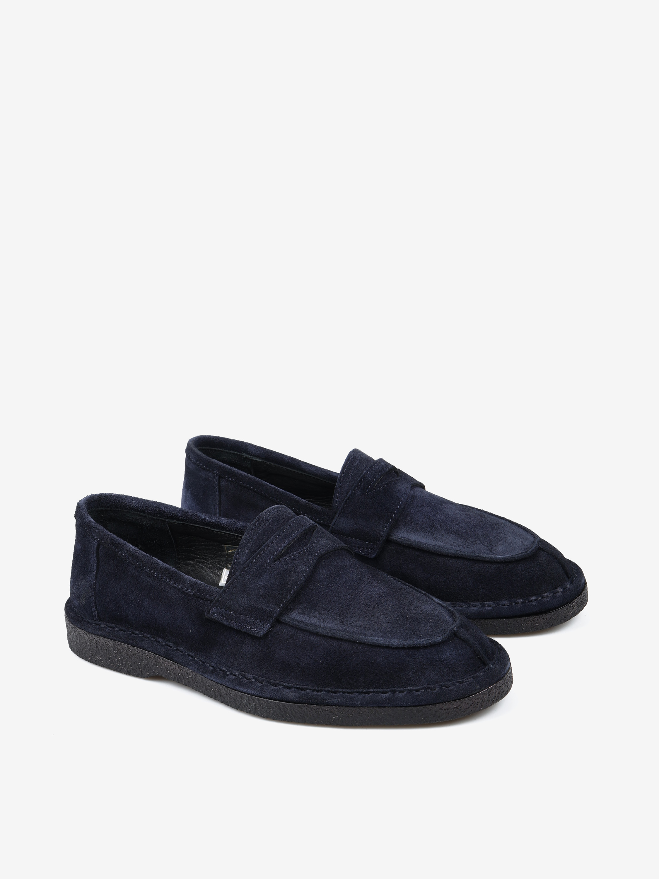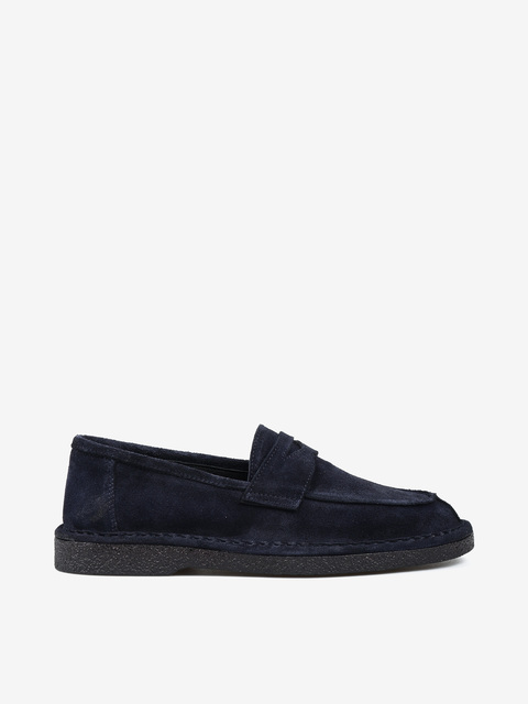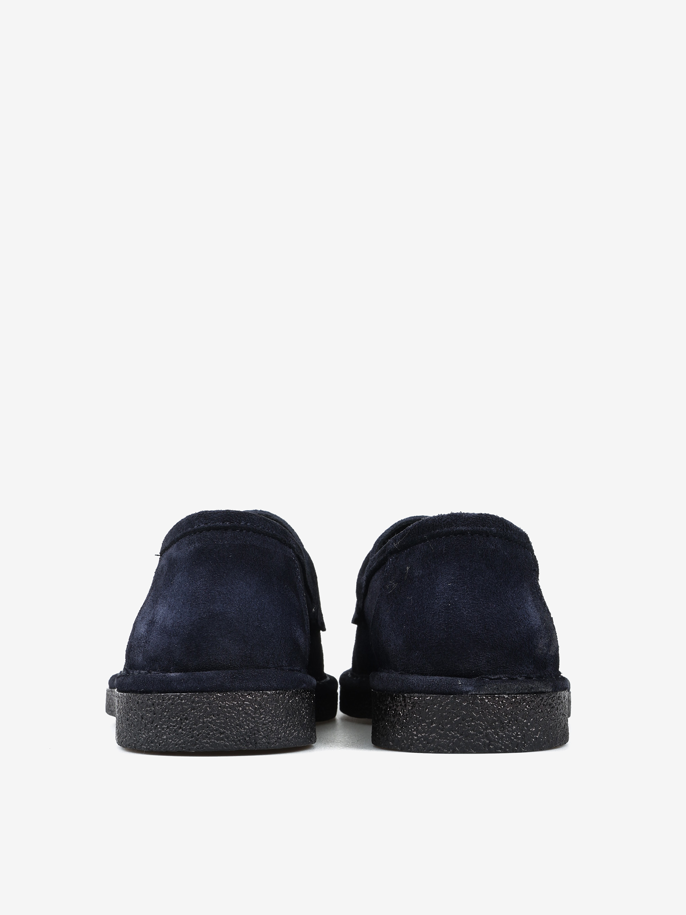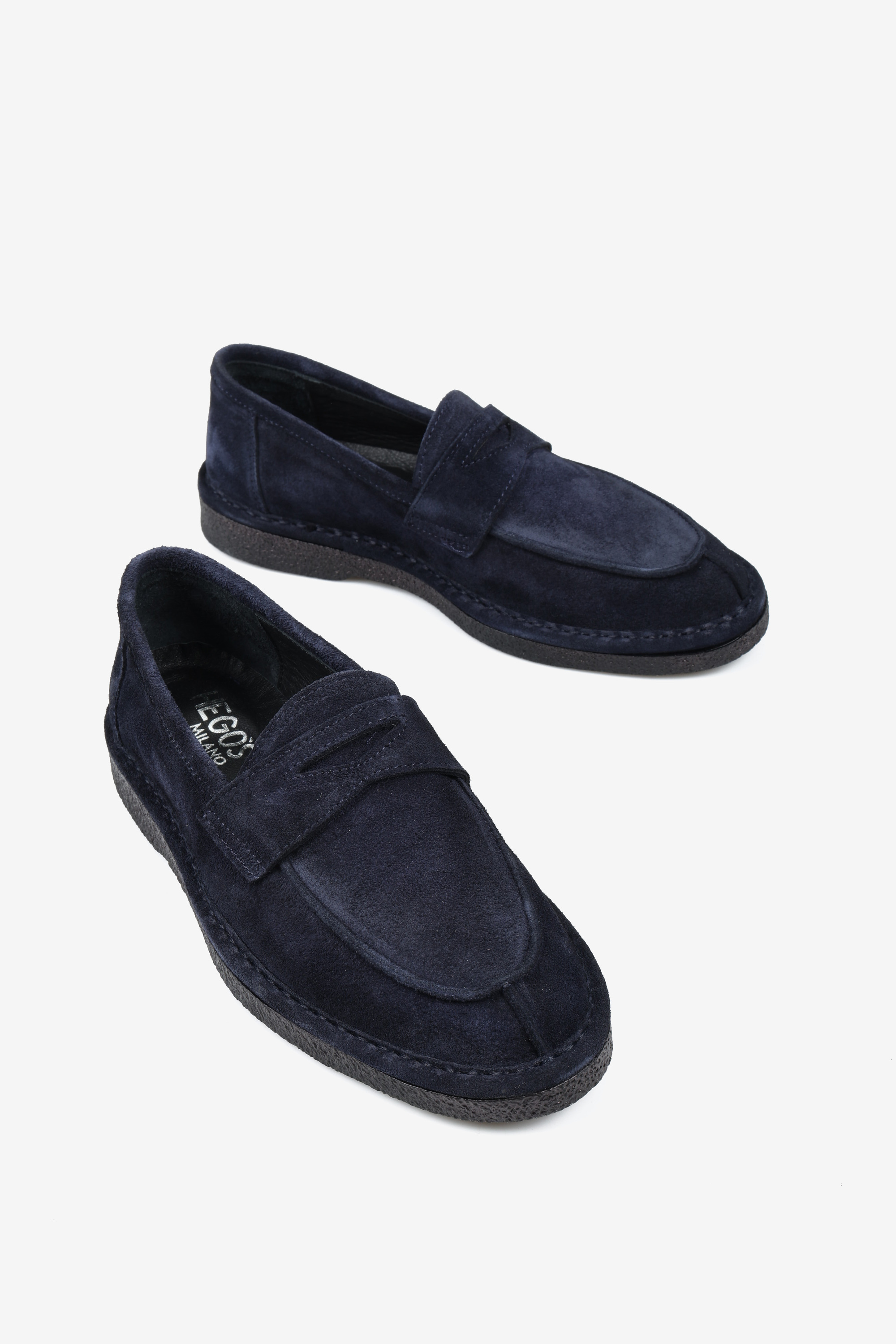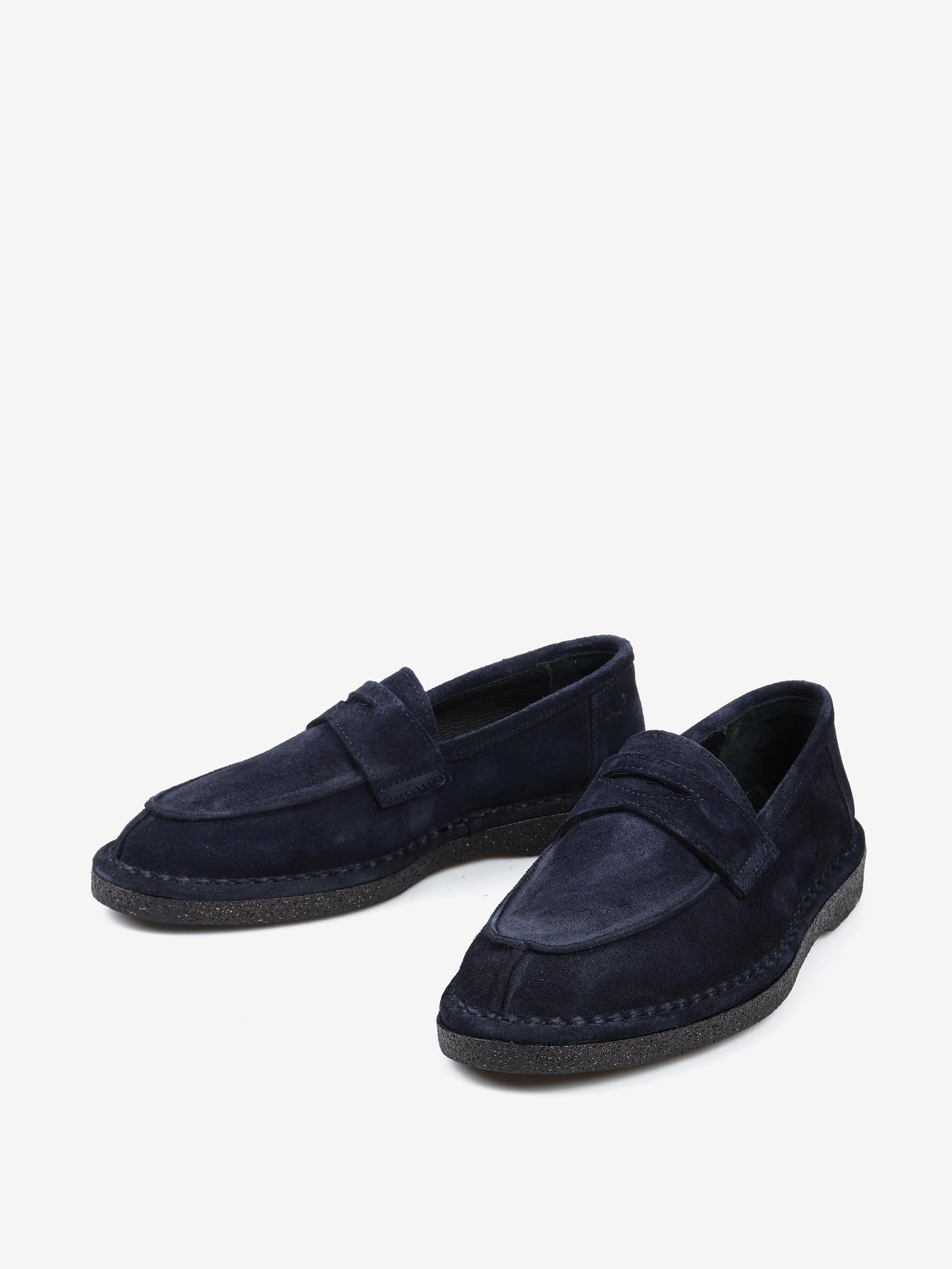 Granatowe, zamszowe mokasyny z patką na gumowej podeszwie.