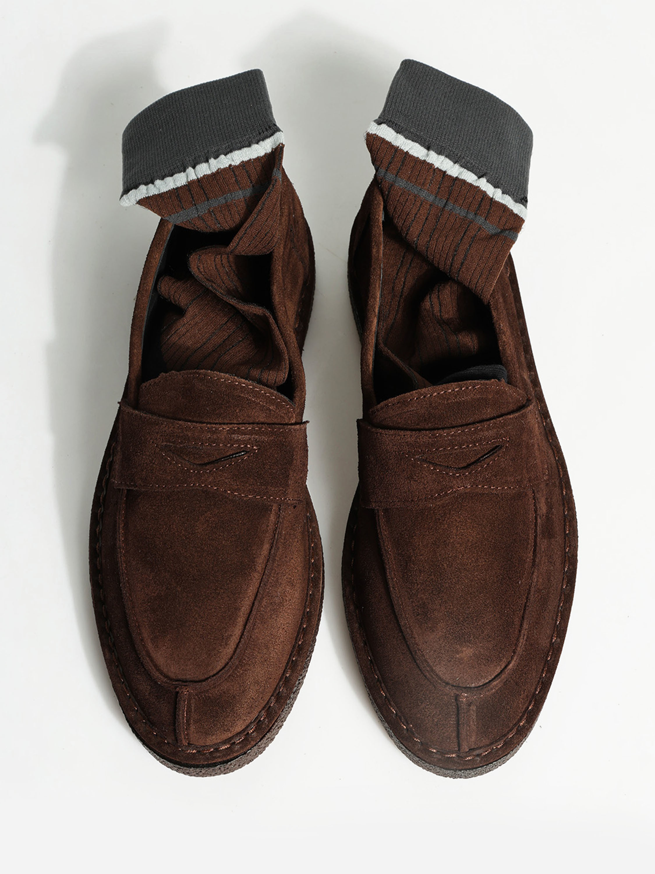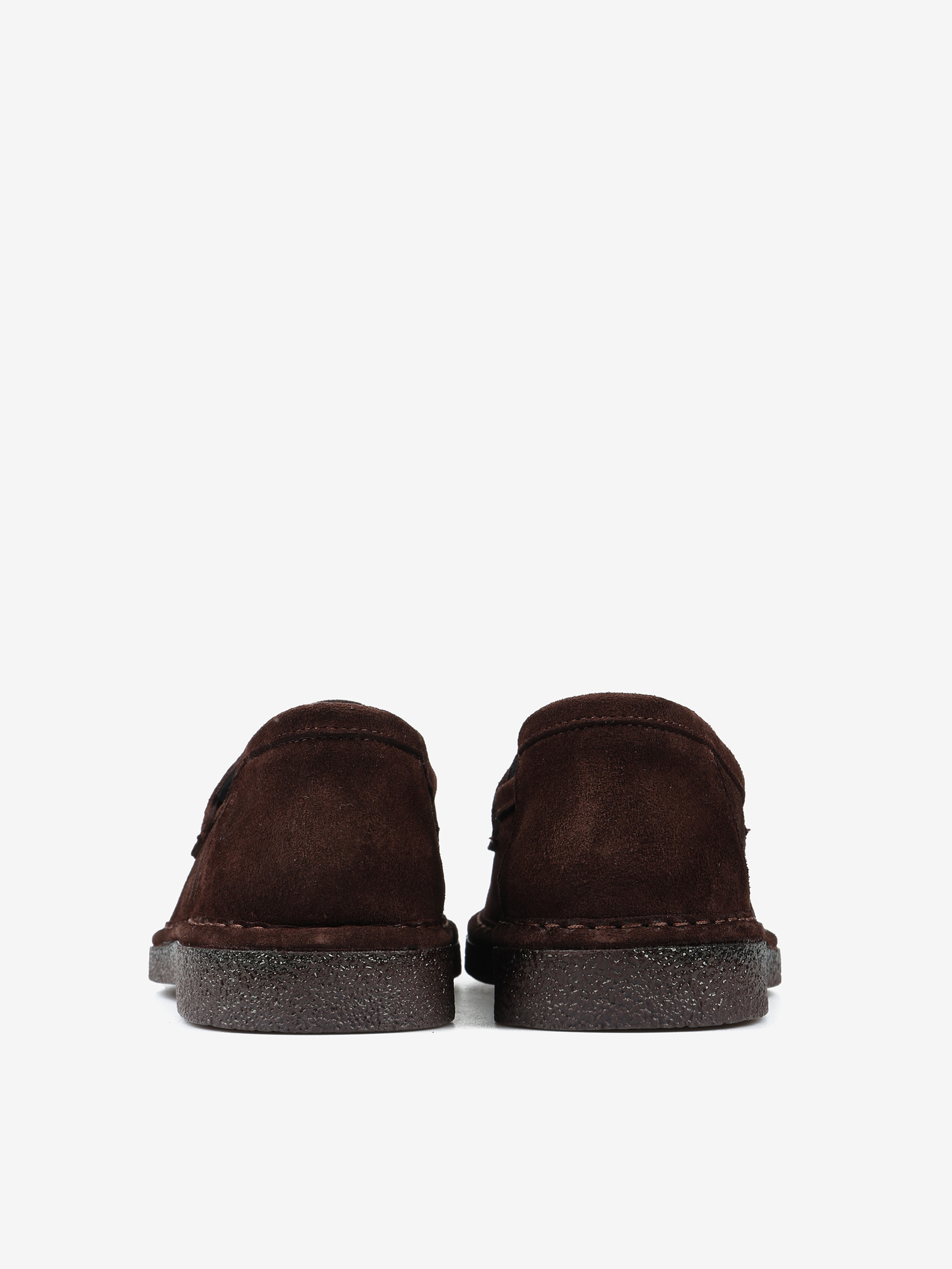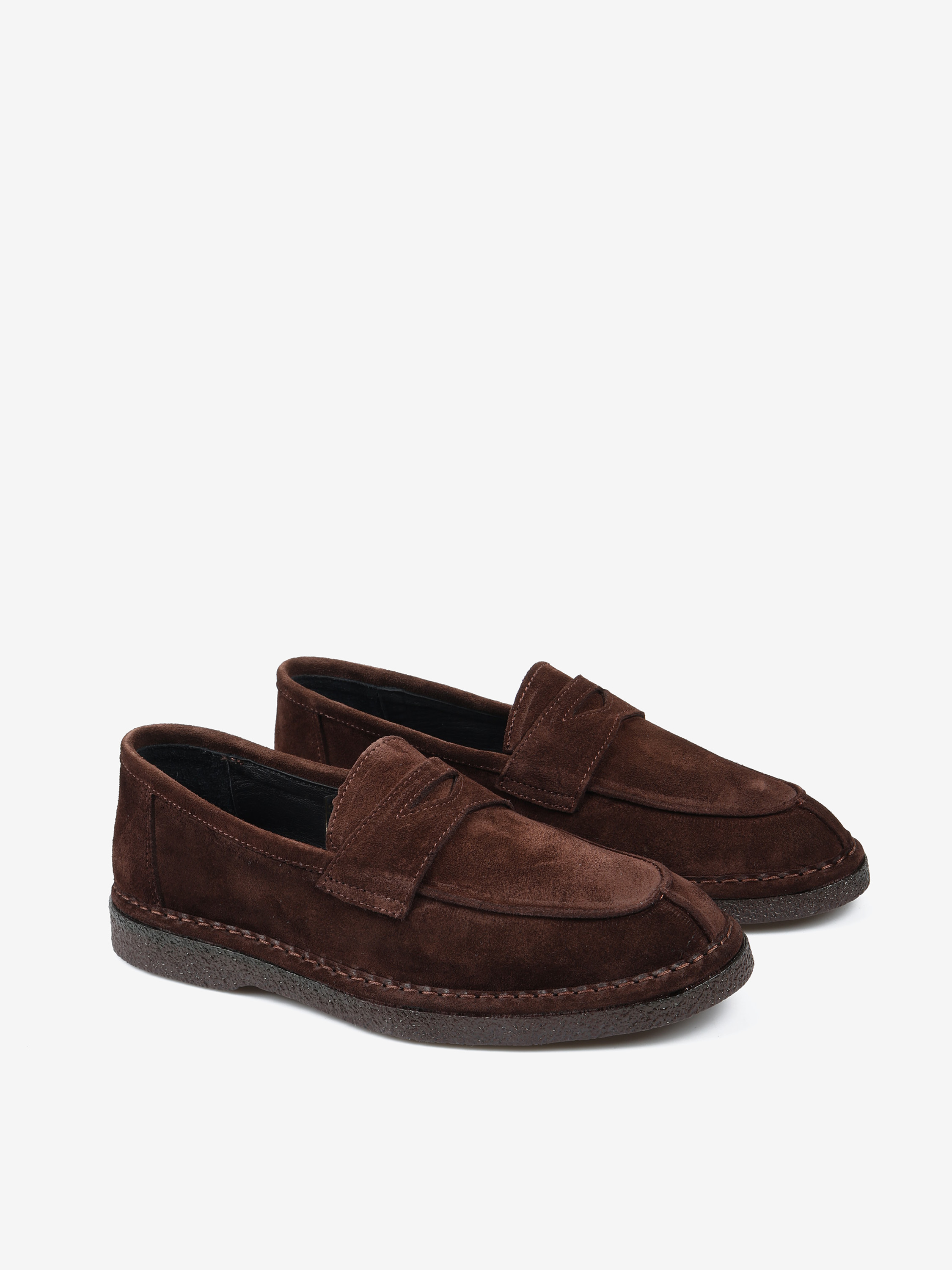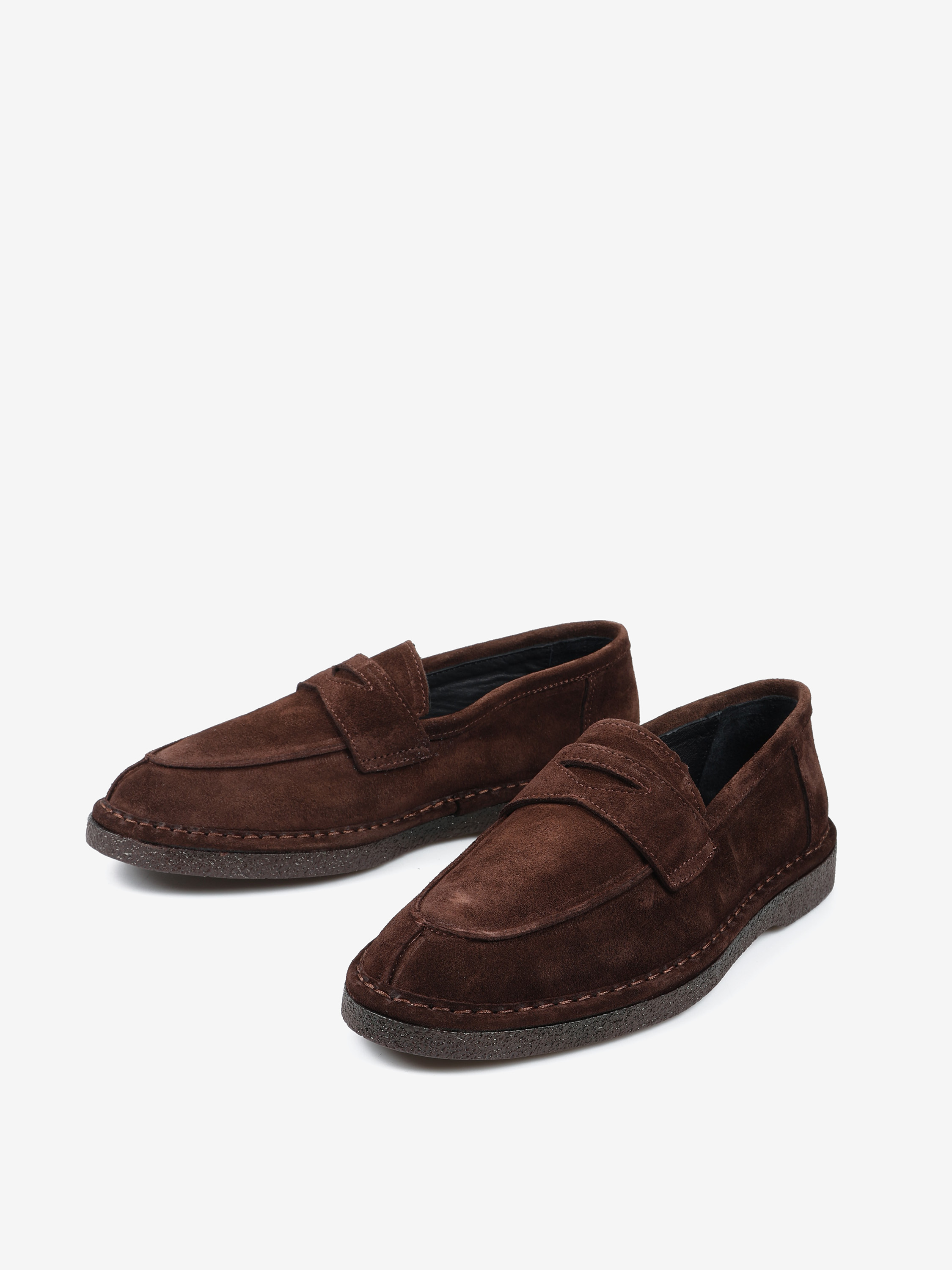 Brązowe, zamszowe mokasyny z patką na gumowej podeszwie.