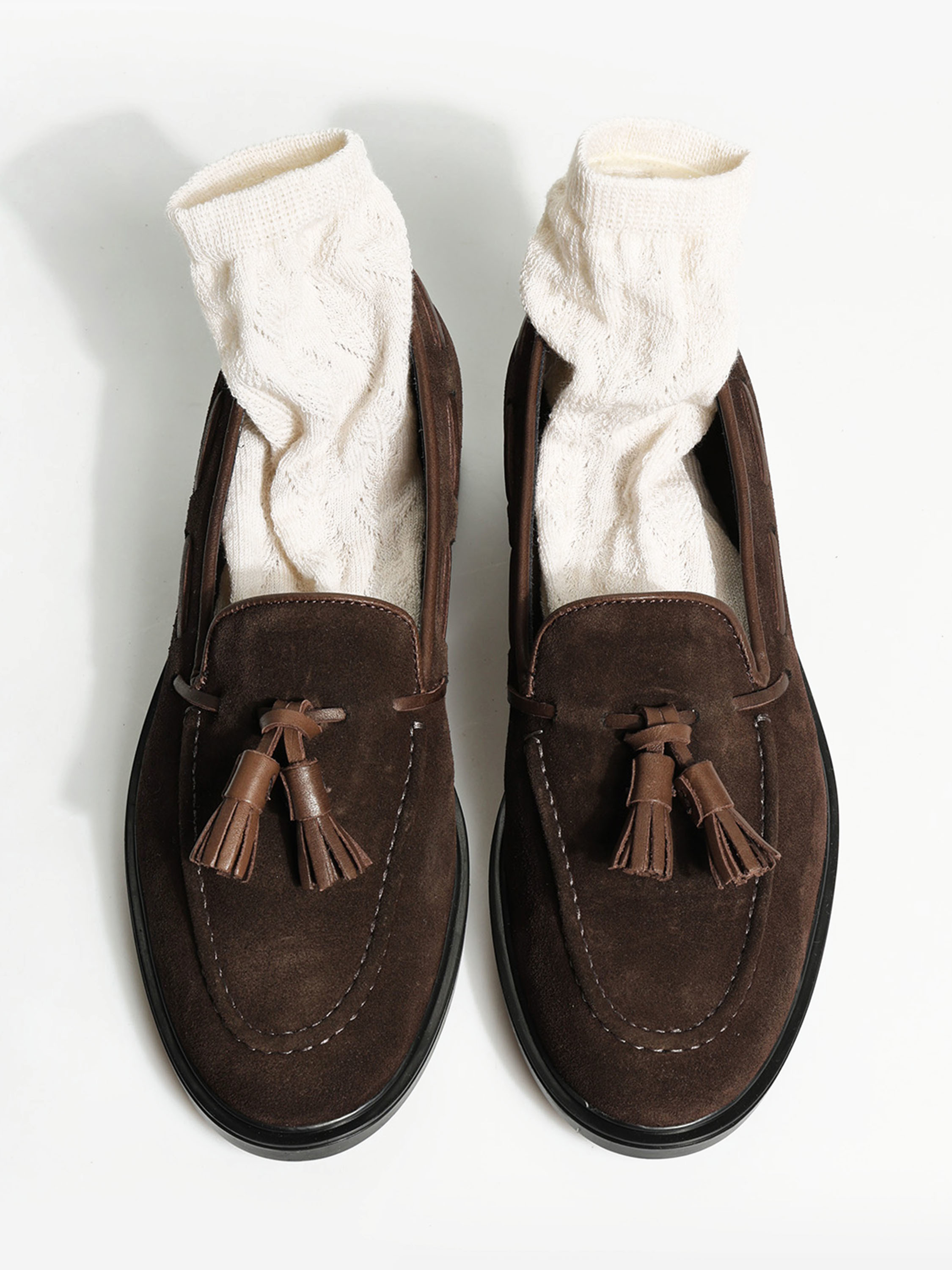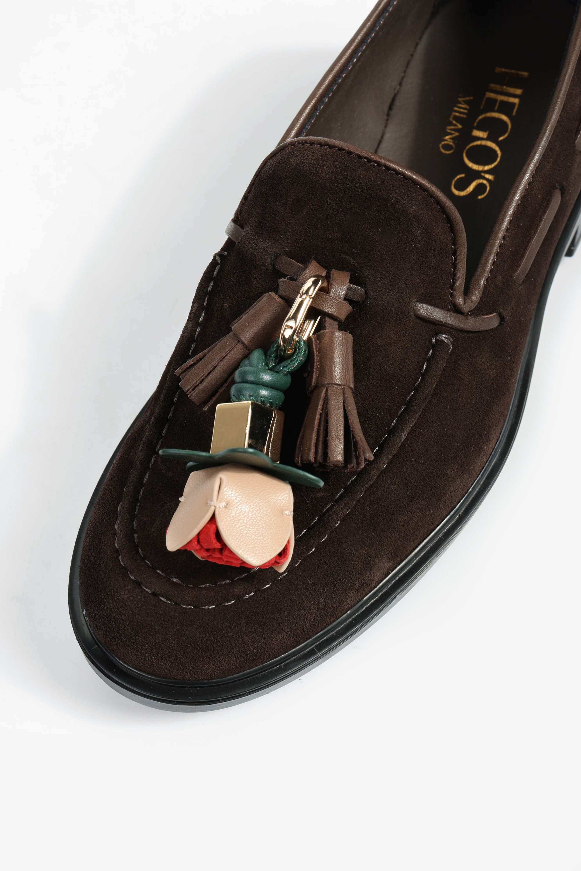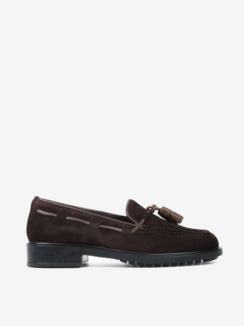 Zamszowe mokasyny z ozdobnym rzemykiem i frędzlami. Przywieszka dostępna oddzielnie.