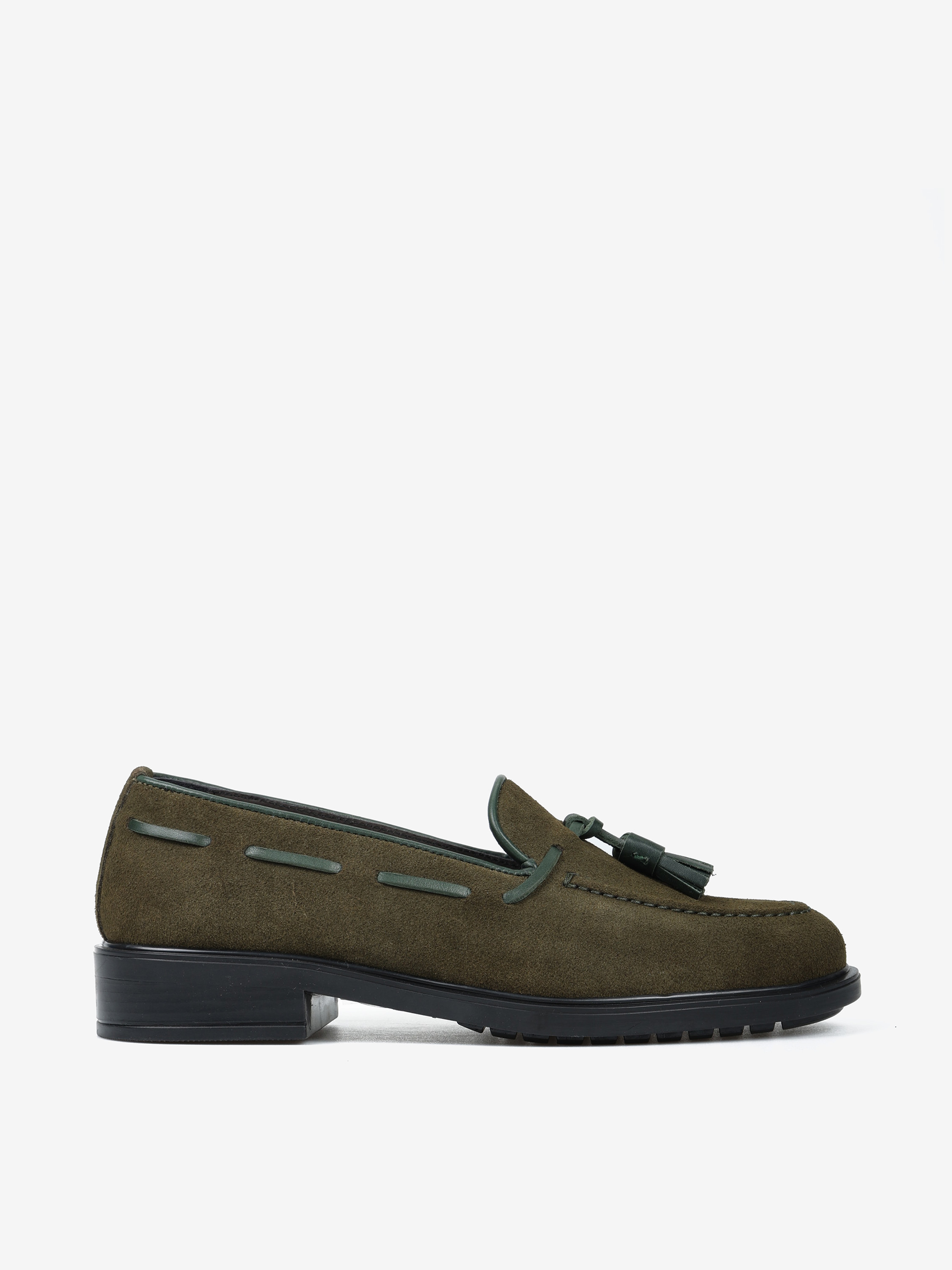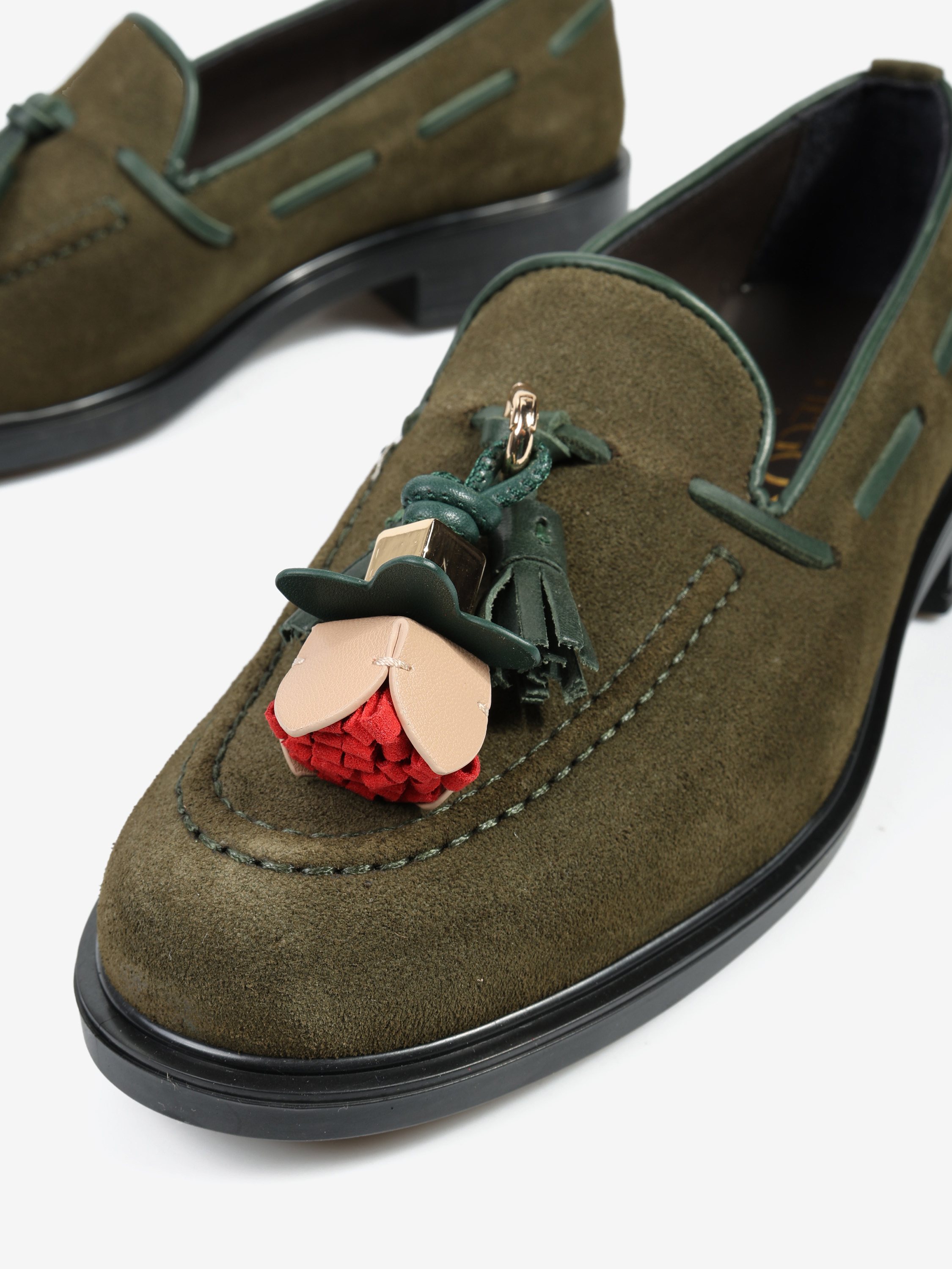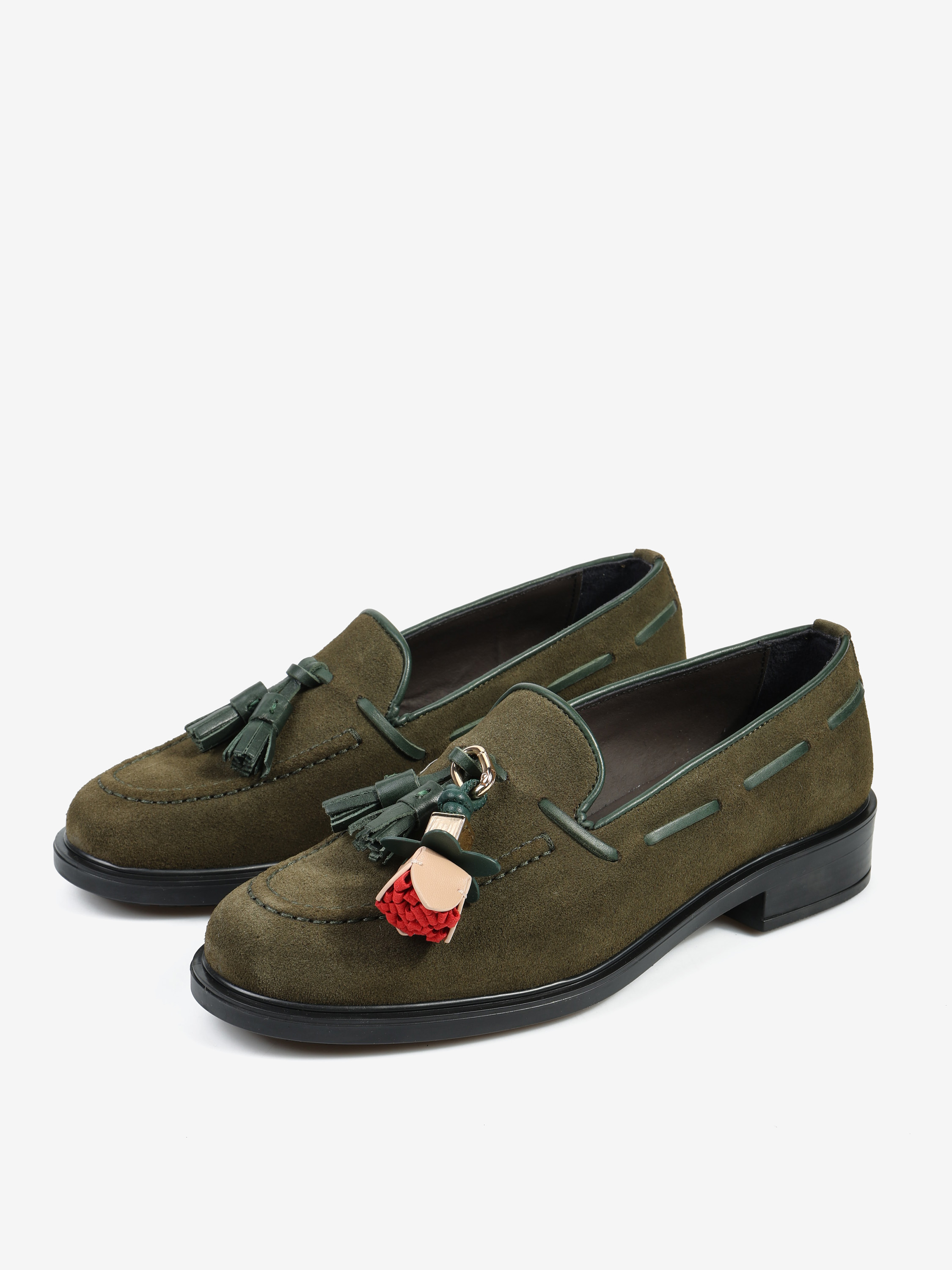 Zamszowe mokasyny z ozdobnym rzemykiem i frędzlami. Przywieszka dostępna oddzielnie.