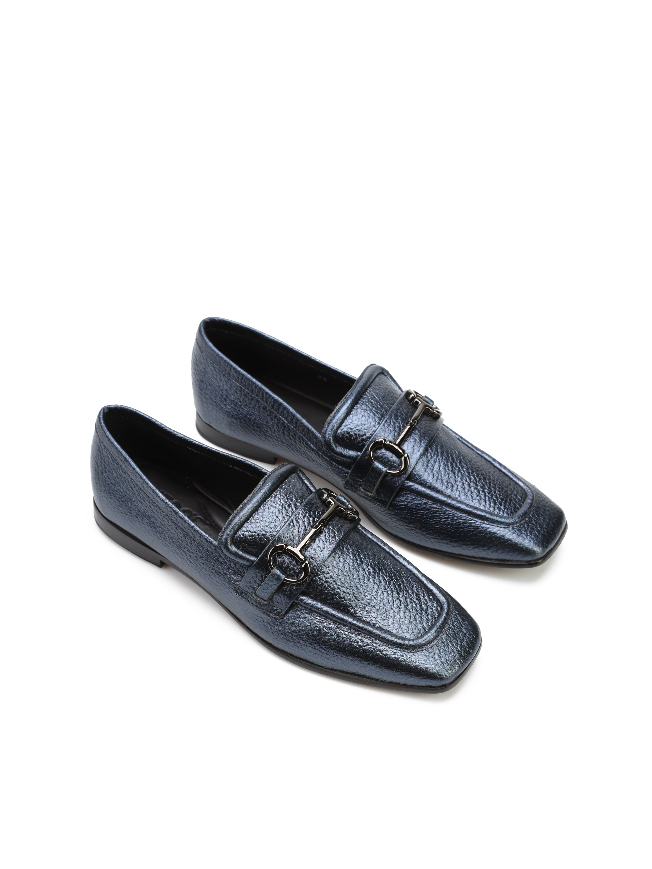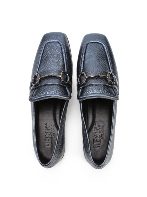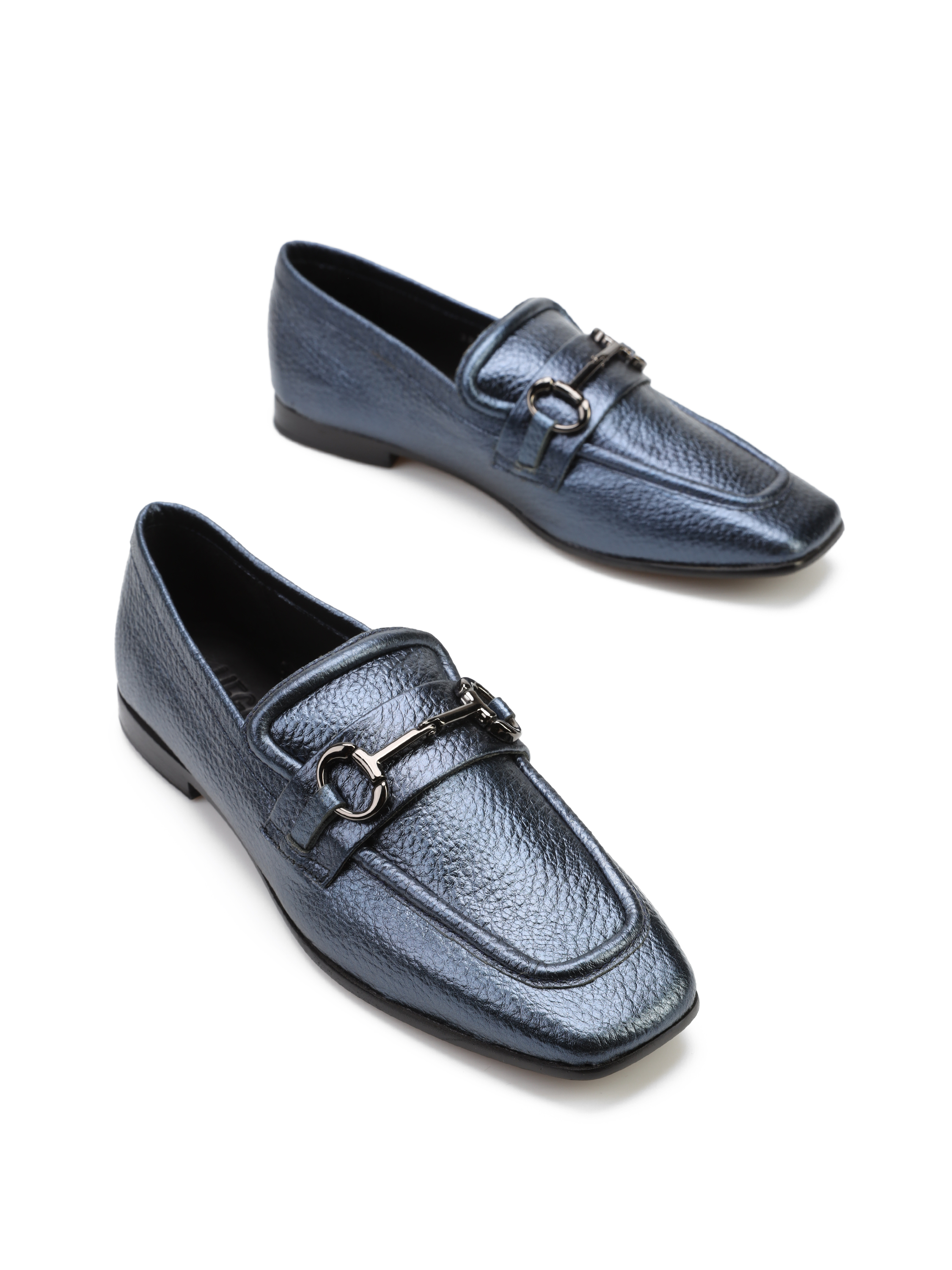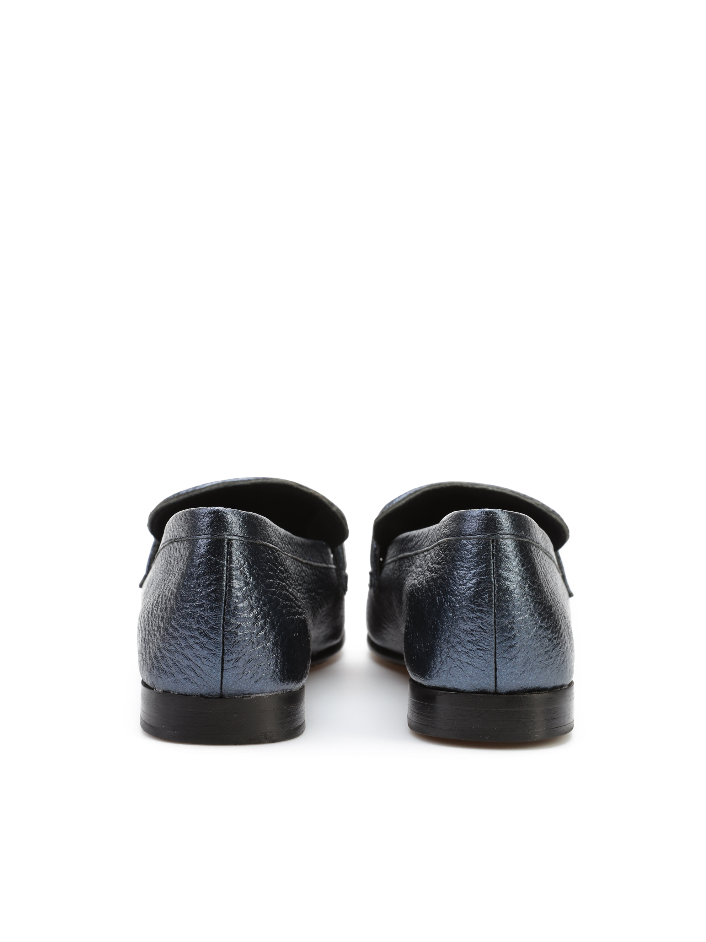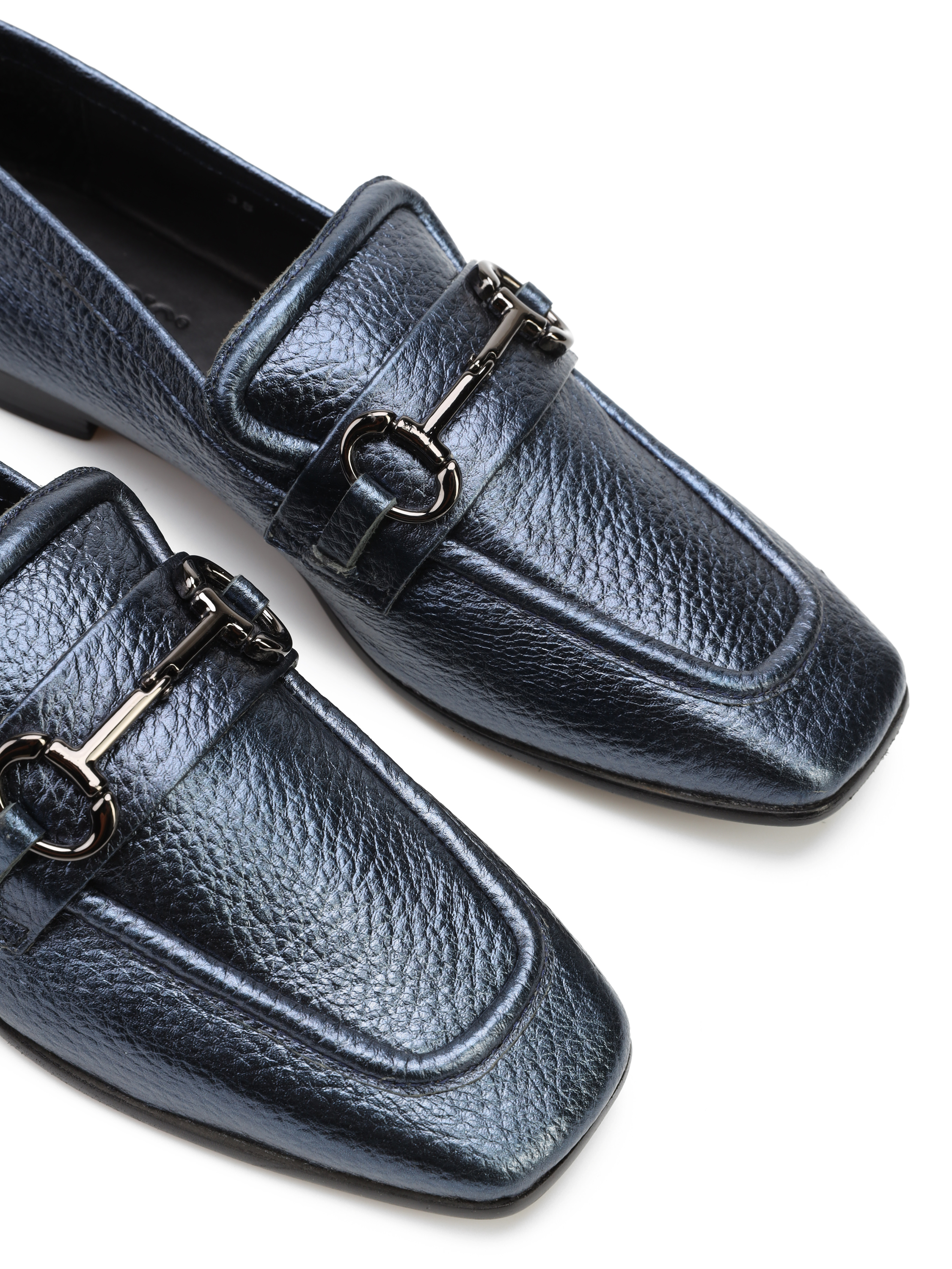 Mokasyny na płaskim obcasie to Trend nie tylko tego sezonu. Włoskie mokasyny wykonane są z metalizowanej, naturalnej skóry. Cholewka w granatowym kolorze ozdobiona została metalową klamrą w stylu Gucci. Model z kwadratowym noskiem posiada wysoki język charakterstyczny dla fasonu lordsy.