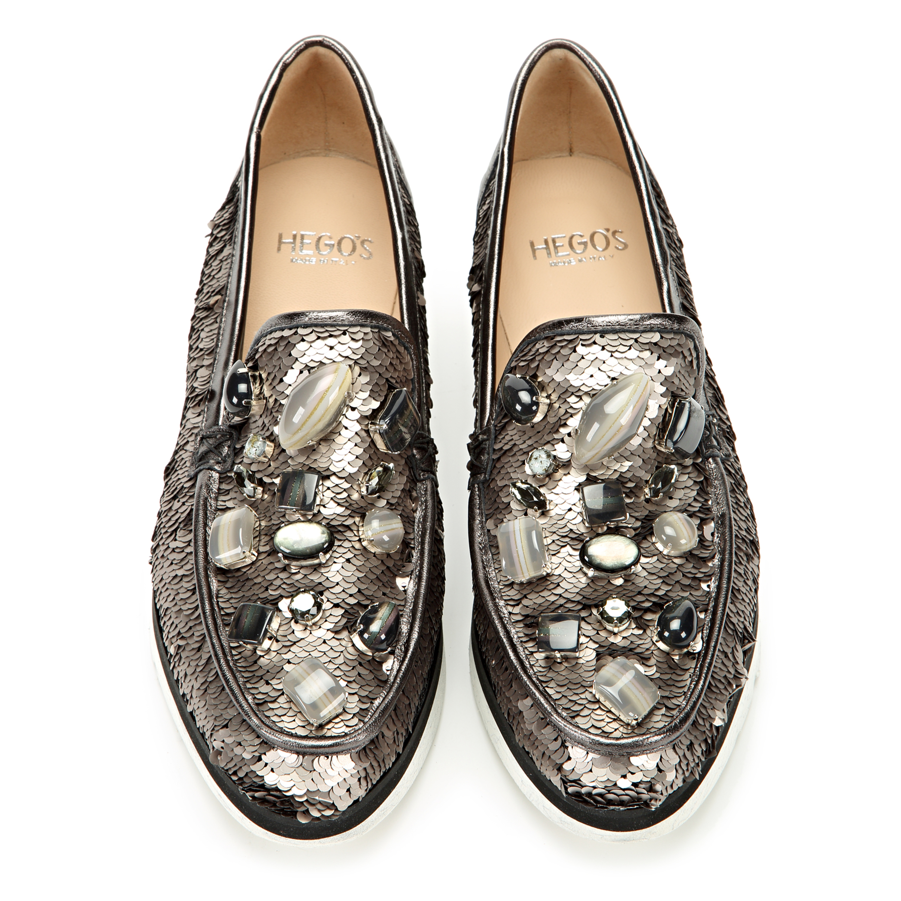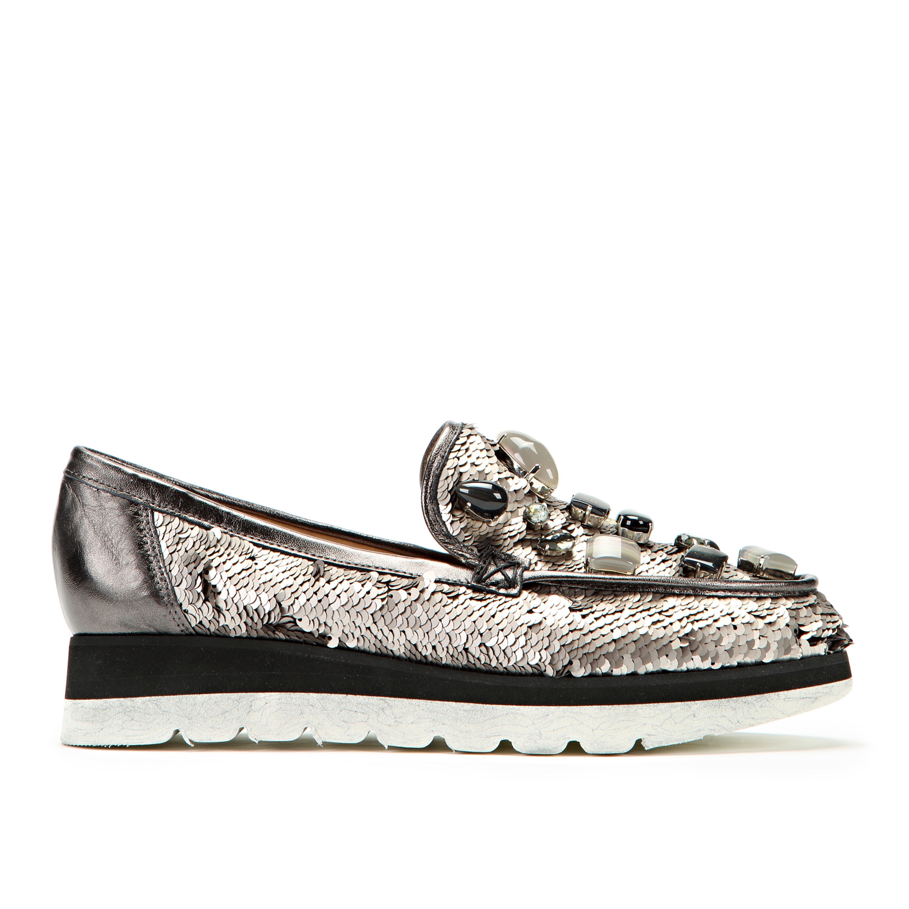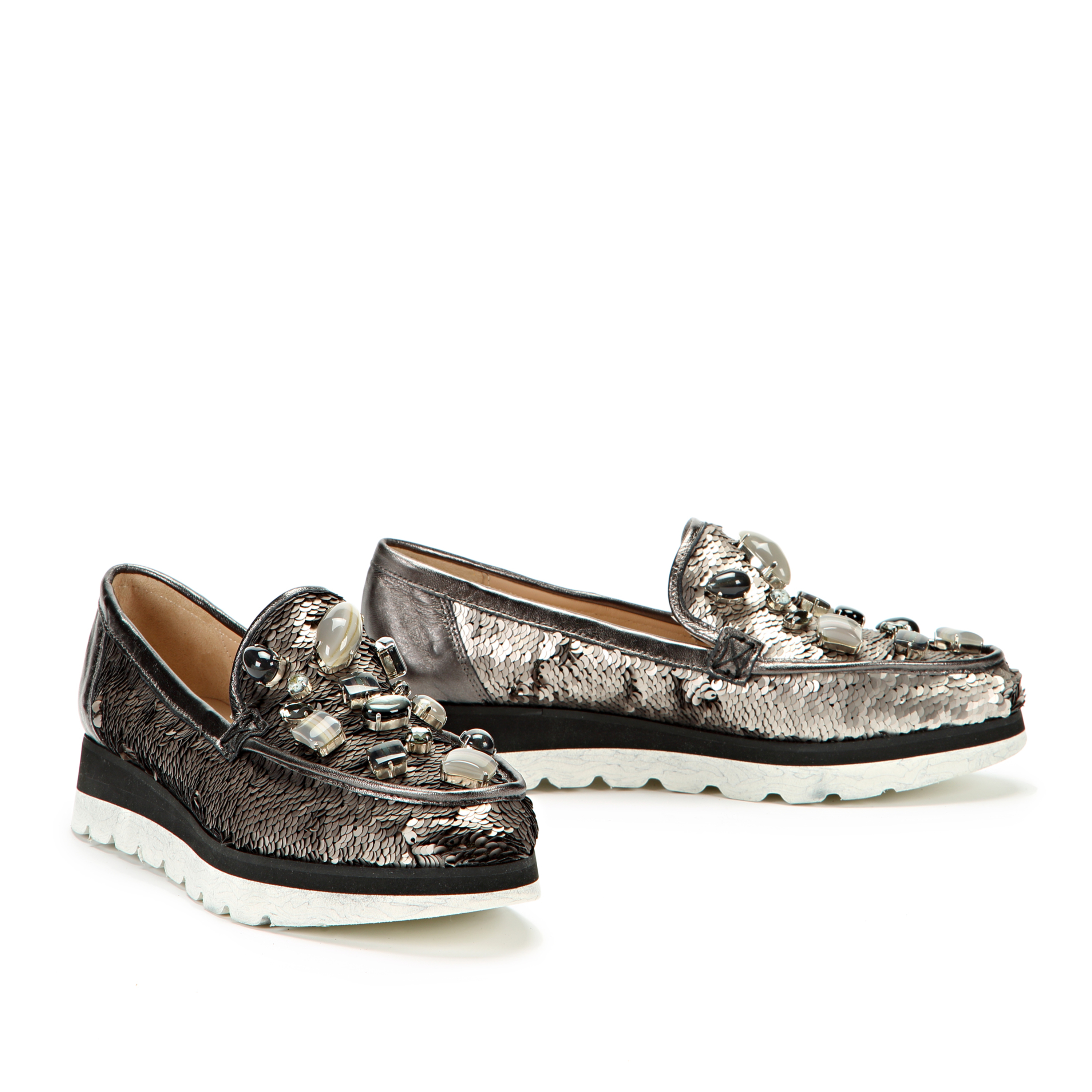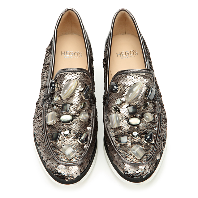 Niezwykle szykowne mokasyny wysadzane kamieniami w odcieniach szarości i czerni,wykonane z materiału w cekiny w kolorze szarym,osadzone na lekkiej podeszwie na wzór marmuru.