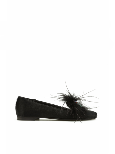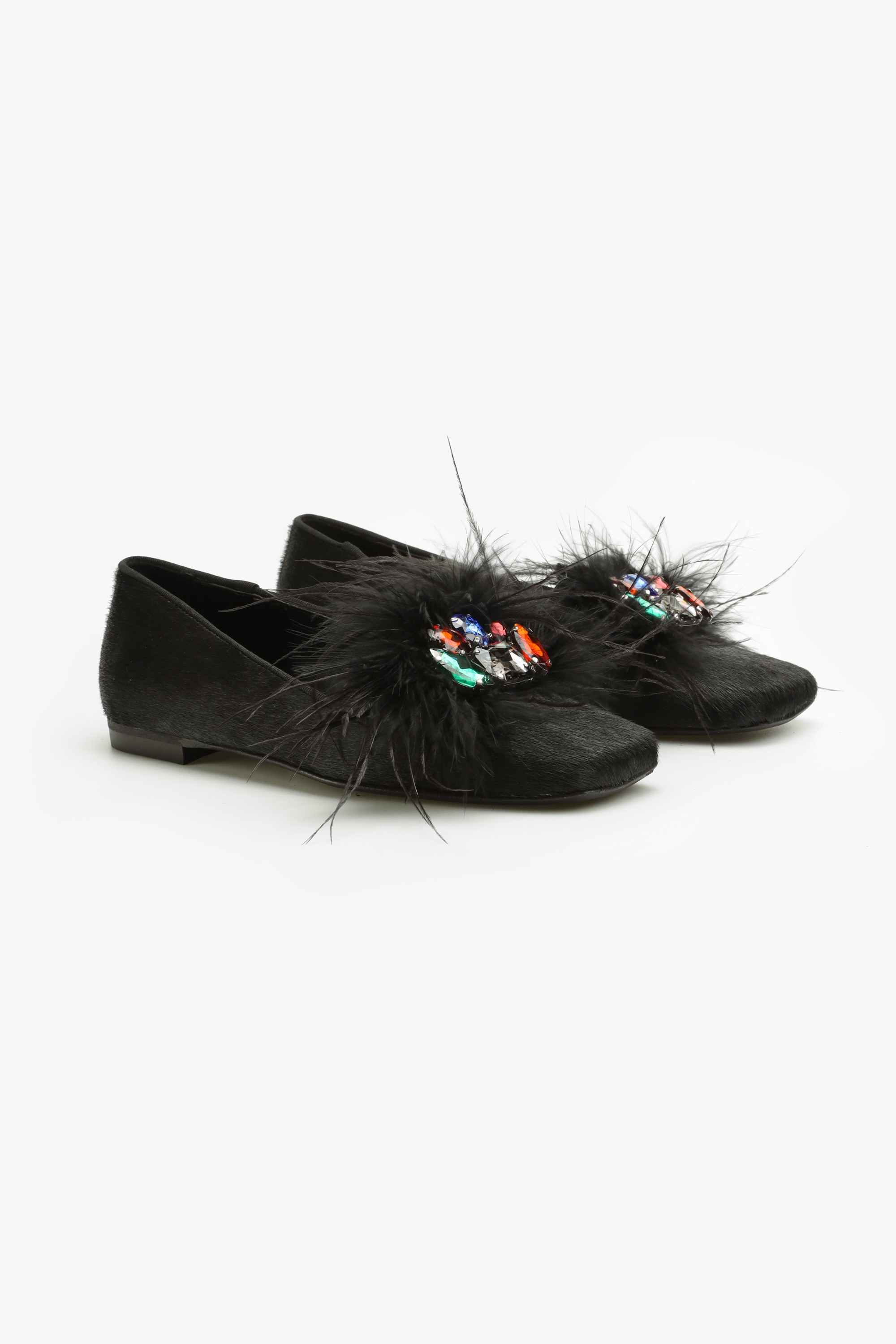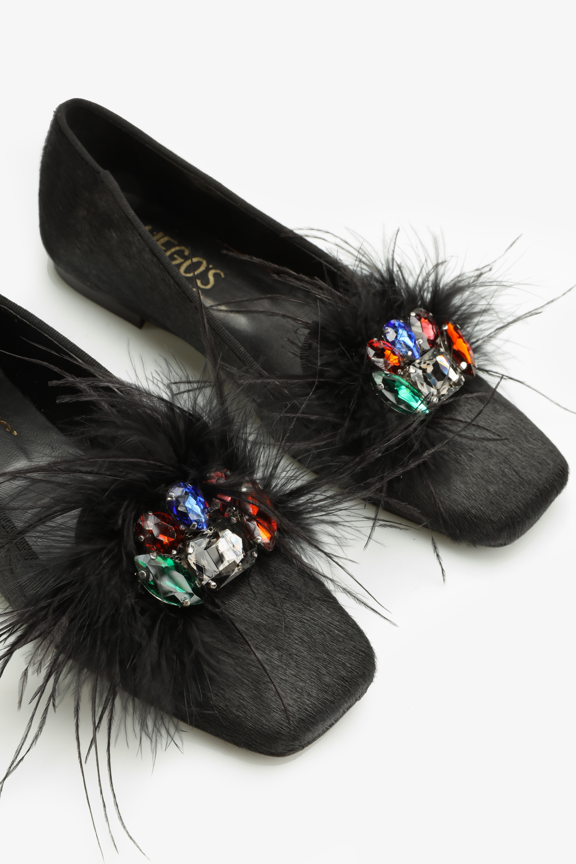 Czarna cholewka w całości wykonana jest z naturalnej skóry licowej. Wzbogacona została o biżuterynją ozdobę oraz modne w tym seoznie pióra. Płaski obcas w połączeniu ze skórzaną wkładką odpowiada za wygodę i komfort w noszeniu obuwia. Kwadratowy nosek wpisuje się w Trendy sezonu.