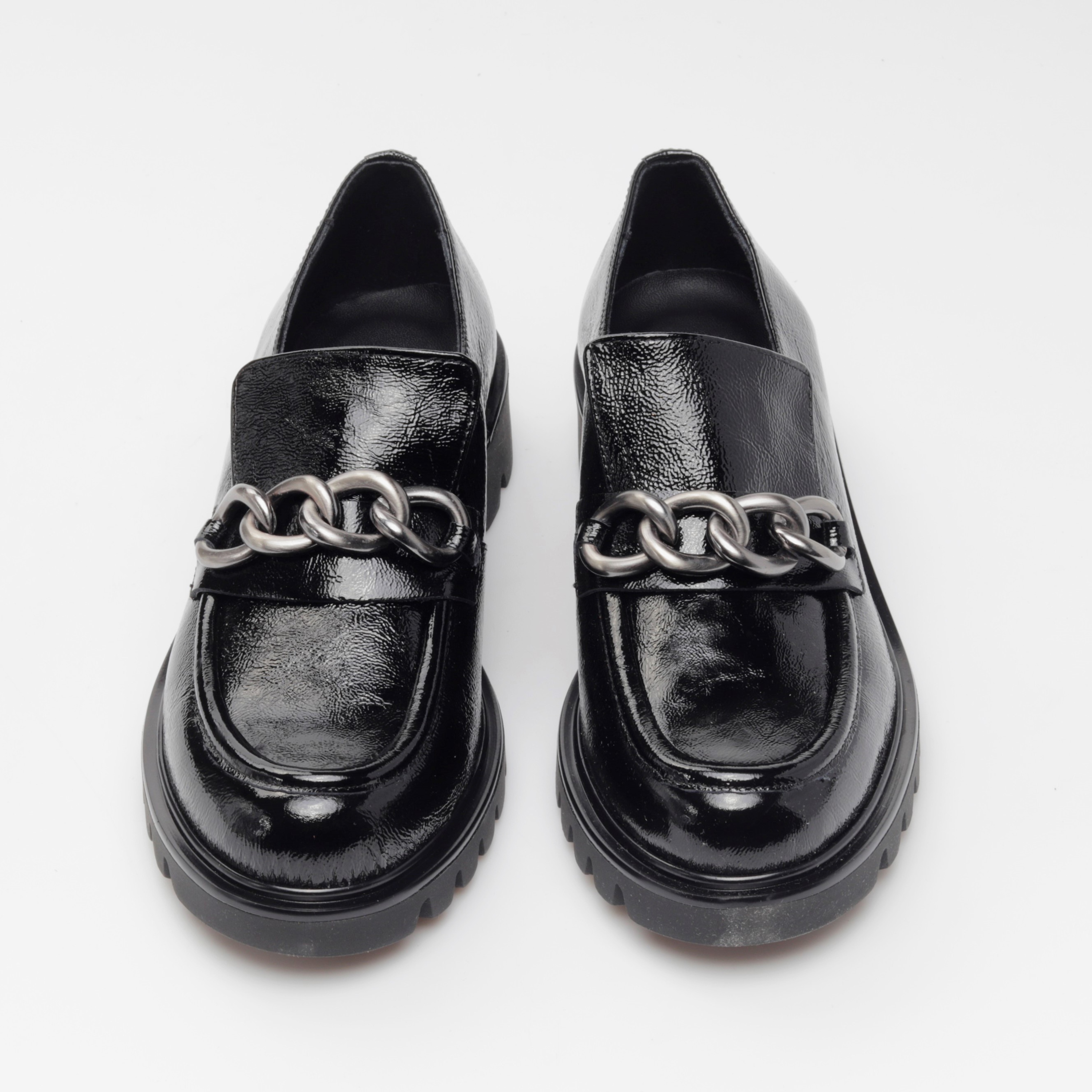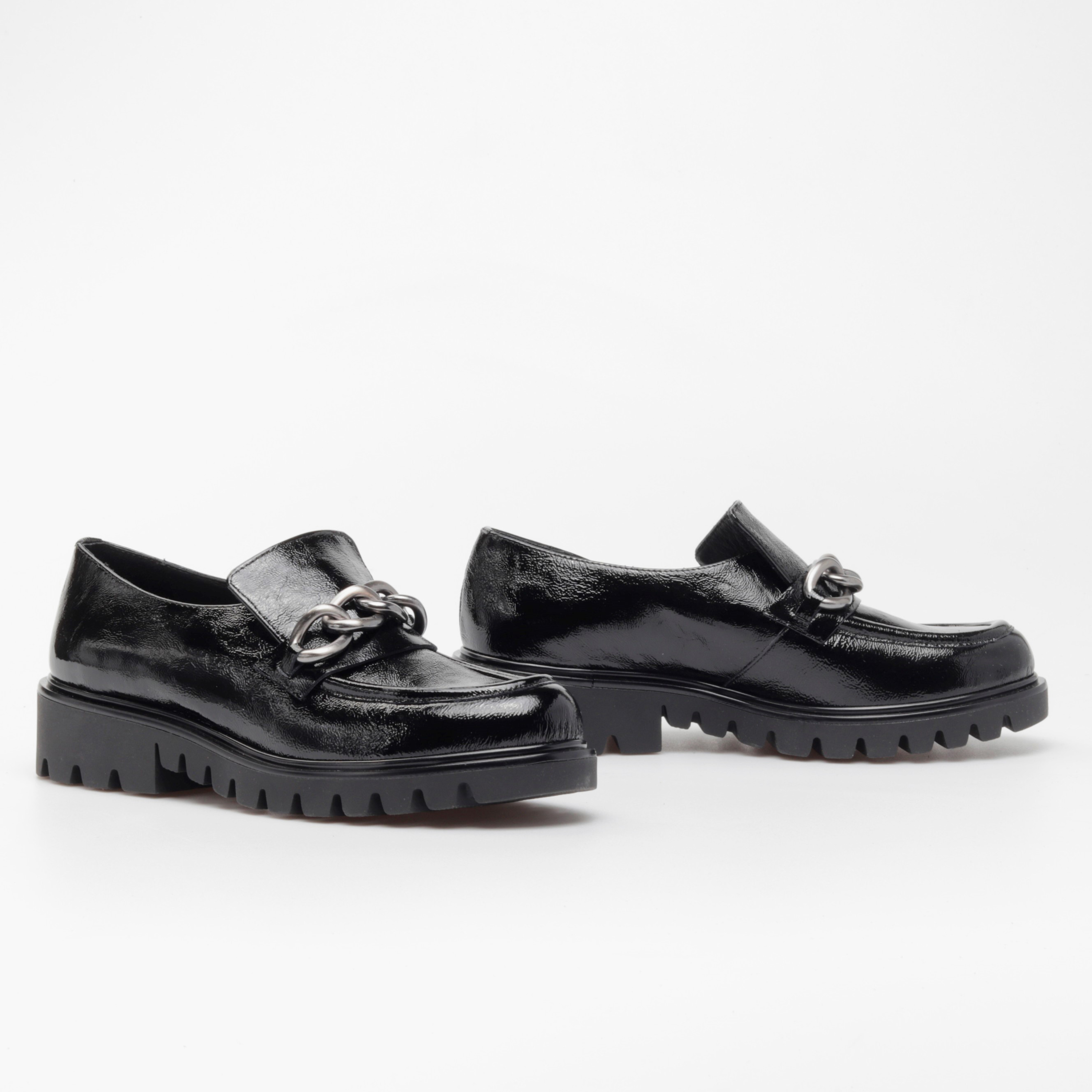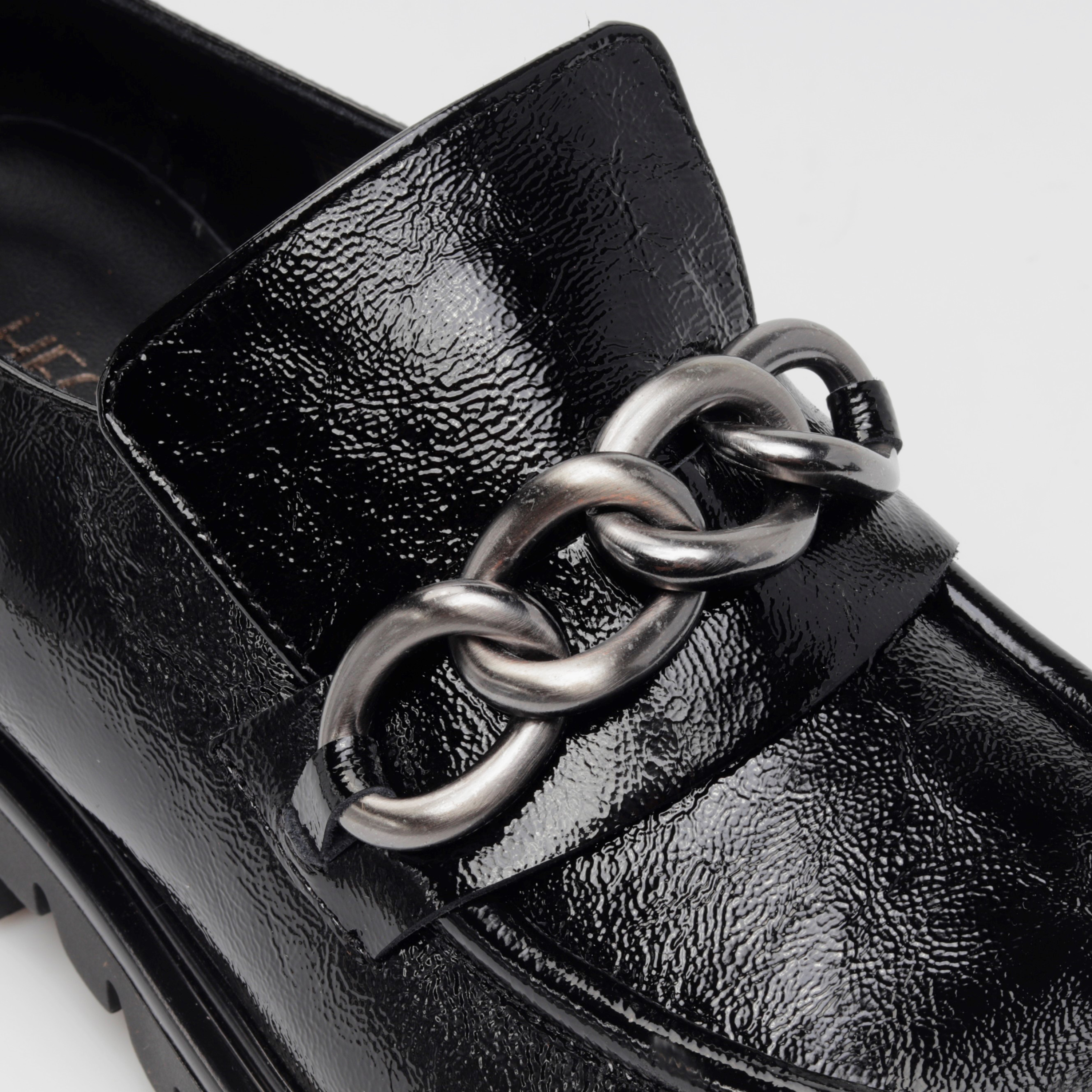 Klasyczne mokasyny damskie z wpisującą się w najnowsze trendy, masywną podeszwą to propozycja od HEGO'S Milano dla każdej, eleganckiej kobiety ceniącej sobie ponadczasowe kroje i design w sezonie AW21. Wysokiej jakości, włoska skóra naturalna, z której zostały wykonane gwarantuje niebywały komfort oraz dopasowanie do stopy. W modelu 4405-3 nie mogło zabraknąć stylowej ozdoby na przodzie w postaci srebrnego łańcucha, który pięknie prezentuje się na tle czarnej cholewki.
