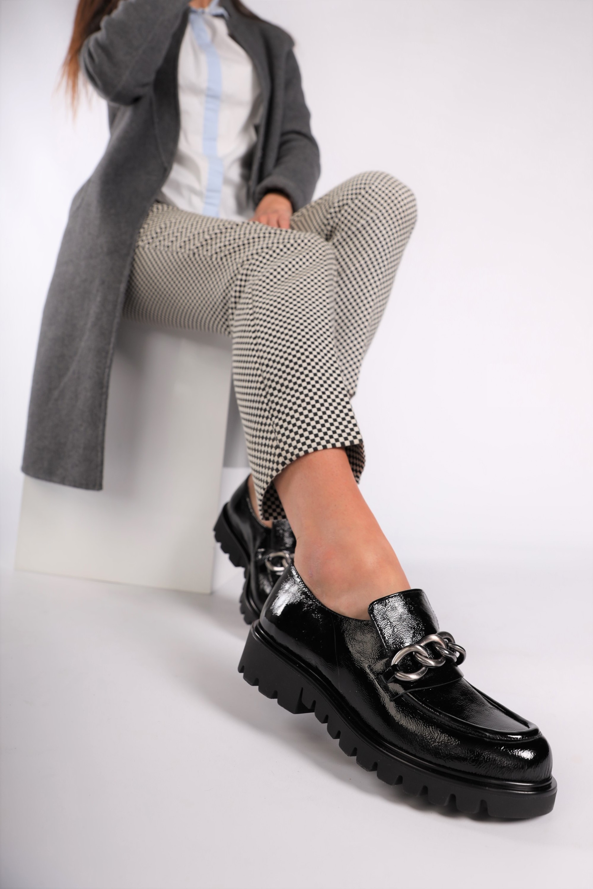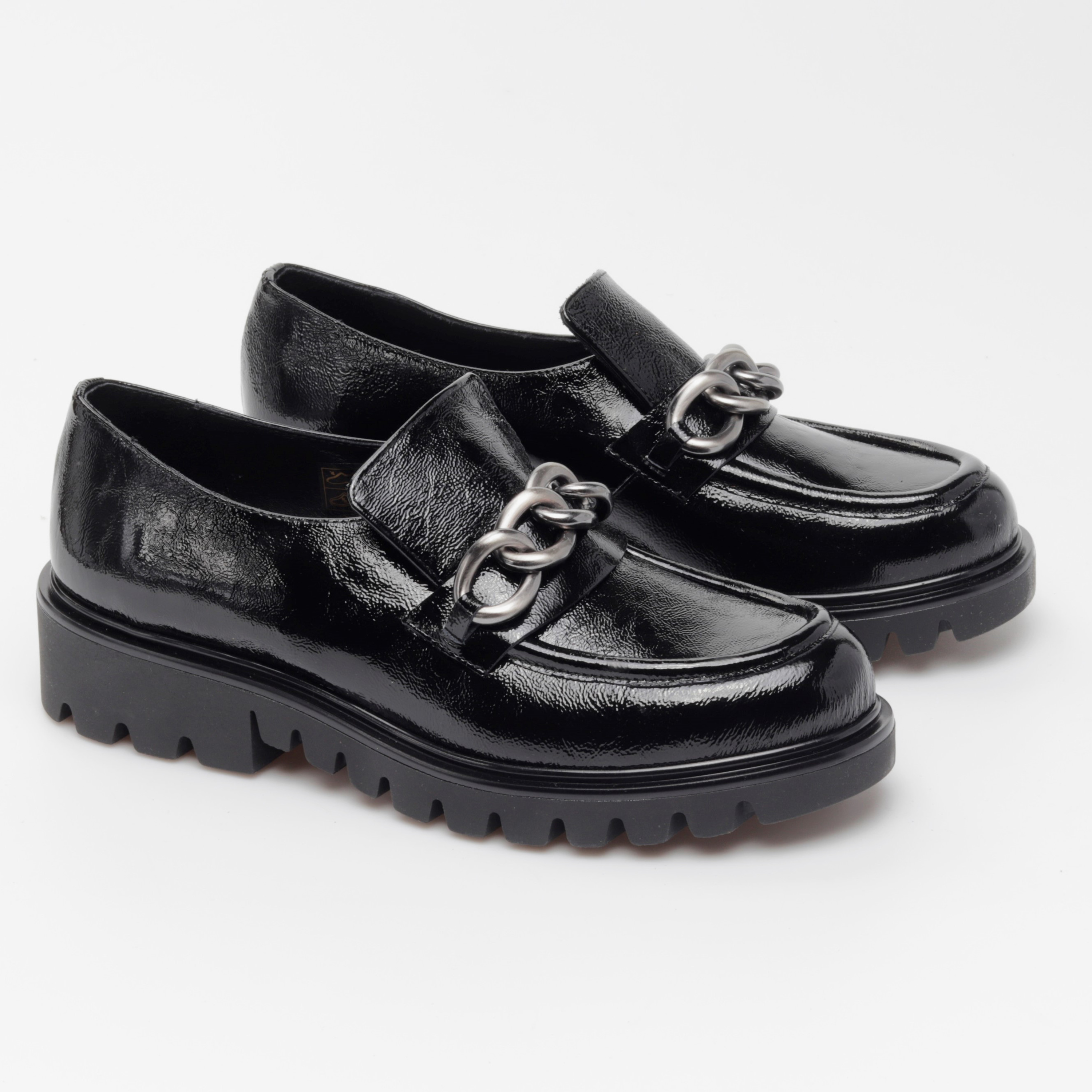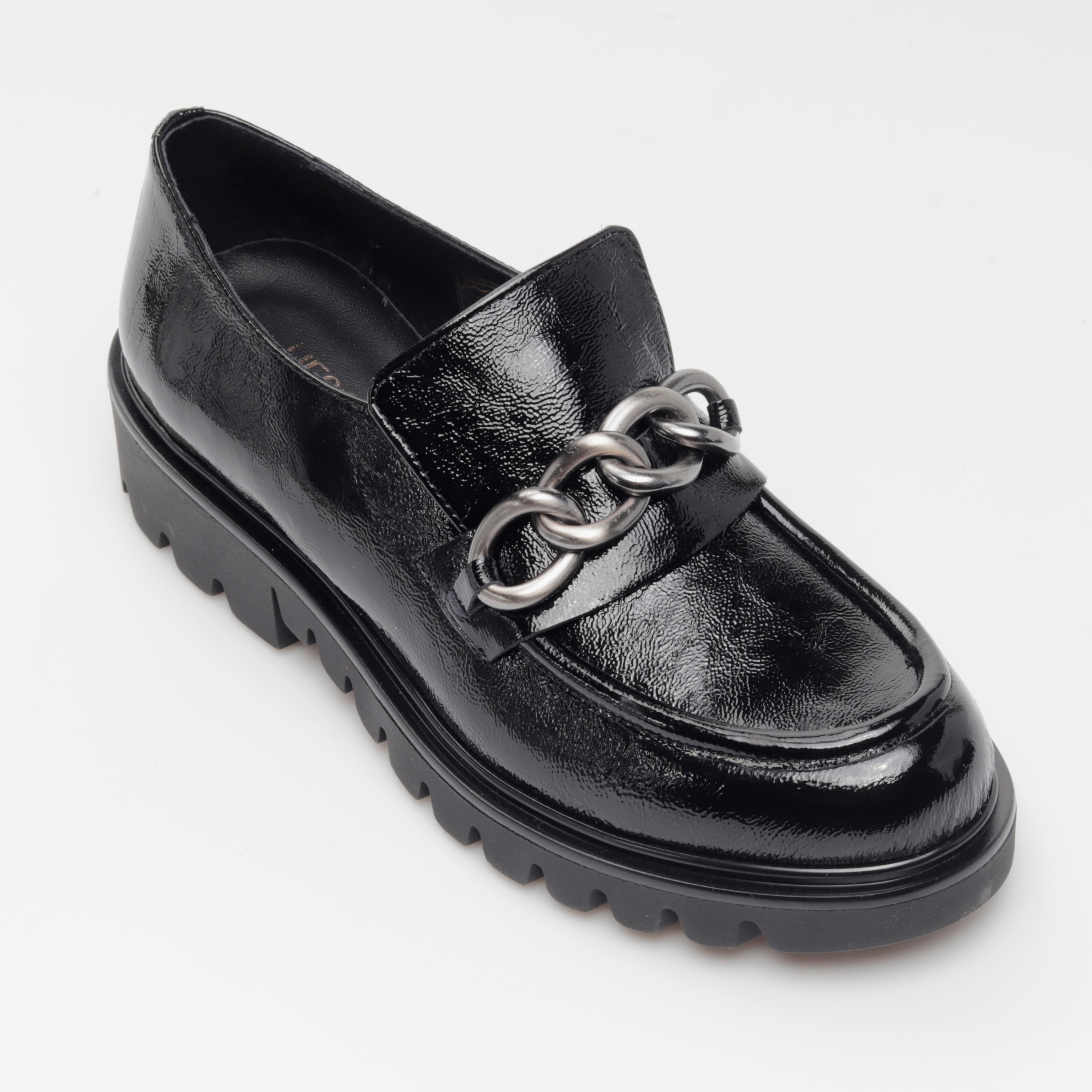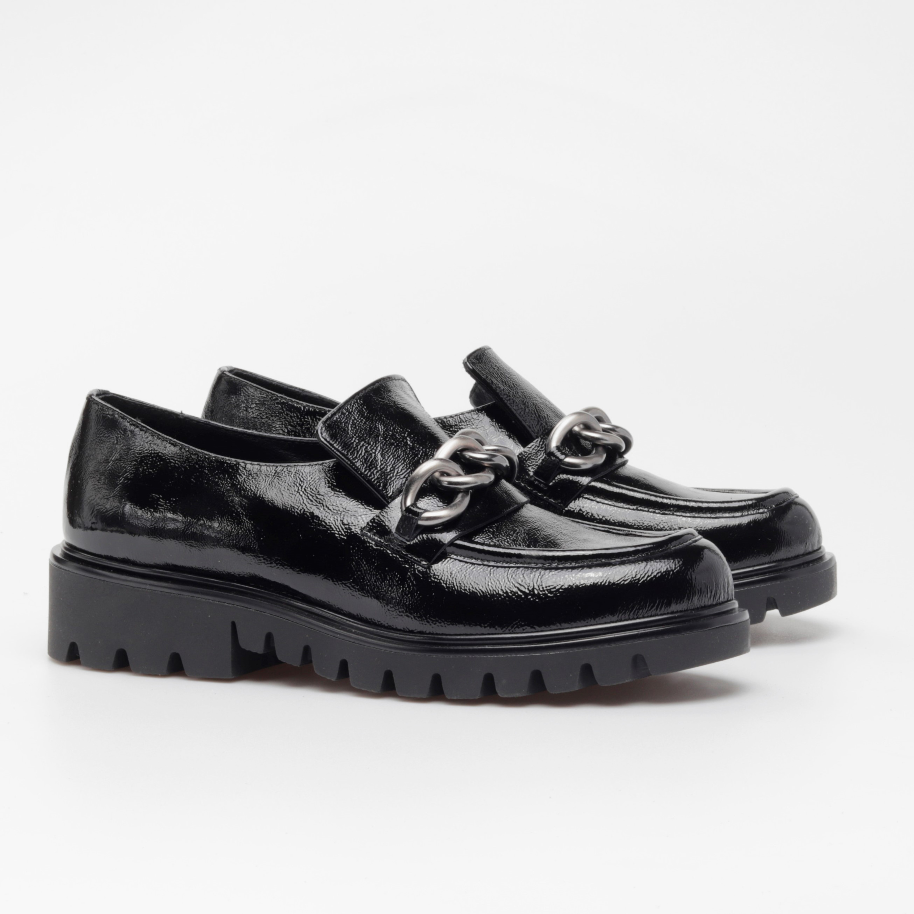 Klasyczne mokasyny damskie z wpisującą się w najnowsze trendy, masywną podeszwą to propozycja od HEGO'S Milano dla każdej, eleganckiej kobiety ceniącej sobie ponadczasowe kroje i design w sezonie AW21. Wysokiej jakości, włoska skóra naturalna, z której zostały wykonane gwarantuje niebywały komfort oraz dopasowanie do stopy. W modelu 4405-3 nie mogło zabraknąć stylowej ozdoby na przodzie w postaci srebrnego łańcucha, który pięknie prezentuje się na tle czarnej cholewki.