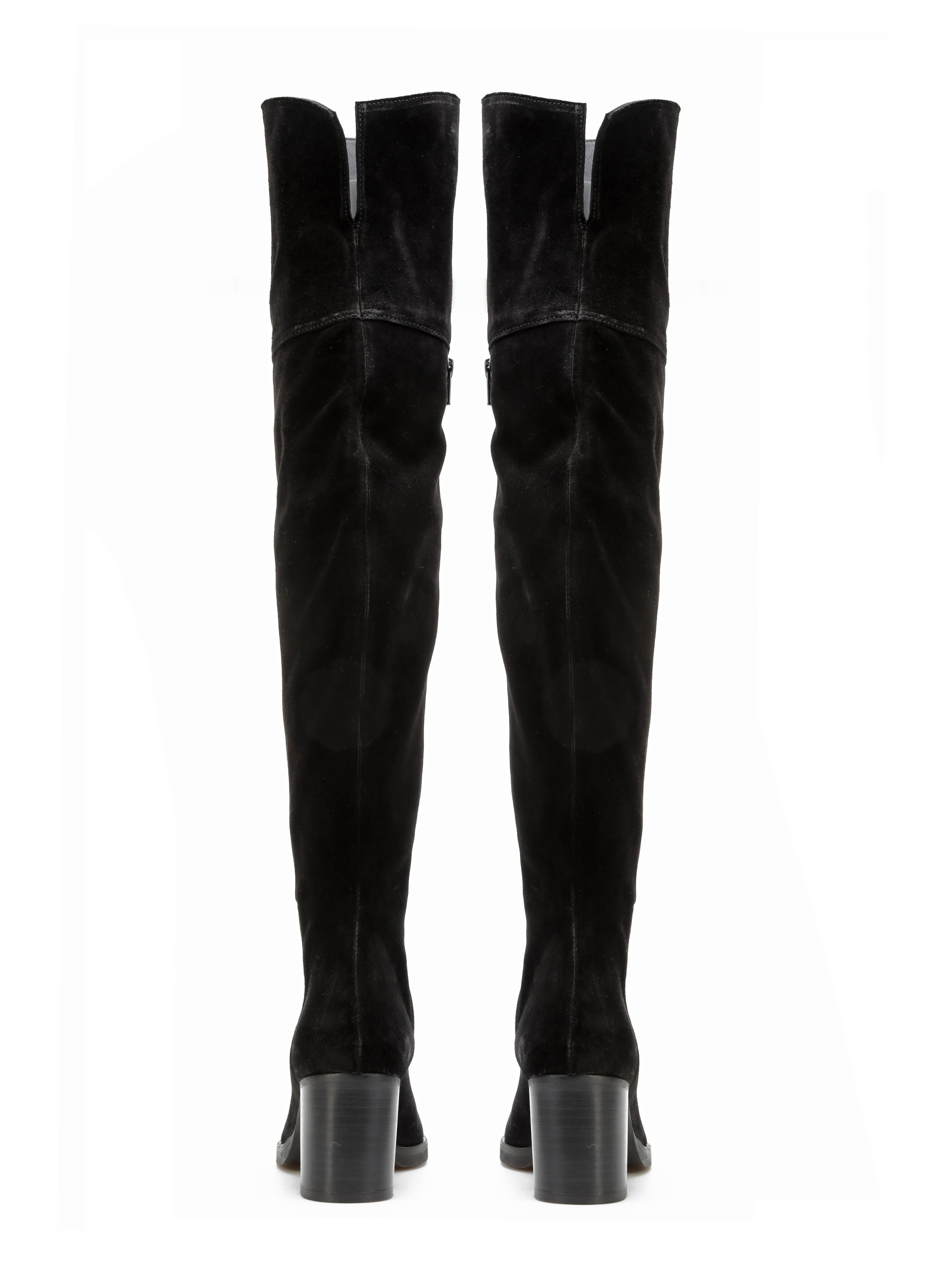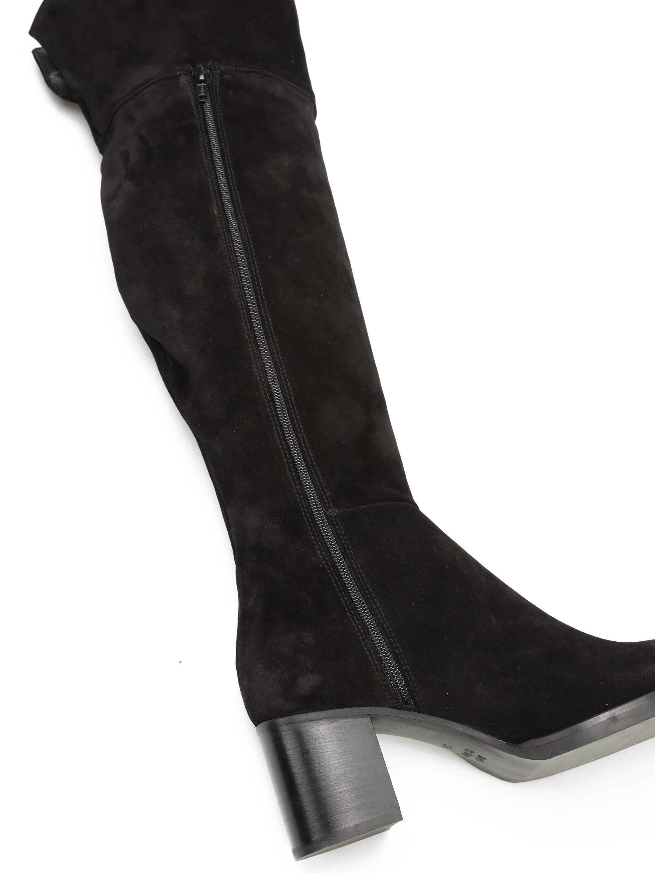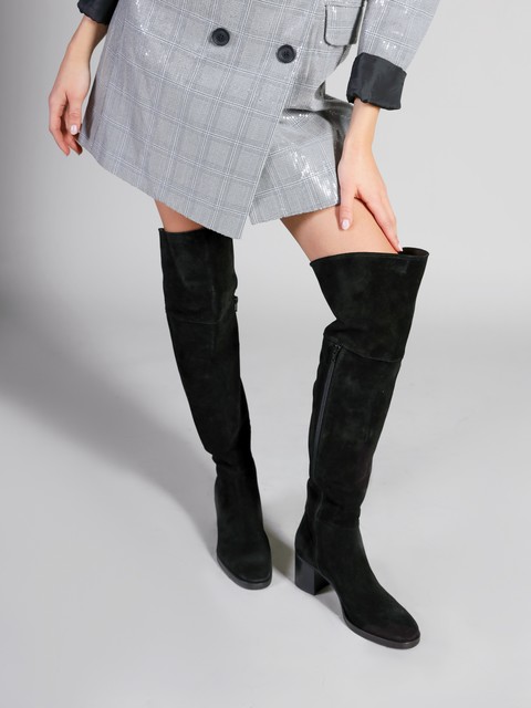 Kozaki za kolano to must have sezonu. Wykonane są z zamszowej skóry. Wysoka, dopasowana cholewka posiada zamek błyskawiczny ułatwiający zakładanie i zdejmowanie obuwia. Model osadzony na wygodnym obcasie na słupku.