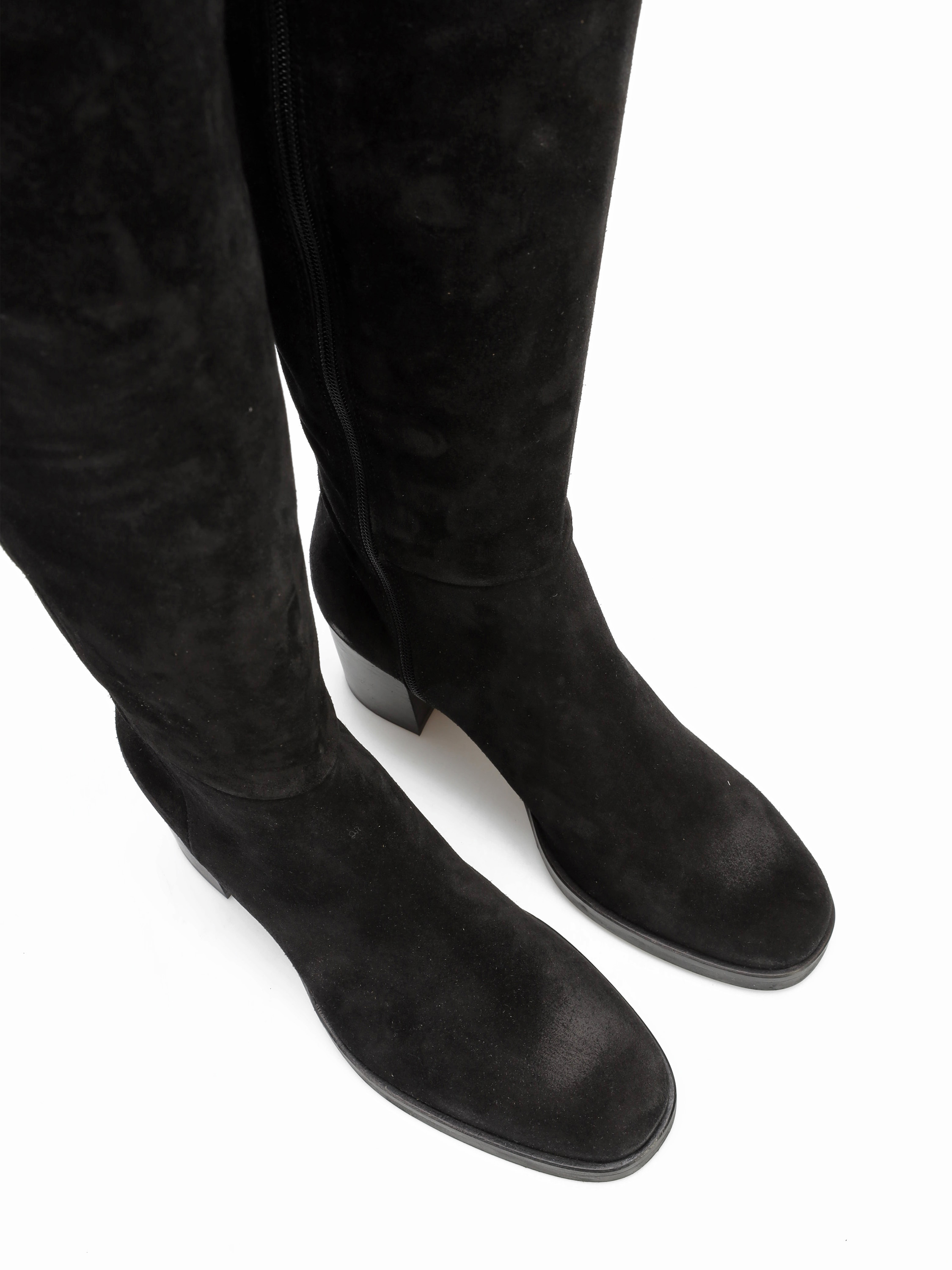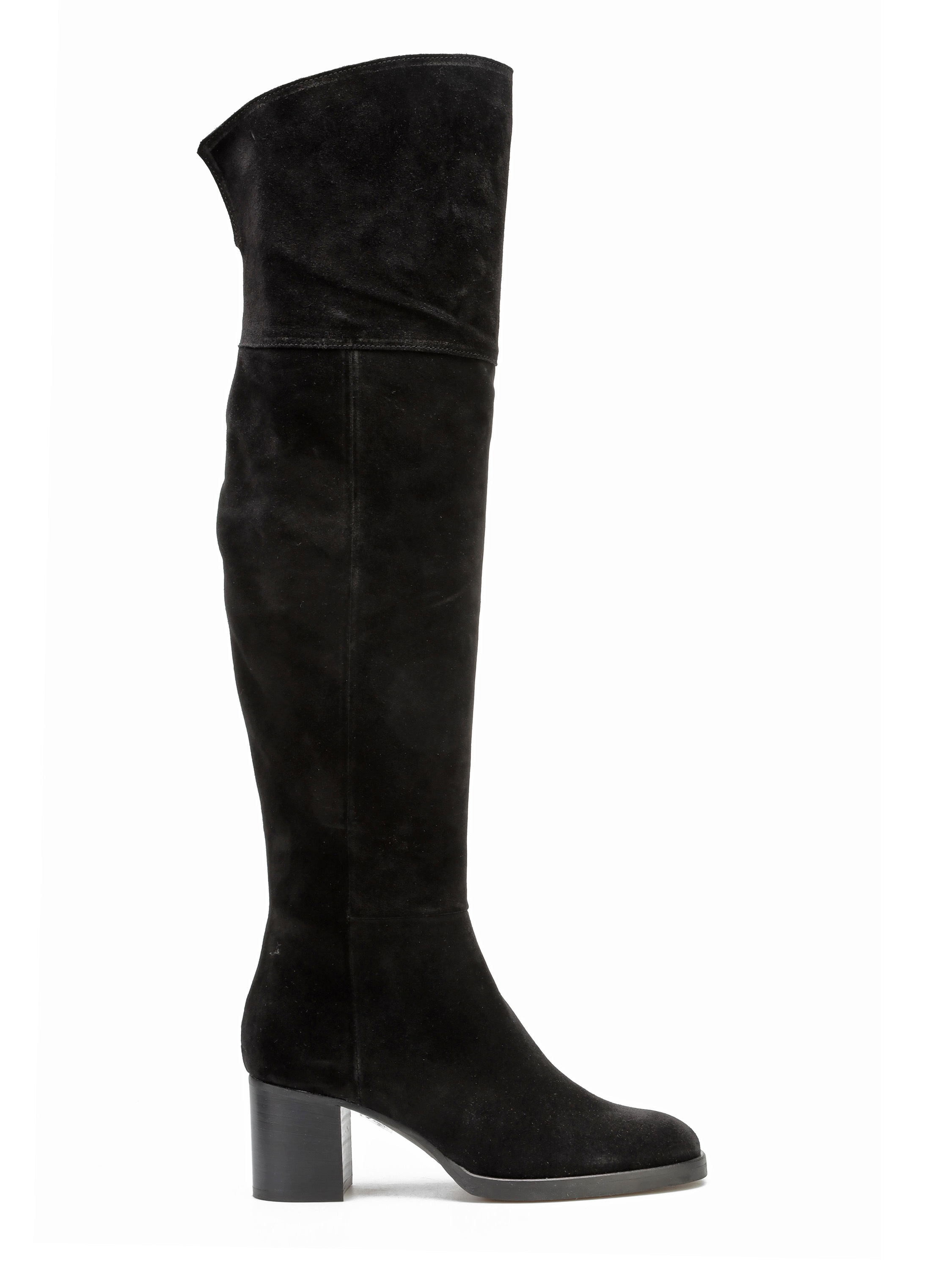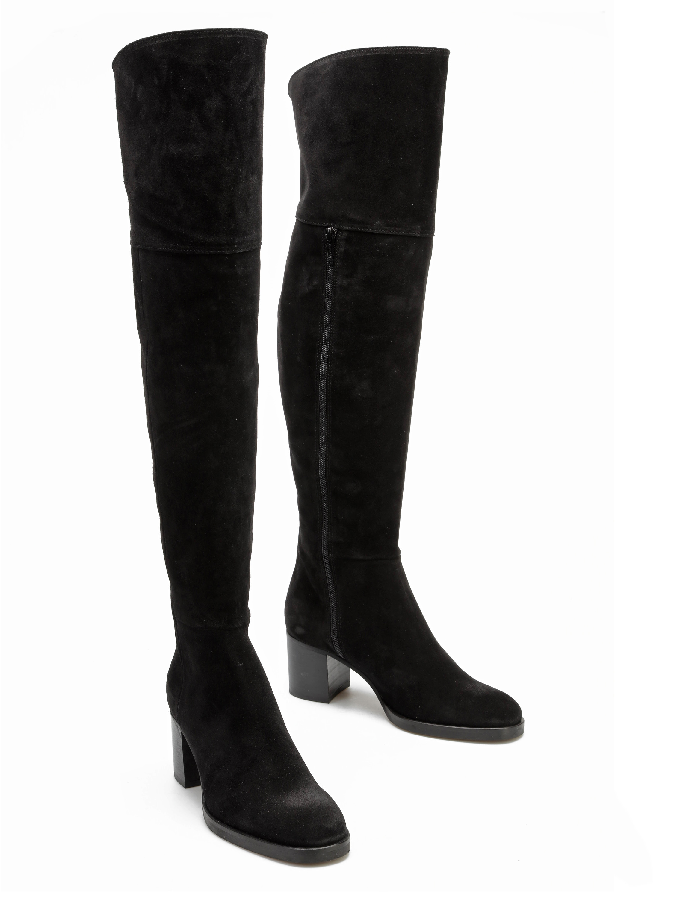 Kozaki za kolano to must have sezonu. Wykonane są z zamszowej skóry. Wysoka, dopasowana cholewka posiada zamek błyskawiczny ułatwiający zakładanie i zdejmowanie obuwia. Model osadzony na wygodnym obcasie na słupku.
