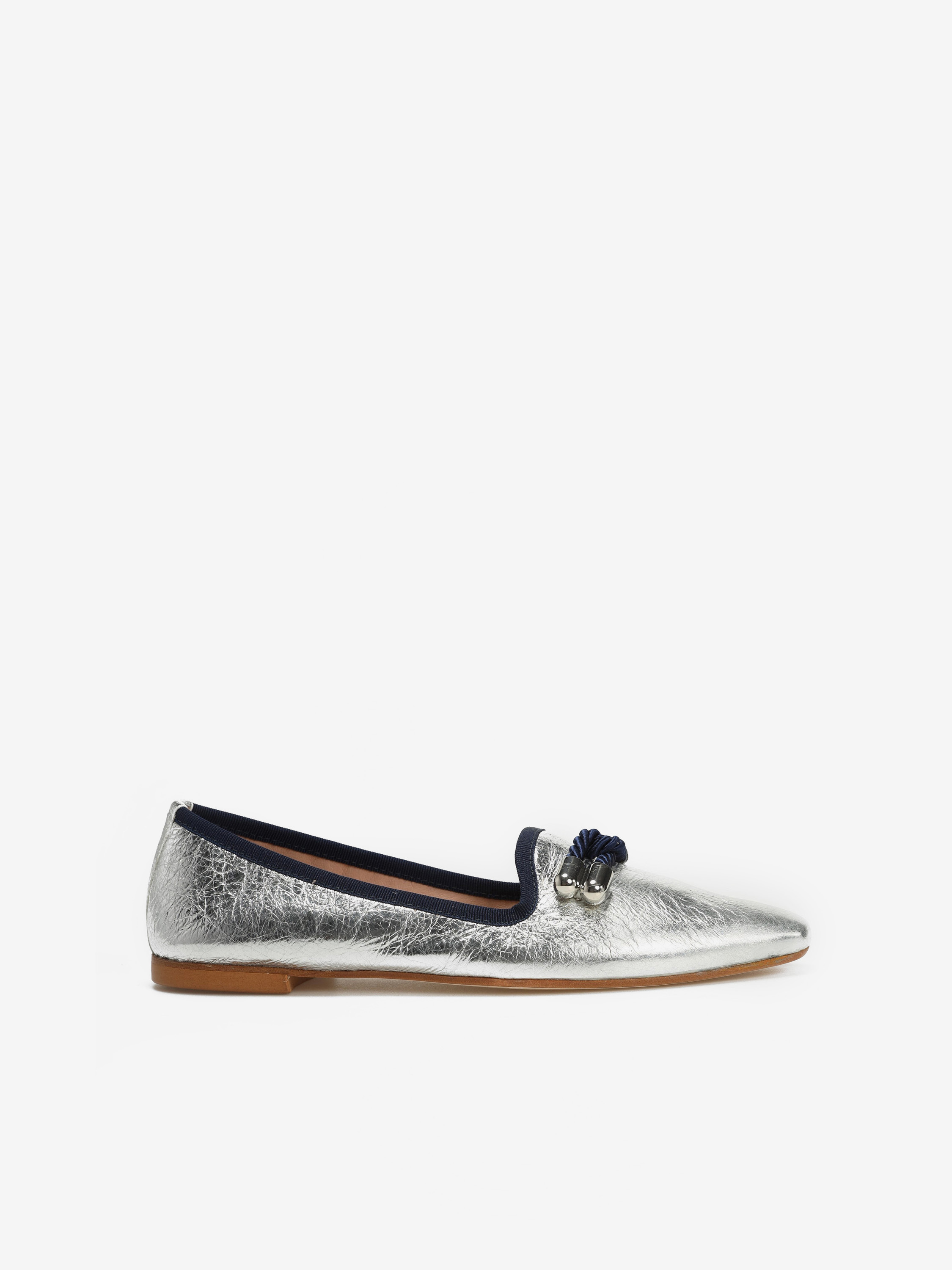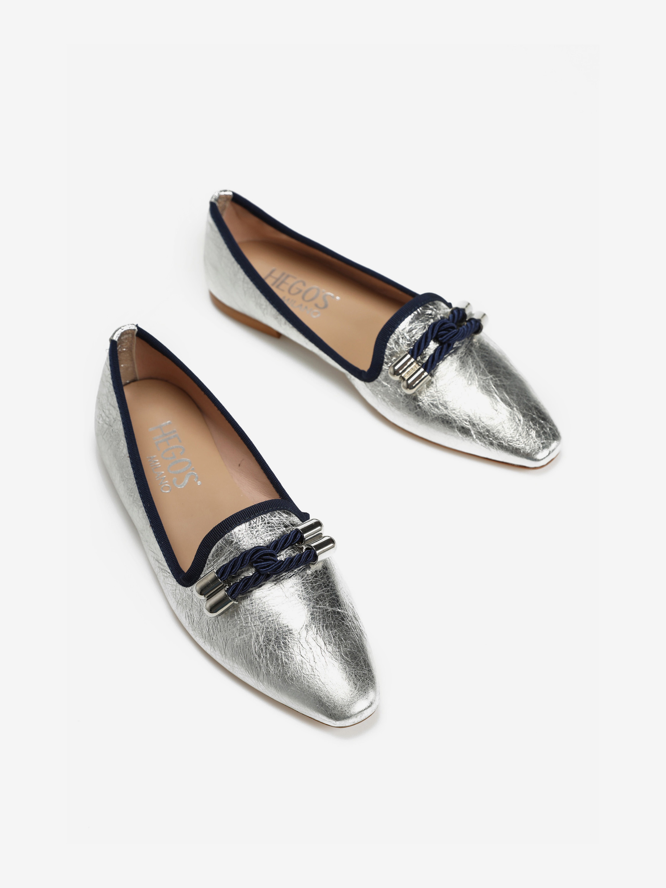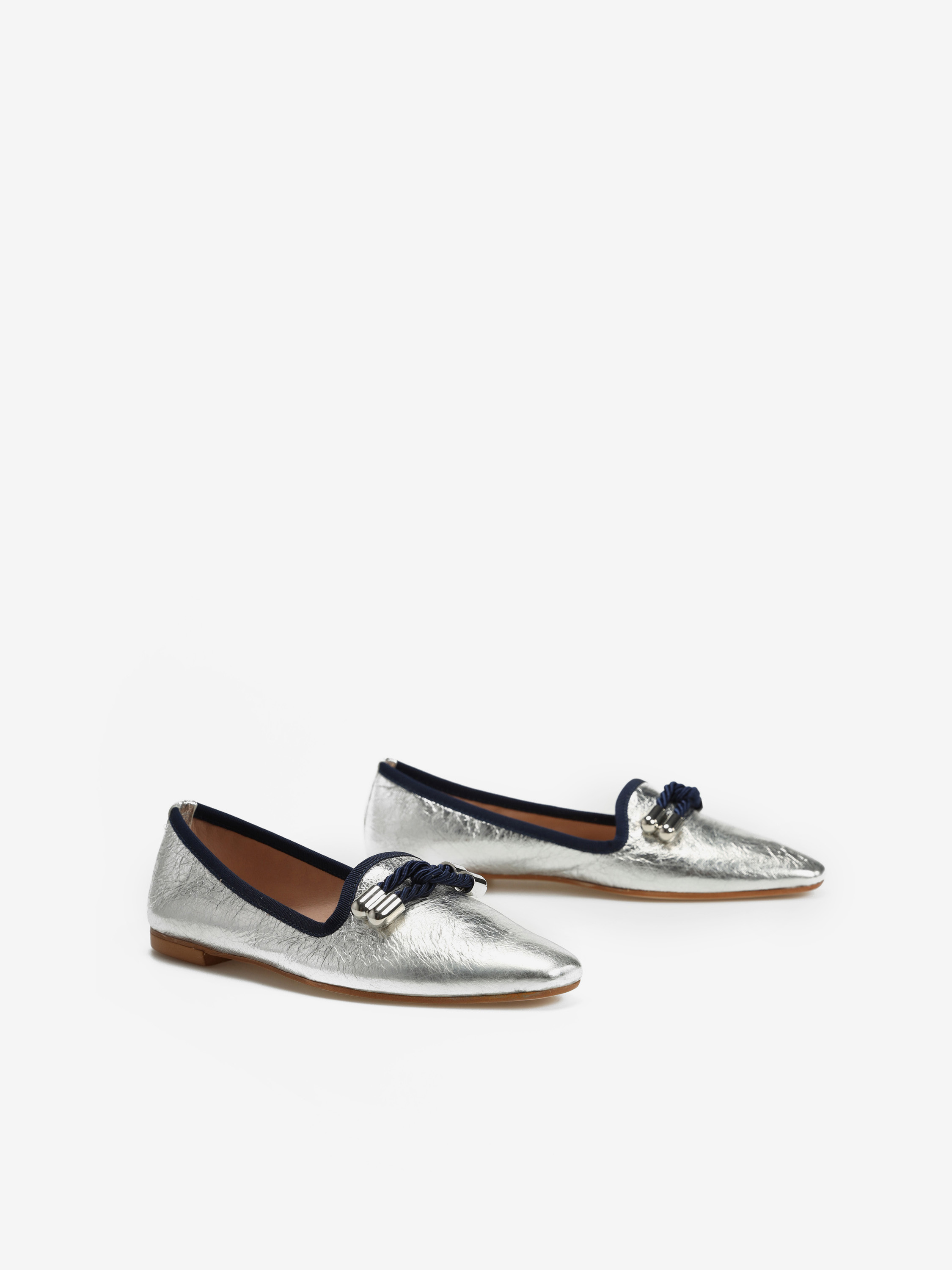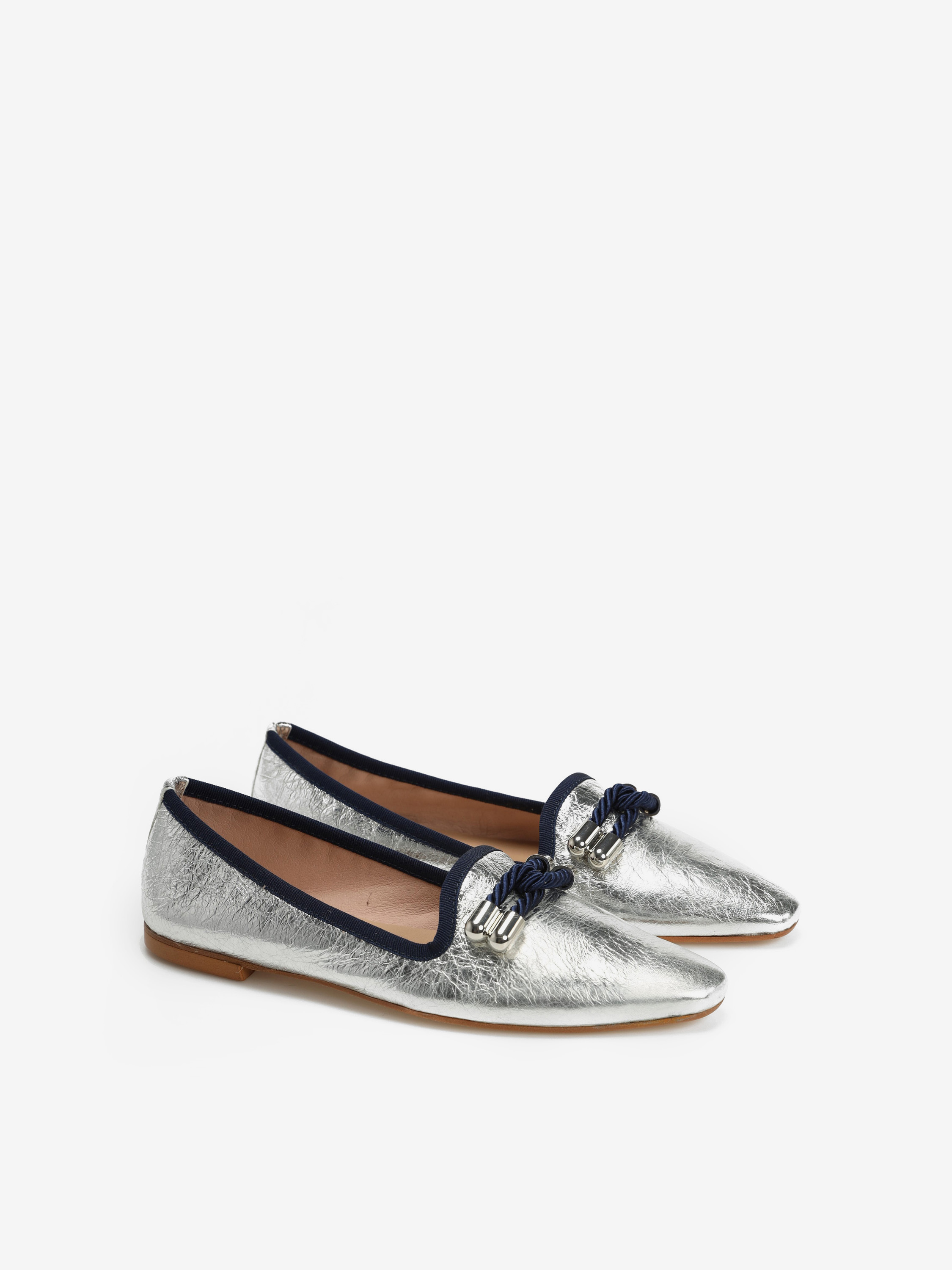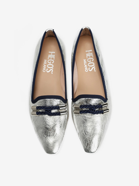 Piękne, klasyczne mokasyny w srebrnym kolorze to idealna propozycja dla każdej kobiety ceniącej sobie styl i wygodę. Skórzana cholewka, wnętrze oraz wkładka gwaranują niebywały komfort i dopasowanie do stopy. Granatowa lamówka oraz duża ozdoba z granatowy elementem na przodzie sprawiają, że prezentują się niezwykle unikatowo. Będą idealnym uzupełnieniem każdej stylizacji!