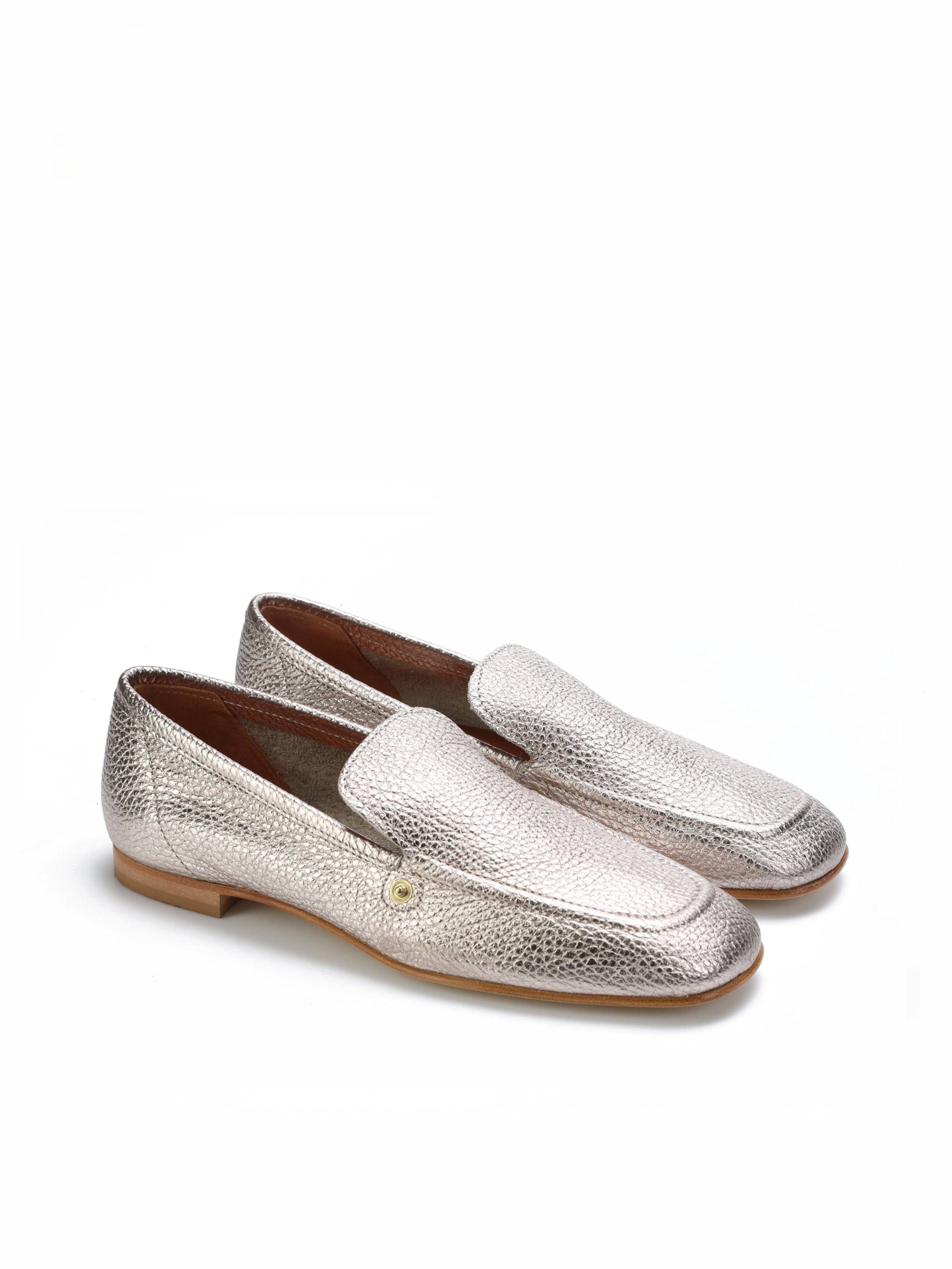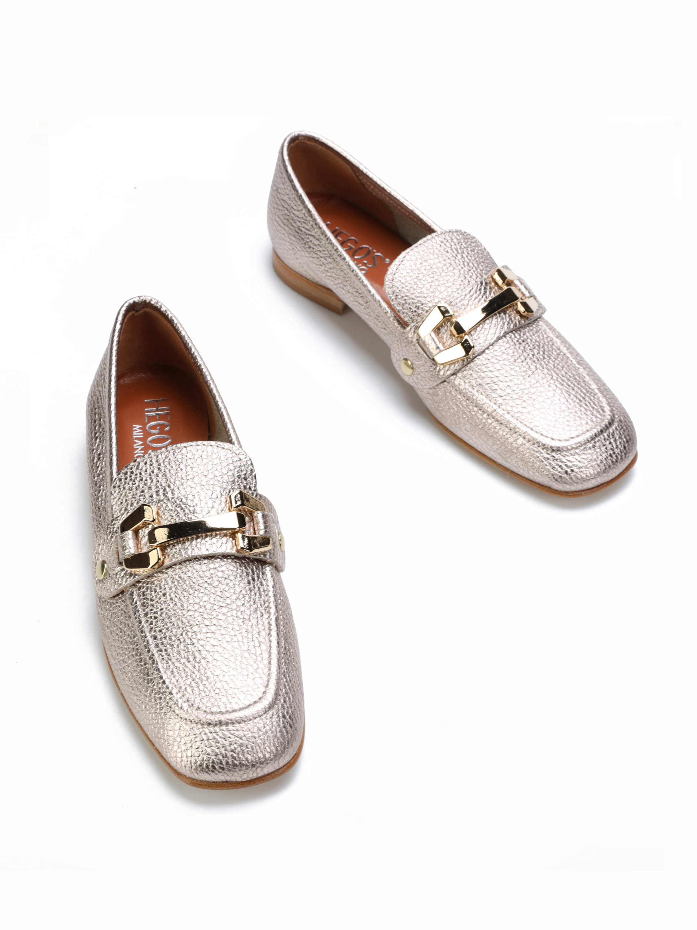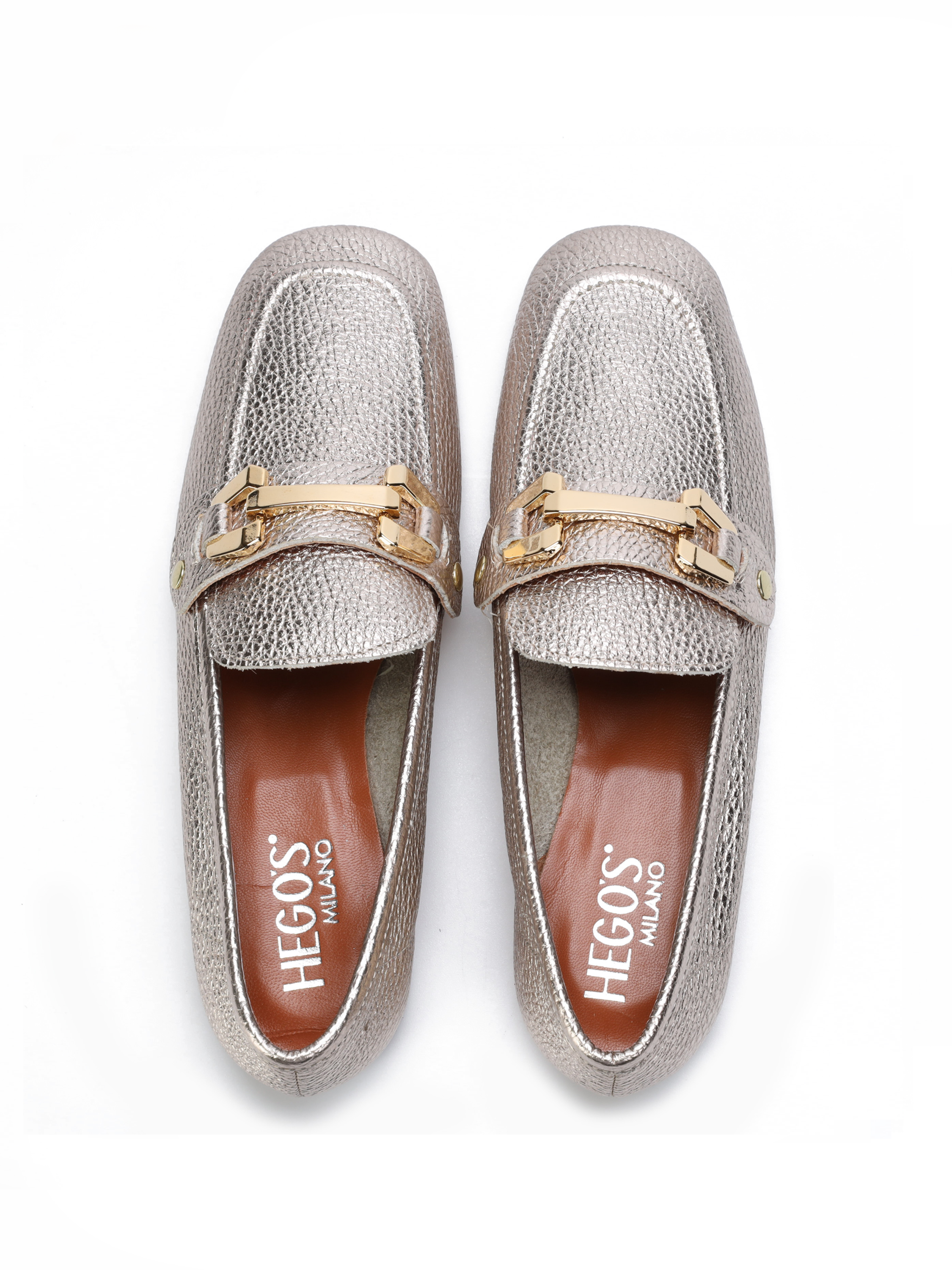 Mokasyny na płaskim obcasie HEGO'S Milano to propozycja dla kobiet szukających wygodnych i oryginalnych rozwiązań. Włoskie mokasyny w całości wykonane są z naturalnej skóry. Odpinaną, złotą klamarę można zamienić na gładki pasek i nosić według upodobań. To model 3 w 1. Kwadratowy nosek oraz metaliczny kolor to hit sezonu. Skórzana podeszwa oraz wkładka odpowiadają za komfort chodzenia przez cały dzień. Klasyczny fason idealnie dopasuje się do modnej garderoby kobiety.