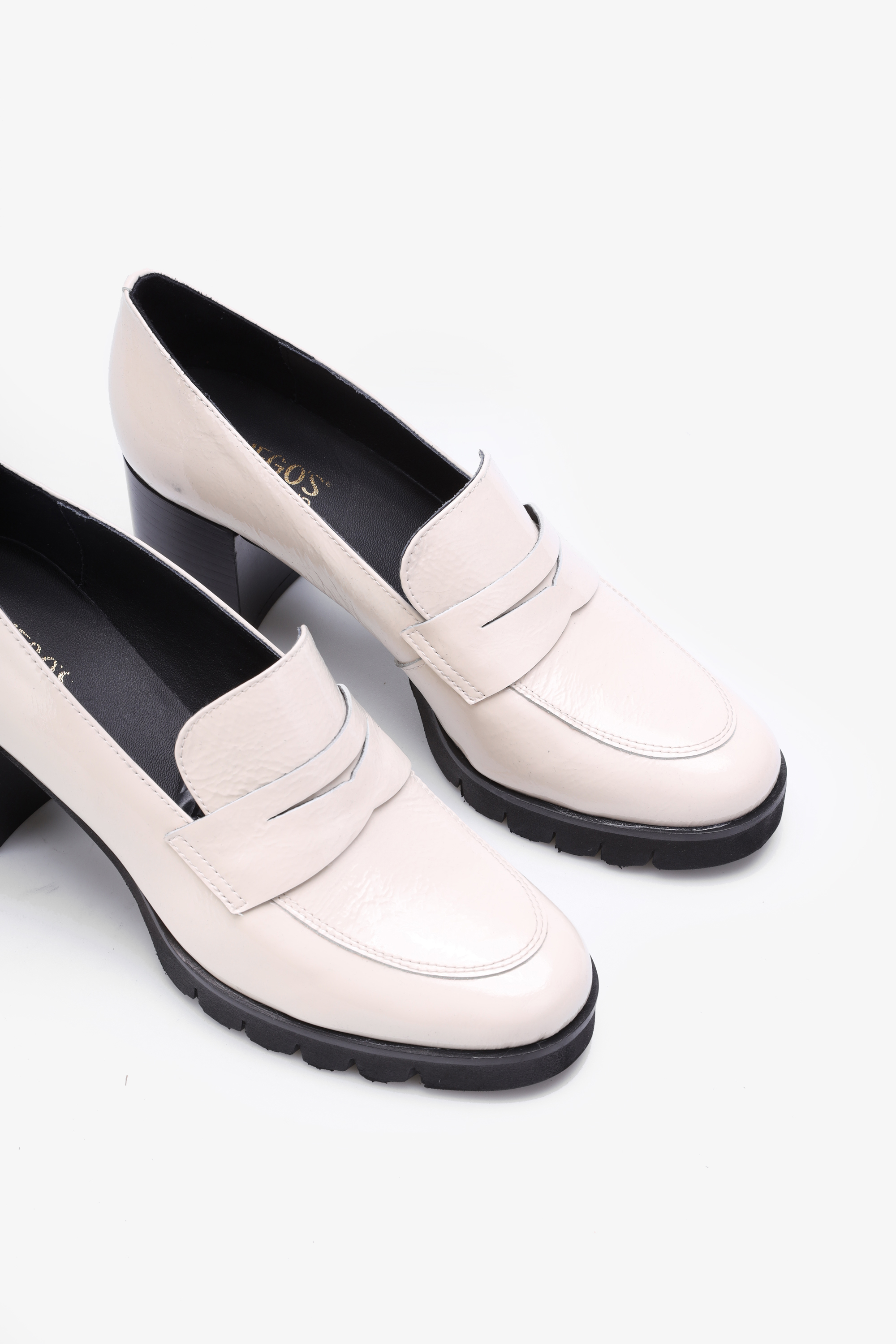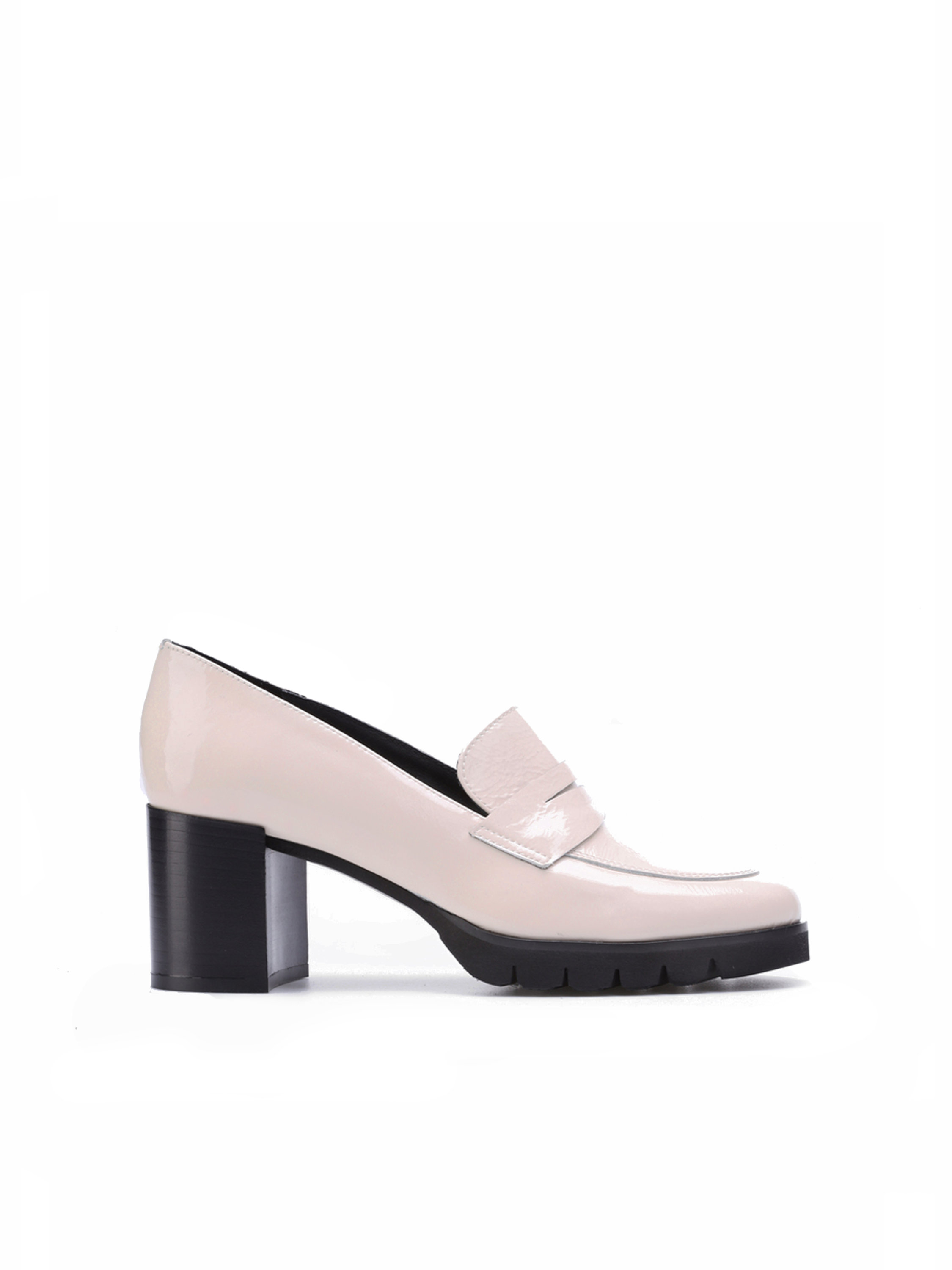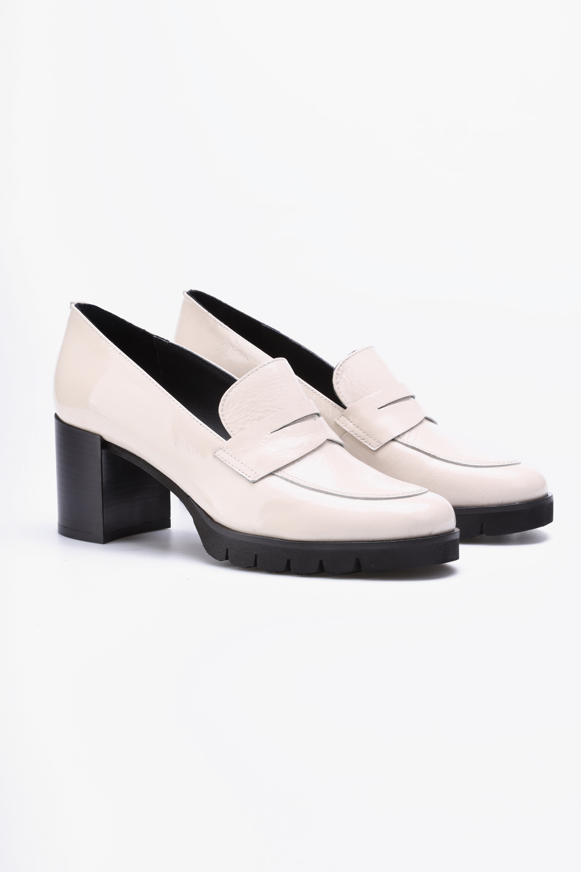 Ponadczasowe, mokasyny w kremowym kolorze wykonane są z włoskiej naturalnej skóry.  Osadzone zostały na stabilnym, słupkowym obcasie, który w połączeniu z delikatną platformą odpowiada za niebywały komfort i wygodę.