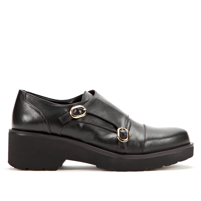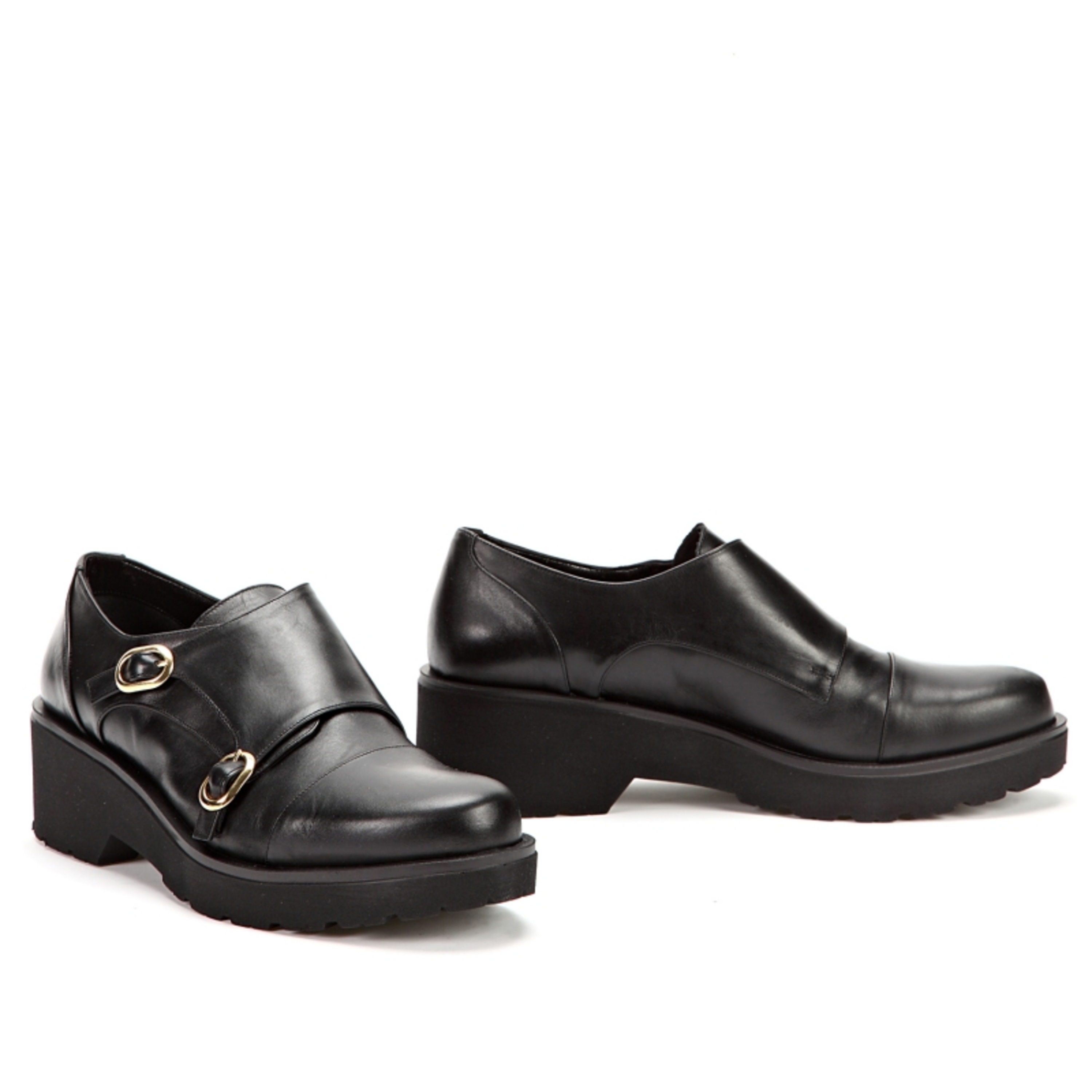 Czarne, gładkie półbuty. Model wsuwany, ozdobiony dwoma,