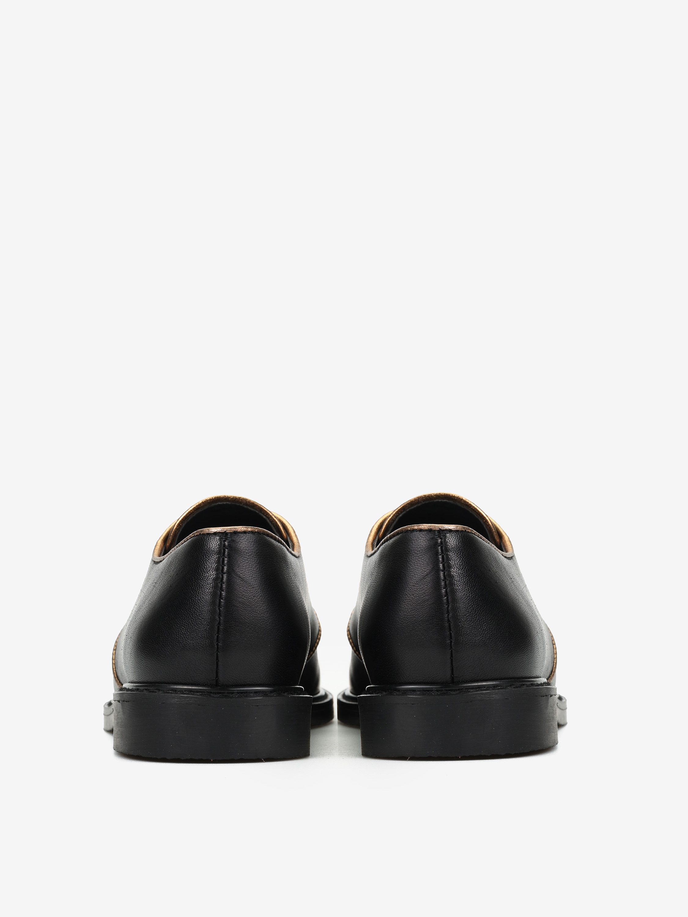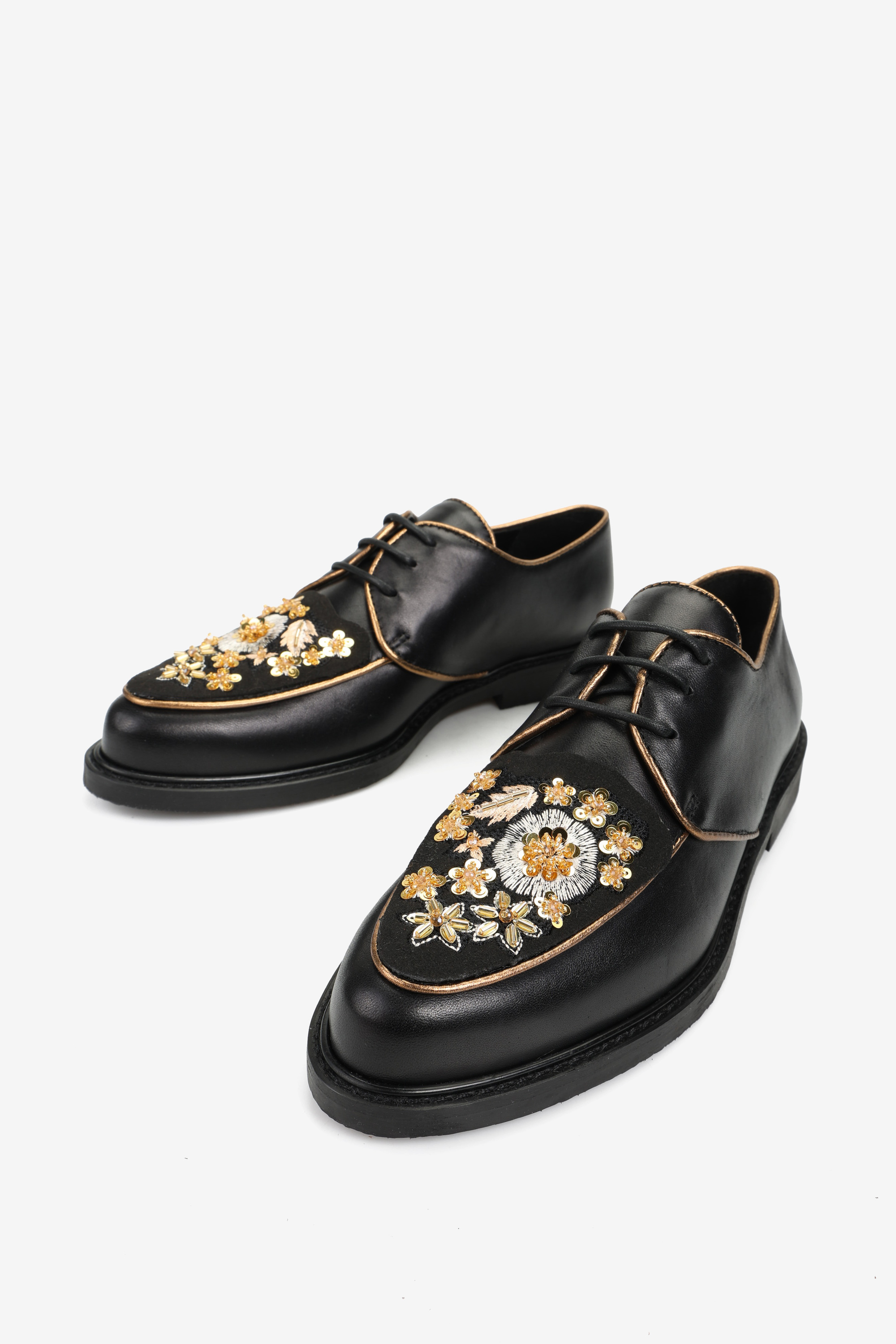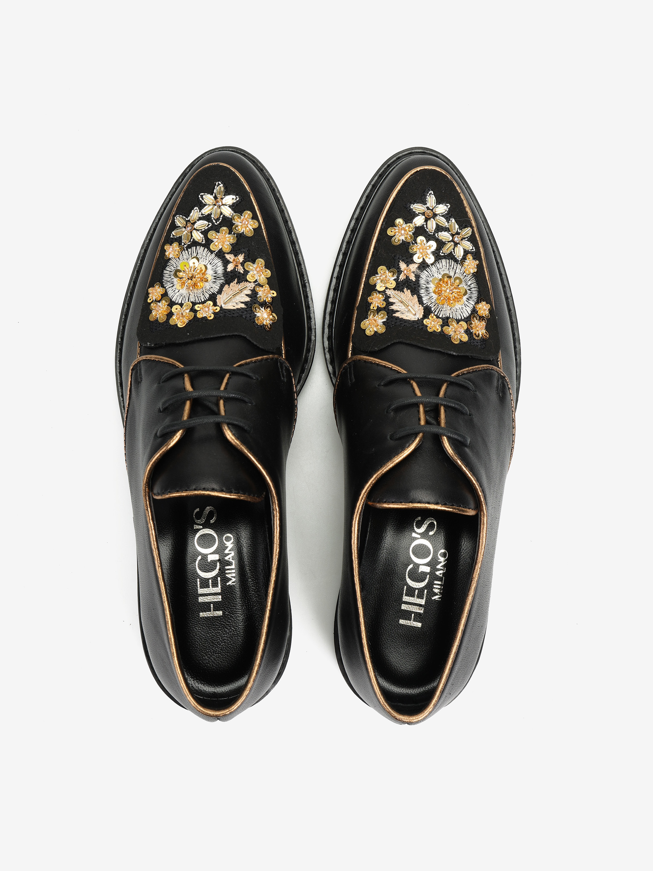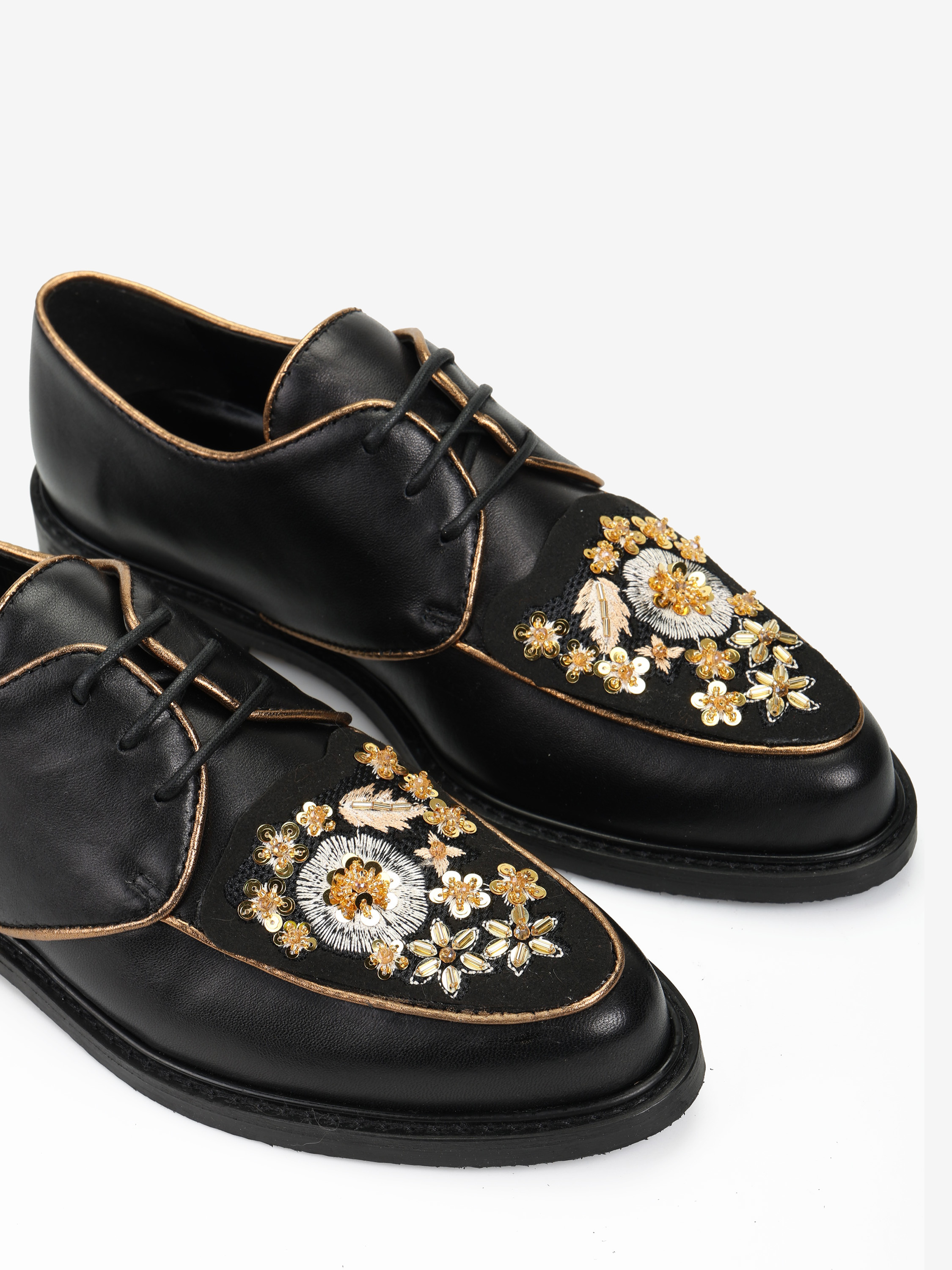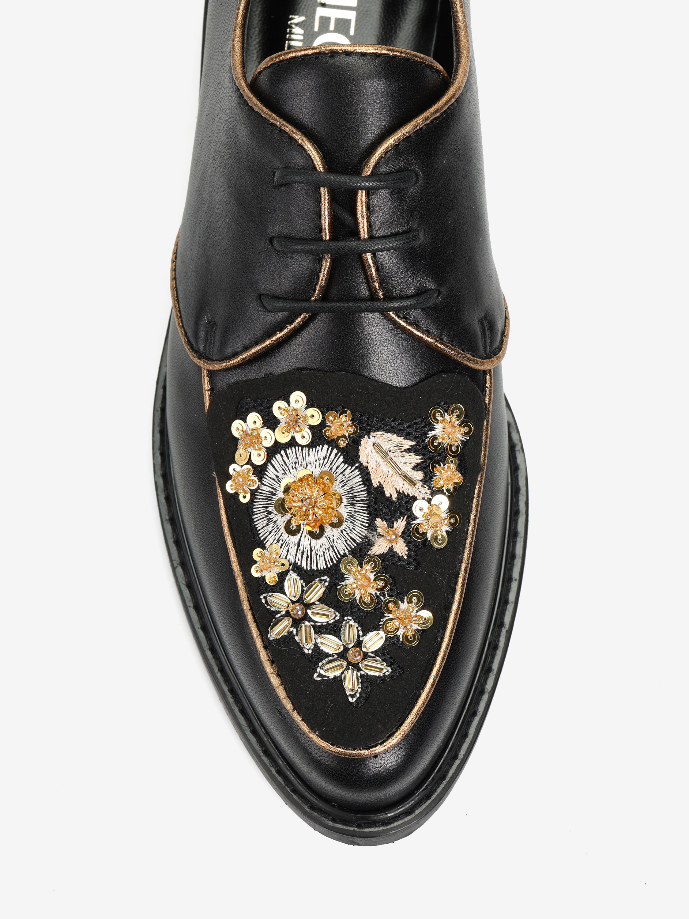 Sznurowane półbuty z metaliczną lamówką i ozdobnym haftem z koralikami.