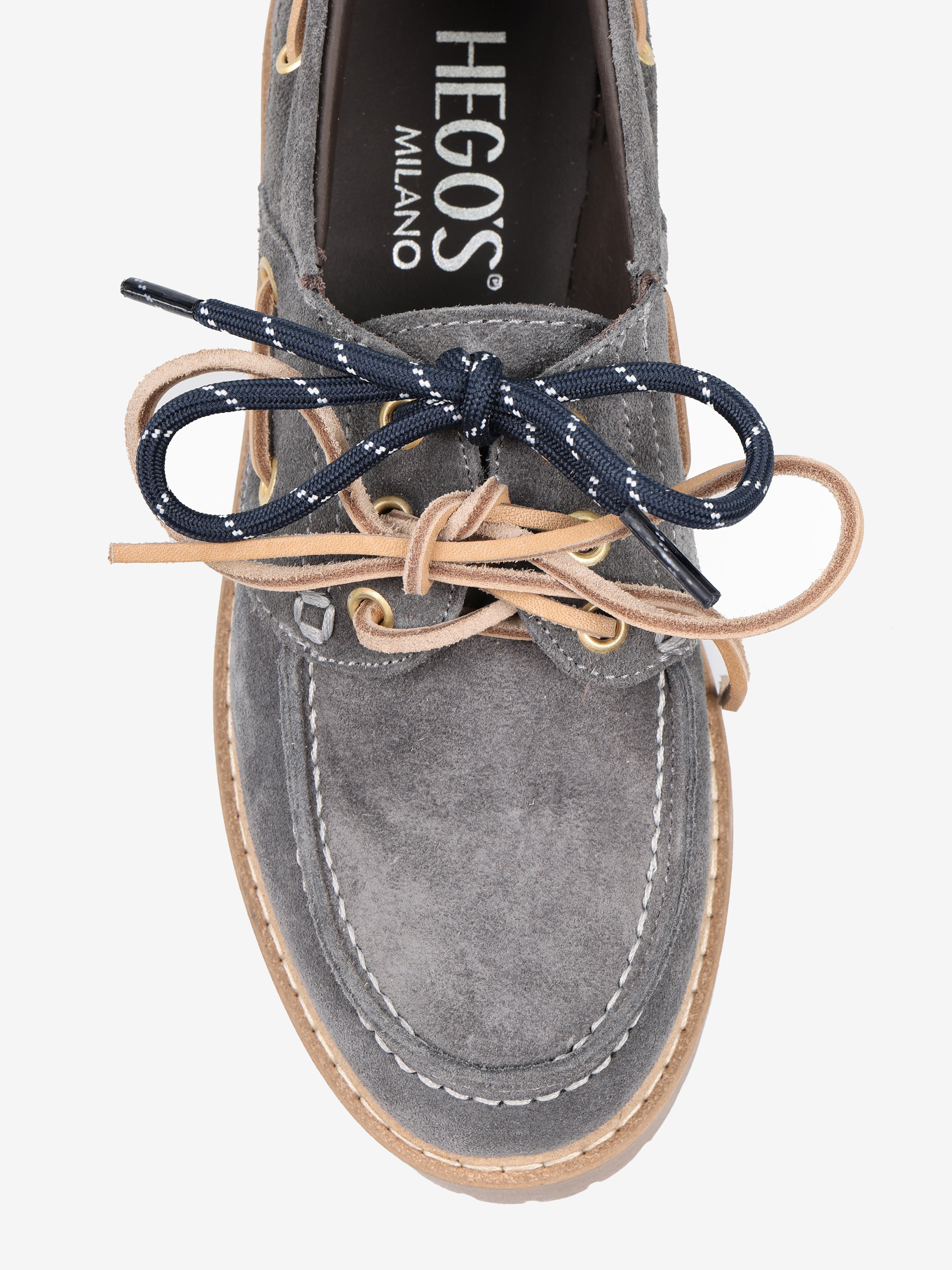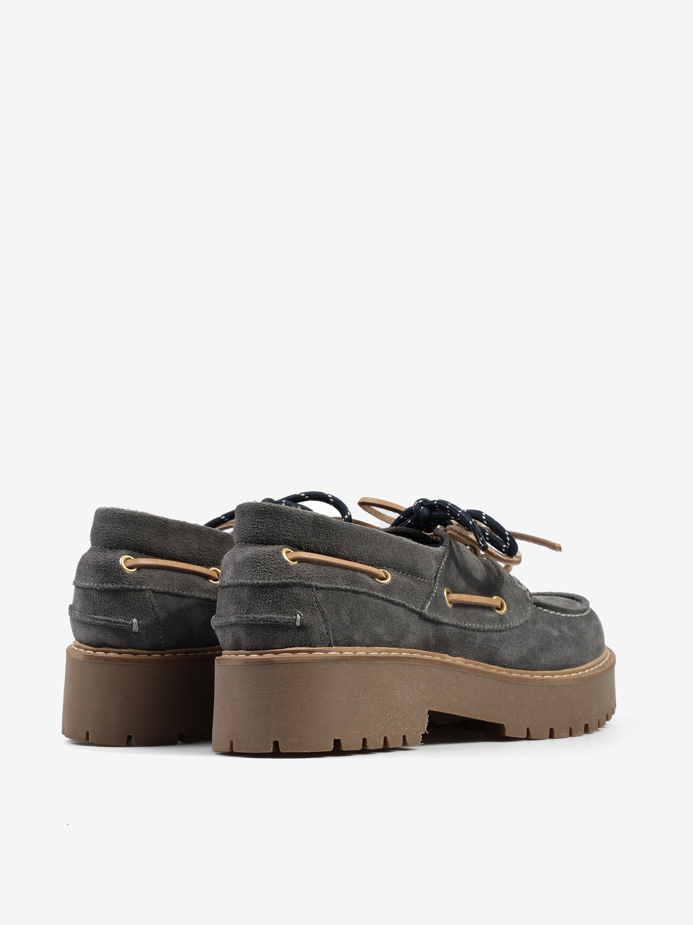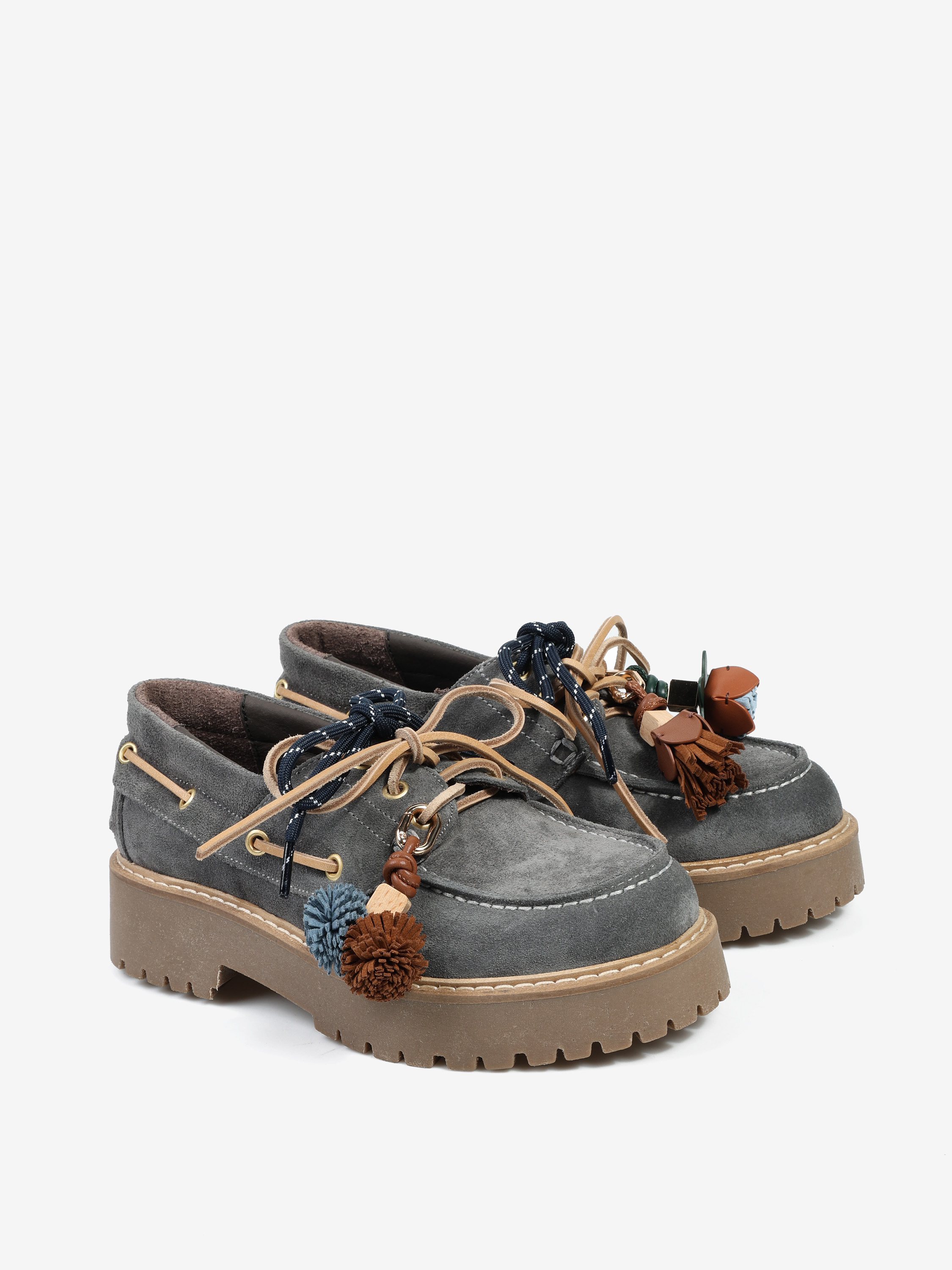 Szare, zamszowe mokasyny na platformie z wiązaniem na rzemyk. W komplecie dodatkowe sznurówki. Przywieszka dostępna oddzielnie.